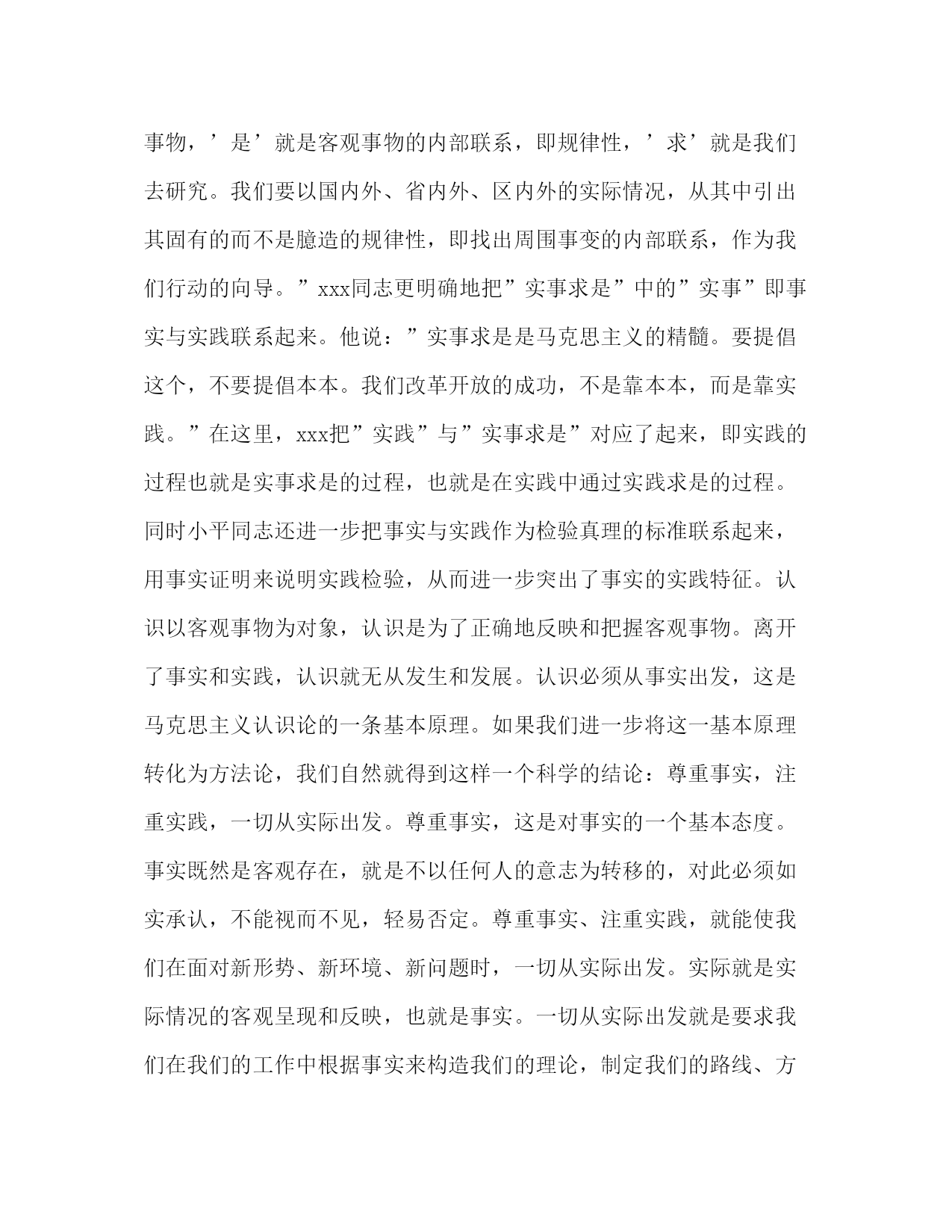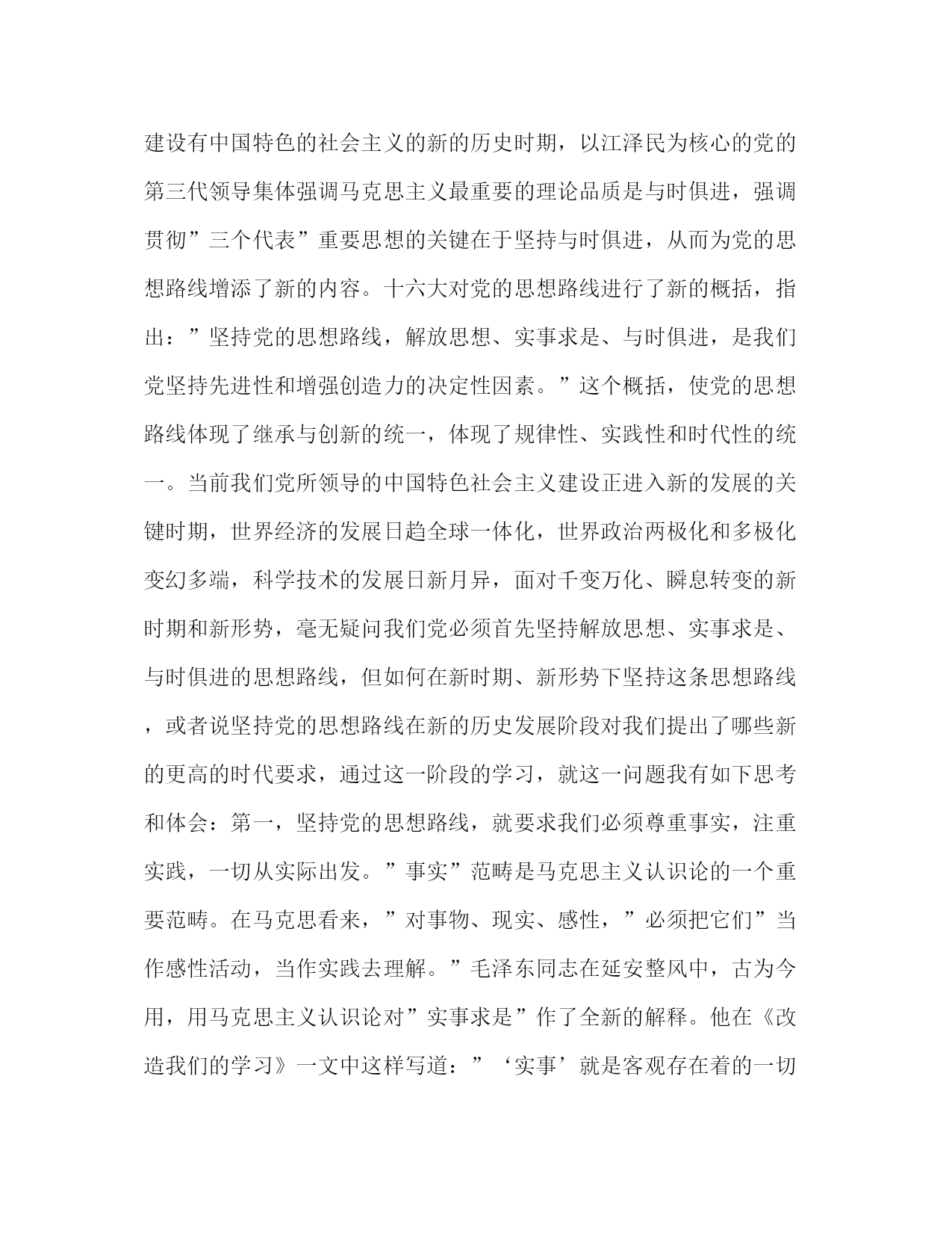 PAGE此资料由网络收集而来,如有侵权请告知上传者立即删除。资料共分享,我们负责传递知识。党校理论学习体会坚持党的思想路线的时代要求解放思想、实事求是、与时俱进是中国共产党在长期的革命实践过程中形成的马克思主义的思想路线,是中国共产党将马克思主义的普遍原理与中国革命实践相结合的精髓,是中国共产党赖以领导人民大众取得一次又一次革命实践胜利的理论法宝,同时也是中国共产党应用马克思主义的世界观、方法论,与时俱进,站在时代潮流的前列,对我党革命实践的成功与失败,经验与教训的不断总结、不断反思的深刻认识。在党校中青班紧张而又充实的学习过程中,通过对马克思、恩格斯、列宁的原著的研读以及对毛泽东思想、xxx理论和”三个代表”重要思想的再学习,再体会,自己对党的这条马克思主义的思想路线的形成、实践和发展,有了更深、更新、更全面的认识和理解。我们党的三代领导集体核心,根据他们所处的具体时代背景,以理论的高度针对性地对党的思想路线进行了概括,而每一次概括都使思想路线的表达的内涵不断地得到丰富和发展。在新民主主义革命时期,针对党内教条主义、本本主义的泛滥,毛泽东同志从马克思主义认识论的立场、观点、方法出发及时地、创造性地提出了”实事求是”,为党的思想路线奠定了基础。党的十一届三中全会之后,xxx同志针对”二个凡是”的僵化思想观念的束缚,倡导”解放思想,实事求是”的统一,丰富和发展了党的思想路线。在建设有中国特色的社会主义的新的历史时期,以江泽民为核心的党的第三代领导集体强调马克思主义最重要的理论品质是与时俱进,强调贯彻”三个代表”重要思想的关键在于坚持与时俱进,从而为党的思想路线增添了新的内容。十六大对党的思想路线进行了新的概括,指出:”坚持党的思想路线,解放思想、实事求是、与时俱进,是我们党坚持先进性和增强创造力的决定性因素。”这个概括,使党的思想路线体现了继承与创新的统一,体现了规律性、实践性和时代性的统一。当前我们党所领导的中国特色社会主义建设正进入新的发展的关键时期,世界经济的发展日趋全球一体化,世界政治两极化和多极化变幻多端,科学技术的发展日新月异,面对千变万化、瞬息转变的新时期和新形势,毫无疑问我们党必须首先坚持解放思想、实事求是、与时俱进的思想路线,但如何在新时期、新形势下坚持这条思想路线,或者说坚持党的思想路线在新的历史发展阶段对我们提出了哪些新的更高的时代要求,通过这一阶段的学习,就这一问题我有如下思考和体会:第一,坚持党的思想路线,就要求我们必须尊重事实,注重实践,一切从实际出发。”事实”范畴是马克思主义认识论的一个重要范畴。在马克思看来,”对事物、现实、感性,”必须把它们”当作感性活动,当作实践去理解。”毛泽东同志在延安整风中,古为今用,用马克思主义认识论对”实事求是”作了全新的解释。他在《改造我们的学习》一文中这样写道:”‘实事’就是客观存在着的一切事物,’是’就是客观事物的内部联系,即规律性,’求’就是我们去研究。我们要以国内外、省内外、区内外的实际情况,从其中引出其固有的而不是臆造的规律性,即找出周围事变的内部联系,作为我们行动的向导。”xxx同志更明确地把”实事求是”中的”实事”即事实与实践联系起来。他说:”实事求是是马克思主义的精髓。要提倡这个,不要提倡本本。我们改革开放的成功,不是靠本本,而是靠实践。”在这里,xxx把”实践”与”实事求是”对应了起来,即实践的过程也就是实事求是的过程,也就是在实践中通过实践求是的过程。同时小平同志还进一步把事实与实践作为检验真理的标准联系起来,用事实证明来说明实践检验,从而进一步突出了事实的实践特征。认识以客观事物为对象,认识是为了正确地反映和把握客观事物。离开了事实和实践,认识就无从发生和发展。认识必须从事实出发,这是马克思主义认识论的一条基本原理。如果我们进一步将这一基本原理转化为方法论,我们自然就得到这样一个科学的结论:尊重事实,注重实践,一切从实际出发。尊重事实,这是对事实的一个基本态度。事实既然是客观存在,就是不以任何人的意志为转移的,对此必须如实承认,不能视而不见,轻易否定。尊重事实、注重实践,就能使我们在面对新形势、新环境、新问题时,一切从实际出发。实际就是实际情况的客观呈现和反映,也就是事实。一切从实际出发就是要求我们在我们的工作中根据事实来构造我们的理论,制定我们的路线、方针和政策。面对错综复杂的变化局面,我们要从客观事实出发,从实际出发,实事求是,理论联系实际,去发现我们前进道路中的问题,继而去分析它们,直至解决它们。