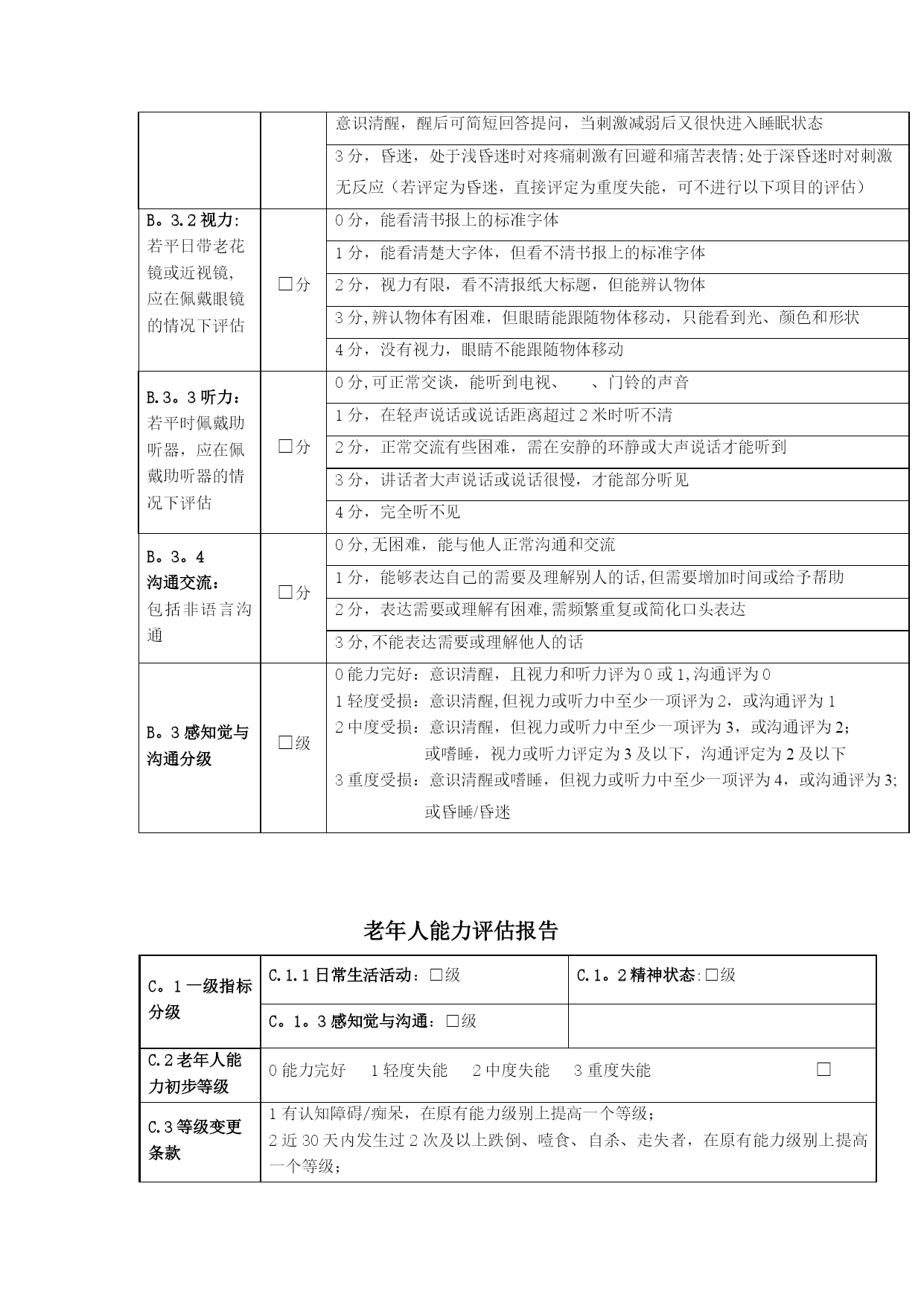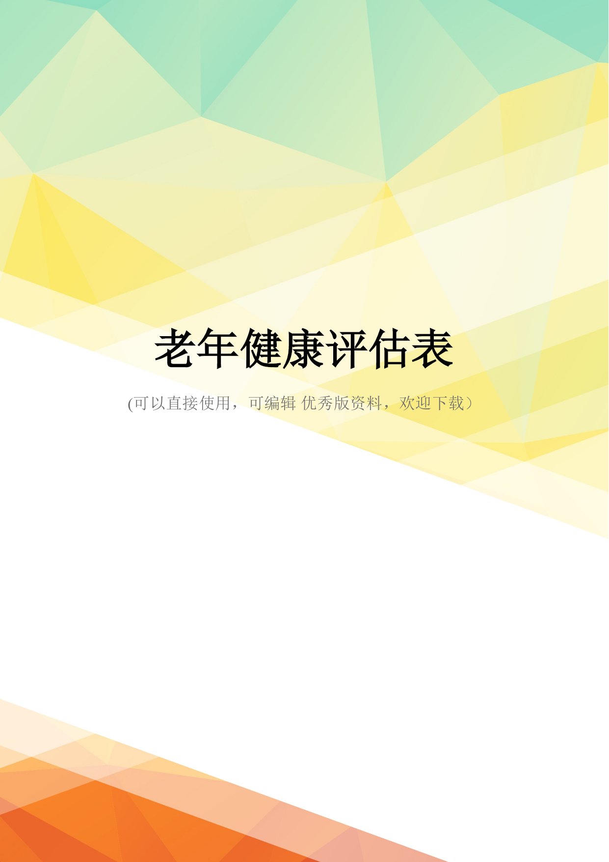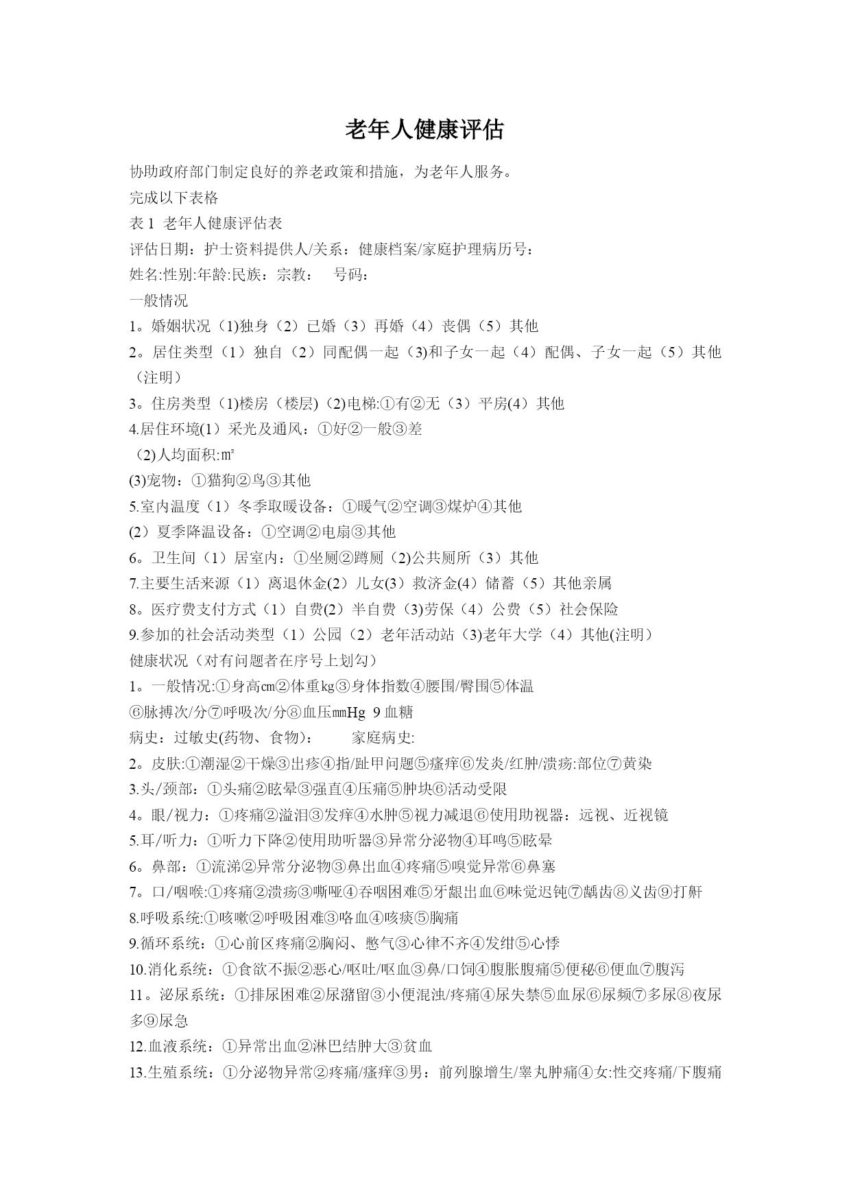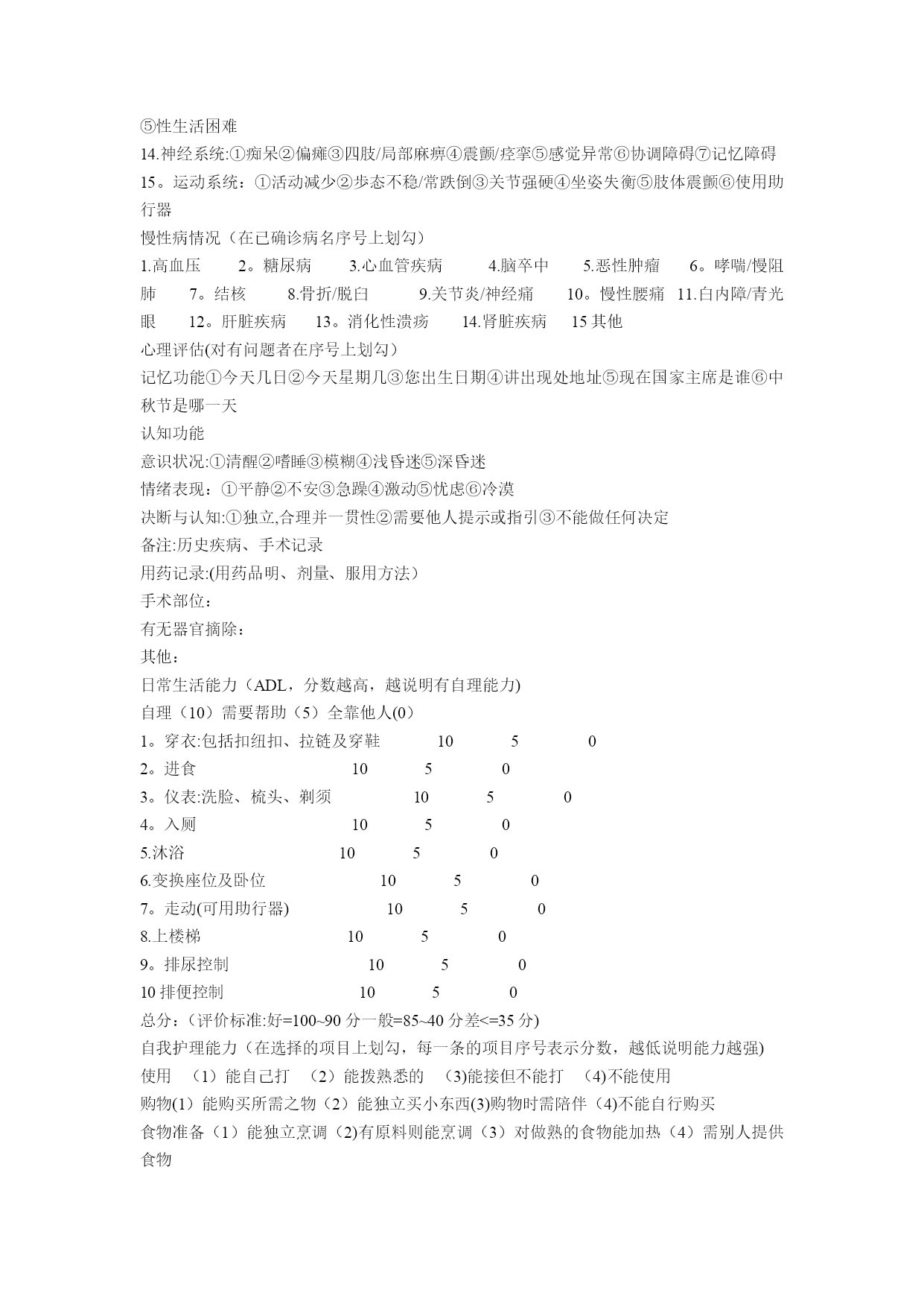 老年健康评估表(可以直接使用,可编辑优秀版资料,欢迎下载)老年人健康评估协助政府部门制定良好的养老政策和措施,为老年人服务。完成以下表格表1老年人健康评估表评估日期:护士资料提供人/关系:健康档案/家庭护理病历号:姓名:性别:年龄:民族:宗教:号码:一般情况1。婚姻状况(1)独身(2)已婚(3)再婚(4)丧偶(5)其他2。居住类型(1)独自(2)同配偶一起(3)和子女一起(4)配偶、子女一起(5)其他(注明)3。住房类型(1)楼房(楼层)(2)电梯:①有②无(3)平房(4)其他4.居住环境(1)采光及通风:①好②一般③差(2)人均面积:㎡(3)宠物:①猫狗②鸟③其他5.室内温度(1)冬季取暖设备:①暖气②空调③煤炉④其他(2)夏季降温设备:①空调②电扇③其他6。卫生间(1)居室内:①坐厕②蹲厕(2)公共厕所(3)其他7.主要生活来源(1)离退休金(2)儿女(3)救济金(4)储蓄(5)其他亲属8。医疗费支付方式(1)自费(2)半自费(3)劳保(4)公费(5)社会保险9.参加的社会活动类型(1)公园(2)老年活动站(3)老年大学(4)其他(注明)健康状况(对有问题者在序号上划勾)1。一般情况:①身高㎝②体重㎏③身体指数④腰围/臀围⑤体温⑥脉搏次/分⑦呼吸次/分⑧血压㎜Hg9血糖病史:过敏史(药物、食物):家庭病史:2。皮肤:①潮湿②干燥③出疹④指/趾甲问题⑤瘙痒⑥发炎/红肿/溃疡:部位⑦黄染3.头/颈部:①头痛②眩晕③强直④压痛⑤肿块⑥活动受限4。眼/视力:①疼痛②溢泪③发痒④水肿⑤视力减退⑥使用助视器:远视、近视镜5.耳/听力:①听力下降②使用助听器③异常分泌物④耳鸣⑤眩晕6。鼻部:①流涕②异常分泌物③鼻出血④疼痛⑤嗅觉异常⑥鼻塞7。口/咽喉:①疼痛②溃疡③嘶哑④吞咽困难⑤牙龈出血⑥味觉迟钝⑦龋齿⑧义齿⑨打鼾8.呼吸系统:①咳嗽②呼吸困难③咯血④咳痰⑤胸痛9.循环系统:①心前区疼痛②胸闷、憋气③心律不齐④发绀⑤心悸10.消化系统:①食欲不振②恶心/呕吐/呕血③鼻/口饲④腹胀腹痛⑤便秘⑥便血⑦腹泻11。泌尿系统:①排尿困难②尿潴留③小便混浊/疼痛④尿失禁⑤血尿⑥尿频⑦多尿⑧夜尿多⑨尿急12.血液系统:①异常出血②淋巴结肿大③贫血13.生殖系统:①分泌物异常②疼痛/瘙痒③男:前列腺增生/睾丸肿痛④女:性交疼痛/下腹痛⑤性生活困难14.神经系统:①痴呆②偏瘫③四肢/局部麻痹④震颤/痉挛⑤感觉异常⑥协调障碍⑦记忆障碍15。运动系统:①活动减少②歩态不稳/常跌倒③关节强硬④坐姿失衡⑤肢体震颤⑥使用助行器慢性病情况(在已确诊病名序号上划勾)1.高血压2。糖尿病3.心血管疾病4.脑卒中5.恶性肿瘤6。哮喘/慢阻肺7。结核8.骨折/脱臼9.关节炎/神经痛10。慢性腰痛11.白内障/青光眼12。肝脏疾病13。消化性溃疡14.肾脏疾病15其他心理评估(对有问题者在序号上划勾)记忆功能①今天几日②今天星期几③您出生日期④讲出现处地址⑤现在国家主席是谁⑥中秋节是哪一天认知功能意识状况:①清醒②嗜睡③模糊④浅昏迷⑤深昏迷情绪表现:①平静②不安③急躁④激动⑤忧虑⑥冷漠决断与认知:①独立,合理并一贯性②需要他人提示或指引③不能做任何决定备注:历史疾病、手术记录用药记录:(用药品明、剂量、服用方法)手术部位:有无器官摘除:其他:日常生活能力(ADL,分数越高,越说明有自理能力)自理(10)需要帮助(5)全靠他人(0)1。穿衣:包括扣纽扣、拉链及穿鞋10502。进食10503。仪表:洗脸、梳头、剃须10504。入厕10505.沐浴10506.变换座位及卧位10507。走动(可用助行器)10508.上楼梯10509。排尿控制105010排便控制1050总分:(评价标准:好=100~90分一般=85~40分差<=35分)自我护理能力(在选择的项目上划勾,每一条的项目序号表示分数,越低说明能力越强)使用(1)能自己打(2)能拨熟悉的(3)能接但不能打(4)不能使用购物(1)能购买所需之物(2)能独立买小东西(3)购物时需陪伴(4)不能自行购买食物准备(1)能独立烹调(2)有原料则能烹调(3)对做熟的食物能加热(4)需别人提供食物家务料理(1)能独自完成所有家务(2)完成较轻的家务(3)完成部分较轻的家务(4)所有家务均需帮助洗衣(1)能洗自己所有衣物(2)能洗小衣物(3)不能洗衣交通方式(1)能独自使用交通工具(2)在别人帮助下能乘出租车或公共汽车(3)不能出外旅行服药能力(1)能主动准确服药(2)能服用事先准备好的药物(3)不能正确服药经济理财(1)能自行理财(2)能计划日常购物,储蓄及消费时需帮助(3)必能自行理财总