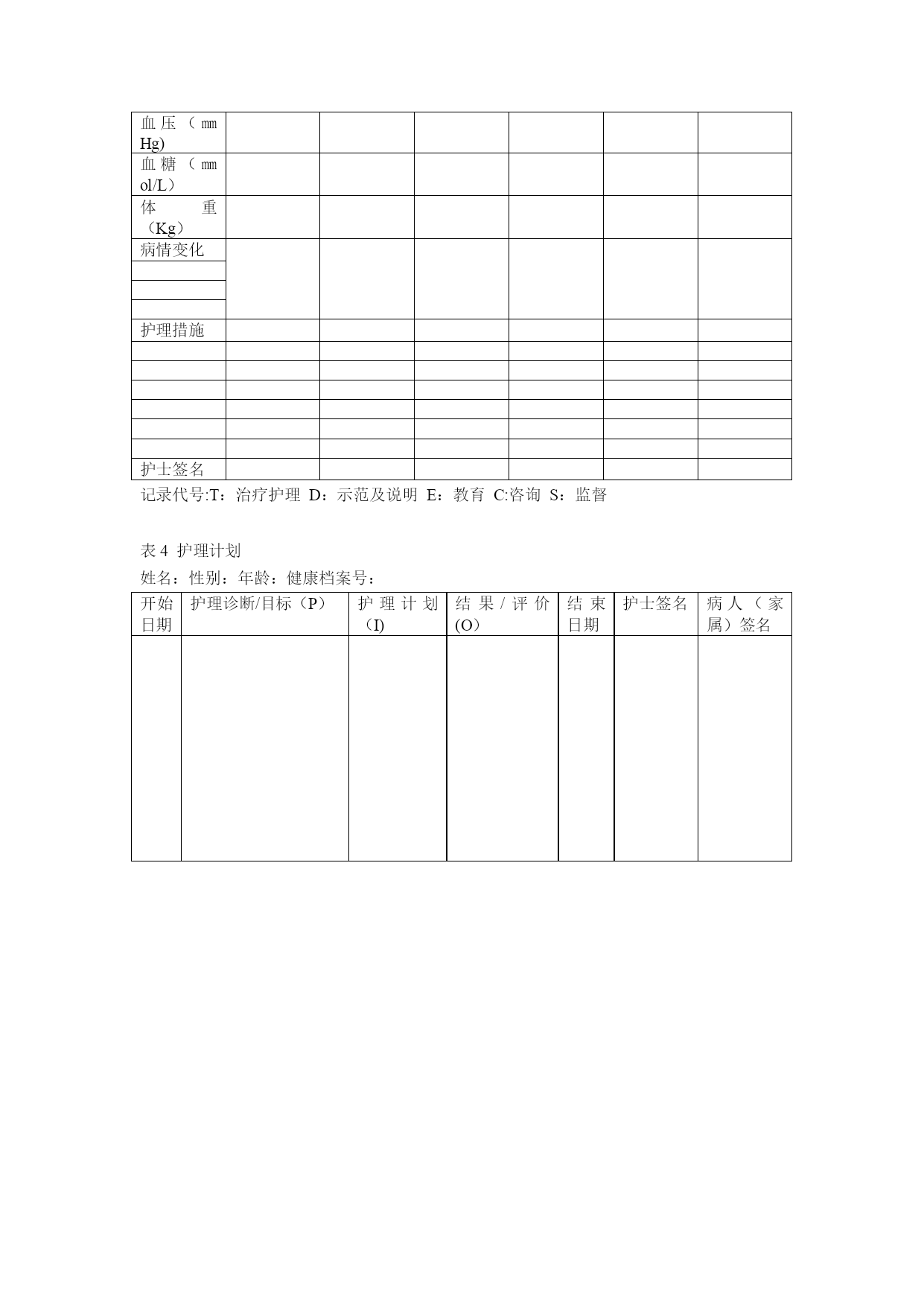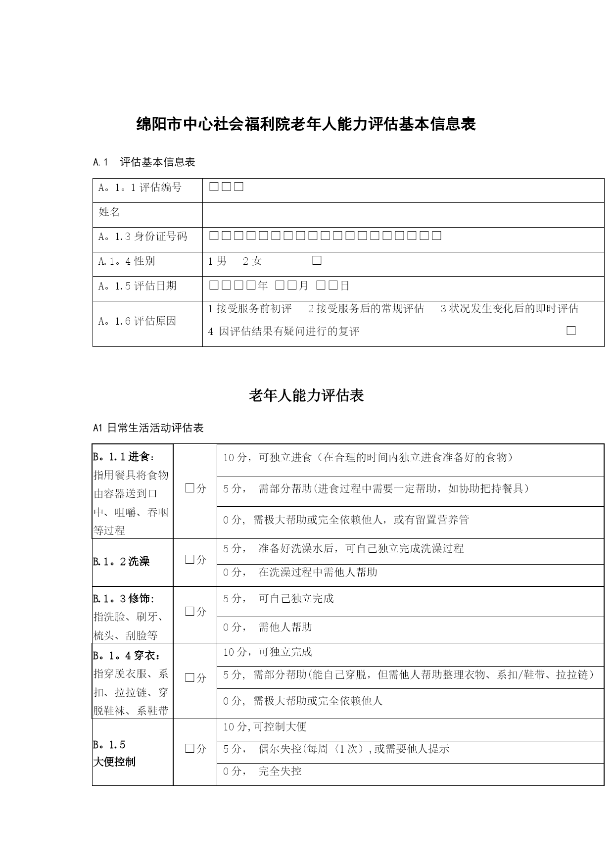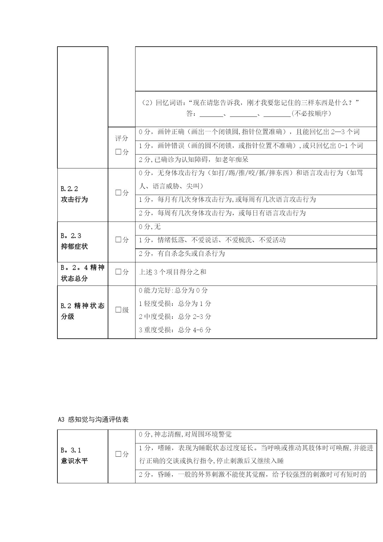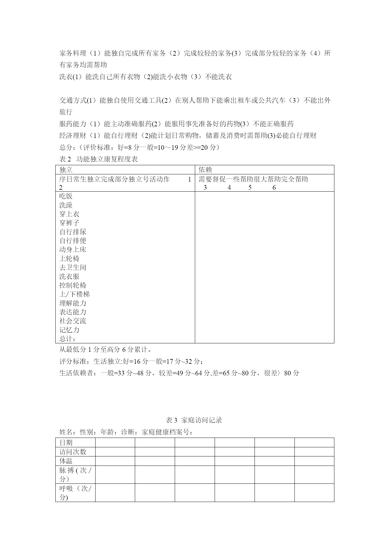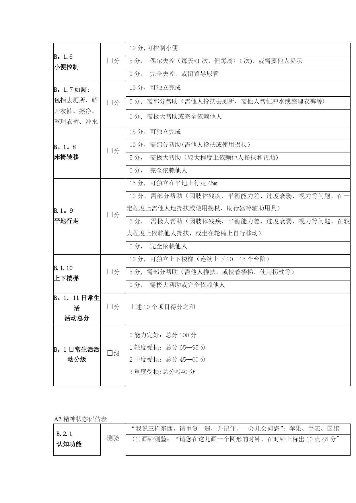 老年健康评估表(可以直接使用,可编辑优秀版资料,欢迎下载)老年人健康评估协助政府部门制定良好的养老政策和措施,为老年人服务。完成以下表格表1老年人健康评估表评估日期:护士资料提供人/关系:健康档案/家庭护理病历号:姓名:性别:年龄:民族:宗教:号码:一般情况1。婚姻状况(1)独身(2)已婚(3)再婚(4)丧偶(5)其他2。居住类型(1)独自(2)同配偶一起(3)和子女一起(4)配偶、子女一起(5)其他(注明)3。住房类型(1)楼房(楼层)(2)电梯:①有②无(3)平房(4)其他4.居住环境(1)采光及通风:①好②一般③差(2)人均面积:㎡(3)宠物:①猫狗②鸟③其他5.室内温度(1)冬季取暖设备:①暖气②空调③煤炉④其他(2)夏季降温设备:①空调②电扇③其他6。卫生间(1)居室内:①坐厕②蹲厕(2)公共厕所(3)其他7.主要生活来源(1)离退休金(2)儿女(3)救济金(4)储蓄(5)其他亲属8。医疗费支付方式(1)自费(2)半自费(3)劳保(4)公费(5)社会保险9.参加的社会活动类型(1)公园(2)老年活动站(3)老年大学(4)其他(注明)健康状况(对有问题者在序号上划勾)1。一般情况:①身高㎝②体重㎏③身体指数④腰围/臀围⑤体温⑥脉搏次/分⑦呼吸次/分⑧血压㎜Hg9血糖病史:过敏史(药物、食物):家庭病史:2。皮肤:①潮湿②干燥③出疹④指/趾甲问题⑤瘙痒⑥发炎/红肿/溃疡:部位⑦黄染3.头/颈部:①头痛②眩晕③强直④压痛⑤肿块⑥活动受限4。眼/视力:①疼痛②溢泪③发痒④水肿⑤视力减退⑥使用助视器:远视、近视镜5.耳/听力:①听力下降②使用助听器③异常分泌物④耳鸣⑤眩晕6。鼻部:①流涕②异常分泌物③鼻出血④疼痛⑤嗅觉异常⑥鼻塞7。口/咽喉:①疼痛②溃疡③嘶哑④吞咽困难⑤牙龈出血⑥味觉迟钝⑦龋齿⑧义齿⑨打鼾8.呼吸系统:①咳嗽②呼吸困难③咯血④咳痰⑤胸痛9.循环系统:①心前区疼痛②胸闷、憋气③心律不齐④发绀⑤心悸10.消化系统:①食欲不振②恶心/呕吐/呕血③鼻/口饲④腹胀腹痛⑤便秘⑥便血⑦腹泻11。泌尿系统:①排尿困难②尿潴留③小便混浊/疼痛④尿失禁⑤血尿⑥尿频⑦多尿⑧夜尿多⑨尿急12.血液系统:①异常出血②淋巴结肿大③贫血13.生殖系统:①分泌物异常②疼痛/瘙痒③男:前列腺增生/睾丸肿痛④女:性交疼痛/下腹痛⑤性生活困难14.神经系统:①痴呆②偏瘫③四肢/局部麻痹④震颤/痉挛⑤感觉异常⑥协调障碍⑦记忆障碍15。运动系统:①活动减少②歩态不稳/常跌倒③关节强硬④坐姿失衡⑤肢体震颤⑥使用助行器慢性病情况(在已确诊病名序号上划勾)1.高血压2。糖尿病3.心血管疾病4.脑卒中5.恶性肿瘤6。哮喘/慢阻肺7。结核8.骨折/脱臼9.关节炎/神经痛10。慢性腰痛11.白内障/青光眼12。肝脏疾病13。消化性溃疡14.肾脏疾病15其他心理评估(对有问题者在序号上划勾)记忆功能①今天几日②今天星期几③您出生日期④讲出现处地址⑤现在国家主席是谁⑥中秋节是哪一天认知功能意识状况:①清醒②嗜睡③模糊④浅昏迷⑤深昏迷情绪表现:①平静②不安③急躁④激动⑤忧虑⑥冷漠决断与认知:①独立,合理并一贯性②需要他人提示或指引③不能做任何决定备注:历史疾病、手术记录用药记录:(用药品明、剂量、服用方法)手术部位:有无器官摘除:其他:日常生活能力(ADL,分数越高,越说明有自理能力)自理(10)需要帮助(5)全靠他人(0)1。穿衣:包括扣纽扣、拉链及穿鞋10502。进食10503。仪表:洗脸、梳头、剃须10504。入厕10505.沐浴10506.变换座位及卧位10507。走动(可用助行器)10508.上楼梯10509。排尿控制105010排便控制1050总分:(评价标准:好=100~90分一般=85~40分差<=35分)自我护理能力(在选择的项目上划勾,每一条的项目序号表示分数,越低说明能力越强)使用(1)能自己打(2)能拨熟悉的(3)能接但不能打(4)不能使用购物(1)能购买所需之物(2)能独立买小东西(3)购物时需陪伴(4)不能自行购买食物准备(1)能独立烹调(2)有原料则能烹调(3)对做熟的食物能加热(4)需别人提供食物家务料理(1)能独自完成所有家务(2)完成较轻的家务(3)完成部分较轻的家务(4)所有家务均需帮助洗衣(1)能洗自己所有衣物(2)能洗小衣物(3)不能洗衣交通方式(1)能独自使用交通工具(2)在别人帮助下能乘出租车或公共汽车(3)不能出外旅行服药能力(1)能主动准确服药(2)能服用事先准备好的药物(3)不能正确服药经济理财(1)能自行理财(2)能计划日常购物,储蓄及消费时需帮助(3)必能自行理财总