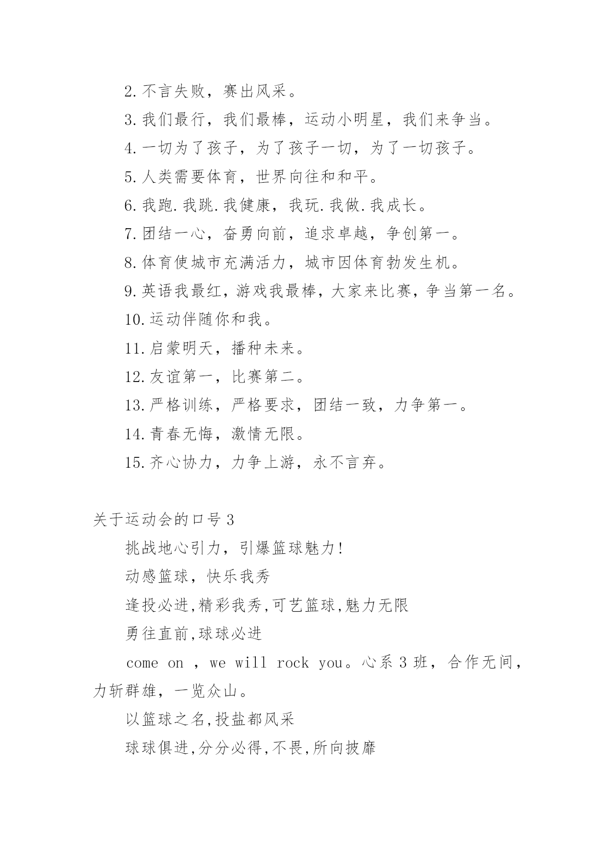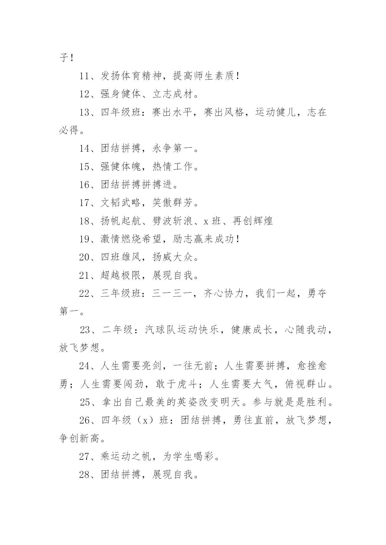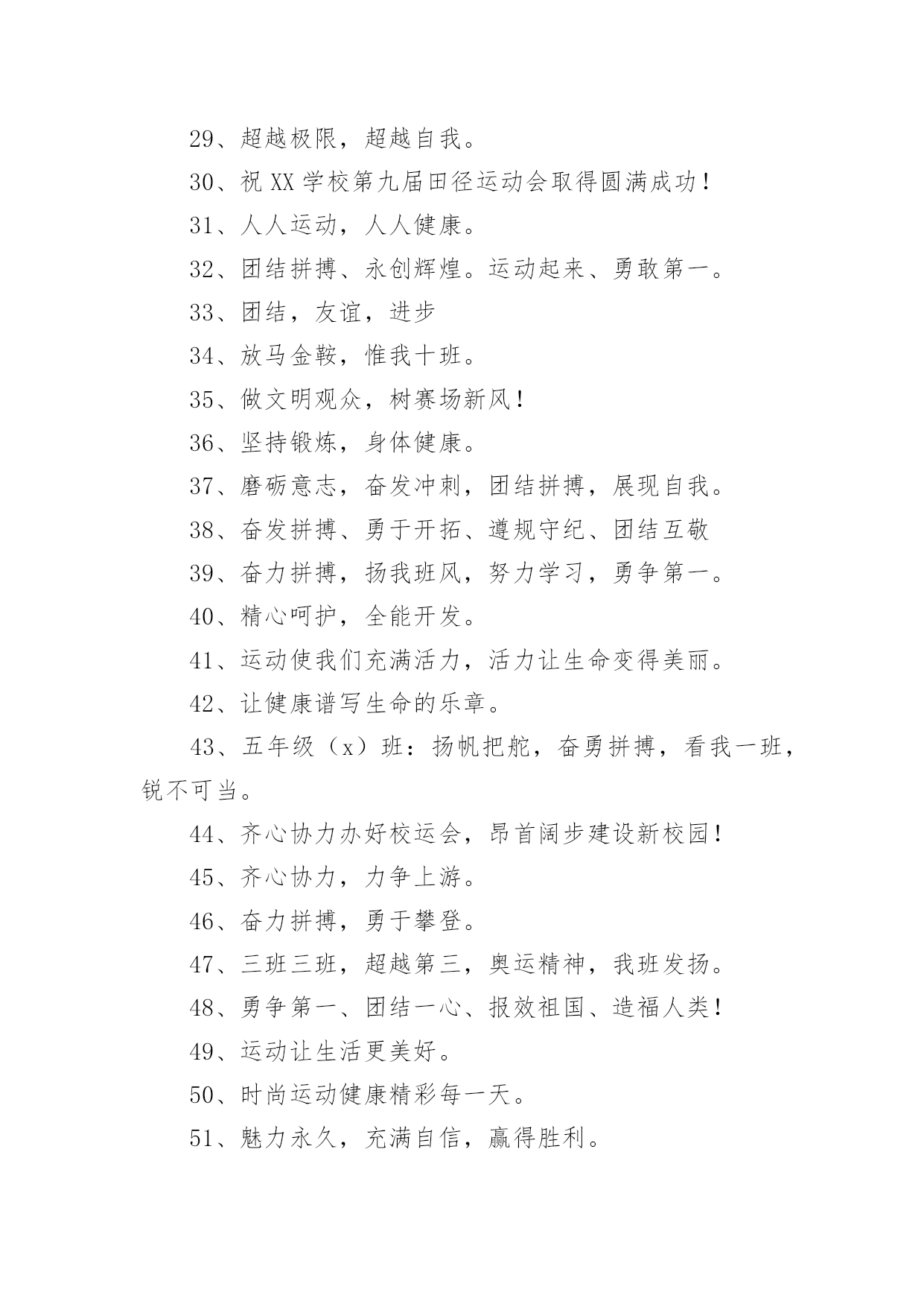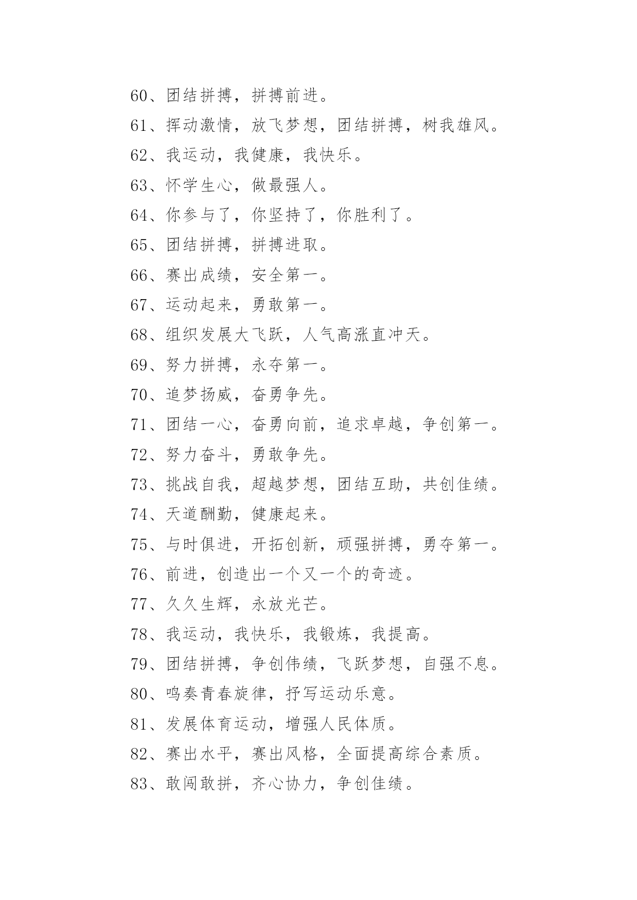运动会的口号关于运动会的口号在现实生活或工作学习中,大家一定没少看到过口号吧,口号作为意识的表现形式之一,是对当时社会政治、经济、文化的一种反映,不同性质的口号起着不同的作用。你还在找寻优秀经典的口号吗?以下是小编精心整理的关于运动会的口号,仅供参考,大家一起来看看吧。关于运动会的口号11、团结进取,开拓创新,顽强拼搏,争创一流。2、谱写生命之歌,弘杨运动精神。3、团结团结,奋进奋进,四(x)四(x),我们爱你。4、步子迈开,让我们飞驰在红色跑道上,用我们的泪水和热血,更改历史的记录,起立吧,歌唱吧!为我们的勇士加油!5、加油吧!努力吧!六一班的运动健儿们,远方胜利的旗帜正向你们招手,成功属于你们,我们大家都期待你们的胜利归来。6、那里是跳高跳远比赛,我们的运动员们,他们灵活的就好像羚羊一般,强劲的弹跳力就好像我们祖国强劲的'经济发展一样,令我们赞叹不已,让我们为他们鼓掌和喝彩。7、团结,友谊,进步;更高,更快,更强。8、亲密五班,合作无间,力挫群雄,舍我其谁。9、你上场,我腿颤;你比赛,我呐喊;你听到,精神满;赛场上,跑得欢;比赛完,摘桂冠;头上戴,笑开颜。10、运动健将们,用你的实力,用你的精神,去开拓出,一片属于你的长跑天地!11、你的吼震撼了你我他,牵动着你我他的心弦,让我们共同演绎这扣人心弦的激情飞荡。让我们共同为群众,我们大家的心,供一份热,点一盏温馨暖人的灯。12、年级班:礼貌守纪,勇争第一,顽强拼搏,拥抱胜利。13、勤学砺志;团结一致,敢于冲刺。14、人生的路,有坦途,也有坎坷;走过的岁月,有欢笑,也有苦涩,泪水告诉我一个跌倒的故事,汗水使我多了一份沉重,几多成熟。15、齐心协力,再创辉煌,勇争冠军,实力无限。16、释放激情,放飞梦想,今天明天,由我创造。17、生命在于运动,成功在于拼搏。18、搏生命之极限,铸青春之辉煌。19、今日的你们英姿飒爽,今日的你们朝气蓬勃,今日的你们一马当先。相信自己,你是最棒的!不要放弃,不要气馁。成功永远属于你们。米运动员啊!加油啊!关于运动会的口号21.不鸣则已,一鸣惊人。2.不言失败,赛出风采。3.我们最行,我们最棒,运动小明星,我们来争当。4.一切为了孩子,为了孩子一切,为了一切孩子。5.人类需要体育,世界向往和和平。6.我跑.我跳.我健康,我玩.我做.我成长。7.团结一心,奋勇向前,追求卓越,争创第一。8.体育使城市充满活力,城市因体育勃发生机。9.英语我最红,游戏我最棒,大家来比赛,争当第一名。10.运动伴随你和我。11.启蒙明天,播种未来。12.友谊第一,比赛第二。13.严格训练,严格要求,团结一致,力争第一。14.青春无悔,激情无限。15.齐心协力,力争上游,永不言弃。关于运动会的口号3挑战地心引力,引爆篮球魅力!动感篮球,快乐我秀逢投必进,精彩我秀,可艺篮球,魅力无限勇往直前,球球必进comeon,wewillrockyou。心系3班,合作无间,力斩群雄,一览众山。以篮球之名,投盐都风采球球俱进,分分必得,不畏,所向披靡好好干,胜利跟着你们转。速录3加加油,胜利就在你前头某人进3分:全场最帅。我们崇拜。三分线外,手起足落,完美弧线,得分容易七班男篮,志在夺冠,纵横球场,谁与争天七班七班,法力无边!东风吹,战鼓擂,七班男篮怕过谁凌云赛场,斗志昂扬。放马金鞍,唯我3班关于运动会的口号41、六年级班:六二精英,敢闯敢拼,齐心协力,争创佳绩。2、比出风采,超越自我。3、一年级班:团结进取,争创佳绩,努力拼搏,挑战自我。4、以人为本,实施素质教育,开展积极向上的校园体育活动!5、乘运动之风,为生命喝彩。6、参加体育运动,做阳光少年。7、比出风采、超越自我。团结拼搏、奋发有为。8、扬帆起航,劈波斩浪,再创辉煌。9、放心去飞,勇敢去追,追一切我们未完成的梦。10、每天锻炼一小时,健康工作五十年,幸福生活一辈子!11、发扬体育精神,提高师生素质!12、强身健体、立志成材。13、四年级班:赛出水平,赛出风格,运动健儿,志在必得。14、团结拼搏,永争第一。15、强健体魄,热情工作。16、团结拼搏拼搏进。17、文韬武略,笑傲群芳。18、扬帆起航、劈波斩浪、x班、再创辉煌19、激情燃烧希望,励志赢来成功!20、四班雄风,扬威大众。21、超越极限,展现自我。22、三年级班:三一三一,齐心协力,我们一起,勇夺第一。23、二年级:汽球队运动快乐,健康成长,心随我动,放飞梦想。24、人生需要亮剑,一往无前;人生需要拼搏,愈挫愈勇;人生需要闯劲,敢于虎斗;人生需要大气,俯视群山。25、拿出自己最美的英姿改变明天。参与就是是胜利。26、四年级(x)班:团结拼搏,勇往直前,放飞梦想,争创新高。27、乘运动之帆,为学生喝彩。28、团结拼搏,展现自我。29、超越极限,超越自我。30、祝XX学校第九届田
