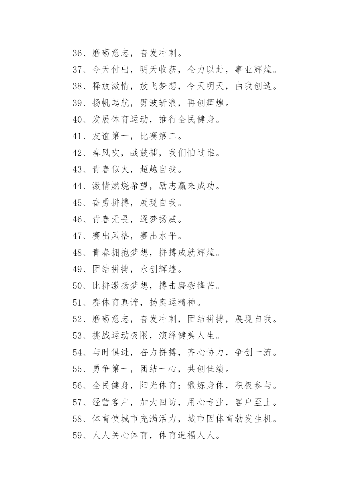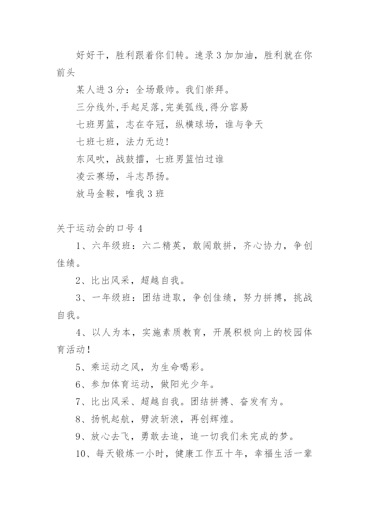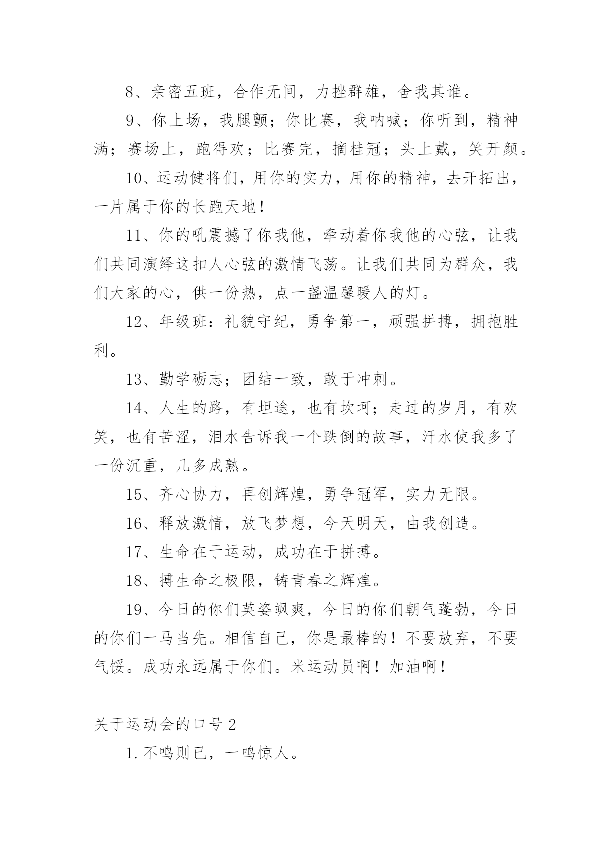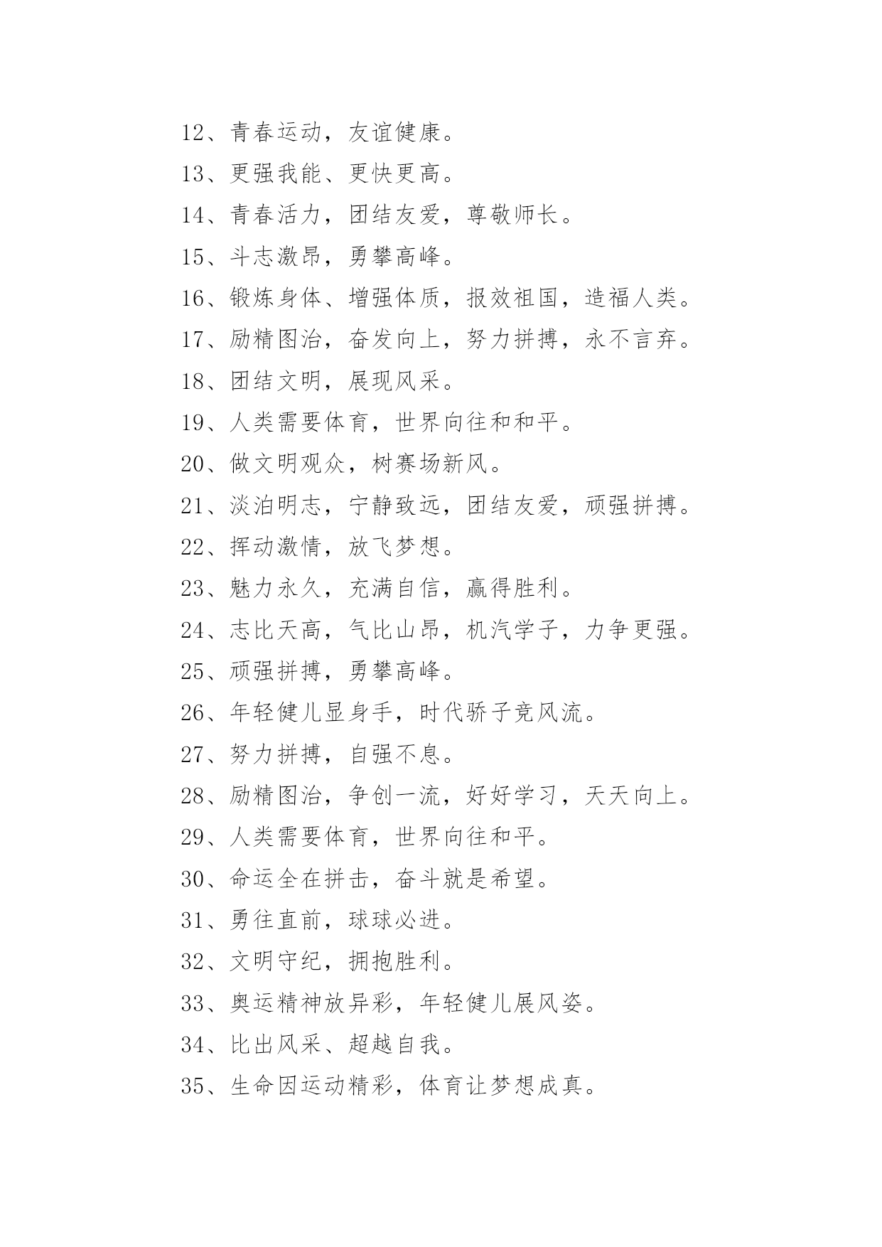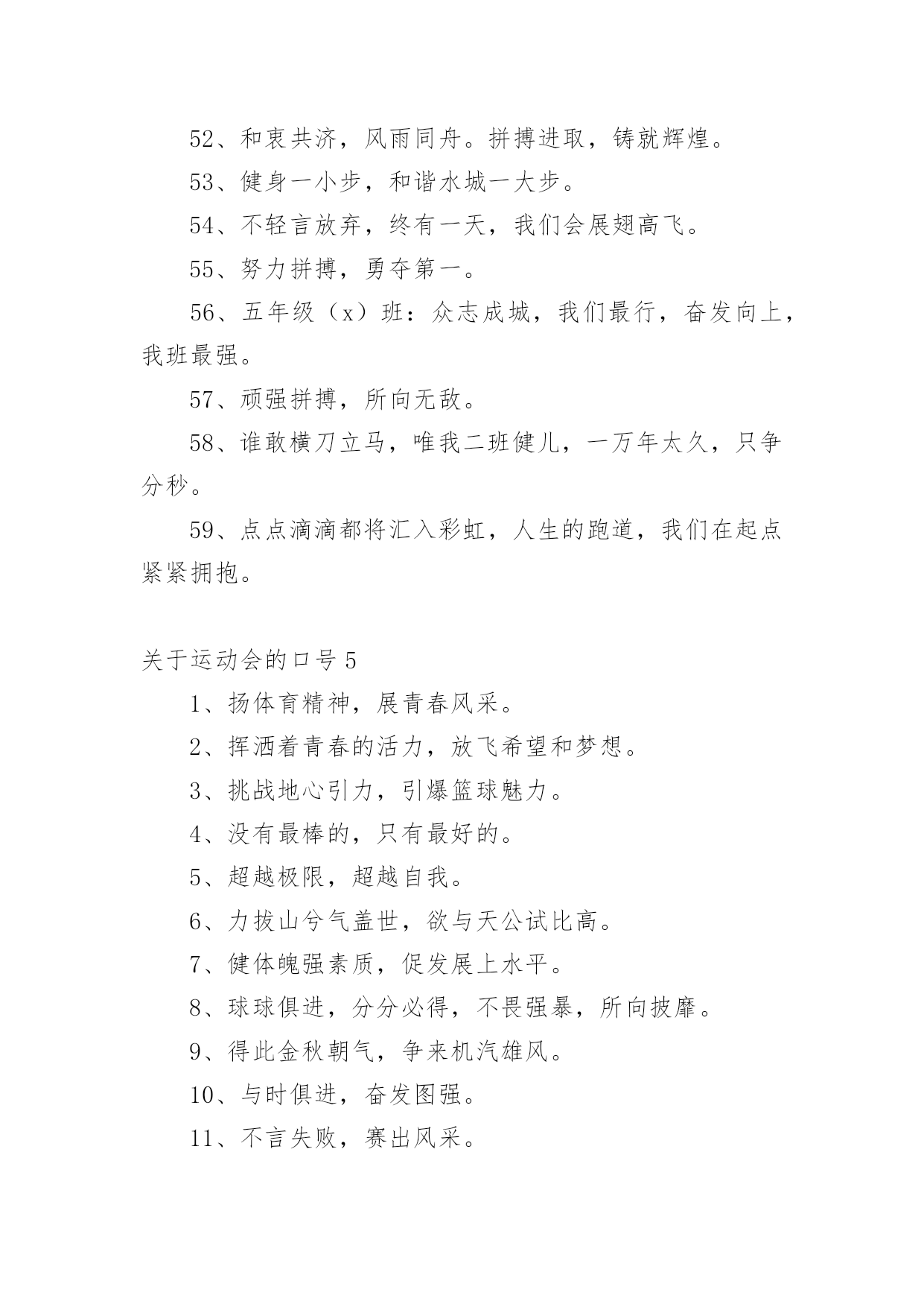 运动会的口号关于运动会的口号在现实生活或工作学习中,大家一定没少看到过口号吧,口号作为意识的表现形式之一,是对当时社会政治、经济、文化的一种反映,不同性质的口号起着不同的作用。你还在找寻优秀经典的口号吗?以下是小编精心整理的关于运动会的口号,仅供参考,大家一起来看看吧。关于运动会的口号11、团结进取,开拓创新,顽强拼搏,争创一流。2、谱写生命之歌,弘杨运动精神。3、团结团结,奋进奋进,四(x)四(x),我们爱你。4、步子迈开,让我们飞驰在红色跑道上,用我们的泪水和热血,更改历史的记录,起立吧,歌唱吧!为我们的勇士加油!5、加油吧!努力吧!六一班的运动健儿们,远方胜利的旗帜正向你们招手,成功属于你们,我们大家都期待你们的胜利归来。6、那里是跳高跳远比赛,我们的运动员们,他们灵活的就好像羚羊一般,强劲的弹跳力就好像我们祖国强劲的'经济发展一样,令我们赞叹不已,让我们为他们鼓掌和喝彩。7、团结,友谊,进步;更高,更快,更强。8、亲密五班,合作无间,力挫群雄,舍我其谁。9、你上场,我腿颤;你比赛,我呐喊;你听到,精神满;赛场上,跑得欢;比赛完,摘桂冠;头上戴,笑开颜。10、运动健将们,用你的实力,用你的精神,去开拓出,一片属于你的长跑天地!11、你的吼震撼了你我他,牵动着你我他的心弦,让我们共同演绎这扣人心弦的激情飞荡。让我们共同为群众,我们大家的心,供一份热,点一盏温馨暖人的灯。12、年级班:礼貌守纪,勇争第一,顽强拼搏,拥抱胜利。13、勤学砺志;团结一致,敢于冲刺。14、人生的路,有坦途,也有坎坷;走过的岁月,有欢笑,也有苦涩,泪水告诉我一个跌倒的故事,汗水使我多了一份沉重,几多成熟。15、齐心协力,再创辉煌,勇争冠军,实力无限。16、释放激情,放飞梦想,今天明天,由我创造。17、生命在于运动,成功在于拼搏。18、搏生命之极限,铸青春之辉煌。19、今日的你们英姿飒爽,今日的你们朝气蓬勃,今日的你们一马当先。相信自己,你是最棒的!不要放弃,不要气馁。成功永远属于你们。米运动员啊!加油啊!关于运动会的口号21.不鸣则已,一鸣惊人。2.不言失败,赛出风采。3.我们最行,我们最棒,运动小明星,我们来争当。4.一切为了孩子,为了孩子一切,为了一切孩子。5.人类需要体育,世界向往和和平。6.我跑.我跳.我健康,我玩.我做.我成长。7.团结一心,奋勇向前,追求卓越,争创第一。8.体育使城市充满活力,城市因体育勃发生机。9.英语我最红,游戏我最棒,大家来比赛,争当第一名。10.运动伴随你和我。11.启蒙明天,播种未来。12.友谊第一,比赛第二。13.严格训练,严格要求,团结一致,力争第一。14.青春无悔,激情无限。15.齐心协力,力争上游,永不言弃。关于运动会的口号3挑战地心引力,引爆篮球魅力!动感篮球,快乐我秀逢投必进,精彩我秀,可艺篮球,魅力无限勇往直前,球球必进comeon,wewillrockyou。心系3班,合作无间,力斩群雄,一览众山。以篮球之名,投盐都风采球球俱进,分分必得,不畏,所向披靡好好干,胜利跟着你们转。速录3加加油,胜利就在你前头某人进3分:全场最帅。我们崇拜。三分线外,手起足落,完美弧线,得分容易七班男篮,志在夺冠,纵横球场,谁与争天七班七班,法力无边!东风吹,战鼓擂,七班男篮怕过谁凌云赛场,斗志昂扬。放马金鞍,唯我3班关于运动会的口号41、六年级班:六二精英,敢闯敢拼,齐心协力,争创佳绩。2、比出风采,超越自我。3、一年级班:团结进取,争创佳绩,努力拼搏,挑战自我。4、以人为本,实施素质教育,开展积极向上的校园体育活动!5、乘运动之风,为生命喝彩。6、参加体育运动,做阳光少年。7、比出风采、超越自我。团结拼搏、奋发有为。8、扬帆起航,劈波斩浪,再创辉煌。9、放心去飞,勇敢去追,追一切我们未完成的梦。10、每天锻炼一小时,健康工作五十年,幸福生活一辈子!11、发扬体育精神,提高师生素质!12、强身健体、立志成材。13、四年级班:赛出水平,赛出风格,运动健儿,志在必得。14、团结拼搏,永争第一。15、强健体魄,热情工作。16、团结拼搏拼搏进。17、文韬武略,笑傲群芳。18、扬帆起航、劈波斩浪、x班、再创辉煌19、激情燃烧希望,励志赢来成功!20、四班雄风,扬威大众。21、超越极限,展现自我。22、三年级班:三一三一,齐心协力,我们一起,勇夺第一。23、二年级:汽球队运动快乐,健康成长,心随我动,放飞梦想。24、人生需要亮剑,一往无前;人生需要拼搏,愈挫愈勇;人生需要闯劲,敢于虎斗;人生需要大气,俯视群山。25、拿出自己最美的英姿改变明天。参与就是是胜利。26、四年级(x)班:团结拼搏,勇往直前,放飞梦想,争创新高。27、乘运动之帆,为学生喝彩。28、团结拼搏,展现自我。29、超越极限,超越自我。30、祝XX学校第九届田