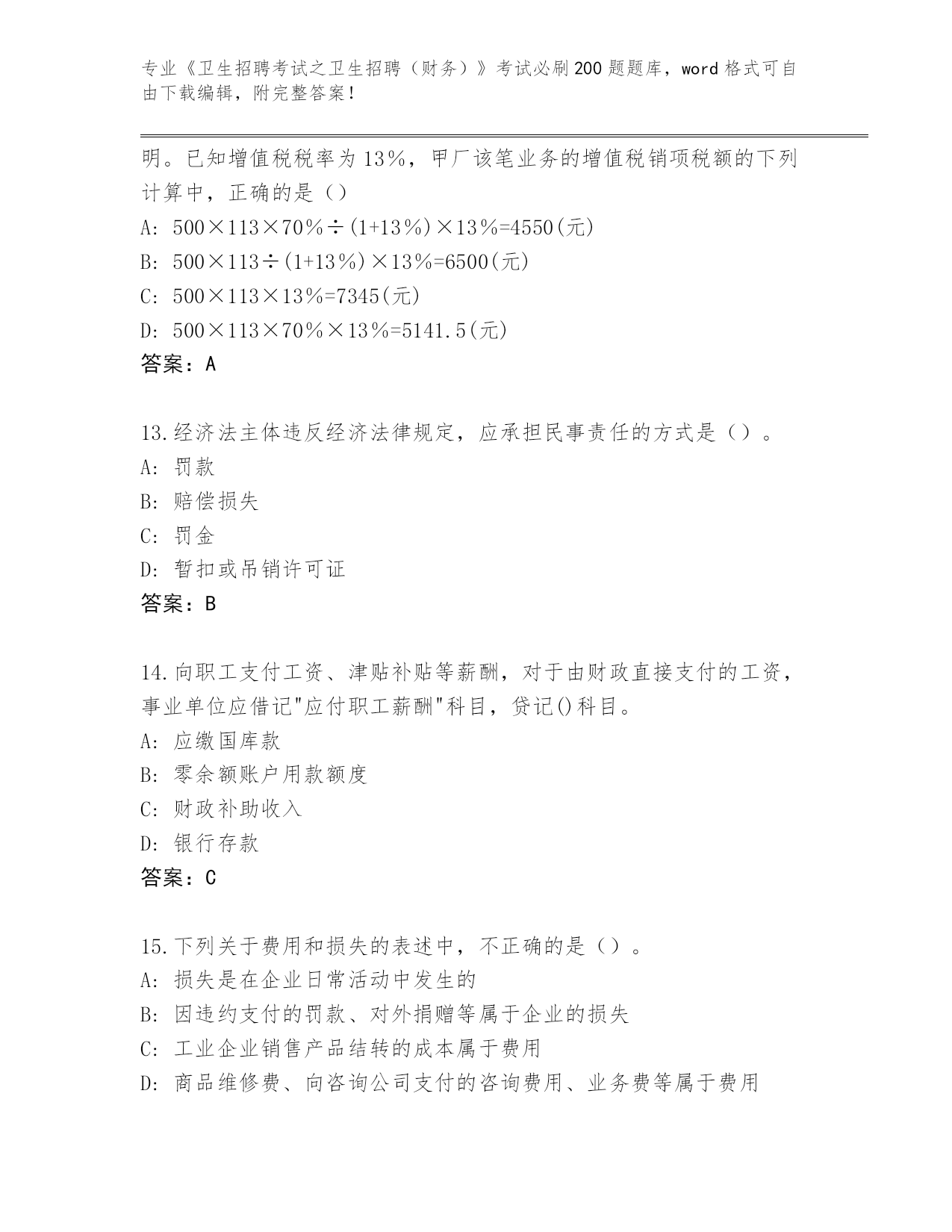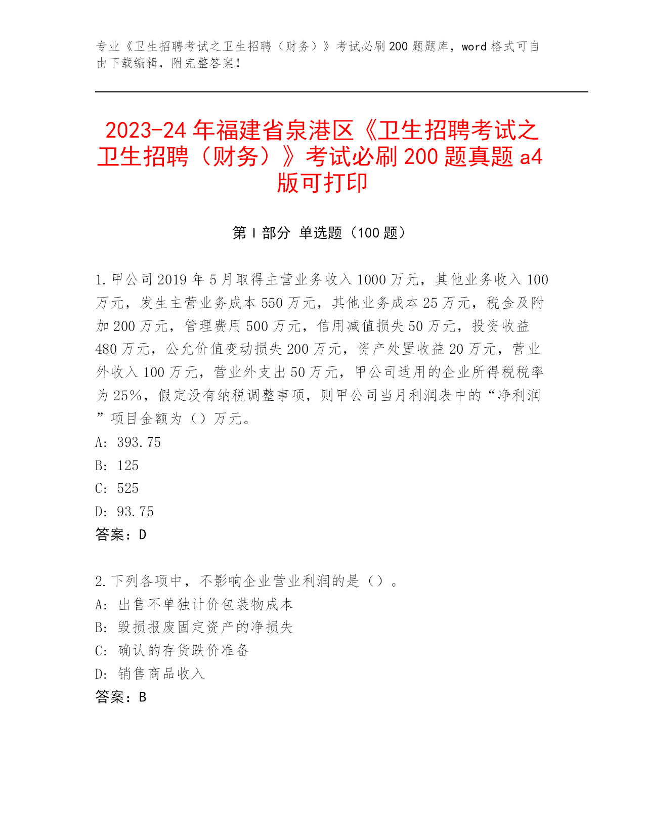 2023-24年福建省泉港区《卫生招聘考试之卫生招聘(财务)》考试必刷200题真题a4版可打印