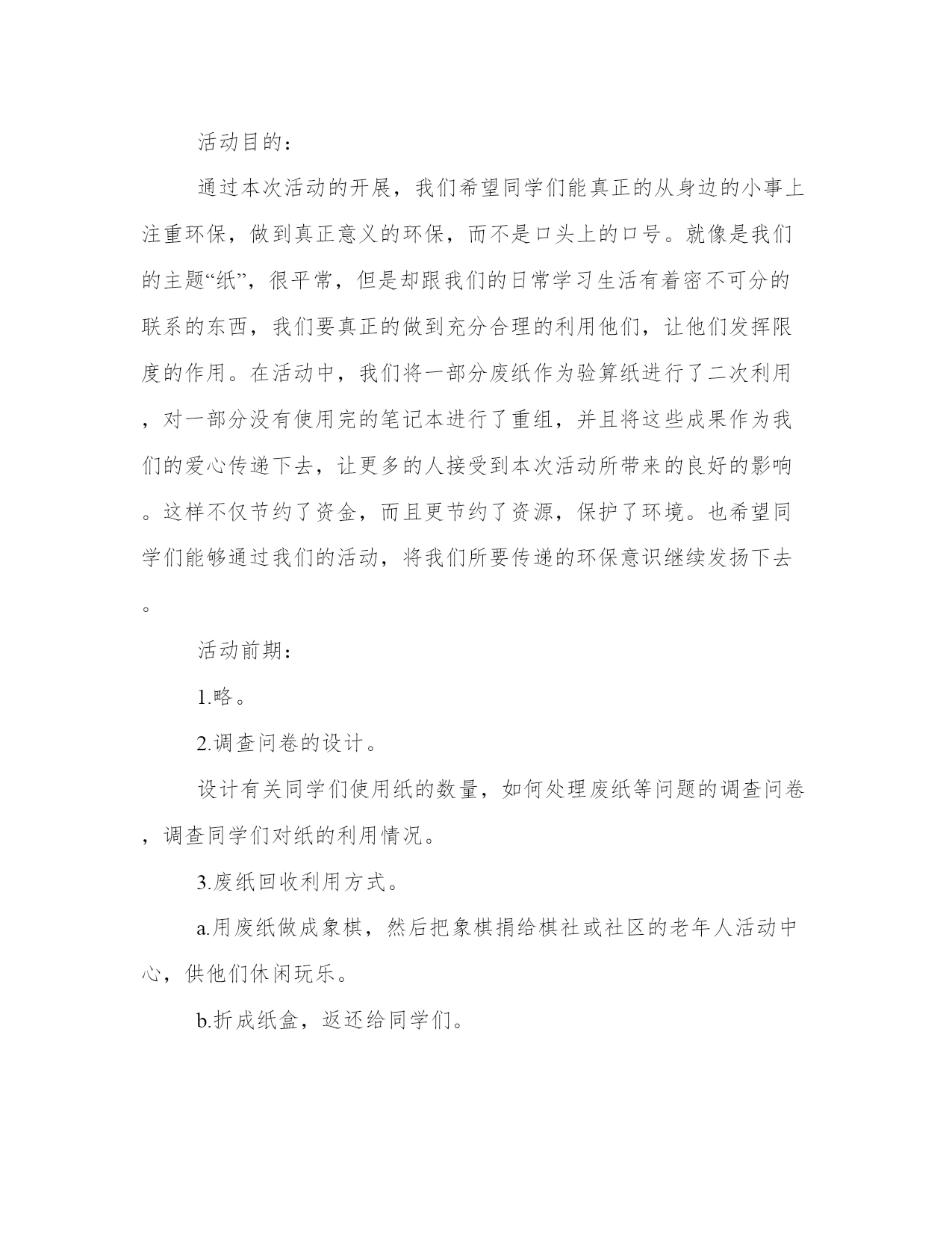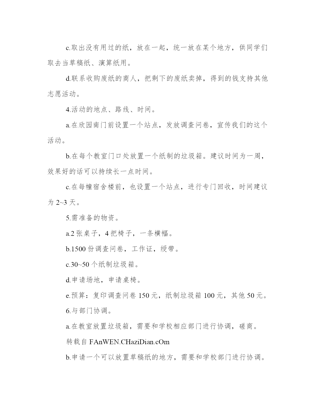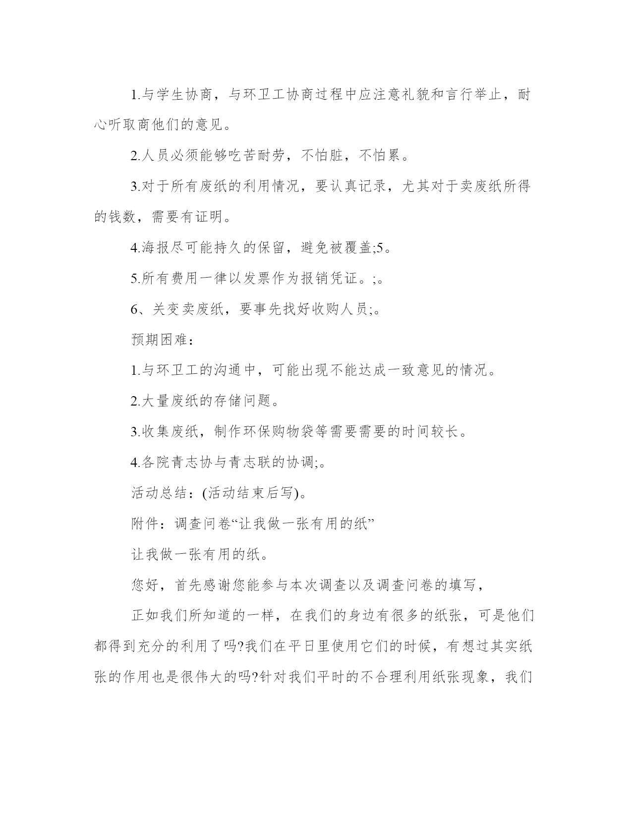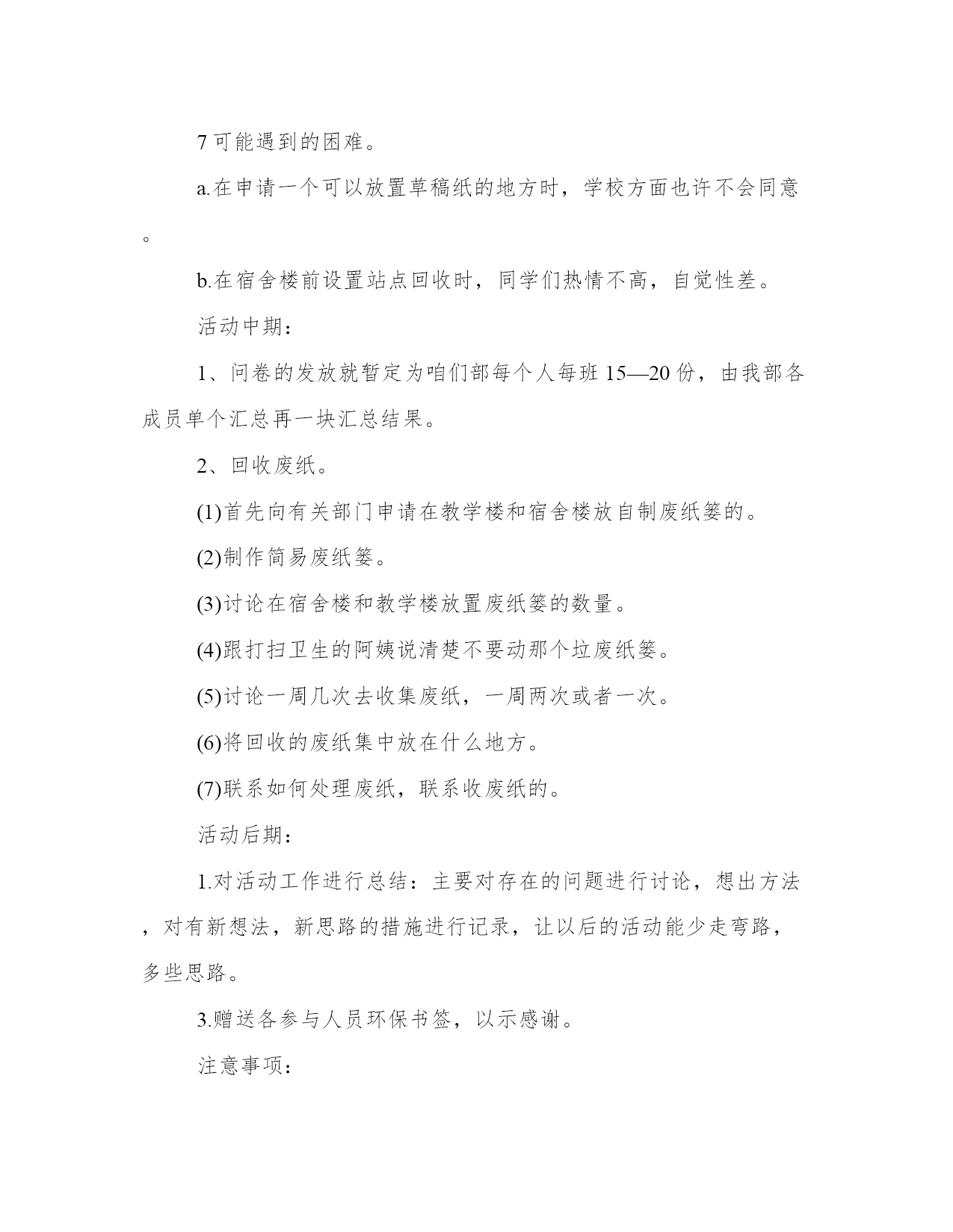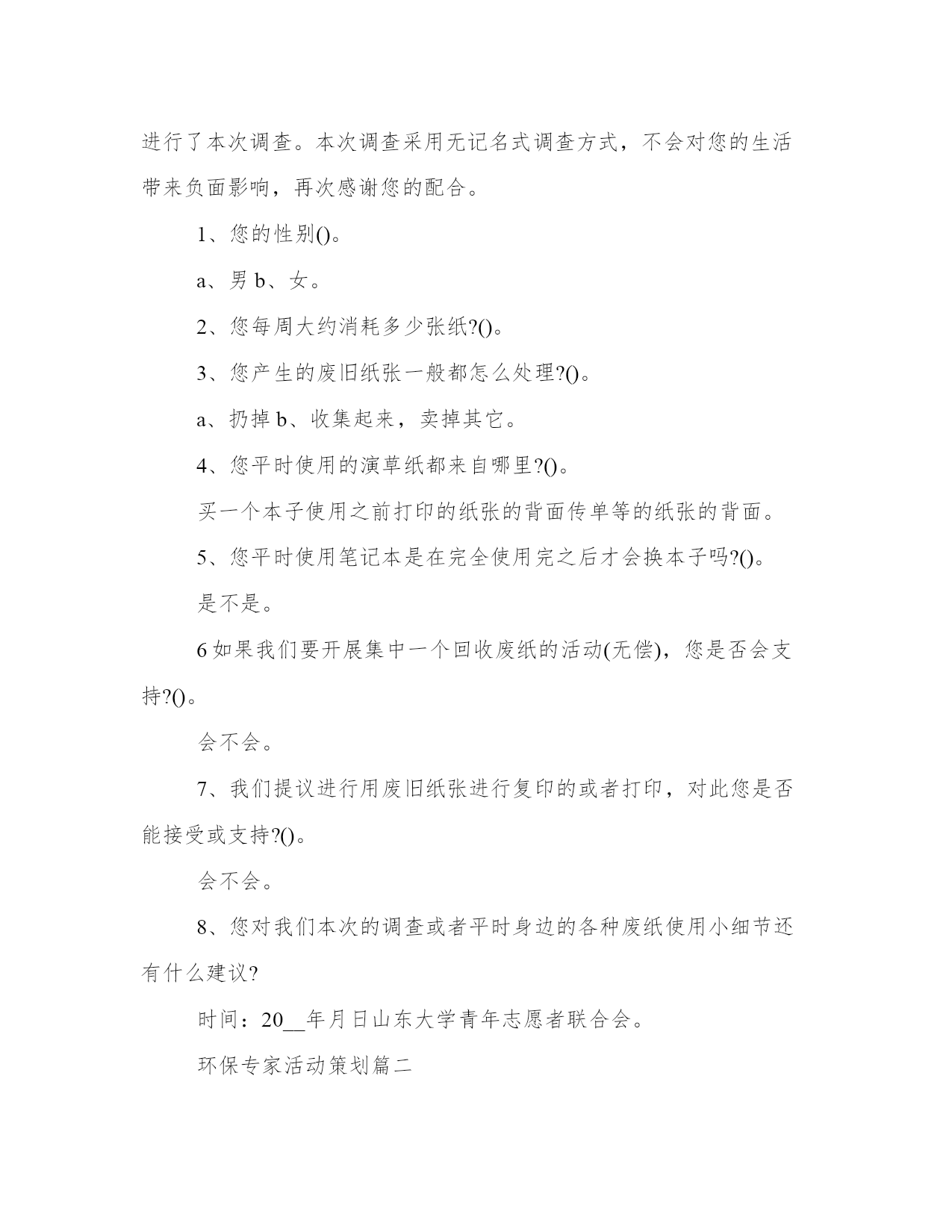 环保专家活动策划(专业21篇)通过总结,我们能够更好地规划未来的发展方向。总结的写作过程中应该注意哪些问题,怎样提高写作效率?掌握了以下几个实用的总结写作技巧,你就能写出一篇优秀的总结。环保专家活动策划篇一策划协办:山东大学青年志愿者联合会。时间:地点:山东大学兴隆山校区。面向群体:山东大学兴隆山校区全体同学。活动概况:环保,一个多么常见的词语,人们都说“要环保要环保”,可是认认真真做的却很少。废纸,一个多么常见的可利用资源,可是真真正正利用时效果却不好。针对这个情况,我们以废纸为主体内容,依此开展以下主要活动:1.活动宣传:包括海报宣传,传单宣传等。3.回收废纸:回收过程中将进行废纸分类,达到限度的物尽其用。4.废纸再利用:如将未用完的笔记本改造成新笔记本并捐给灾区,将废纸做成环保购物袋。5.活动反馈:将以口头采访,反馈问卷等形式开展。活动目的:通过本次活动的开展,我们希望同学们能真正的从身边的小事上注重环保,做到真正意义的环保,而不是口头上的口号。就像是我们的主题“纸”,很平常,但是却跟我们的日常学习生活有着密不可分的联系的东西,我们要真正的做到充分合理的利用他们,让他们发挥限度的作用。在活动中,我们将一部分废纸作为验算纸进行了二次利用,对一部分没有使用完的笔记本进行了重组,并且将这些成果作为我们的爱心传递下去,让更多的人接受到本次活动所带来的良好的影响。这样不仅节约了资金,而且更节约了资源,保护了环境。也希望同学们能够通过我们的活动,将我们所要传递的环保意识继续发扬下去。活动前期:1.略。2.调查问卷的设计。设计有关同学们使用纸的数量,如何处理废纸等问题的调查问卷,调查同学们对纸的利用情况。3.废纸回收利用方式。a.用废纸做成象棋,然后把象棋捐给棋社或社区的老年人活动中心,供他们休闲玩乐。b.折成纸盒,返还给同学们。c.取出没有用过的纸,放在一起,统一放在某个地方,供同学们取去当草稿纸、演算纸用。d.联系收购废纸的商人,把剩下的废纸卖掉,得到的钱支持其他志愿活动。4.活动的地点、路线、时间。a.在欣园南门前设置一个站点,发放调查问卷,宣传我们的这个活动。b.在每个教室门口处放置一个纸制的垃圾箱。建议时间为一周,效果好的话可以持续长一点时间。c.在每幢宿舍楼前,也设置一个站点,进行专门回收,时间建议为2~3天。5.需准备的物资。a.2张桌子,4把椅子,一条横幅。b.1500份调查问卷,工作证,绶带。c.30~50个纸制垃圾箱。d.申请场地,申请桌椅。e.预算:复印调查问卷150元,纸制垃圾箱100元,其他50元。6.与部门协调。a.在教室放置垃圾箱,需要和学校相应部门进行协调,磋商。转载自FAnWEN.CHaziDian.cOmb.申请一个可以放置草稿纸的地方,需要和学校部门进行协调。7可能遇到的困难。a.在申请一个可以放置草稿纸的地方时,学校方面也许不会同意。b.在宿舍楼前设置站点回收时,同学们热情不高,自觉性差。活动中期:1、问卷的发放就暂定为咱们部每个人每班15—20份,由我部各成员单个汇总再一块汇总结果。2、回收废纸。(1)首先向有关部门申请在教学楼和宿舍楼放自制废纸篓的。(2)制作简易废纸篓。(3)讨论在宿舍楼和教学楼放置废纸篓的数量。(4)跟打扫卫生的阿姨说清楚不要动那个垃废纸篓。(5)讨论一周几次去收集废纸,一周两次或者一次。(6)将回收的废纸集中放在什么地方。(7)联系如何处理废纸,联系收废纸的。活动后期:1.对活动工作进行总结:主要对存在的问题进行讨论,想出方法,对有新想法,新思路的措施进行记录,让以后的活动能少走弯路,多些思路。3.赠送各参与人员环保书签,以示感谢。注意事项:1.与学生协商,与环卫工协商过程中应注意礼貌和言行举止,耐心听取商他们的意见。2.人员必须能够吃苦耐劳,不怕脏,不怕累。3.对于所有废纸的利用情况,要认真记录,尤其对于卖废纸所得的钱数,需要有证明。4.海报尽可能持久的保留,避免被覆盖;5。5.所有费用一律以发票作为报销凭证。;。6、关变卖废纸,要事先找好收购人员;。预期困难:1.与环卫工的沟通中,可能出现不能达成一致意见的情况。2.大量废纸的存储问题。3.收集废纸,制作环保购物袋等需要需要的时间较长。4.各院青志协与青志联的协调;。活动总结:(活动结束后写)。附件:调查问卷“让我做一张有用的纸”让我做一张有用的纸。您好,首先感谢您能参与本次调查以及调查问卷的填写,正如我们所知道的一样,在我们的身边有很多的纸张,可是他们都得到充分的利用了吗?我们在平日里使用它们的时候,有想过其实纸张的作用也是很伟大的吗?针对我们平时的不合理利用纸张现象,我们进