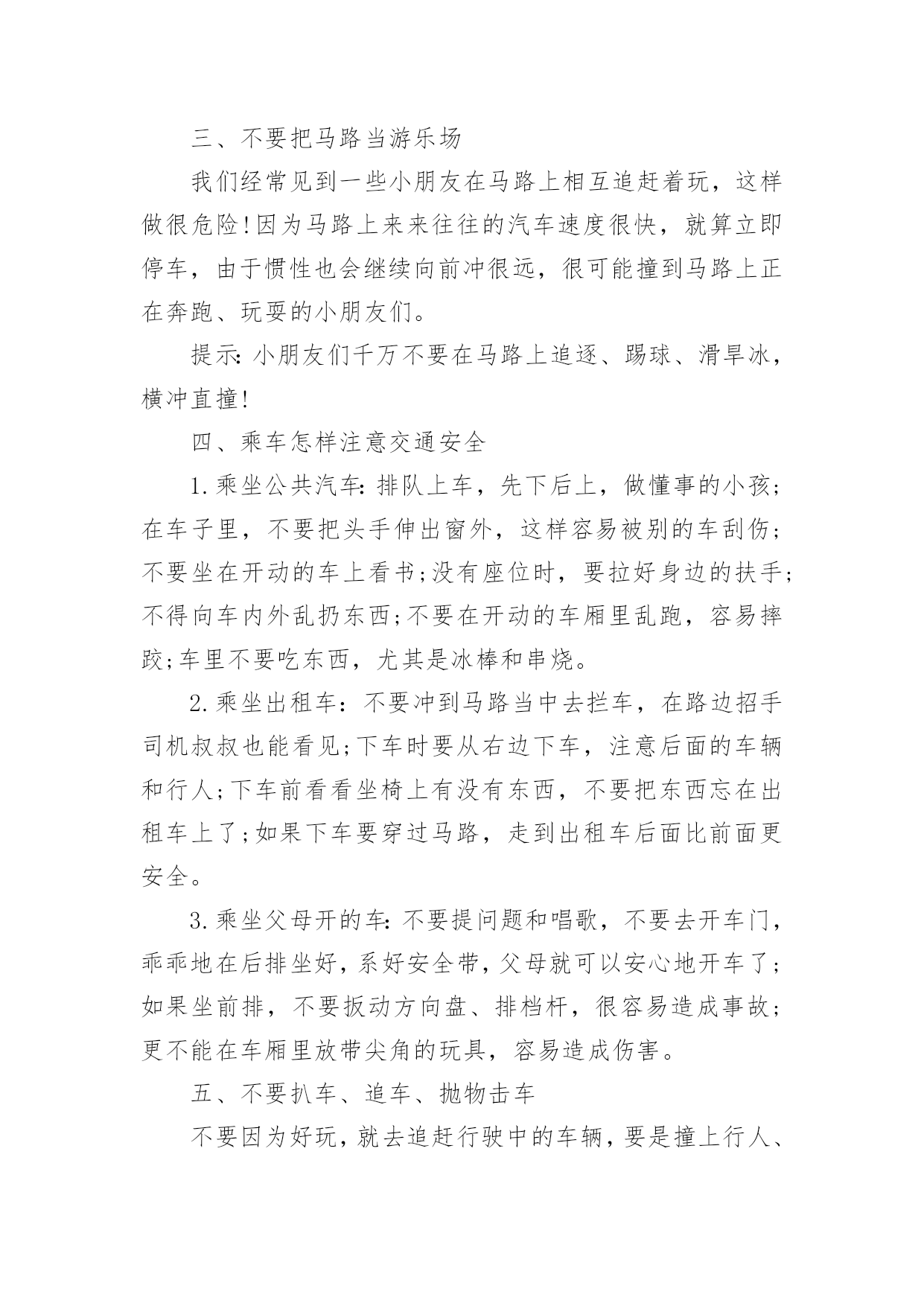 幼儿中班交通安全教案作为一位兢兢业业的人民教师,常常要根据教学需要编写教案,编写教案有利于我们弄通教材内容,进而选择科学、恰当的教学方法。我们应该怎么写教案呢?下面是小编为大家收集的幼儿中班交通安全教案,仅供参考,大家一起来看看吧。幼儿中班交通安全教案1一、活动目标:1、让幼儿知道汽车及其他交通工具行驶时都有特定的范围和特定的规则。2、使幼儿懂得人们必须自觉遵守交通规则,注意交通安全。3、引导幼儿理解各种交通标志。二、活动准备:1、环境布置:①小环境布置一幅“热闹的马路”的主题墙饰。②室外创设一条“模拟马路”。2、知识准备:①幼儿对马路上的'交通标志有了初步的感性理解。②幼儿已有一定的安全意识。3、物质准备:马路范图一张,小老鼠开车卡片一张,常见的交通标志一套,“人、汽车、自行车”等标志人手一个。三、活动过程:1、故事引入。以故事《乡下老鼠逛公园》引入话题,教育幼儿理解各种标志。2、理解标志。以帮小老鼠的忙,逐一出示交通标志,提问:这是什么标志?标志上画有什么?表示什么意思?3、游戏:我指你说。老师指出某一交通标志,让幼儿说出该标志所代表的意思。4、游戏:过马路。让幼儿挂上各种交通标志,(人、或车)扮演各种交通工具,在模拟的马路上亲自体验各种交通标志的作用。幼儿中班交通安全教案2设计意图:中班年龄阶段的幼儿,具有活泼好动、好奇、模仿力强等特点,是最容易引发交通事故的群体。虽然他们出去一般都有成人监护,但稍有不慎,就会严重影响幼儿的身心健康甚至酿成悲剧,独自穿越马路,独自活动的机会增多了。通过此次活动,让幼儿了解交通信号灯及安全标志与人们生活的密切关系。初步养成自觉遵守交通规则的意识,提高自我安全防护能力。活动目标:1、认识信号等标识了解基本的交通规则。2、在游戏活动中体验交通规则的'重要性,养成自觉遵守交通规则的意识,提高自我安全防护能力。3、初步培养幼儿的安全意识,提高自我保护能力。4、考验小朋友们的反应能力,锻炼他们的个人能力。活动准备:1、PPT《交通安全伴我行》活动过程:一、展开联想,揭示活动主题1、出示PPT:你会走路吗?走路,谁不会呢?其实,如果我们不注意交通安全随意的行走,走路就会闯祸哦。小朋友们在上幼儿园、回家的路上、节假日外出时走在人来车往的交通繁忙的道路上,要遵守交通规则,增强自我保护意识。让我们一起来看看有哪些交通安全小知识呢!一、行走时要注意交通安全1.外出行走时,要在人行道内行走,如果没有人行道的,要靠边行走。2.马路上车辆密集,我们不能穿越、攀爬、倚坐道口护拦。二、横穿马路应该注意什么横穿马路,可能遇到的危险因素会大大增加,应特别注意安全。1.穿越马路,要听从交通民警的指挥;要遵守交通规则,做到“绿灯行,红灯停”。2.穿越马路,要走人行横道线;在有过街天桥和过街地道的路段,应自觉走过街天桥和地下通道。三、不要把马路当游乐场我们经常见到一些小朋友在马路上相互追赶着玩,这样做很危险!因为马路上来来往往的汽车速度很快,就算立即停车,由于惯性也会继续向前冲很远,很可能撞到马路上正在奔跑、玩耍的小朋友们。提示:小朋友们千万不要在马路上追逐、踢球、滑旱冰,横冲直撞!四、乘车怎样注意交通安全1.乘坐公共汽车:排队上车,先下后上,做懂事的小孩;在车子里,不要把头手伸出窗外,这样容易被别的车刮伤;不要坐在开动的车上看书;没有座位时,要拉好身边的扶手;不得向车内外乱扔东西;不要在开动的车厢里乱跑,容易摔跤;车里不要吃东西,尤其是冰棒和串烧。2.乘坐出租车:不要冲到马路当中去拦车,在路边招手司机叔叔也能看见;下车时要从右边下车,注意后面的车辆和行人;下车前看看坐椅上有没有东西,不要把东西忘在出租车上了;如果下车要穿过马路,走到出租车后面比前面更安全。3.乘坐父母开的车:不要提问题和唱歌,不要去开车门,乖乖地在后排坐好,系好安全带,父母就可以安心地开车了;如果坐前排,不要扳动方向盘、排档杆,很容易造成事故;更不能在车厢里放带尖角的玩具,容易造成伤害。五、不要扒车、追车、抛物击车不要因为好玩,就去追赶行驶中的车辆,要是撞上行人、电线杆或电话亭等物体,会伤的不轻。如果扒着车,跟着车跑,车辆突然停下来,还有可能直接被车辆撞倒。另外,汽车在高速行驶时,撞上飞来的物体,冲击力非常大,往往会造成非常可怕的后果。总结:小朋友们,希望大家认真学习交通安全知识,大手拉小手安全全都有,交通安全从我做起,做一个小小的”交通文明人”!活动反思:活动中充分利用现有资源,使用多媒体课件展示,直观形象,孩子们易于接受。游戏的参与,孩子们有了亲身体会,真正了解了一些基本的交通规则,在快乐体验中,学到了交通安全知识。幼儿中班交通安全教案3一、活动目标:1、让幼儿在交流活动中认识一些常见的交通标志。2、让幼儿在游戏活动中体验交通规则的重要性,从而自觉地遵