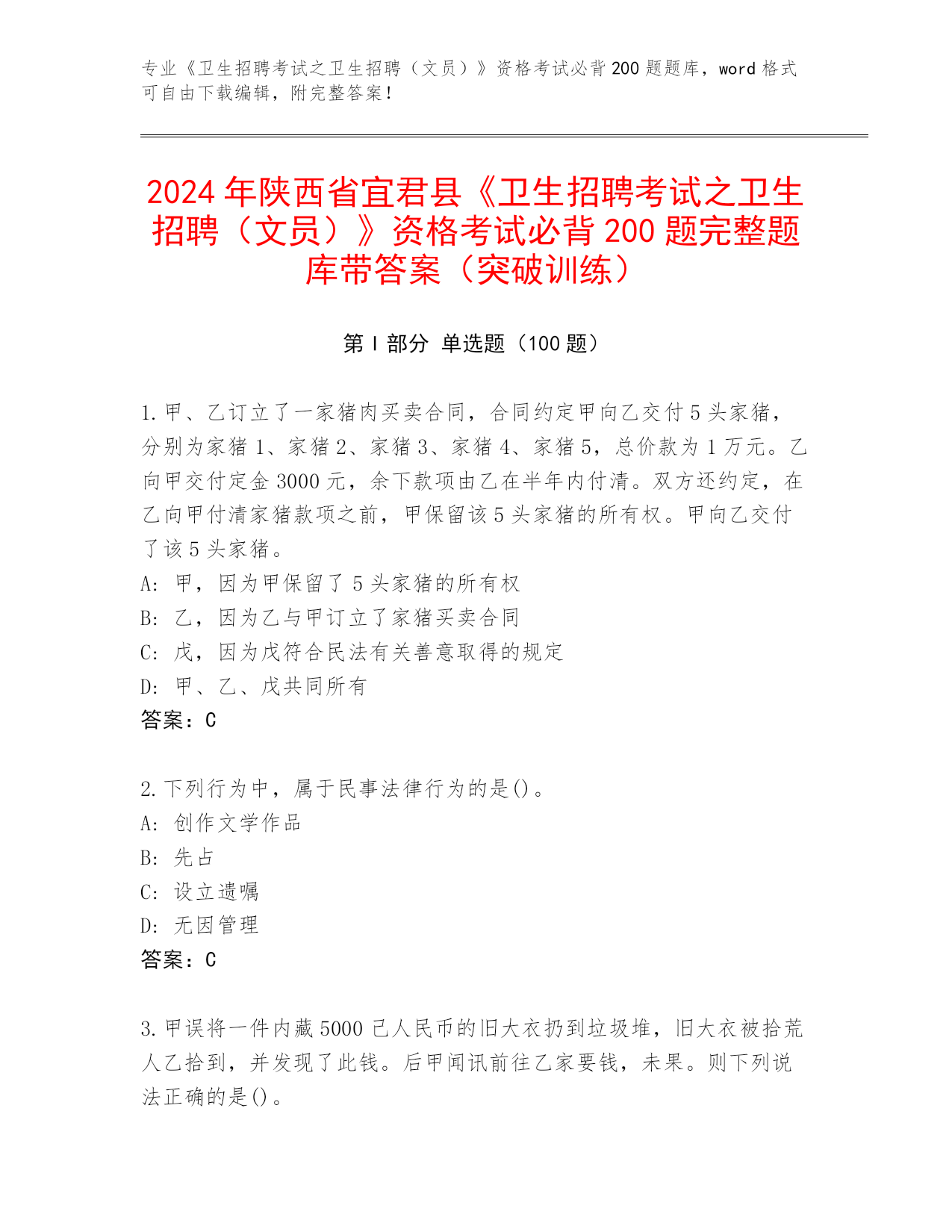 2024年陕西省宜君县《卫生招聘考试之卫生招聘(文员)》资格考试必背200题完整题库带答案(突破训练)