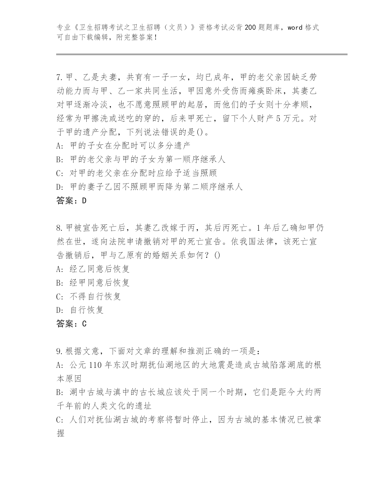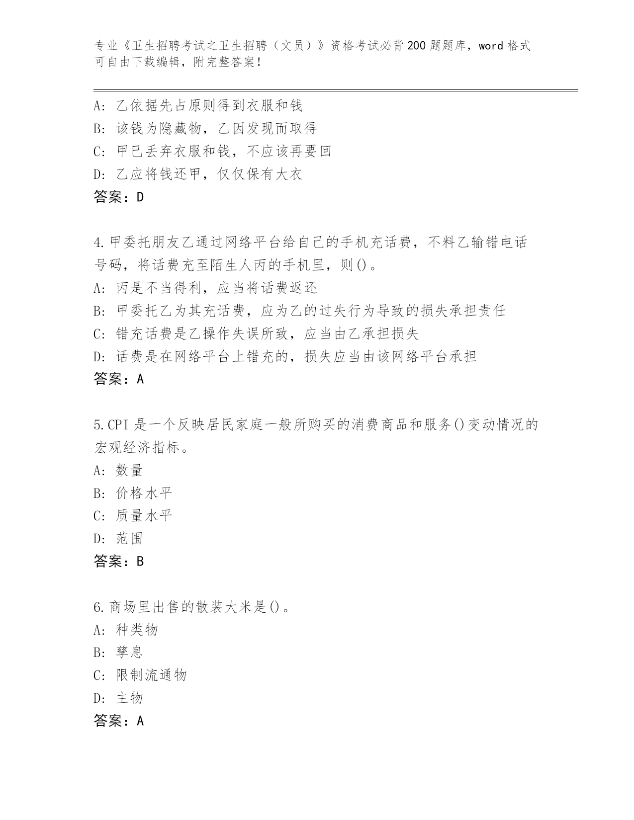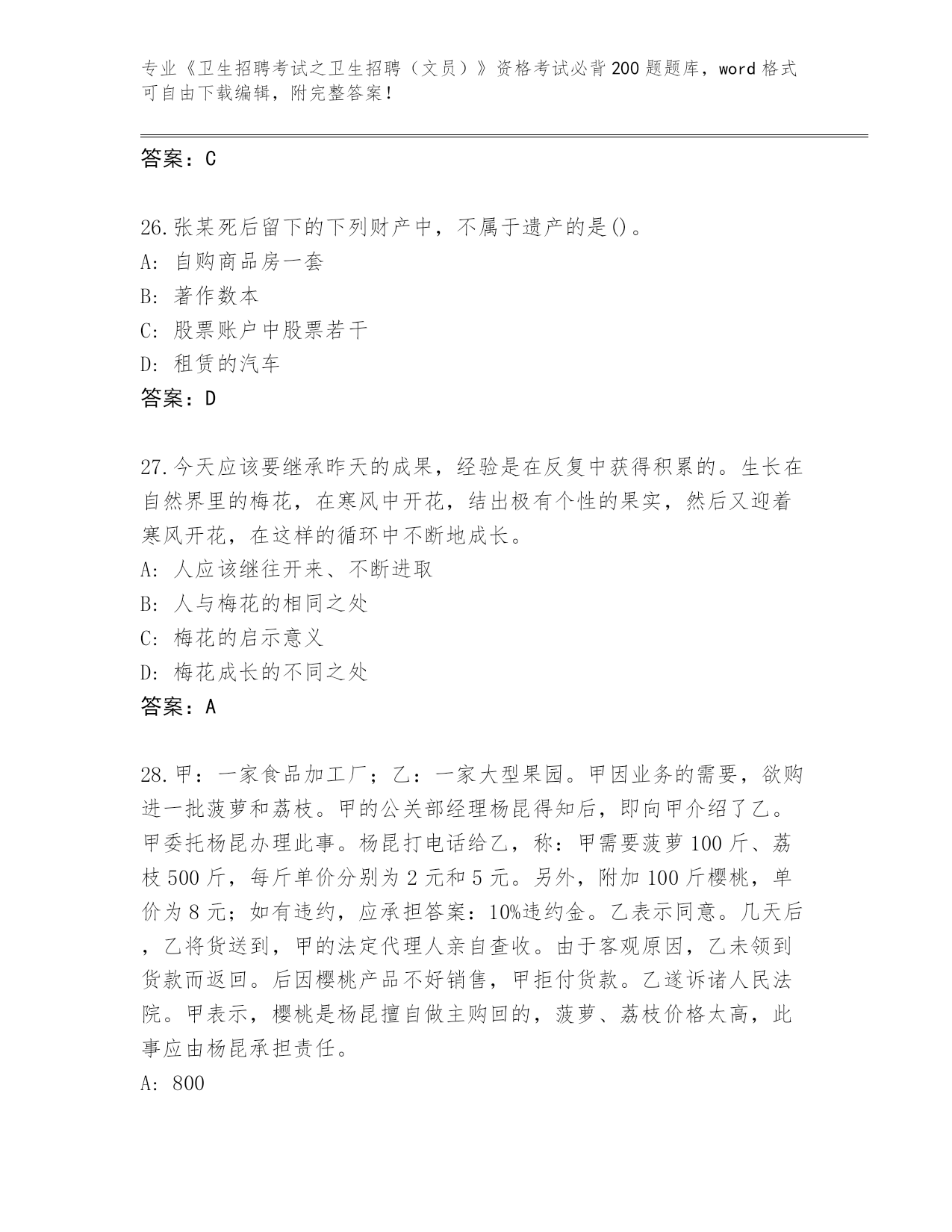 2024安徽省《卫生招聘考试之卫生招聘(文员)》资格考试必背200题大全带答案(突破训练)