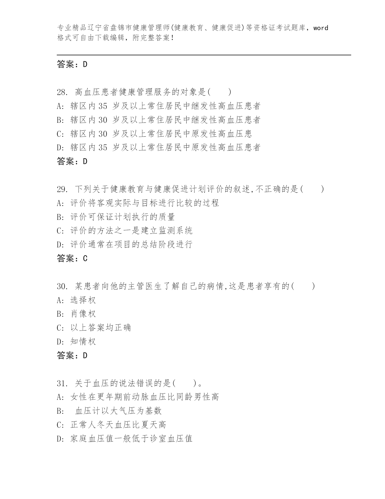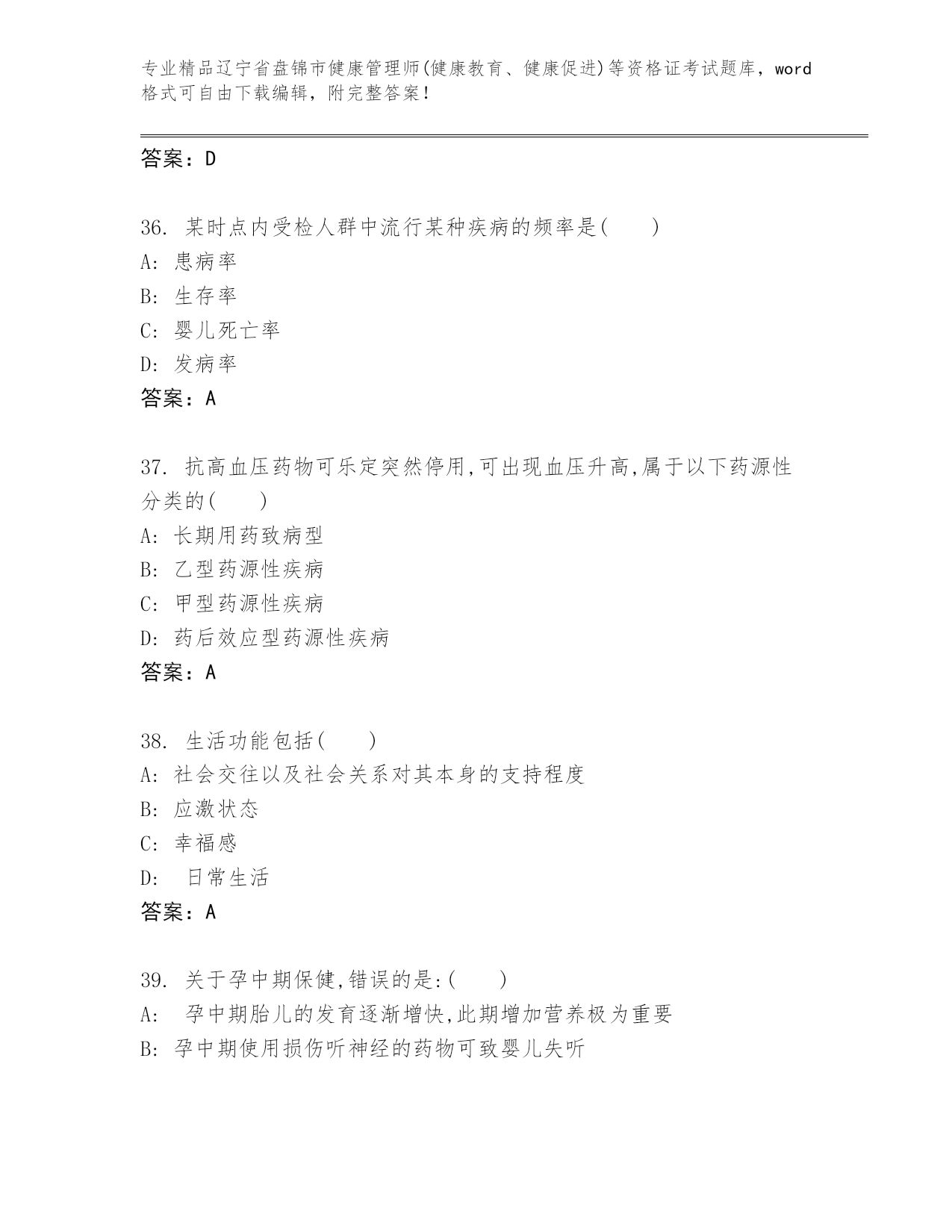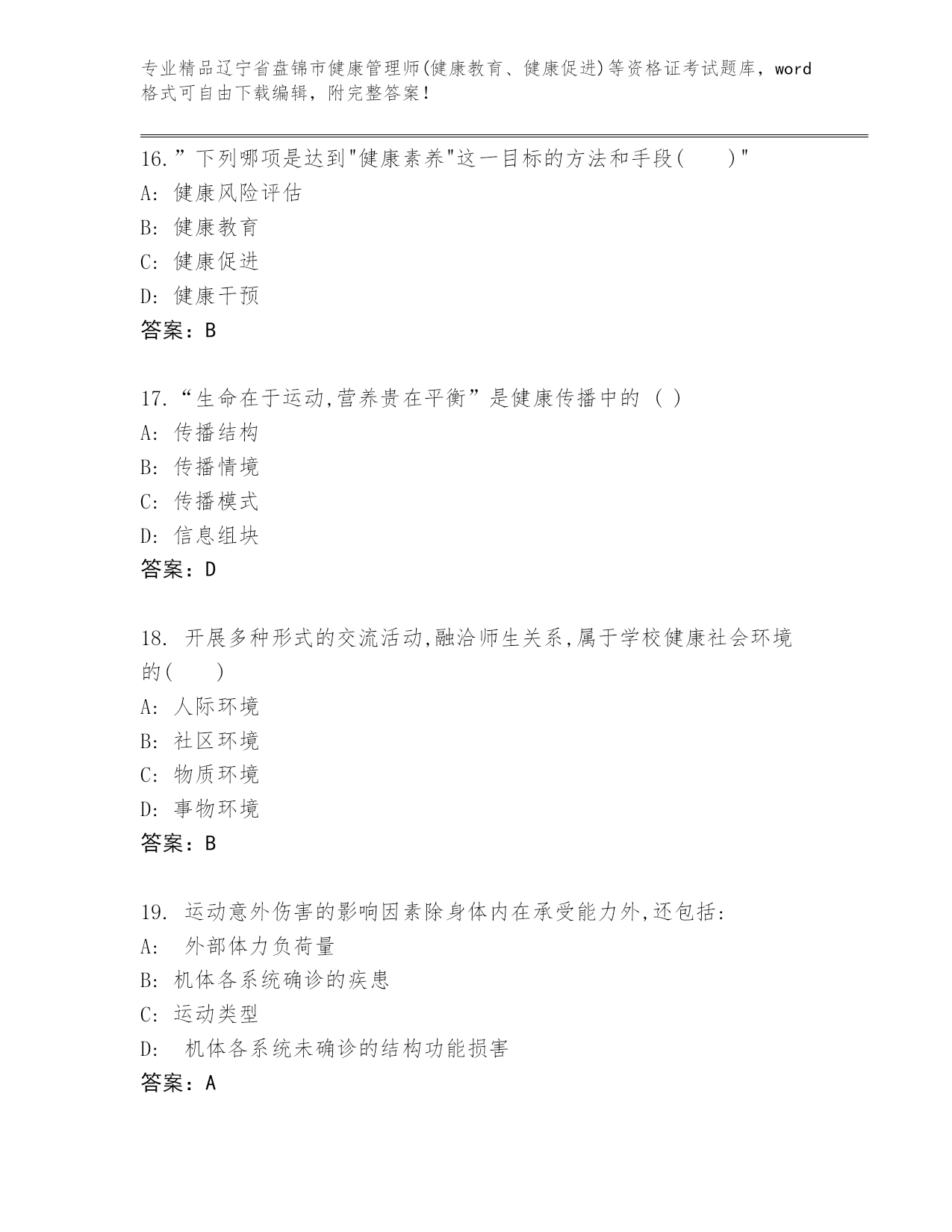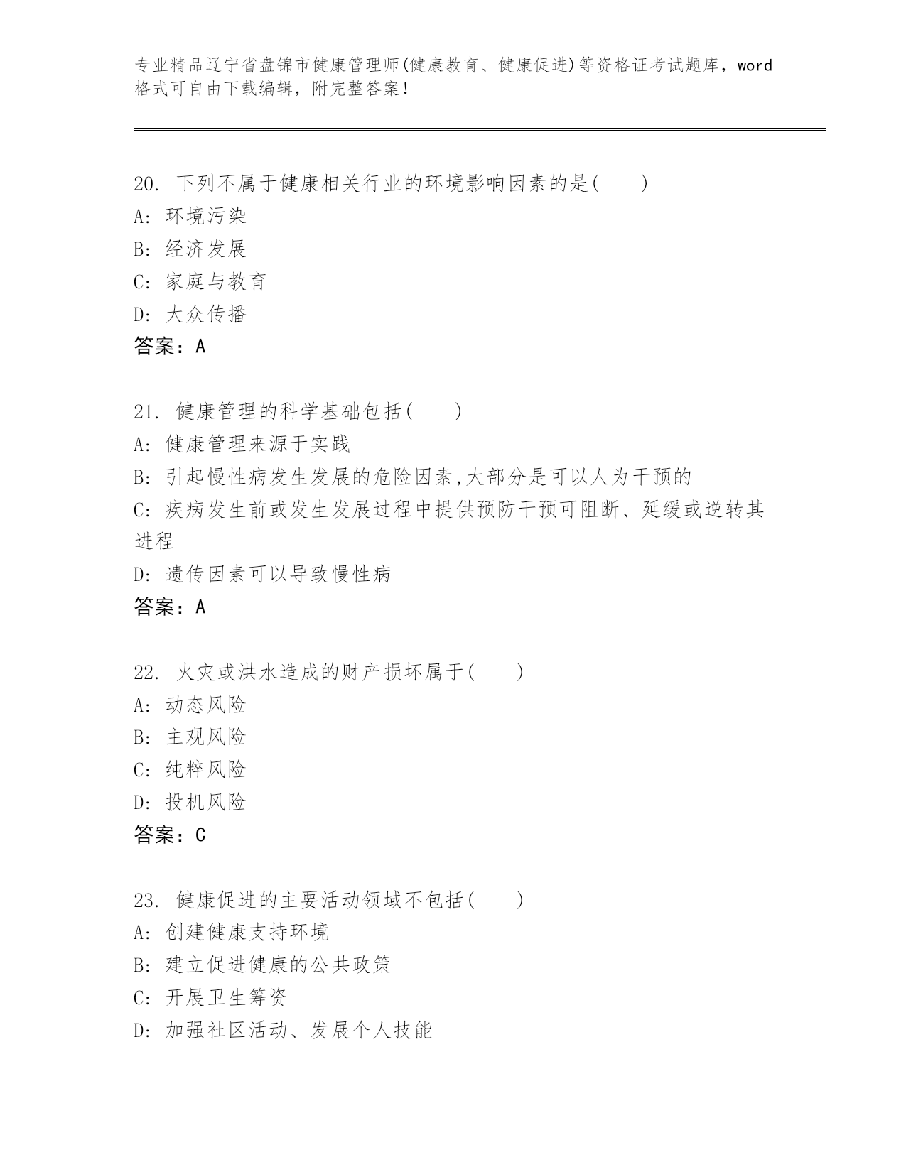 完整版辽宁省盘锦市健康管理师(健康教育、健康促进)等资格证考试可打印