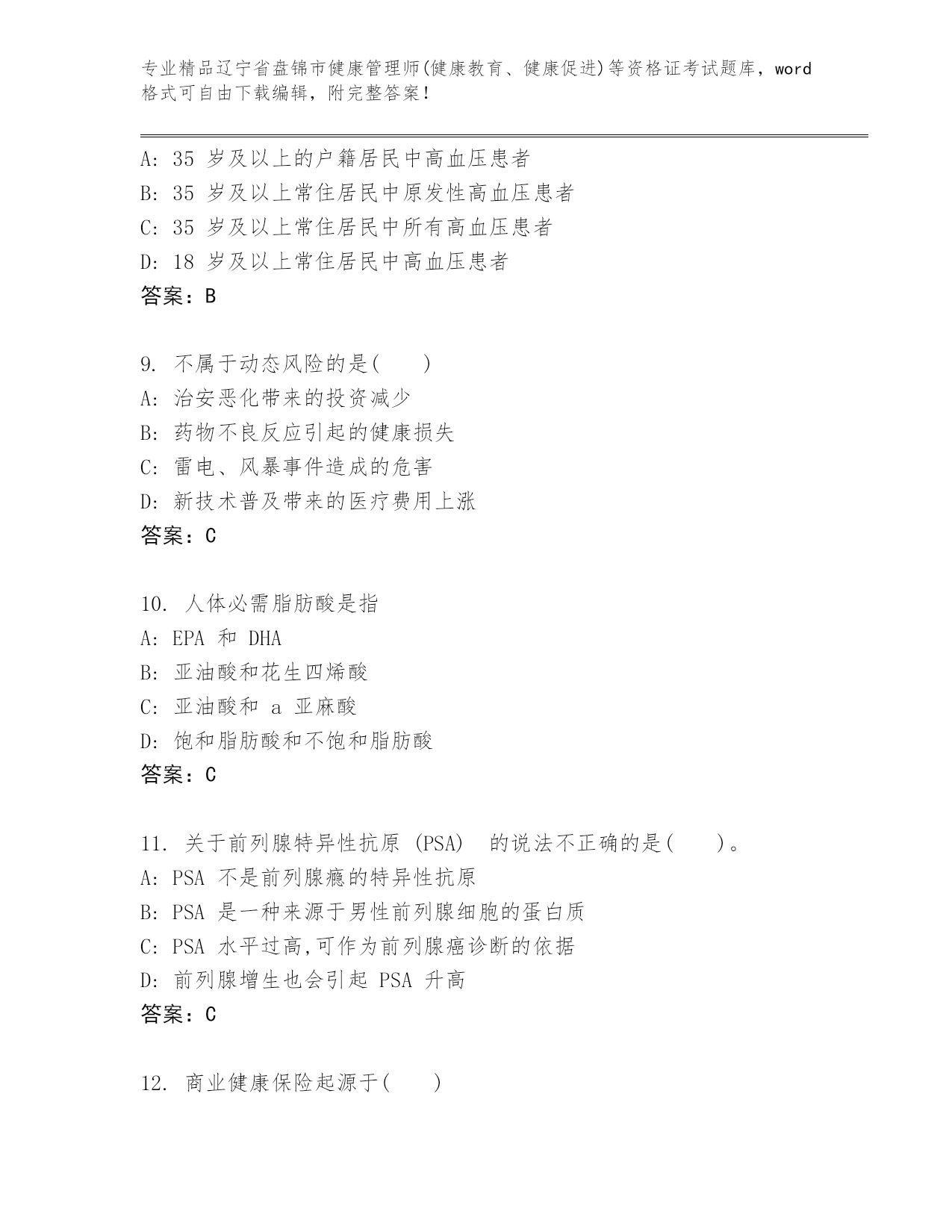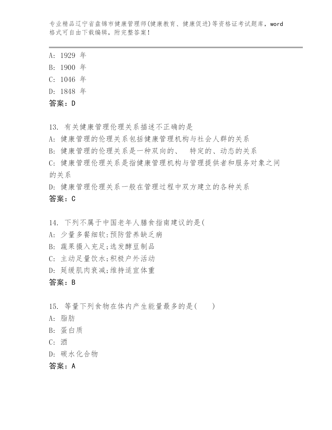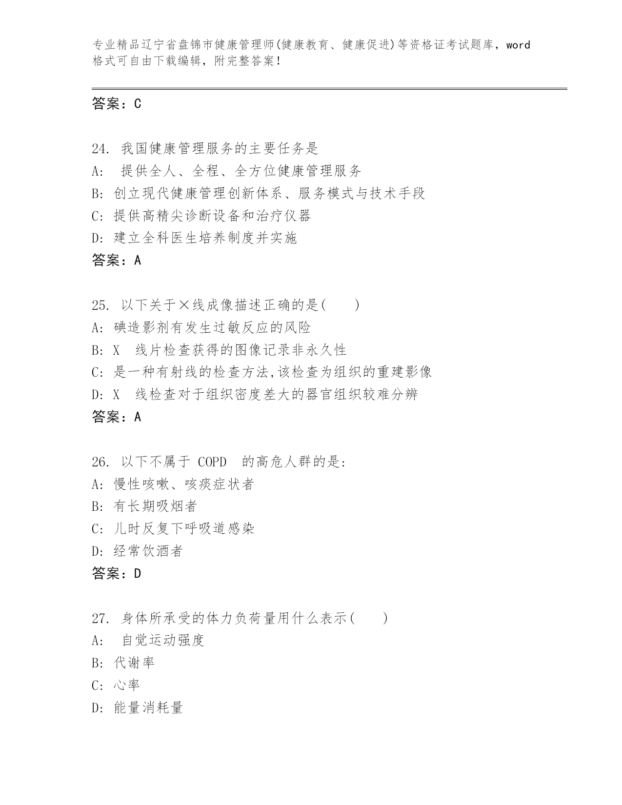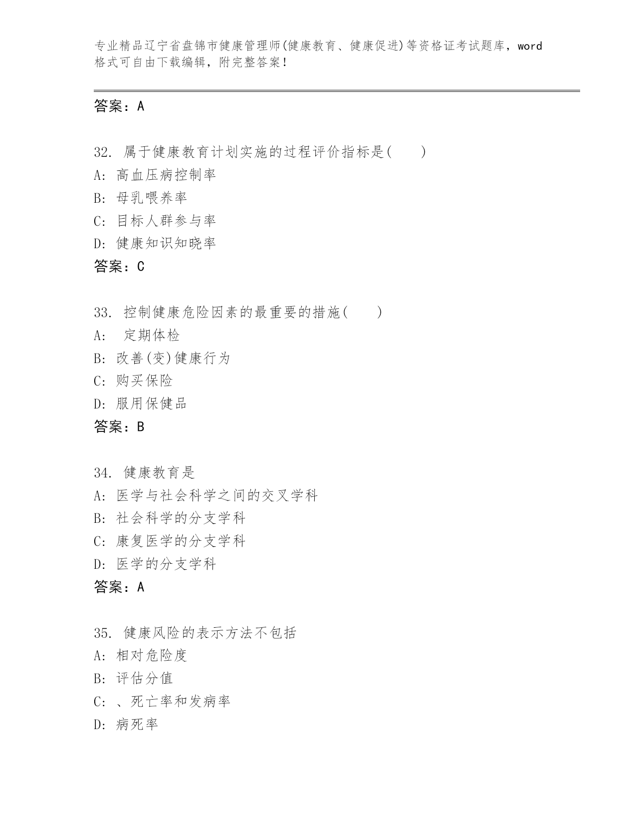 完整版辽宁省盘锦市健康管理师(健康教育、健康促进)等资格证考试可打印