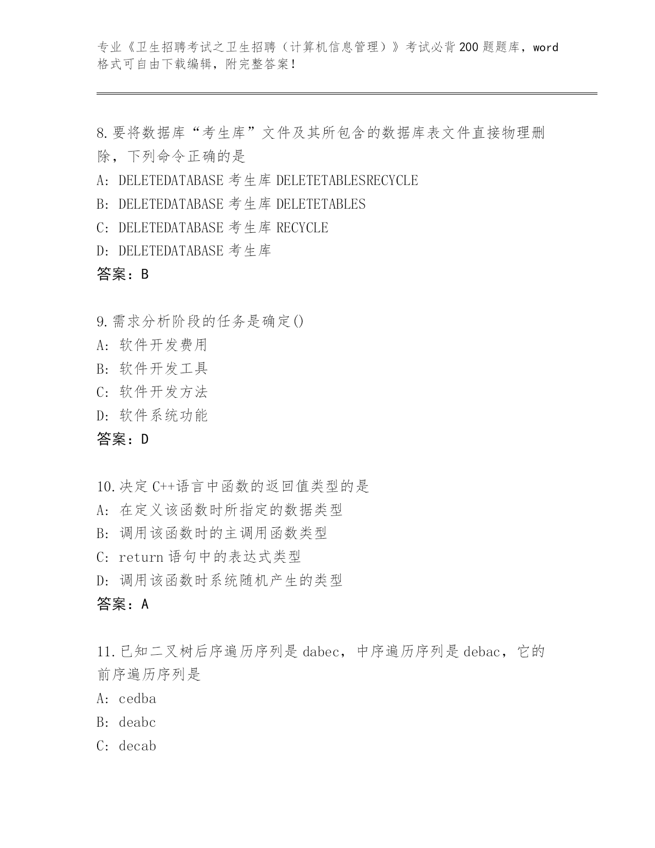 河北省《卫生招聘考试之卫生招聘(计算机信息管理)》考试必背200题题库带答案(研优卷)