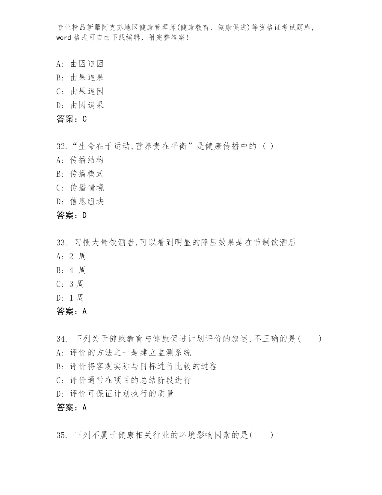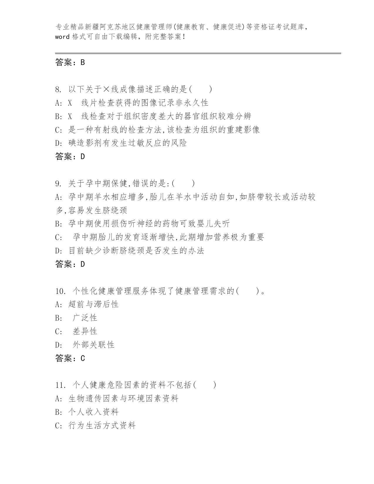 精心整理新疆阿克苏地区健康管理师(健康教育、健康促进)等资格证考试精品题库及精品答案