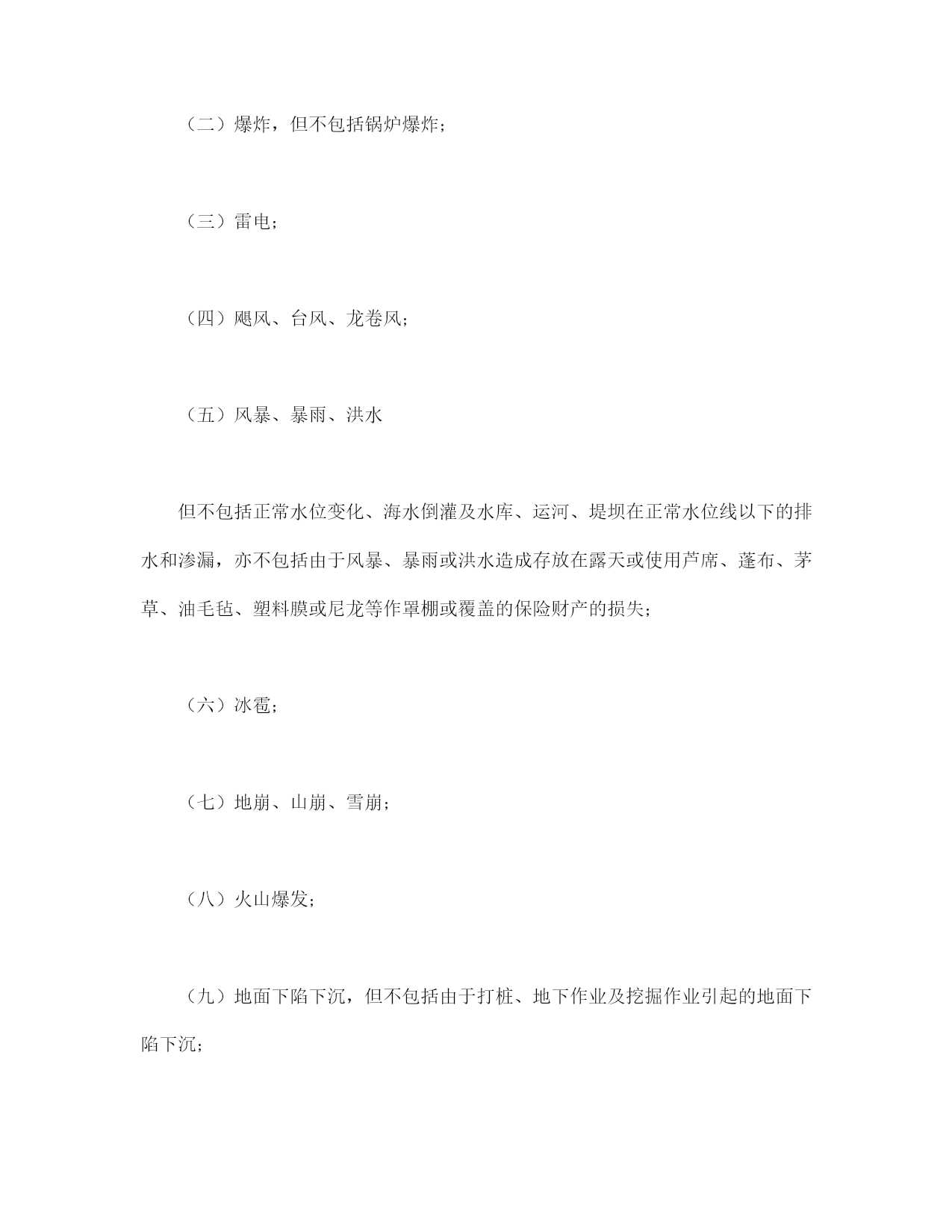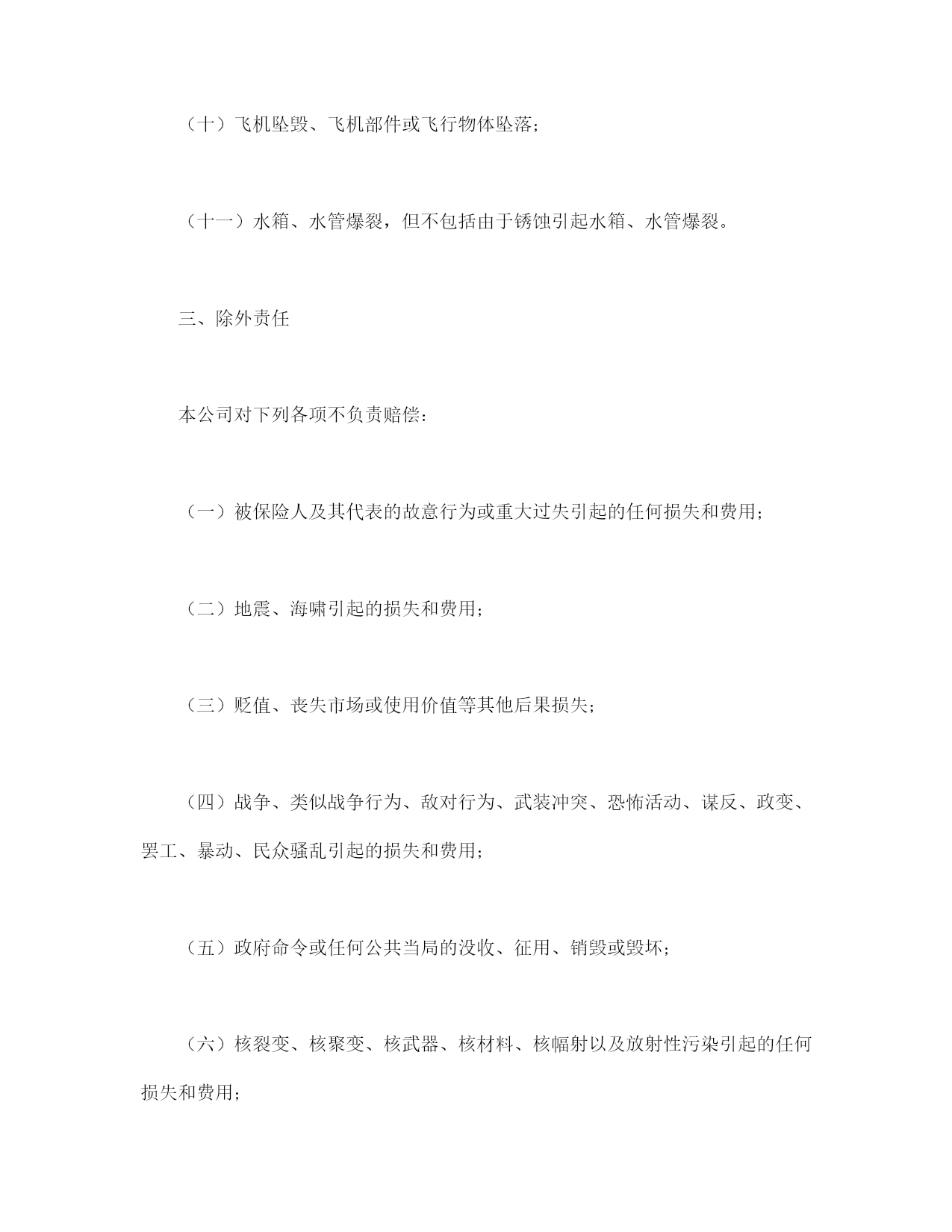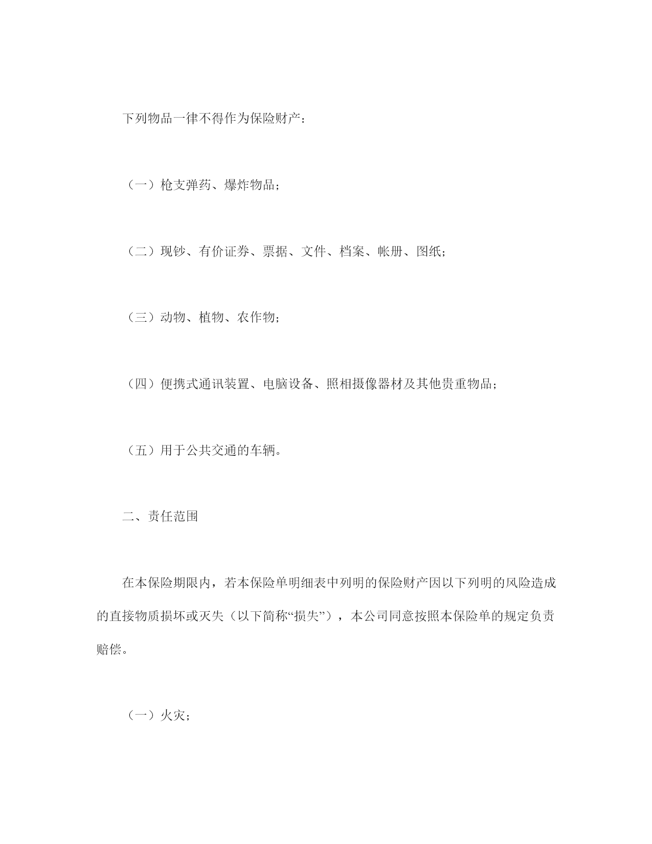 财产保险合同一、保险财产保险财产指在本保险单明细表中列明的财产及费用。经被保险人特别申请,并经本公司书面同意,下列物品及费用经专业人员或公估部门鉴定并确定价值后,亦可作为保险财产:(一)金银、珠宝、钻石、玉器;(二)古玩、古币、古书、古画;(三)艺术作品、邮票;(四)建筑物上的广告、天线、霓虹灯、太阳能装置等;(五)计算机资料及其制作、复制费用。下列物品一律不得作为保险财产:(一)枪支弹药、爆炸物品;(二)现钞、有价证券、票据、文件、档案、帐册、图纸;(三)动物、植物、农作物;(四)便携式通讯装置、电脑设备、照相摄像器材及其他贵重物品;(五)用于公共交通的车辆。二、责任范围在本保险期限内,若本保险单明细表中列明的保险财产因以下列明的风险造成的直接物质损坏或灭失(以下简称“损失”),本公司同意按照本保险单的规定负责赔偿。(一)火灾;(二)爆炸,但不包括锅炉爆炸;(三)雷电;(四)飓风、台风、龙卷风;(五)风暴、暴雨、洪水但不包括正常水位变化、海水倒灌及水库、运河、堤坝在正常水位线以下的排水和渗漏,亦不包括由于风暴、暴雨或洪水造成存放在露天或使用芦席、蓬布、茅草、油毛毡、塑料膜或尼龙等作罩棚或覆盖的保险财产的损失;(六)冰雹;(七)地崩、山崩、雪崩;(八)火山爆发;(九)地面下陷下沉,但不包括由于打桩、地下作业及挖掘作业引起的地面下陷下沉;(十)飞机坠毁、飞机部件或飞行物体坠落;(十一)水箱、水管爆裂,但不包括由于锈蚀引起水箱、水管爆裂。三、除外责任本公司对下列各项不负责赔偿:(一)被保险人及其代表的故意行为或重大过失引起的任何损失和费用;(二)地震、海啸引起的损失和费用;(三)贬值、丧失市场或使用价值等其他后果损失;(四)战争、类似战争行为、敌对行为、武装冲突、恐怖活动、谋反、政变、罢工、暴动、民众骚乱引起的损失和费用;(五)政府命令或任何公共当局的没收、征用、销毁或毁坏;(六)核裂变、核聚变、核武器、核材料、核幅射以及放射性污染引起的任何损失和费用;(七)大气、土地、水污染及其他各种污染引起的任何损失和费用,但不包括由于本保险单第二条责任范围列明的风险造成的污染引起的损失;(八)本保险单明细表或有关条款中规定的应由被保险人自行负担的免赔额;(九)其他不属于本保险单第二条责任范围列明的风险引起的损失。四、赔偿处理(一)如果发生本保险责任范围内的损失,本公司选择下列方式赔偿:1.按受损财产的价值赔偿;2.赔付受损财产基本恢复原状的修理、修复费用;3.修理、恢复受损财产,使之达到与同类财产基本一致的状况。(二)受损财产的赔偿按损失当时的市价计算。市价低于保险金额时,赔偿按市价计算;市价高于保险金额时,赔偿按保险金额与市价的比例计算。如本保险所载项目不止一项时,赔款按本规定逐项计算。(三)保险项目发生损失后,如本公司按全部损失赔付,其残值应在赔款中扣除,本公司有权不接受被保险人对受损财产的委付。(四)任何属于成对或成套的项目,若发生损失,本公司的赔偿责任不超过该受损项目在所属整对或整套项目的保险金额中所占的比例。(五)发生损失后,被保险人为减少损失而采取必要措施所产生的合理费用,本公司可予以赔偿,但本项费用以保险财产的保险金额为限。(六)本公司赔偿损失后,由本公司出具批单将保险金额从损失发生之日起相应减少,并且不退还保险金额减少部分的保险费。如被保险人要求恢复至原保险金额,应按约定的保险费率加缴恢复部分从损失发生之日起至保险期限终止之日止按日比例计算的保险费。(七)被保险人的索赔期限,从损失发生之日起,不得超过两年。五、被保险人的义务被保险人及其代表应严格履行下列义务:(一)投保时,被保险人及其代表应对投保申请书中列明的事项以及本公司提出的其他事项作真实、详尽的说明或描述;(二)被保险人及其代表应根据本保险单明细表和批单中的规定按期缴付保险费;(三)在保险期限内,被保险人应采取一切合理的预防措施,包括认真考虑并付诸实施本公司代表提出的合理的防损建议,由此产生的一切费用,均由被保险人承担;(四)在发生引起或可能引起本保险单项下索赔的损失时,被保险人及其代表应:1.立即通知本公司,并在七天或经本公司书面同意延长的期限内以书面提供事故发生的经过,原因和损失程度;2.采取一切必要措施防止损失的进一步扩大并将损失减少到最低程度;3.在本公司的代表或检验师进行勘查之前,保留事故现场及有关实物证据;4.根据本公司的要求提供作为索赔依据的所有证明文件、资料和单据。六、总则(一)保单效力被保险人严格地