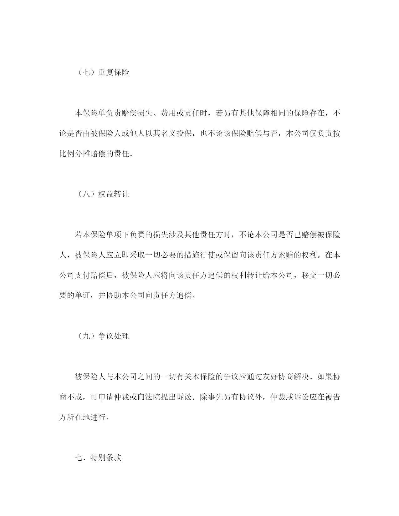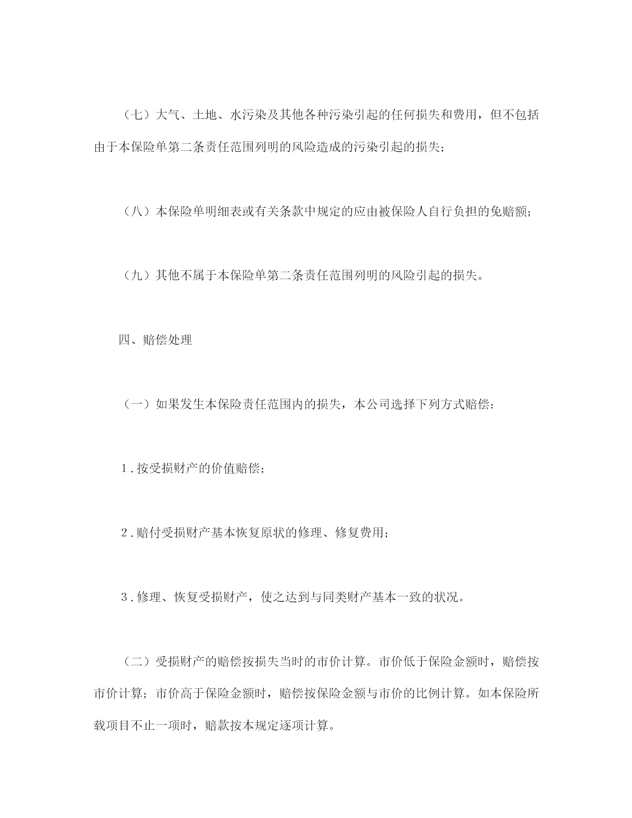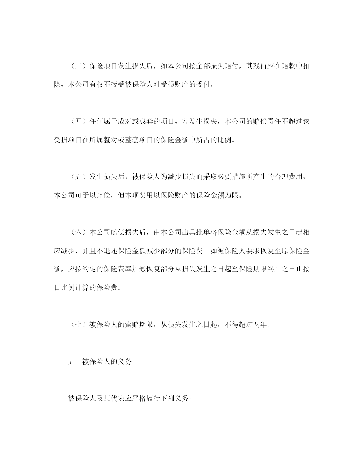 财产保险合同一、保险财产保险财产指在本保险单明细表中列明的财产及费用。经被保险人特别申请,并经本公司书面同意,下列物品及费用经专业人员或公估部门鉴定并确定价值后,亦可作为保险财产:(一)金银、珠宝、钻石、玉器;(二)古玩、古币、古书、古画;(三)艺术作品、邮票;(四)建筑物上的广告、天线、霓虹灯、太阳能装置等;(五)计算机资料及其制作、复制费用。下列物品一律不得作为保险财产:(一)枪支弹药、爆炸物品;(二)现钞、有价证券、票据、文件、档案、帐册、图纸;(三)动物、植物、农作物;(四)便携式通讯装置、电脑设备、照相摄像器材及其他贵重物品;(五)用于公共交通的车辆。二、责任范围在本保险期限内,若本保险单明细表中列明的保险财产因以下列明的风险造成的直接物质损坏或灭失(以下简称“损失”),本公司同意按照本保险单的规定负责赔偿。(一)火灾;(二)爆炸,但不包括锅炉爆炸;(三)雷电;(四)飓风、台风、龙卷风;(五)风暴、暴雨、洪水但不包括正常水位变化、海水倒灌及水库、运河、堤坝在正常水位线以下的排水和渗漏,亦不包括由于风暴、暴雨或洪水造成存放在露天或使用芦席、蓬布、茅草、油毛毡、塑料膜或尼龙等作罩棚或覆盖的保险财产的损失;(六)冰雹;(七)地崩、山崩、雪崩;(八)火山爆发;(九)地面下陷下沉,但不包括由于打桩、地下作业及挖掘作业引起的地面下陷下沉;(十)飞机坠毁、飞机部件或飞行物体坠落;(十一)水箱、水管爆裂,但不包括由于锈蚀引起水箱、水管爆裂。三、除外责任本公司对下列各项不负责赔偿:(一)被保险人及其代表的故意行为或重大过失引起的任何损失和费用;(二)地震、海啸引起的损失和费用;(三)贬值、丧失市场或使用价值等其他后果损失;(四)战争、类似战争行为、敌对行为、武装冲突、恐怖活动、谋反、政变、罢工、暴动、民众骚乱引起的损失和费用;(五)政府命令或任何公共当局的没收、征用、销毁或毁坏;(六)核裂变、核聚变、核武器、核材料、核幅射以及放射性污染引起的任何损失和费用;(七)大气、土地、水污染及其他各种污染引起的任何损失和费用,但不包括由于本保险单第二条责任范围列明的风险造成的污染引起的损失;(八)本保险单明细表或有关条款中规定的应由被保险人自行负担的免赔额;(九)其他不属于本保险单第二条责任范围列明的风险引起的损失。四、赔偿处理(一)如果发生本保险责任范围内的损失,本公司选择下列方式赔偿:1.按受损财产的价值赔偿;2.赔付受损财产基本恢复原状的修理、修复费用;3.修理、恢复受损财产,使之达到与同类财产基本一致的状况。(二)受损财产的赔偿按损失当时的市价计算。市价低于保险金额时,赔偿按市价计算;市价高于保险金额时,赔偿按保险金额与市价的比例计算。如本保险所载项目不止一项时,赔款按本规定逐项计算。(三)保险项目发生损失后,如本公司按全部损失赔付,其残值应在赔款中扣除,本公司有权不接受被保险人对受损财产的委付。(四)任何属于成对或成套的项目,若发生损失,本公司的赔偿责任不超过该受损项目在所属整对或整套项目的保险金额中所占的比例。(五)发生损失后,被保险人为减少损失而采取必要措施所产生的合理费用,本公司可予以赔偿,但本项费用以保险财产的保险金额为限。(六)本公司赔偿损失后,由本公司出具批单将保险金额从损失发生之日起相应减少,并且不退还保险金额减少部分的保险费。如被保险人要求恢复至原保险金额,应按约定的保险费率加缴恢复部分从损失发生之日起至保险期限终止之日止按日比例计算的保险费。(七)被保险人的索赔期限,从损失发生之日起,不得超过两年。五、被保险人的义务被保险人及其代表应严格履行下列义务:(一)投保时,被保险人及其代表应对投保申请书中列明的事项以及本公司提出的其他事项作真实、详尽的说明或描述;(二)被保险人及其代表应根据本保险单明细表和批单中的规定按期缴付保险费;(三)在保险期限内,被保险人应采取一切合理的预防措施,包括认真考虑并付诸实施本公司代表提出的合理的防损建议,由此产生的一切费用,均由被保险人承担;(四)在发生引起或可能引起本保险单项下索赔的损失时,被保险人及其代表应:1.立即通知本公司,并在七天或经本公司书面同意延长的期限内以书面提供事故发生的经过,原因和损失程度;2.采取一切必要措施防止损失的进一步扩大并将损失减少到最低程度;3.在本公司的代表或检验师进行勘查之前,保留事故现场及有关实物证据;4.根据本公司的要求提供作为索赔依据的所有证明文件、资料和单据。六、总则(一)保单效力被保险人严格地