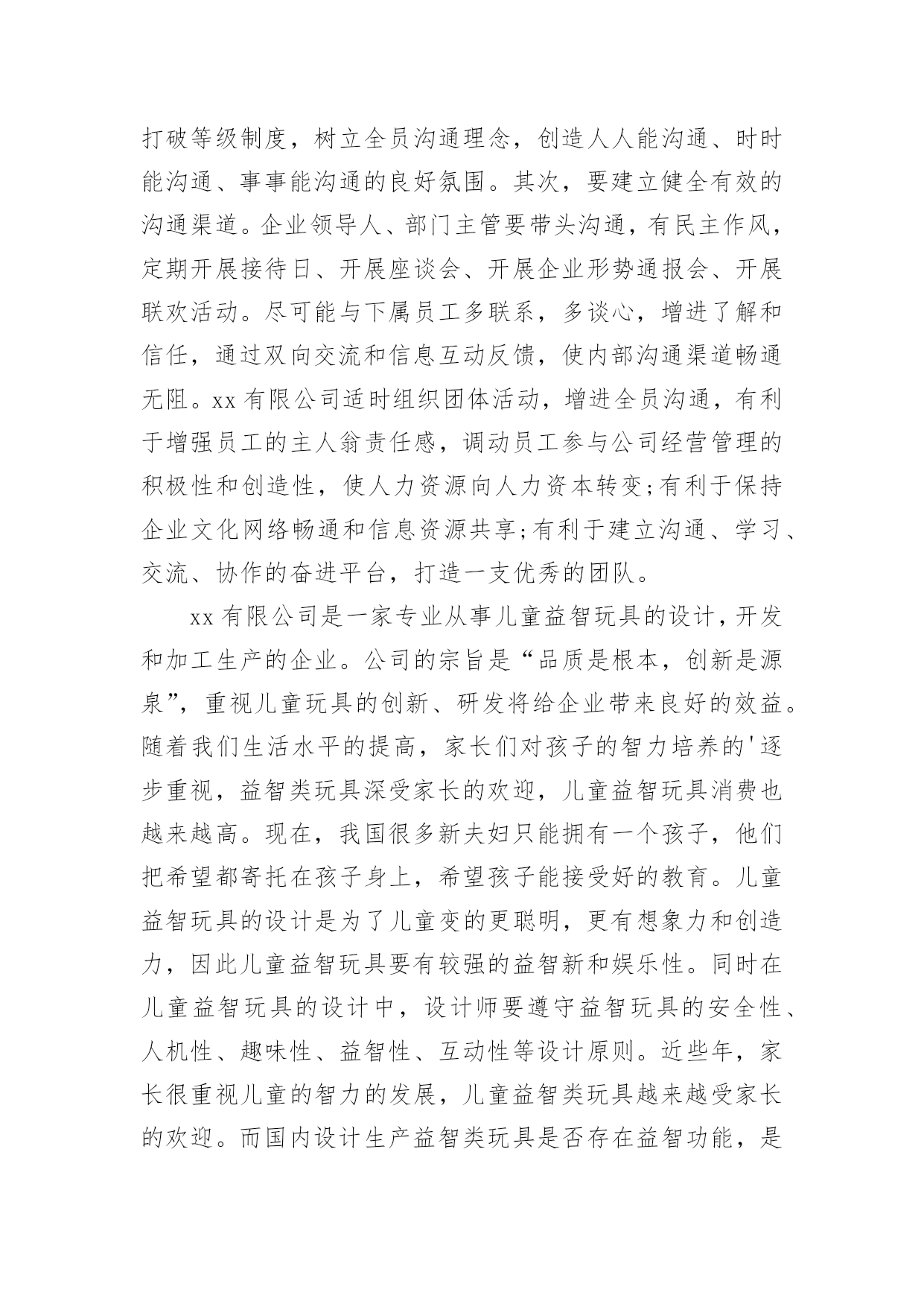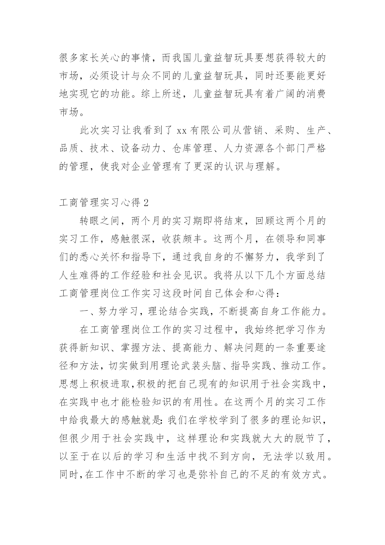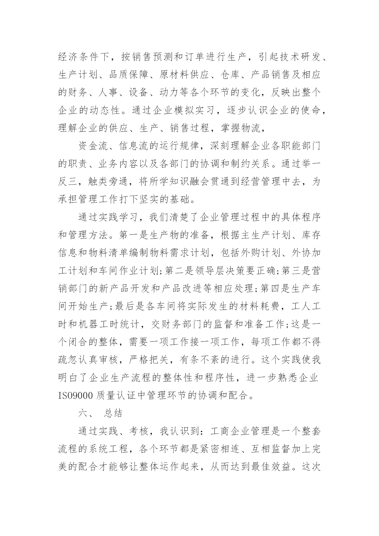 工商管理实习心得有了一些收获以后,心得体会是很好的记录方式,这样能够培养人思考的习惯。那么你知道心得体会如何写吗?以下是小编整理的工商管理实习心得,仅供参考,大家一起来看看吧。工商管理实习心得1通过一阶段的上机操作训练xx有限公司企业管理模拟软件,我对所学的《市场营销学》、《管理学基础》《个人与团队管理》、《企业信息管理》、《资源与运营管理》等专业课程有了更深的认识和理解。通过对xx有限公司各项业务流程的操作学习,让我将所学的专业理论与实际相结合,增强了自身的实践能力,体会如下:我切实体会到了xx有限公司各部门之间的紧密联系与相互制约,是缺一不可的。就生产部而言,它需要财务、营销根据预测订制单和订制单,帮助其共同制定年度生产计划、月度生产计划;需要设备动力、技术部提供生产所需的机器设备动力与技术支持;又有品质部对其生产的半成品、产成品进行检验监督,各部门之间工作衔接环环相扣,密不可分。由于xx有限公司各部门之间是相互联系的,部门与部门之间需要协调工作,并进行管理,故此xx有限公司想力求发展,就要拥有一个好的团队,而一个优秀的团队往往决定了,它所追求的发展前途。创建一个优秀的工作团队的关键不是有没有足够的人才供企业挑选,而在于管理者有没有一个正确的组织团队的观念。团队建设讲究相辅、相成、互相配合。“打造好团队,领头是关键”一个管理团队,没有一个合格的团队管理者,是不可能有良好业绩和发展前途的。xx有限公司的团队由一个总经理负责管理9个部门的经理,分别是营销经理、技术部经理、生产部经理、采购部经理、品质部经理、设备动力经理、仓库经理、财务经理和人力资源部经理。每个部门经理直接向总经理汇报,从而实现了统一管理、以情动人、以智创业,让员工始终保持战斗的激情,从而提高团队的凝聚力,同心同德、步调一致,使企业创出新的业绩。另外,企业内部沟通尤为重要。企业在经营管理和日常事务中,由于人与人之间、部门与部门之间缺乏沟通和交流,常常会遇到一些磨擦、矛盾、冲突、误解。这将影响到公司员工的士气、组织的效率,使企业难以凝聚,人为内耗成本增大,甚至导致企业死亡。因此,企业文化建设的一个主要内容就是“沟通”。沟通无处不在,是双向互动的。如果一个组织内部缺乏沟通氛围,其领导人是有很大责任的。沟通是领导的基本素质,是管理工作的基本内容。沟通是文化的交流,1是情感的共鸣,在价值取向多元化和性格气质个性化的今天,沟通更需要科学的技巧和正确的方法。用正确的方法做正确的事,事半功倍;用正确的方法做不正确的事,事倍功半。企业要搞好内部沟通,首先要通过现代企业文化建设,打破等级制度,树立全员沟通理念,创造人人能沟通、时时能沟通、事事能沟通的良好氛围。其次,要建立健全有效的沟通渠道。企业领导人、部门主管要带头沟通,有民主作风,定期开展接待日、开展座谈会、开展企业形势通报会、开展联欢活动。尽可能与下属员工多联系,多谈心,增进了解和信任,通过双向交流和信息互动反馈,使内部沟通渠道畅通无阻。xx有限公司适时组织团体活动,增进全员沟通,有利于增强员工的主人翁责任感,调动员工参与公司经营管理的积极性和创造性,使人力资源向人力资本转变;有利于保持企业文化网络畅通和信息资源共享;有利于建立沟通、学习、交流、协作的奋进平台,打造一支优秀的团队。xx有限公司是一家专业从事儿童益智玩具的设计,开发和加工生产的企业。公司的宗旨是“品质是根本,创新是源泉”,重视儿童玩具的创新、研发将给企业带来良好的效益。随着我们生活水平的提高,家长们对孩子的智力培养的'逐步重视,益智类玩具深受家长的欢迎,儿童益智玩具消费也越来越高。现在,我国很多新夫妇只能拥有一个孩子,他们把希望都寄托在孩子身上,希望孩子能接受好的教育。儿童益智玩具的设计是为了儿童变的更聪明,更有想象力和创造力,因此儿童益智玩具要有较强的益智新和娱乐性。同时在儿童益智玩具的设计中,设计师要遵守益智玩具的安全性、人机性、趣味性、益智性、互动性等设计原则。近些年,家长很重视儿童的智力的发展,儿童益智类玩具越来越受家长的欢迎。而国内设计生产益智类玩具是否存在益智功能,是很多家长关心的事情,而我国儿童益智玩具要想获得较大的市场,必须设计与众不同的儿童益智玩具,同时还要能更好地实现它的功能。综上所述,儿童益智玩具有着广阔的消费市场。此次实习让我看到了xx有限公司从营销、采购、生产、品质、技术、设备动力、仓库管理、人力资源各个部门严格的管理,使我对企业管理有了更深的认识与理解。工商管理实习心得2转眼之间,两个月的实习期即将结束,回顾这两个月的实习工作,感触很深,收获颇丰。这两个月,在领导和同事们的悉心关怀和指导下,通过我自身的不懈努力,我学到了人生难得的工作经验和社会见识。我将从以下几个方面总结工商管理岗位工作实习这段时间自己体会和心得:一、努力学习,
