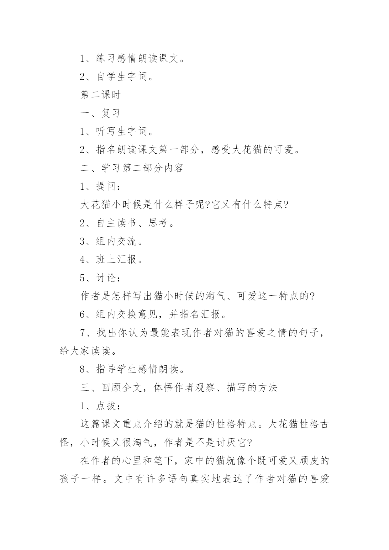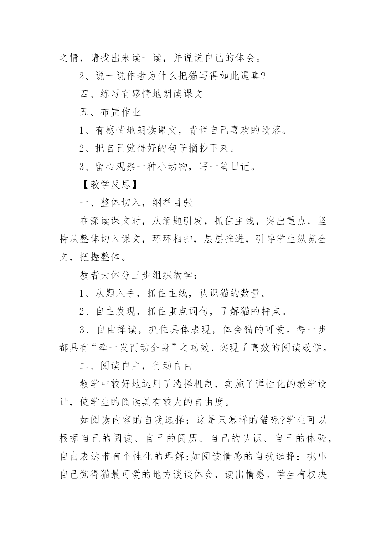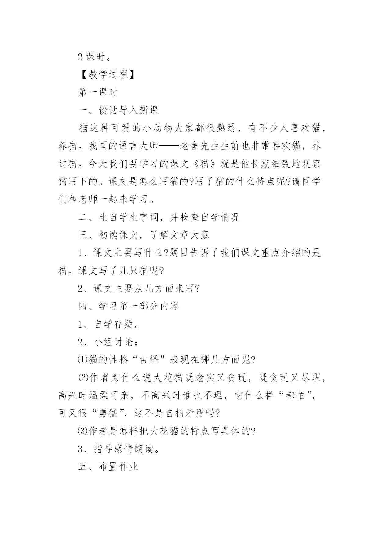 老舍《猫》教学设计老舍《猫》教学设计作为一名辛苦耕耘的教育工作者,时常需要编写教学设计,编写教学设计有利于我们科学、合理地支配课堂时间。教学设计应该怎么写才好呢?以下是小编精心整理的老舍《猫》教学设计,希望能够帮助到大家。【学习目标】1、学会本课13个生字,正确读写“无忧无虑、任凭、抓痒、稿纸、丰富多腔、摔跟头、跌倒、胆子、开辟、遭殃、责打”等到词语。2、有感情地朗读课文。背诵自己喜欢的段落。3、了解大花猫的古怪性格和它小时候的可爱,学习作者真实具体的表达方法,体会课文蕴含的感情。4、培养学生热爱小动物的感情和观察小动物的兴趣。【教学重点】通过语言文字的学习,了解大花猫的古怪性格和它小时候的淘气可爱。【教学难点】学习作者细致观察抓住事物特点的写作方法和真实、具体的表达方法。【教学时数】2课时。【教学过程】第一课时一、谈话导入新课猫这种可爱的小动物大家都很熟悉,有不少人喜欢猫,养猫。我国的语言大师──老舍先生生前也非常喜欢猫,养过猫。今天我们要学习的课文《猫》就是他长期细致地观察猫写下的。课文是怎么写猫的?写了猫的什么特点呢?请同学们和老师一起来学习。二、生自学生字词,并检查自学情况三、初读课文,了解文章大意1、课文主要写什么?题目告诉了我们课文重点介绍的是猫。课文写了几只猫呢?2、课文主要从几方面来写?四、学习第一部分内容1、自学存疑。2、小组讨论:⑴猫的性格“古怪”表现在哪几方面呢?⑵作者为什么说大花猫既老实又贪玩,既贪玩又尽职,高兴时温柔可亲,不高兴时谁也不理,它什么样“都怕”,可又很“勇猛”,这不是自相矛盾吗?⑶作者是怎样把大花猫的特点写具体的?3、指导感情朗读。五、布置作业1、练习感情朗读课文。2、自学生字词。第二课时一、复习1、听写生字词。2、指名朗读课文第一部分,感受大花猫的可爱。二、学习第二部分内容1、提问:大花猫小时候是什么样子呢?它又有什么特点?2、自主读书、思考。3、组内交流。4、班上汇报。5、讨论:作者是怎样写出猫小时候的淘气、可爱这一特点的?6、组内交换意见,并指名汇报。7、找出你认为最能表现作者对猫的喜爱之情的句子,给大家读读。8、指导学生感情朗读。三、回顾全文,体悟作者观察、描写的方法1、点拔:这篇课文重点介绍的就是猫的性格特点。大花猫性格古怪,小时候又很淘气,作者是不是讨厌它?在作者的心里和笔下,家中的猫就像个既可爱又顽皮的孩子一样。文中有许多语句真实地表达了作者对猫的喜爱之情,请找出来读一读,并说说自己的体会。2、说一说作者为什么把猫写得如此逼真?四、练习有感情地朗读课文五、布置作业1、有感情地朗读课文,背诵自己喜欢的段落。2、把自己觉得好的句子摘抄下来。3、留心观察一种小动物,写一篇日记。【教学反思】一、整体切入,纲举目张在深读课文时,从解题引发,抓住主线,突出重点,坚持从整体切入课文,环环相扣,层层推进,引导学生纵览全文,把握整体。教者大体分三步组织教学:1、从题入手,抓住主线,认识猫的数量。2、自主发现,抓住重点词句,了解猫的特点。3、自由择读,抓住具体表现,体会猫的可爱。每一步都具有“牵一发而动全身”之功效,实现了高效的阅读教学。二、阅读自主,行动自由教学中较好地运用了选择机制,实施了弹性化的教学设计,使学生的阅读具有较大的自由度。如阅读内容的自我选择:这是只怎样的猫呢?学生可以根据自己的阅读、自己的阅历、自己的认识、自己的体验,自由表达带有个性化的理解;如阅读情感的自我选择:挑出自己觉得猫最可爱的地方谈谈体会,读出情感。学生有权决定谈自己最喜爱、谈自己能谈的。这样做,开拓了学生参与学习的空间,给了每一位学生同时、同等参与学习的可能。你的一点,他的一点,相互交流,在教师的点拨勾连下“点”又组成了“面”,升华了学生的认识。