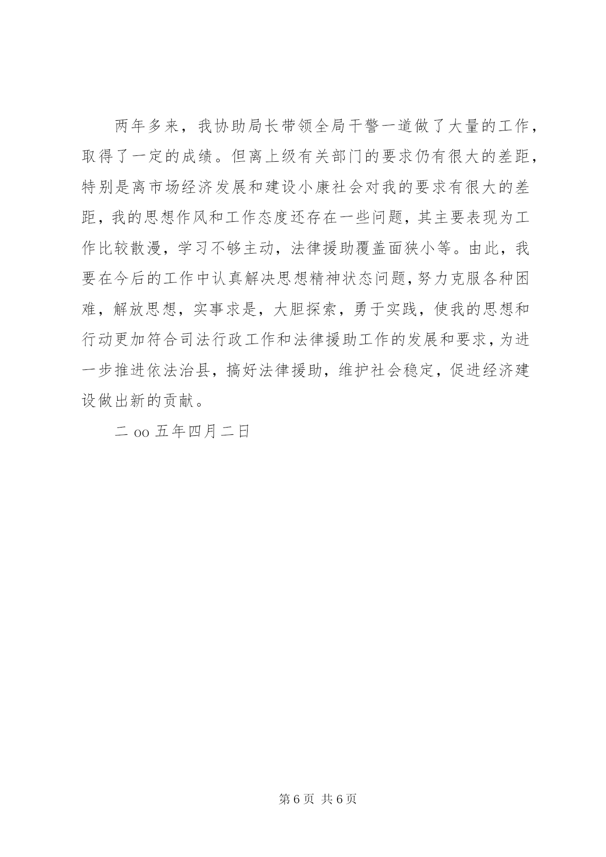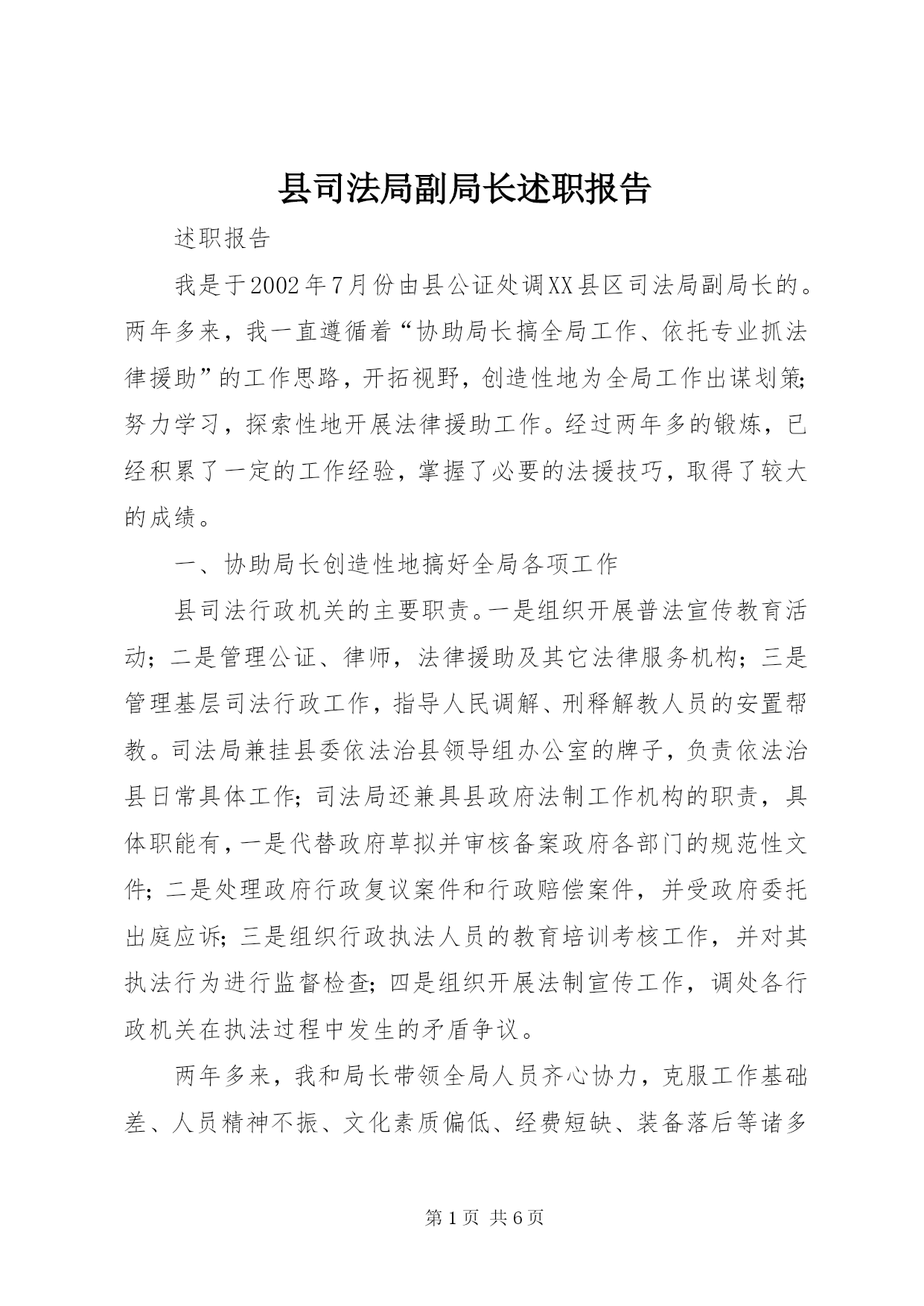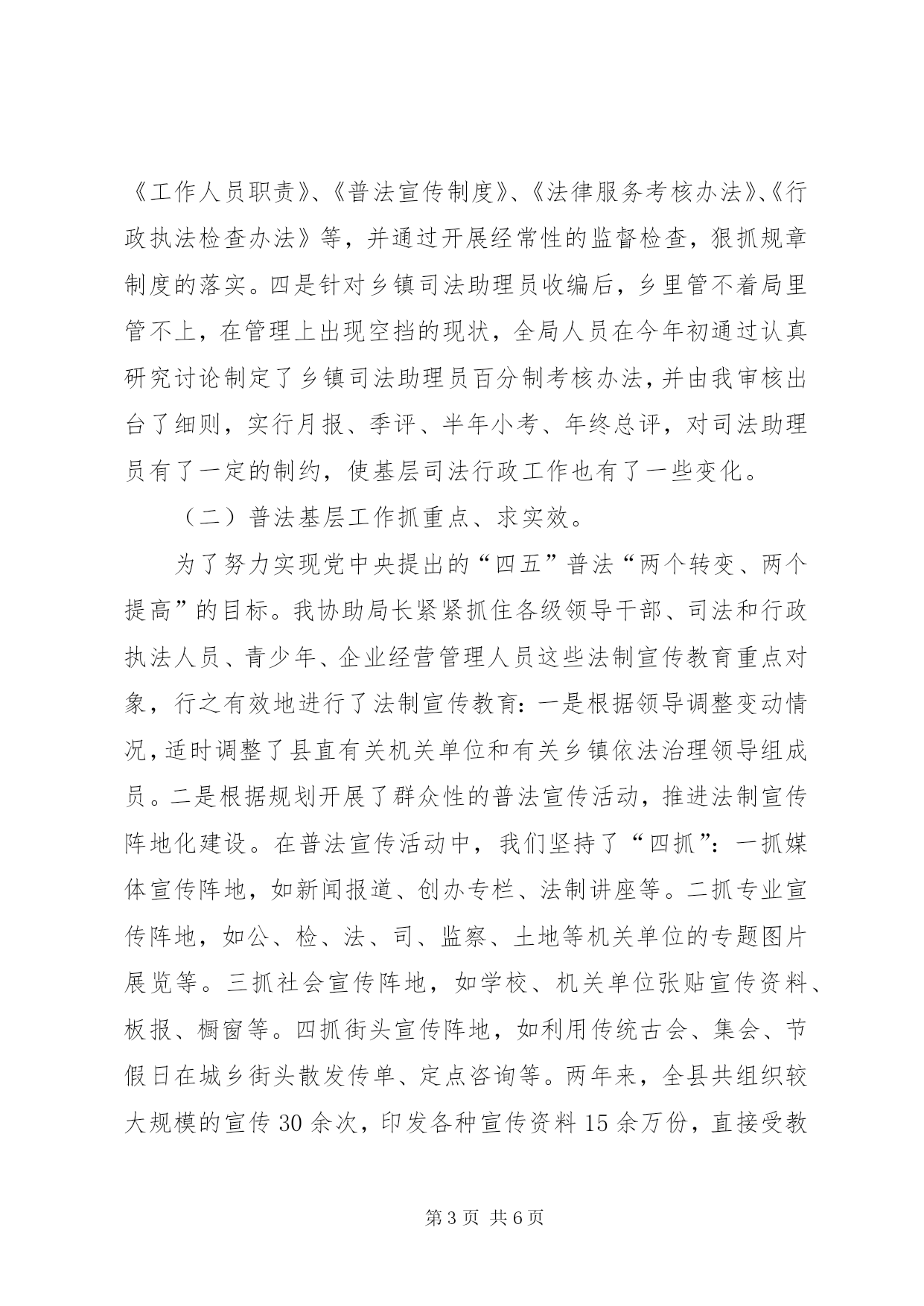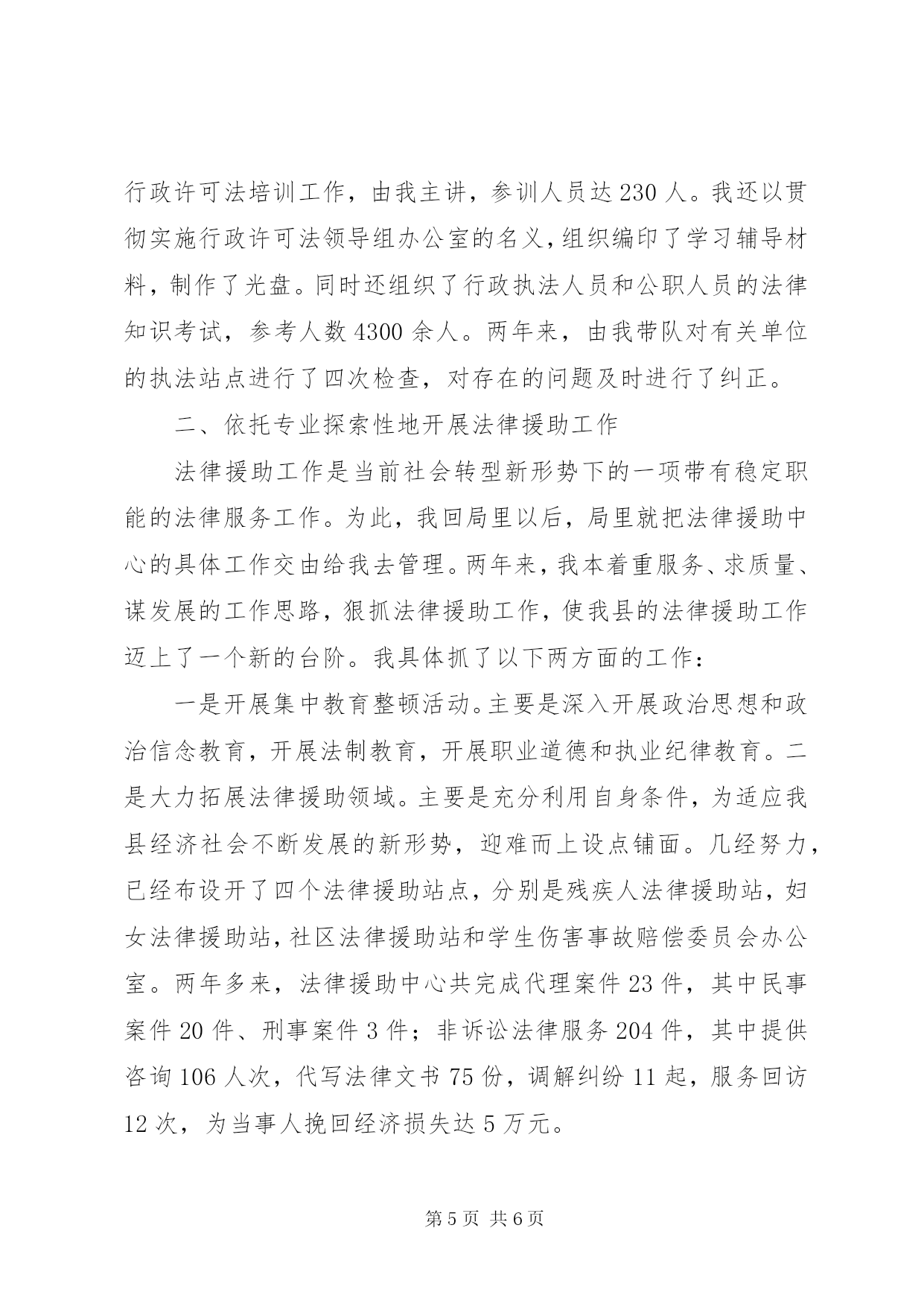 第PAGE\*Arabic\*MERGEFORMAT6页共NUMPAGES\*MERGEFORMAT6页县司法局副局长述职报告述职报告我是于2002年7月份由县公证处调XX县区司法局副局长的。两年多来,我一直遵循着“协助局长搞全局工作、依托专业抓法律援助”的工作思路,开拓视野,创造性地为全局工作出谋划策;努力学习,探索性地开展法律援助工作。经过两年多的锻炼,已经积累了一定的工作经验,掌握了必要的法援技巧,取得了较大的成绩。一、协助局长创造性地搞好全局各项工作县司法行政机关的主要职责。一是组织开展普法宣传教育活动;二是管理公证、律师,法律援助及其它法律服务机构;三是管理基层司法行政工作,指导人民调解、刑释解教人员的安置帮教。司法局兼挂县委依法治县领导组办公室的牌子,负责依法治县日常具体工作;司法局还兼具县政府法制工作机构的职责,具体职能有,一是代替政府草拟并审核备案政府各部门的规范性文件;二是处理政府行政复议案件和行政赔偿案件,并受政府委托出庭应诉;三是组织行政执法人员的教育培训考核工作,并对其执法行为进行监督检查;四是组织开展法制宣传工作,调处各行政机关在执法过程中发生的矛盾争议。两年多来,我和局长带领全局人员齐心协力,克服工作基础差、人员精神不振、文化素质偏低、经费短缺、装备落后等诸多困难,以邓小平理论和“三个代表”重要思想为指导,大力弘扬求真务实精神,坚持四个服务(为维护社会稳定服务,为完善社会主义市场经济服务,为实施依法治国方略服务,为实现和维护好人民群众的根本利益服务),突出改革、保障、拓展、规范这个主题,积极开展普法依法治理、基层民调、行政执法监督和法律服务等工作、有效地发挥了司法行政的职能作用,为推进依法治县进程,维护社会稳定,促进经济和社会各项事业的发展做出了一定的贡献。现将具体的主要工作内容分述于下。(一)队伍建设工作抓制度、重落实。搞好司法行政工作关键在于有一支政治上强、业务上精、思想上纯的干警队伍,为此我协助局长抓了以下几方面的工作:一是在班子建设上,为增强凝聚力和向心力,我总是在执行制度时率先垂范,身先士卒,同时严格要求一般人员,此举调动了全体干警的积极性。过去上班迟到早退、工作上不积极、学习上不主动、服务上不严谨等现象已经逐渐消除。二是在思想建设上,我和全局人员以“严格执法、热情服务”的要求和“三个代表”重要思想为指针,一道互相交流、分组讨论,找出思想中存在的问题,积极开展自查自纠,写心得体会、写自查报告,使全局人员都能够把党和人民的利益放在首位,勤政为民地行使权力。三是在制度建设上,全局人员几经讨论,由我定稿完善了《考勤制度》、《请销假制度》、《学习制度》、《奖惩制度》,并重新制定了《工作人员职责》、《普法宣传制度》、《法律服务考核办法》、《行政执法检查办法》等,并通过开展经常性的监督检查,狠抓规章制度的落实。四是针对乡镇司法助理员收编后,乡里管不着局里管不上,在管理上出现空挡的现状,全局人员在今年初通过认真研究讨论制定了乡镇司法助理员百分制考核办法,并由我审核出台了细则,实行月报、季评、半年小考、年终总评,对司法助理员有了一定的制约,使基层司法行政工作也有了一些变化。(二)普法基层工作抓重点、求实效。为了努力实现党中央提出的“四五”普法“两个转变、两个提高”的目标。我协助局长紧紧抓住各级领导干部、司法和行政执法人员、青少年、企业经营管理人员这些法制宣传教育重点对象,行之有效地进行了法制宣传教育:一是根据领导调整变动情况,适时调整了县直有关机关单位和有关乡镇依法治理领导组成员。二是根据规划开展了群众性的普法宣传活动,推进法制宣传阵地化建设。在普法宣传活动中,我们坚持了“四抓”:一抓媒体宣传阵地,如新闻报道、创办专栏、法制讲座等。二抓专业宣传阵地,如公、检、法、司、监察、土地等机关单位的专题图片展览等。三抓社会宣传阵地,如学校、机关单位张贴宣传资料、板报、橱窗等。四抓街头宣传阵地,如利用传统古会、集会、节假日在城乡街头散发传单、定点咨询等。两年来,全县共组织较大规模的宣传30余次,印发各种宣传资料15余万份,直接受教育群众达10万人。特别是今年行政许可法颁布实施前,我们组织了24个单位150余人的宣传队伍,沿街散发传单2万余份。三是对领导干部坚持一年一考、以考促学,形成制度,并为行政机关领导建立了领导干部学法档案。四是针对青少年犯罪日益增长的现象,把法制宣传教育落实到学校。为全县45所中心校聘请了法制副校长的同时,大部分学校开设了法制课,基本做到“计划、课时、教材、师资”四落实。五是为了构筑社会治安稳定的第一道防线,在调查摸底的基础上在全县乡、村两级建立健全了353个民事调解委员会。基本做到了民事纠纷小事不出村、大事不出乡(镇)。六是在全县各乡镇和有关村建立了释解人员帮教组织,