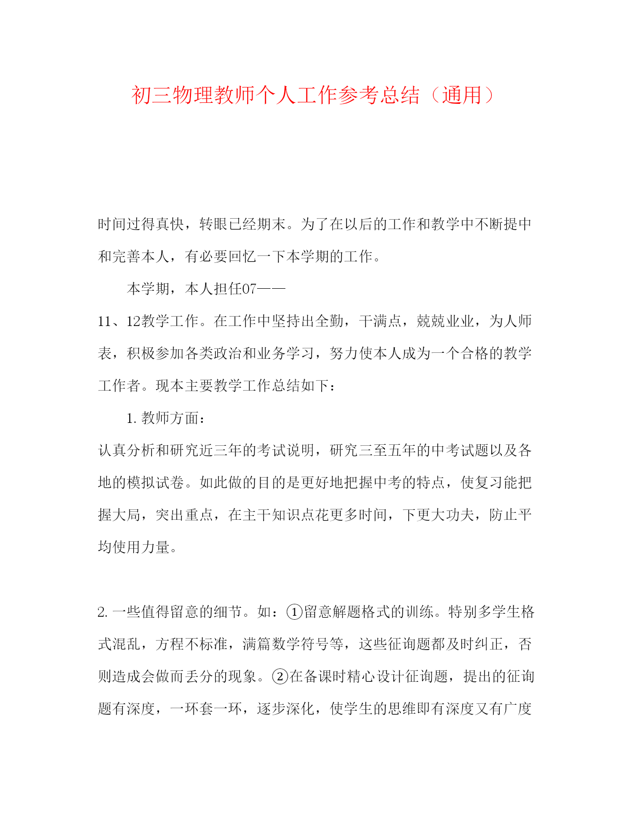 2022初三物理教师个人工作参考总结通用
