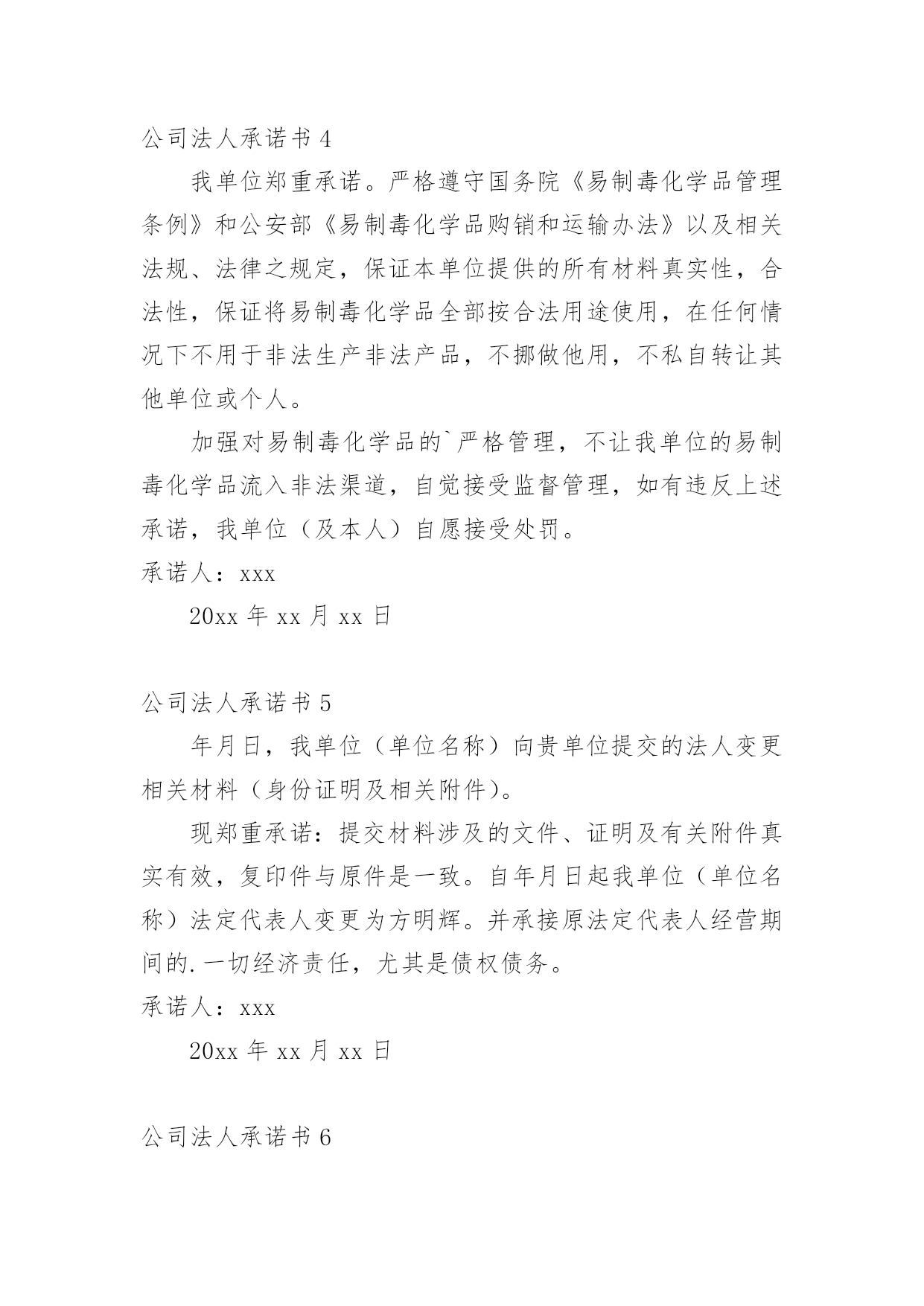 公司法人承诺书公司法人承诺书(7篇)现如今,在很多情况下我们需要用到承诺书,承诺书必须在要约的有效期作出。相信许多人会觉得承诺书很难写吧,以下是小编为大家收集的公司法人承诺书,欢迎大家借鉴与参考,希望对大家有所帮助。公司法人承诺书1我企业进入x市辖区拟承接x市金开源房地产开发有限责任公司地下车库及南区沿街商业工程的施工业务,将严格遵守《建筑法》、《招投标法》《建设工程质量管理条例》、《建设工程安全生产管理条例》、《河南省建建筑市场管理条例》、《x市外地进宛施工企业管理办法》和有关的法律、法规、规章制度、规范性文件的规定,并郑重作出以下承诺:1、本公司全权委托驻宛分支机构或项目部处理在宛施工事宜,所做出的一切行为我公司全部认可,由此造成的.一切后果我公司愿承担全部责任;2、公司及负责人、分支机构或项目部必须服从建设行政主管部门及其专职管理机构的管理,认真执行建设行政主管部门的管理规定和决定。3、自觉履行建设工程合同条款,维护x市的建筑市场秩序,不超资质承揽工程业务,不违法转让工程业务;不与建设单位或者其他企业之间相互串通投标,或者以行贿等不正当手段谋取中标;4、认真执行建设工程勘察、设计、施工质量、安全的规范、标准(包括强制性标准),确保工程质量和施工安全;5、按时参加建设行政主管部门组织召开的有关会议,并自觉执行会议所提出的有关要求或规定;6、自觉接受建设行政主管部门及其专职管理机构对建设工程施工质量、安全等的监督检查,及时整改检查中提出的问题;7、所承接的工程实行承包商履约担保和农民工工资支付担保或足额缴纳农民工工资保证金;8、按时支付农民工工资,决不发生拖欠行为;9、严格执行国家规定的建设工程收费标准,不随意压低收费标准进行恶性竞争。本公司同时声明此次向x市建设委员会提交的备案资料及其载明的内容和数据真实有效,并保证在工程项目施工过程中,我企业如果出现违反国家建设工程管理的法律、法规和x市建筑市场管理规定以及上述承诺,自愿接受有关监督管理部门依法依规作出的行政处罚,并承诺二年内不再在x市辖区内承揽工程业务。企业公章:法定代表人签(章):日期:xx年xx月xx日公司法人承诺书2我单位保证严格按照国务院《易制毒化学品管理条例》和公安部《易制毒化学品购销和运输管理办法》以及相关法律法规,保证本单位的所有材料的`真实性和合法性,保证将易制毒化学品全部按合法用途使用,在任何情况下不用于非法生产,不挪为它用,不私自转让其他单位和个人,并加强对易制毒化学品的管理,完善企业内部管理制度,落实专人管理,防止我单位的易制毒化学品流入非法渠道,自觉接受监督管理,如违反上述承诺,致使易制毒化学品流入非法渠道,我单位(及本人)自愿接受相应处罚。法人(代表人)签字:单位(公章)公司法人承诺书3本人作为公司法人代表,为保障公司员工的身体健康、生命和财产安全,防止和减少生产安全事故发生,本人郑重向玛纳斯县煤炭工业管理局承诺,在工作中严格履行以下职责和义务:1、切实树立“安全第一”的思想,对公司安全生产负全面责任,建立健全安全生产管理机构,落实全员安全生产责任制。2、确保国家安全生产方针、政策、国家(行业)安全标准在公司内得到认真贯彻执行和落实。3、不断建立健全公司安全生产规章制度,并认真组织落实。4、督促公司安全生产大检查,落实重大事故隐患的`整改措施。5、坚持“管理、装备、培训”三并重原则,领导组织本公司的职工安全教育培训工作。6、保证公司安全生产必要投入的有效实施,不断采用新技术对生产装置进行维护改造,提高生产装置的安全性,改善劳动生产条件,按照国家有关规定,保障劳动保障用品发放到位。7、组织审定本公司安全生产管理方面的规章制度,并督促各部门和有关人员付诸落实。8、根据需要不定期主持召开安全生产会议,领导安委会组织,每月的15日的安全大检查,除此以外,要定时对安全工作进行检查,处理隐患。9、对全矿所存在的重大安全隐患,要及时召开有关会议研究解决。10、公司发生重大事故时,必须立即赶往现场组织抢救,并立即报告上级主管部门处,同时按规定组织领导本公司的事故调查分析,处理工作,主持制定防范措施。11、按照《煤矿安全规程》要求组织全公司的生产工作,做到科学管理,安全生产、证件齐全。承诺人(法人代表):承诺时间:年月日公司法人承诺书4我单位郑重承诺。严格遵守国务院《易制毒化学品管理条例》和公安部《易制毒化学品购销和运输办法》以及相关法规、法律之规定,保证本单位提供的所有材料真实性,合法性,保证将易制毒化学品全部按合法用途使用,在任何情况下不用于非法生产非法产品,不挪做他用,不私自转让其他单位或个人。加强对易制毒化学品的`严格管理,不让我单位的易制毒化学品流入非法渠道,自觉接受监督管理,如有违反上述承诺,我单位(及本人)自愿接受处罚。承诺人:xxx20xx年
