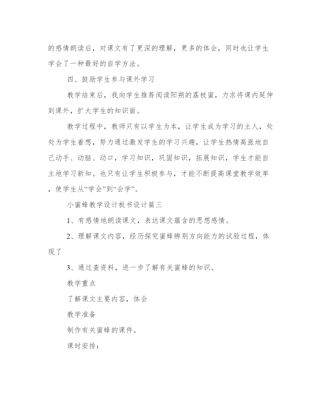 小蜜蜂教学设计板书设计(实用12篇)在日常的学习、工作、生活中,肯定对各类范文都很熟悉吧。相信许多人会觉得范文很难写?下面是小编帮大家整理的优质范文,仅供参考,大家一起来看看吧。小蜜蜂教学设计板书设计篇一1、会认“试、验、证”等10个生字,会写“袋、概、减”等14个生字。正确读写“无论、试验、纸袋、证实”等词语。2、学习默读课文,了解主要内容,学习法布尔的观察发现和探索精神,以及严谨的科学态度和求实的科学作风。3、有感情地朗读课文,表达课文蕴含的思想感情。积累语言。4、通过查资料,进一步了解有关蜜蜂的知识。弄清为了验证蜜蜂有没有辨别方向的能力,2课时第一课时教学目标:1、会认“试、验、证”等10个生字,会写“袋、概、减”等14个生字。正确读写“无论、试验、纸袋、证实”等词语。2、学习默读课文,了解主要内容,弄清实验过程。一、回忆旧知,导入新课1、回忆旧知同学们,我们曾经学过蜜蜂引路这篇课文,谁能说说这篇课文讲了个什么故事吗?2、导入新课法国著名科学家,科普作家法布尔为了证实蜜蜂会辨别方向的能力,做了一个非常有趣的实验,你想知道是个怎样的实验吗?让我们走进蜜蜂这篇课文一同去看看,同时也看看实验的结果怎样。二、初读课文1、循序渐进读课文。第一遍:边读边找出带有本课生字的词语,借助后边的拼音争取把字音读准确。第二遍:再读课文,进行自我测试,看看自己是否还需要借助课后的生字表。如果不小心忘了,还可以再看看生字表。2、互帮互助学生字。(1)出示生字卡,请已经有把握的学生来做小老师,带领大家一起巩固,教师随时纠正读音,点评。(2)交流是怎么认识生字的,肯定各种不同的识字方法。(3)出示生字卡片或课件,指名读、开火车读。3、指名逐段朗读课文,争取对课文的脉络有更为清晰的认识。三、细读课文(1)明确默读要求:不出声、不指读、边读边想,还可以动笔画出重要的词语和句子。(2)初次默读,感知全文:这篇课文主要讲了一件什么事?(4)复述故事:用自己的话将试验的过程说一说。四、指导写字1、投影出示生字词,自读,指名读,读准字音。(1)出示要写的生字:论、试、验、袋、证、概、阻,引导观察,说说书写这些字时要注意些什么。(2)学生自主合作学习,讨论怎么记住这些生字,并且介绍自己的识字方法。(3)指导写字:课件演示,逐字指导,学生通过观察自己总结书写,然后,教师用投影展示,集体评议学生写的字。2、抄写词语。五、作业设计练习默读课文,摘抄自己喜欢的词语和句子。第二课时教学目标:1、学习默读课文,了解主要内容,学习法布尔的观察发现和探索精神,以及严谨的科学态度和求实的科学作风。2、有感情地朗读课文,表达课文蕴含的思想感情。积累语言。3、通过查资料,进一步了解有关蜜蜂的知识。教学过程:一、复习导入1、听写上堂课所学的生字新词。2、说说二、精读课文,探究结果1、激励学生多遍朗读第3、4、5自然段。2、讨论辨别。假如回家的蜜蜂只有那两只,能不能说蜜蜂有辩论方向的能力?3、再读再思,深入理解。(1)两次回来的蜜蜂情况有什么不同?(2)结合课文有关内容想象一下:假如你是第一次或第二次回来的蜜蜂,中途可能会遭遇到什么情况,你会怎么想,怎么做?(可先让学生充分想象)(3)其他同学点评他们的想象是否有道理。三、赏读片断,表达感情1、学生自读体会。2、指名学生多人次表演朗读相关的两段,表达自己的感情和感受。四、再思导疑,再激兴趣2、学生发问。(主要目的就是要诱发学生提出疑问,把兴趣拓展到课外的生活实践中去。)3、教师引导。我们来看看4、学生多形式地朗读最后一段,或指名读,或小组读。5、教师再引导。五、回顾课文,感悟1、快速默读,画出体现(1)实验的目的是什么?(2)实验的过程,考虑周全吗?能不能少掉一个环节?(3)实验的结论为什么没有明确的答案?2、思考推测:另外三只蜜蜂迷失方向的原因。2、齐读课文,讨论交流:从法布尔身上,你学到了什么?六、拓展延伸,布置作业你还知道哪些有关蜜蜂的有趣知识?将你搜集到的蜜蜂或其他昆虫的相关知识制成一张手抄报,与同学们一同分享。小蜜蜂教学设计板书设计篇二1、了解课文的内容。2、默读课文,说说受伤的蜜蜂是怎样修补翅膀重新起飞的。3、理解课文内容,体会读懂课文,理解蜜蜂是怎样修补翅膀重新起飞的。课件。一、创设情境,导入新课1、出示课件,这是什么?2、说到蜜蜂,你想到了什么?3、说实话,其实我不太喜欢蜜蜂,因为我小时候曾经被它蜇过一回,但是后来听老人说蜜蜂轻易不蜇人,准是误以为你要伤害它才蜇,一蜇它自己就耗尽了生命,也活不久了。我听了,就原谅它了。可是从此看到它,总觉得心里有疙瘩。直到我看到了