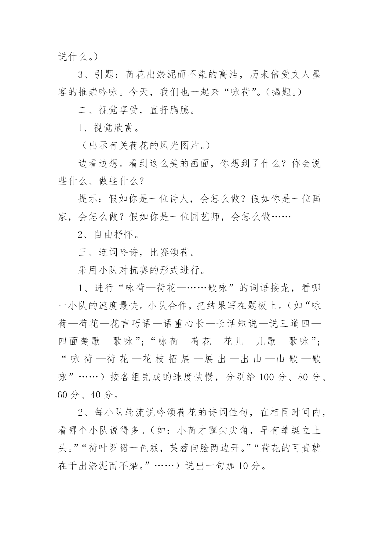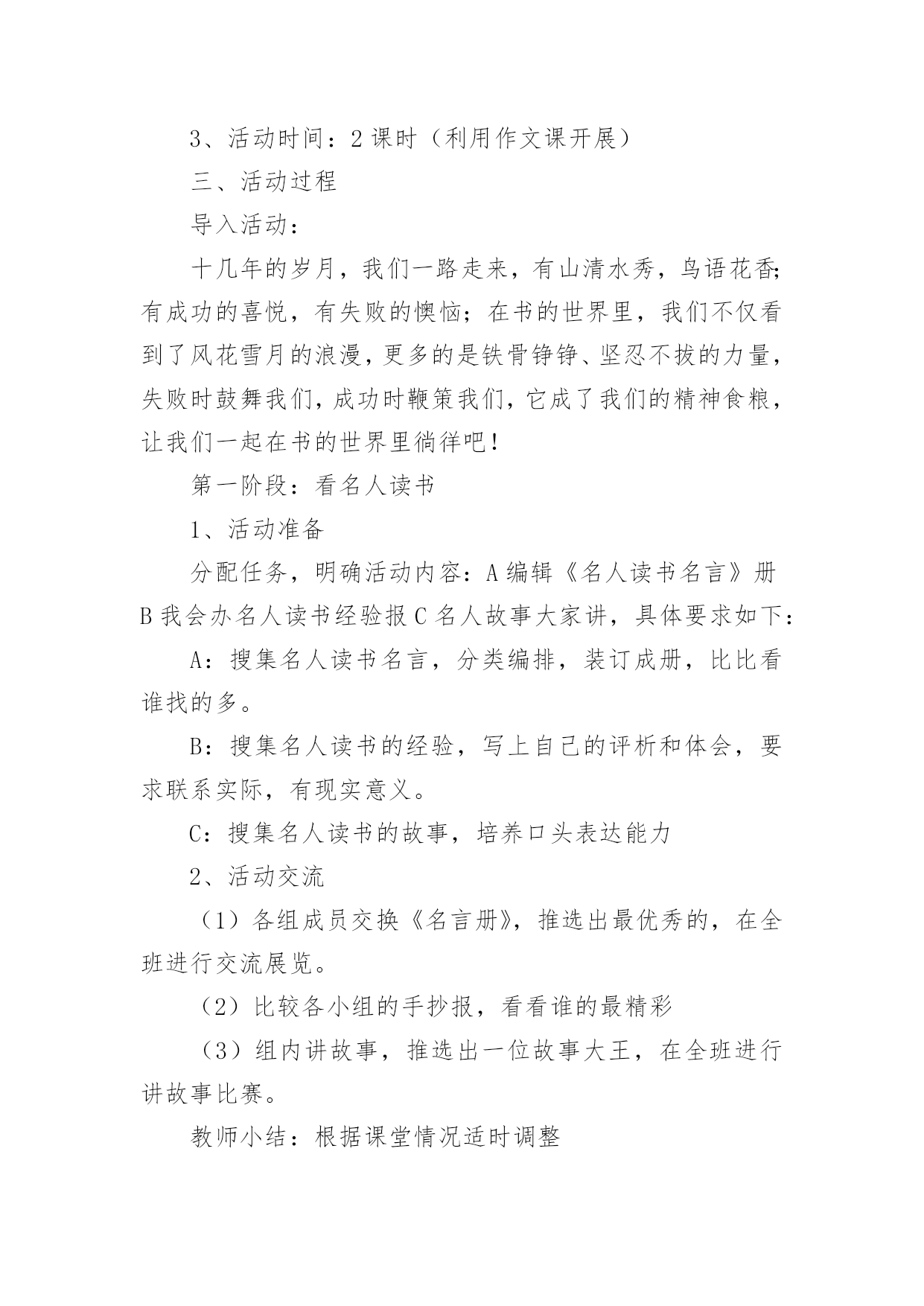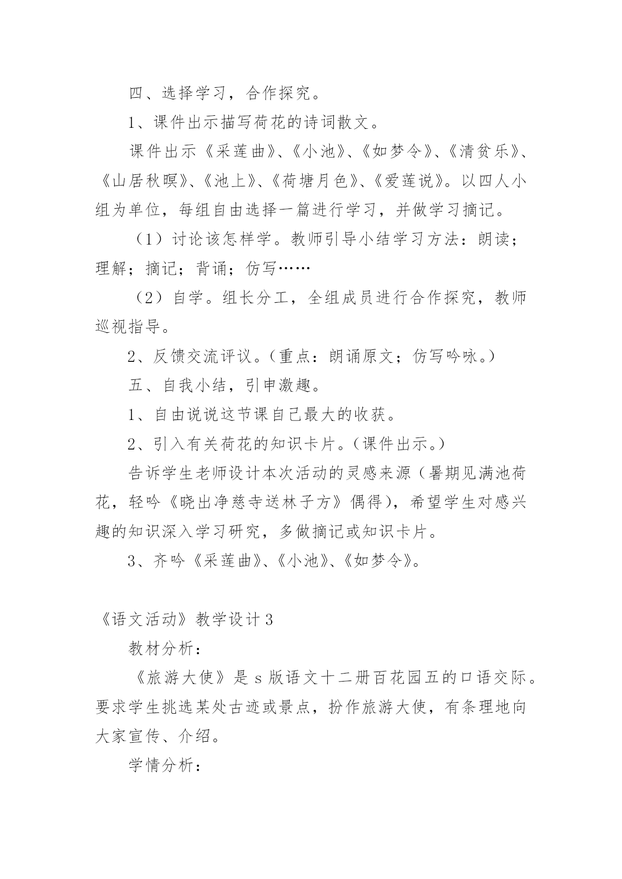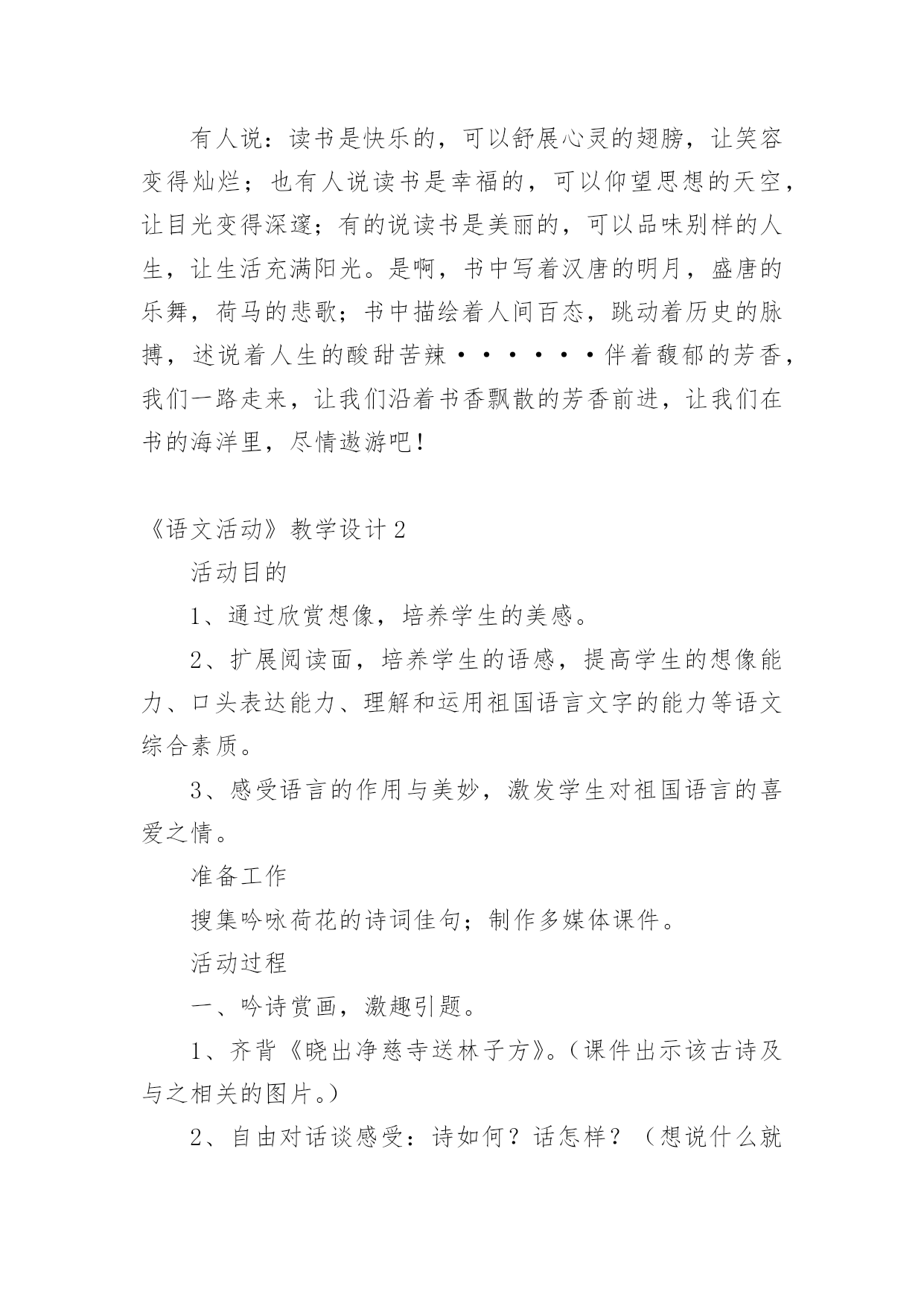 《语文活动》教学设计作为一名辛苦耕耘的教育工作者,就不得不需要编写教学设计,教学设计是教育技术的组成部分,它的功能在于运用系统方法设计教学过程,使之成为一种具有操作性的程序。教学设计应该怎么写才好呢?以下是小编收集整理的《语文活动》教学设计,欢迎大家借鉴与参考,希望对大家有所帮助。《语文活动》教学设计1一、活动目标1、认识读书的重要意义,提高学生的阅读兴趣。2、引导学生学会有选择地读书,提高对书籍的辨别能力,提高阅读的品位。3、寻找适合自己的读书方式和读书方法。4、学会和他人交流读书心得,分享读书感受,提高读书水平。二、活动建议(教师准备)古人云:“授之以鱼不如授之以渔”。所以,本次活动由老师分配任务,学生自己动手完成,真正体现学生的主体地位1、分组:8人一个小组,布置任务,分阶段实施,要求每一小组完成每项任务的要求,最后各小组进行比赛。2、向学生介绍相关的学者和图书,让他们阅读。3、活动时间:2课时(利用作文课开展)三、活动过程导入活动:十几年的岁月,我们一路走来,有山清水秀,鸟语花香;有成功的喜悦,有失败的懊恼;在书的世界里,我们不仅看到了风花雪月的浪漫,更多的是铁骨铮铮、坚忍不拔的力量,失败时鼓舞我们,成功时鞭策我们,它成了我们的精神食粮,让我们一起在书的世界里徜徉吧!第一阶段:看名人读书1、活动准备分配任务,明确活动内容:A编辑《名人读书名言》册B我会办名人读书经验报C名人故事大家讲,具体要求如下:A:搜集名人读书名言,分类编排,装订成册,比比看谁找的多。B:搜集名人读书的经验,写上自己的评析和体会,要求联系实际,有现实意义。C:搜集名人读书的故事,培养口头表达能力2、活动交流(1)各组成员交换《名言册》,推选出最优秀的,在全班进行交流展览。(2)比较各小组的手抄报,看看谁的最精彩(3)组内讲故事,推选出一位故事大王,在全班进行讲故事比赛。教师小结:根据课堂情况适时调整第二阶段:你说我说说读书1、布置话题讨论:(1)流行作品与经典作品较量(2)读图与读文争锋(3)读书模式的优劣2、专题辩论网上阅读利与弊(要求:利用课余时间,查阅资料)教师小结:针对学生的情况,做好引导和指导。第三阶段:与书籍同行1、布置活动(1)我当“记者”要求:列好提纲,针对学生的课外阅读情况作一了解,每组设计3-5个问题,进行采访,整理成书面报告。(2)我当“书探”要求:各组将自己在书店、图书馆看到的好书制作成好书推荐卡(包括作品、作者、国别、主要内容,读后感受)整理成册,便于同学间交流。四、活动总结1、引导学生进行自我评价和相互评价(采用自我小结、自我反思,小组交流、全班讨论的方式进行)2、老师评价针对学生自我评价和相互评价进行再评价,然后总结活动的目的和意义。3、结语有人说:读书是快乐的,可以舒展心灵的翅膀,让笑容变得灿烂;也有人说读书是幸福的,可以仰望思想的天空,让目光变得深邃;有的说读书是美丽的,可以品味别样的人生,让生活充满阳光。是啊,书中写着汉唐的明月,盛唐的乐舞,荷马的悲歌;书中描绘着人间百态,跳动着历史的脉搏,述说着人生的酸甜苦辣······伴着馥郁的芳香,我们一路走来,让我们沿着书香飘散的芳香前进,让我们在书的海洋里,尽情遨游吧!《语文活动》教学设计2活动目的1、通过欣赏想像,培养学生的美感。2、扩展阅读面,培养学生的语感,提高学生的想像能力、口头表达能力、理解和运用祖国语言文字的能力等语文综合素质。3、感受语言的作用与美妙,激发学生对祖国语言的喜爱之情。准备工作搜集吟咏荷花的诗词佳句;制作多媒体课件。活动过程一、吟诗赏画,激趣引题。1、齐背《晓出净慈寺送林子方》。(课件出示该古诗及与之相关的图片。)2、自由对话谈感受:诗如何?话怎样?(想说什么就说什么。)3、引题:荷花出淤泥而不染的高洁,历来倍受文人墨客的推崇吟咏。今天,我们也一起来“咏荷”。(揭题。)二、视觉享受,直抒胸臆。1、视觉欣赏。(出示有关荷花的风光图片。)边看边想。看到这么美的画面,你想到了什么?你会说些什么、做些什么?提示:假如你是一位诗人,会怎么做?假如你是一位画家,会怎么做?假如你是一位园艺师,会怎么做……2、自由抒怀。三、连词吟诗,比赛颂荷。采用小队对抗赛的形式进行。1、进行“咏荷—荷花—……歌咏”的词语接龙,看哪一小队的速度最快。小队合作,把结果写在题板上。(如“咏荷—荷花—花言巧语—语重心长—长话短说—说三道四—四面楚歌—歌咏”;“咏荷—荷花—花儿—儿歌—歌咏”;“咏荷—荷花—花枝招展—展出—出山—山歌—歌咏”……)按各组完成的速度快慢,分别给100分、80分、60分、40分。2、每小队轮流说吟颂荷花的诗词佳句,在相同时间内,看哪个小队说得多。(如:小荷才露尖尖角,早有蜻蜓立上头。”“荷叶罗裙一色裁,芙蓉向脸两边开。”“荷花的可贵就在于出淤泥而不染。
