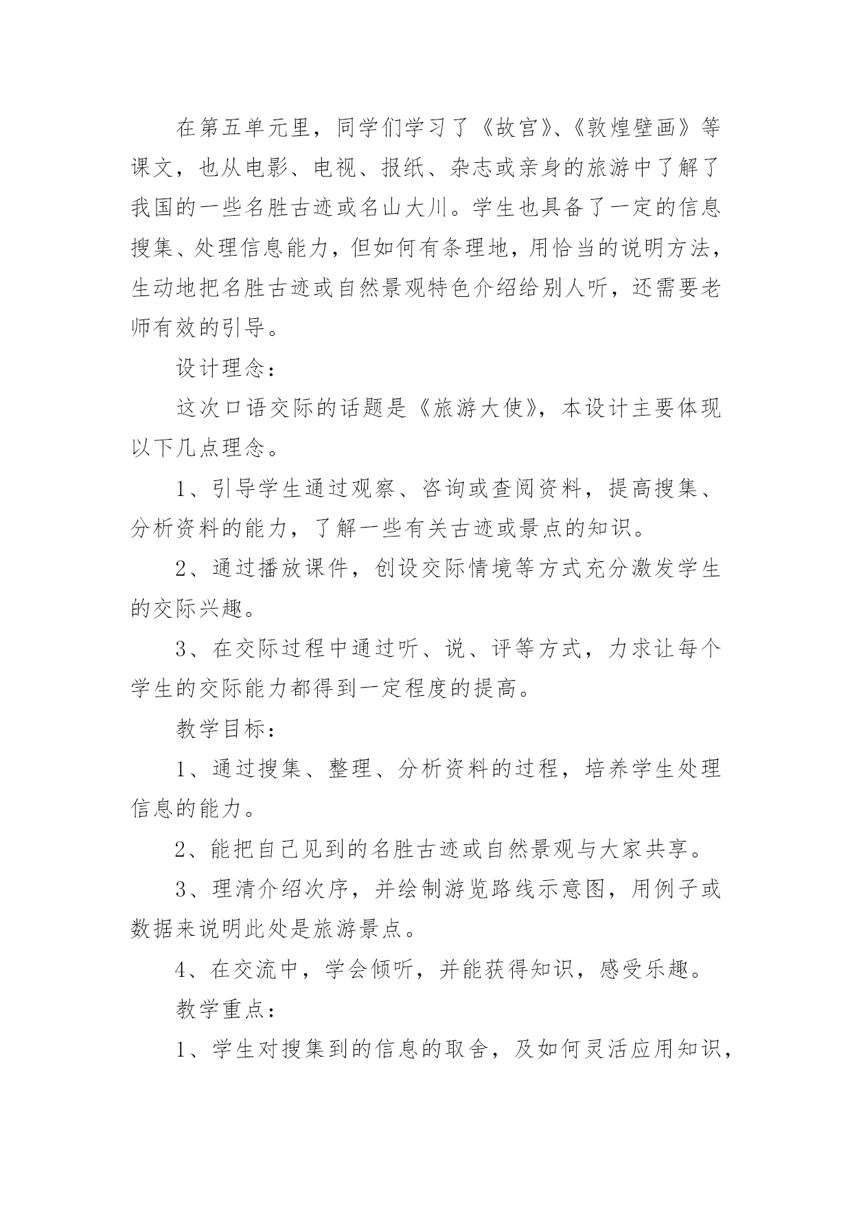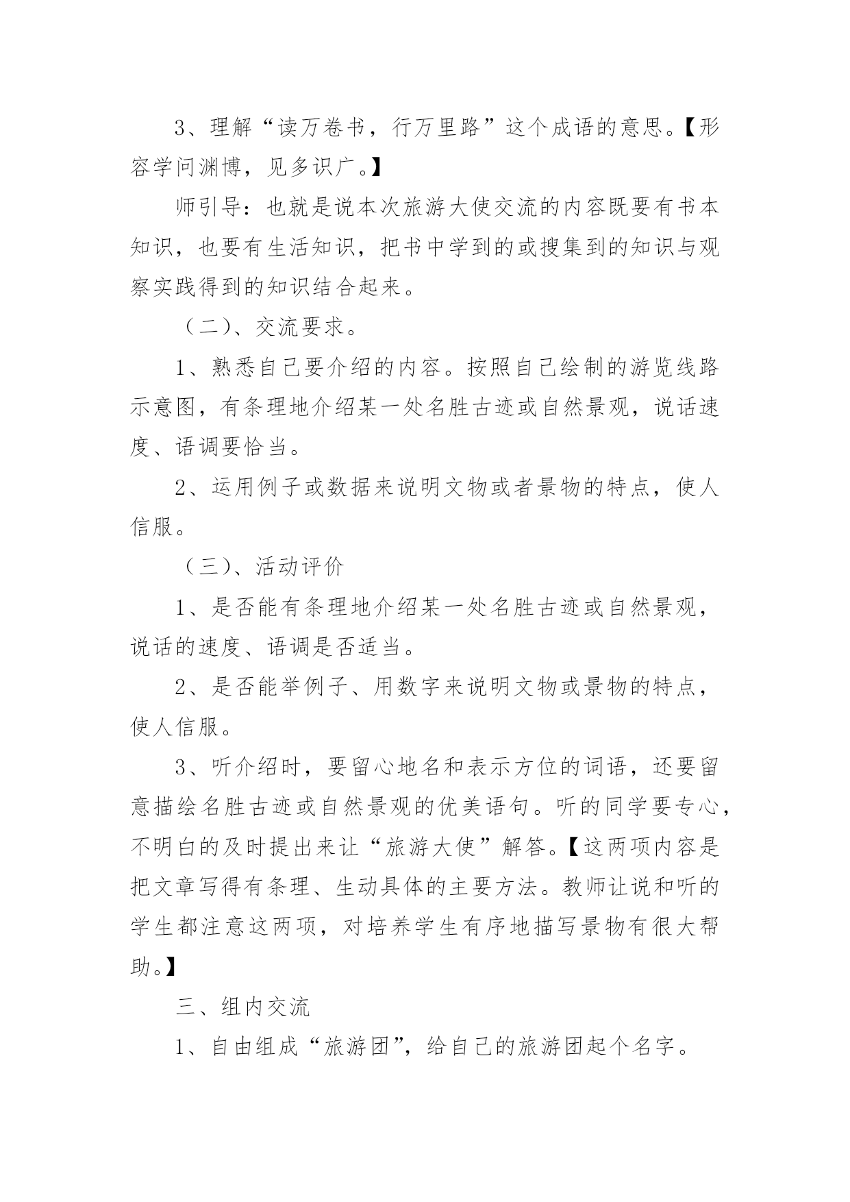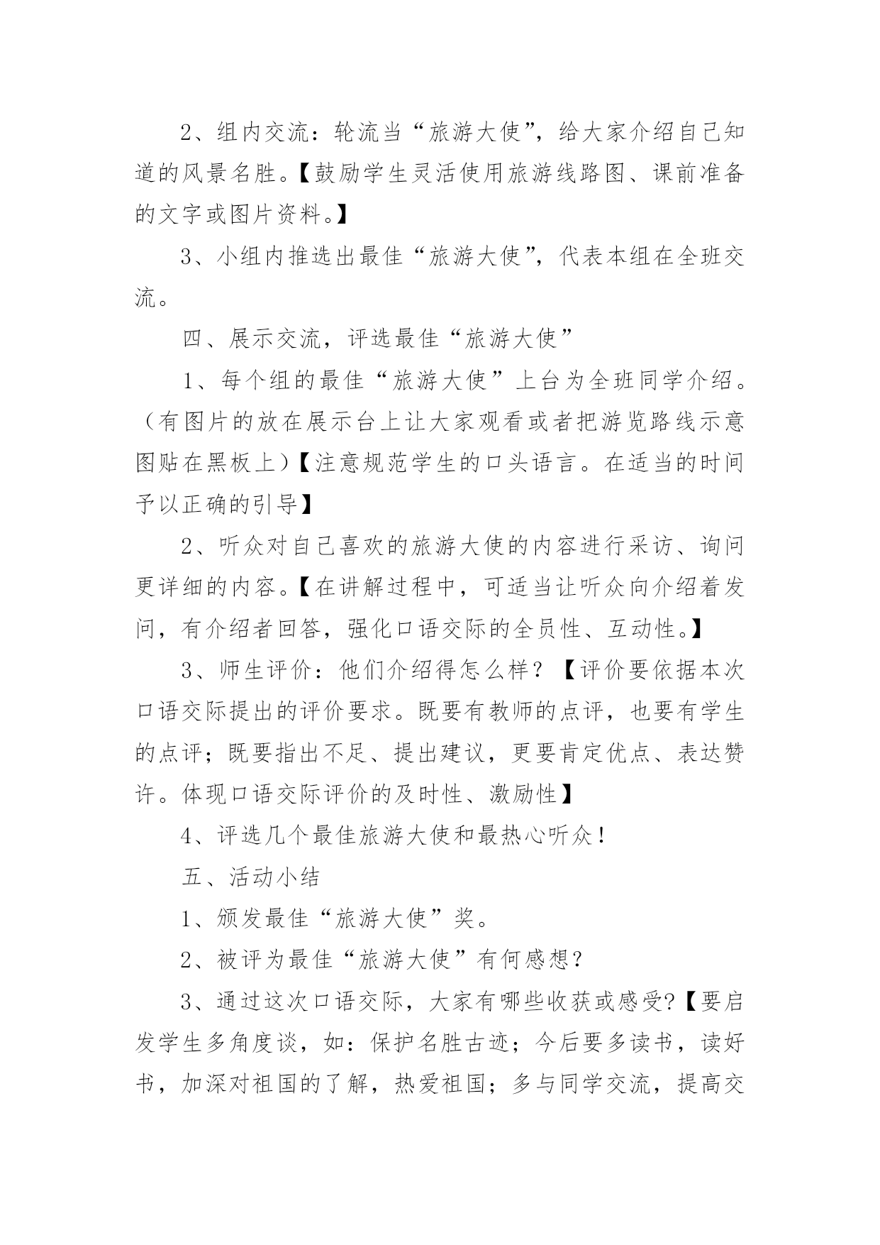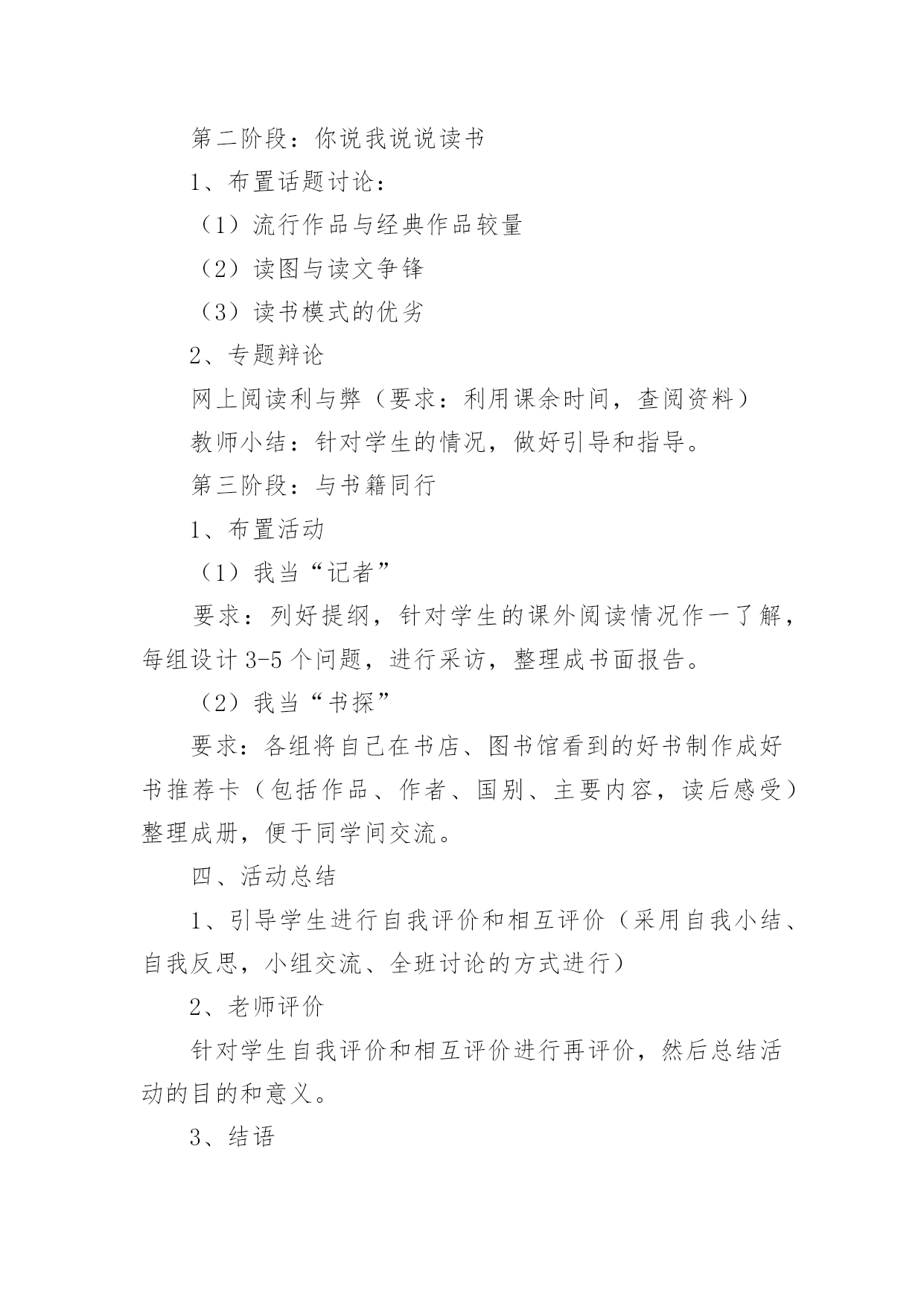 《语文活动》教学设计作为一名辛苦耕耘的教育工作者,就不得不需要编写教学设计,教学设计是教育技术的组成部分,它的功能在于运用系统方法设计教学过程,使之成为一种具有操作性的程序。教学设计应该怎么写才好呢?以下是小编收集整理的《语文活动》教学设计,欢迎大家借鉴与参考,希望对大家有所帮助。《语文活动》教学设计1一、活动目标1、认识读书的重要意义,提高学生的阅读兴趣。2、引导学生学会有选择地读书,提高对书籍的辨别能力,提高阅读的品位。3、寻找适合自己的读书方式和读书方法。4、学会和他人交流读书心得,分享读书感受,提高读书水平。二、活动建议(教师准备)古人云:“授之以鱼不如授之以渔”。所以,本次活动由老师分配任务,学生自己动手完成,真正体现学生的主体地位1、分组:8人一个小组,布置任务,分阶段实施,要求每一小组完成每项任务的要求,最后各小组进行比赛。2、向学生介绍相关的学者和图书,让他们阅读。3、活动时间:2课时(利用作文课开展)三、活动过程导入活动:十几年的岁月,我们一路走来,有山清水秀,鸟语花香;有成功的喜悦,有失败的懊恼;在书的世界里,我们不仅看到了风花雪月的浪漫,更多的是铁骨铮铮、坚忍不拔的力量,失败时鼓舞我们,成功时鞭策我们,它成了我们的精神食粮,让我们一起在书的世界里徜徉吧!第一阶段:看名人读书1、活动准备分配任务,明确活动内容:A编辑《名人读书名言》册B我会办名人读书经验报C名人故事大家讲,具体要求如下:A:搜集名人读书名言,分类编排,装订成册,比比看谁找的多。B:搜集名人读书的经验,写上自己的评析和体会,要求联系实际,有现实意义。C:搜集名人读书的故事,培养口头表达能力2、活动交流(1)各组成员交换《名言册》,推选出最优秀的,在全班进行交流展览。(2)比较各小组的手抄报,看看谁的最精彩(3)组内讲故事,推选出一位故事大王,在全班进行讲故事比赛。教师小结:根据课堂情况适时调整第二阶段:你说我说说读书1、布置话题讨论:(1)流行作品与经典作品较量(2)读图与读文争锋(3)读书模式的优劣2、专题辩论网上阅读利与弊(要求:利用课余时间,查阅资料)教师小结:针对学生的情况,做好引导和指导。第三阶段:与书籍同行1、布置活动(1)我当“记者”要求:列好提纲,针对学生的课外阅读情况作一了解,每组设计3-5个问题,进行采访,整理成书面报告。(2)我当“书探”要求:各组将自己在书店、图书馆看到的好书制作成好书推荐卡(包括作品、作者、国别、主要内容,读后感受)整理成册,便于同学间交流。四、活动总结1、引导学生进行自我评价和相互评价(采用自我小结、自我反思,小组交流、全班讨论的方式进行)2、老师评价针对学生自我评价和相互评价进行再评价,然后总结活动的目的和意义。3、结语有人说:读书是快乐的,可以舒展心灵的翅膀,让笑容变得灿烂;也有人说读书是幸福的,可以仰望思想的天空,让目光变得深邃;有的说读书是美丽的,可以品味别样的人生,让生活充满阳光。是啊,书中写着汉唐的明月,盛唐的乐舞,荷马的悲歌;书中描绘着人间百态,跳动着历史的脉搏,述说着人生的酸甜苦辣······伴着馥郁的芳香,我们一路走来,让我们沿着书香飘散的芳香前进,让我们在书的海洋里,尽情遨游吧!《语文活动》教学设计2活动目的1、通过欣赏想像,培养学生的美感。2、扩展阅读面,培养学生的语感,提高学生的想像能力、口头表达能力、理解和运用祖国语言文字的能力等语文综合素质。3、感受语言的作用与美妙,激发学生对祖国语言的喜爱之情。准备工作搜集吟咏荷花的诗词佳句;制作多媒体课件。活动过程一、吟诗赏画,激趣引题。1、齐背《晓出净慈寺送林子方》。(课件出示该古诗及与之相关的图片。)2、自由对话谈感受:诗如何?话怎样?(想说什么就说什么。)3、引题:荷花出淤泥而不染的高洁,历来倍受文人墨客的推崇吟咏。今天,我们也一起来“咏荷”。(揭题。)二、视觉享受,直抒胸臆。1、视觉欣赏。(出示有关荷花的风光图片。)边看边想。看到这么美的画面,你想到了什么?你会说些什么、做些什么?提示:假如你是一位诗人,会怎么做?假如你是一位画家,会怎么做?假如你是一位园艺师,会怎么做……2、自由抒怀。三、连词吟诗,比赛颂荷。采用小队对抗赛的形式进行。1、进行“咏荷—荷花—……歌咏”的词语接龙,看哪一小队的速度最快。小队合作,把结果写在题板上。(如“咏荷—荷花—花言巧语—语重心长—长话短说—说三道四—四面楚歌—歌咏”;“咏荷—荷花—花儿—儿歌—歌咏”;“咏荷—荷花—花枝招展—展出—出山—山歌—歌咏”……)按各组完成的速度快慢,分别给100分、80分、60分、40分。2、每小队轮流说吟颂荷花的诗词佳句,在相同时间内,看哪个小队说得多。(如:小荷才露尖尖角,早有蜻蜓立上头。”“荷叶罗裙一色裁,芙蓉向脸两边开。”“荷花的可贵就在于出淤泥而不染。