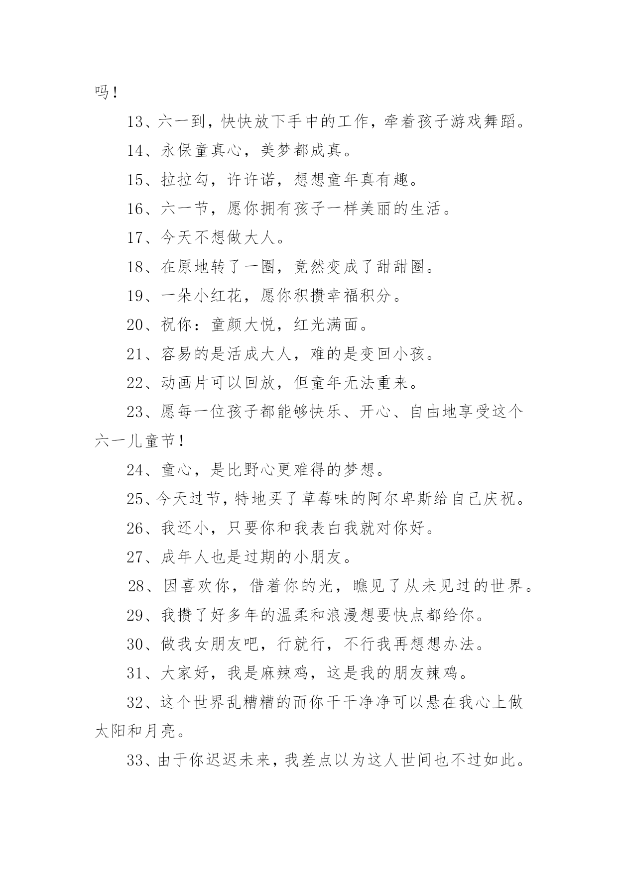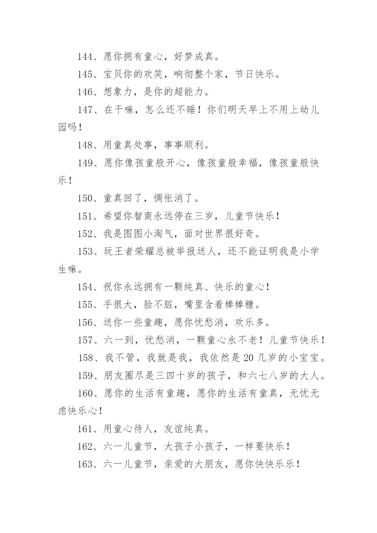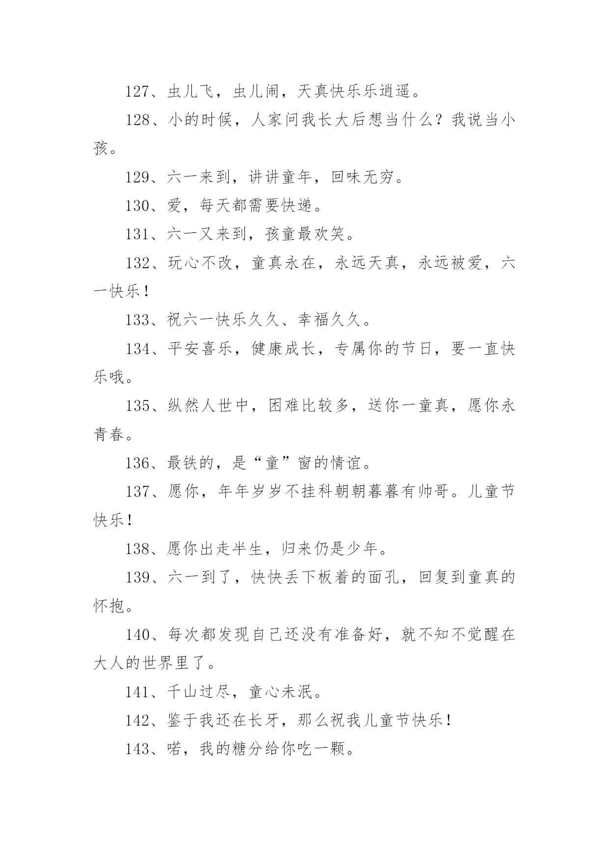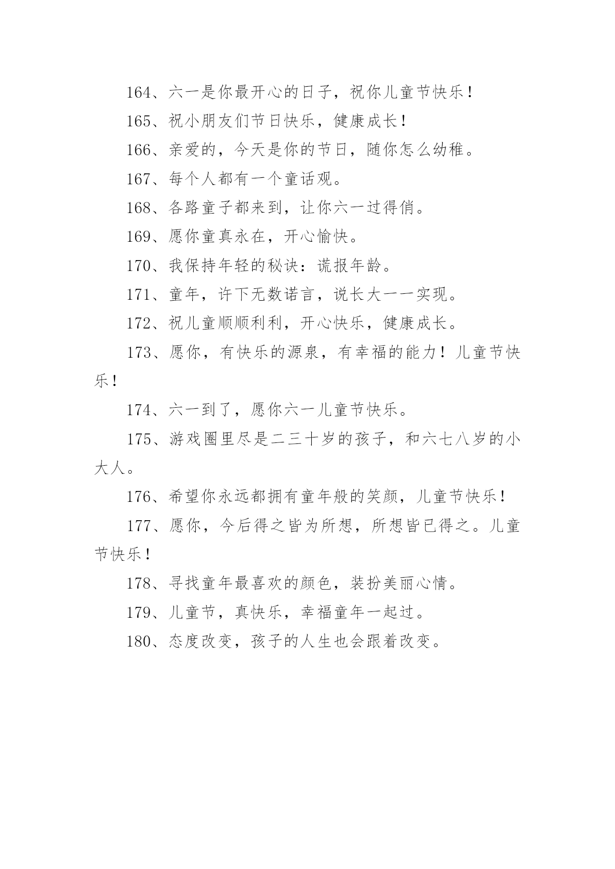 可爱的六一儿童节文案关于可爱的六一儿童节文案180句无论是身处学校还是步入社会,大家都对那些朗朗上口的文案很是熟悉吧,文案用以记录和分享生活日常。那么问题来了,到底什么样的文案才是低调奢华有内涵的呢?下面是小编收集整理的关于可爱的六一儿童节文案,仅供参考,欢迎大家阅读。1、你的年龄过不了儿童节,但你的心里可以阿。2、儿童不分大小,谁还不是个宝宝啊。3、可爱不是长久之计,可爱我是长久之计。4、你是世间最可爱的小星星,我爱了整个宇宙只为了跟你碰头。5、小朋友今日愿望:希望以后的日子多的是不需要理由的快乐。6、小时候想把头发梳成大人模样,长大后才发现大人其实没有什么头发。7、无论多大,都要热爱童话,英雄和魔法。8、我是小朋友这件事,你们都知道的对吧。9、六一限定,英雄小可爱已上线。10、想送你一台自动贩梦机,以及一罐大大的快乐。11、全世界都在忙着变回小孩,我要勇敢的成为大人。除非有糖吃。12、在干嘛,怎么还不睡!你们明天早上不用上幼儿园吗!13、六一到,快快放下手中的工作,牵着孩子游戏舞蹈。14、永保童真心,美梦都成真。15、拉拉勾,许许诺,想想童年真有趣。16、六一节,愿你拥有孩子一样美丽的生活。17、今天不想做大人。18、在原地转了一圈,竟然变成了甜甜圈。19、一朵小红花,愿你积攒幸福积分。20、祝你:童颜大悦,红光满面。21、容易的是活成大人,难的是变回小孩。22、动画片可以回放,但童年无法重来。23、愿每一位孩子都能够快乐、开心、自由地享受这个六一儿童节!24、童心,是比野心更难得的梦想。25、今天过节,特地买了草莓味的阿尔卑斯给自己庆祝。26、我还小,只要你和我表白我就对你好。27、成年人也是过期的小朋友。28、因喜欢你,借着你的光,瞧见了从未见过的世界。29、我攒了好多年的温柔和浪漫想要快点都给你。30、做我女朋友吧,行就行,不行我再想想办法。31、大家好,我是麻辣鸡,这是我的朋友辣鸡。32、这个世界乱糟糟的而你干干净净可以悬在我心上做太阳和月亮。33、由于你迟迟未来,我差点以为这人世间也不过如此。34、总有些惊喜的际遇,比方说当我遇到你。35、你要是愿意,我就永远爱你。你要是不愿意,我就永远相思。36、希望有一天,我能够不用对着手机和你说晚安,你就在我身边。37、你是最好,如果真的有比你好的人,我就装没看见。38、牵手红尘,岁月流走,愿长相厮守,愿白头永久。39、要把温柔和可爱藏起来,留给值得的人。40、虽然个人年龄过了,但是在个人财产上,我觉得我还可以过个儿童节。41、我这个人不算太好,不算太坏,你姑且试试。42、是谁给你开的vip,让你在我心里胡作非为。43、报告一下,我变心了,我比昨天更爱你了。44、我爱你,如鲸向海,鸟投林,不可避免,退无可退。45、你风尘仆仆走向我,胜过所有遥远的温柔。46、遇见你之前,世界是一片荒凉,遇到你之后,世界是一个乐园。47、这个星球偶尔脆弱,而我也偶尔,想与你沉没。48、一起去世界的每个角落,你没有听错,我陪你开心难过。49、好久没有见面啦!攒了好久的浪漫和温柔,想要一次性都给你。50、你的笑就是那彩虹云朵,你开心我都愿意给你我所有。51、我这个小笨蛋,今天要和哪个小傻瓜一起玩呢。52、小朋友的任务:天天开心。53、小小的人儿,六一节快乐!54、在人生的小路上,蹦蹦跳跳。55、愿你,做一个可爱的小朋友,天真,快乐,不知愁。56、超龄儿童们,时光易逝,童心不泯,预祝六一快乐!57、六一跟我有什么关系,我每天都是个小朋友。58、儿童节快乐,快乐六一儿童节!59、六一儿童节,祝你节日快乐无比!60、愿我们永远童心未泯,勇敢前行如战士。61、愿你童心大悦,幸福来到。62、就要到了,做我的小朋友吗或者我做你的小朋友。63、想做一天小朋友,天真可爱不知愁。64、最真的,是童真的美好。65、过不过六一无所谓噢,我每天都是个小孩子。66、我的节日,我做主,今天尽管吃喝玩乐。67、祝你:童心荡漾,童趣无限。68、今天是我的节日,因为我玩什么游戏队友都说我是小学生。69、叮叮叮!来自老派少女的自拍。70、永保童真心,美梦都成真。71、手拉手儿做游戏,开开心心无烦恼。72、愿你生活快乐,吉祥如意。73、儿童不分大小,谁还不是个宝宝啊!74、六一节,愿你拥有孩子一样美丽的生活。75、儿童多如潮水涌,爸爸妈妈伴身旁。76、我是图图小淘气,面对世界很好奇。77、虽然年龄已过,但是在智商上,我觉得我还可以过个儿童节。78、谁愿意把我当小朋友一样宠,我的AD钙奶就分谁一半。79、特地买了草莓味的,阿尔卑斯给自己庆祝。80、不管你多大,在我心里永远是个小朋友。81、你好,我是幼儿园大班的小小韩。82、愿所有人心中的小孩都有人爱。83、六一给我买零食的人老了要带我去镶金牙。84、我是小朋友这件事,你们都知道的对