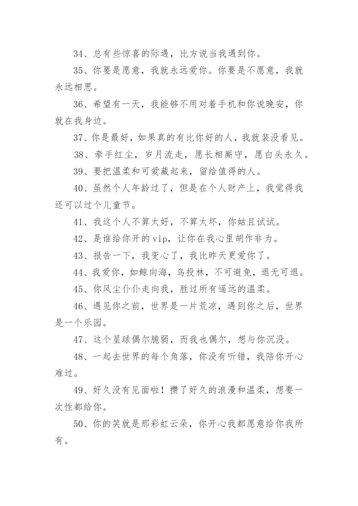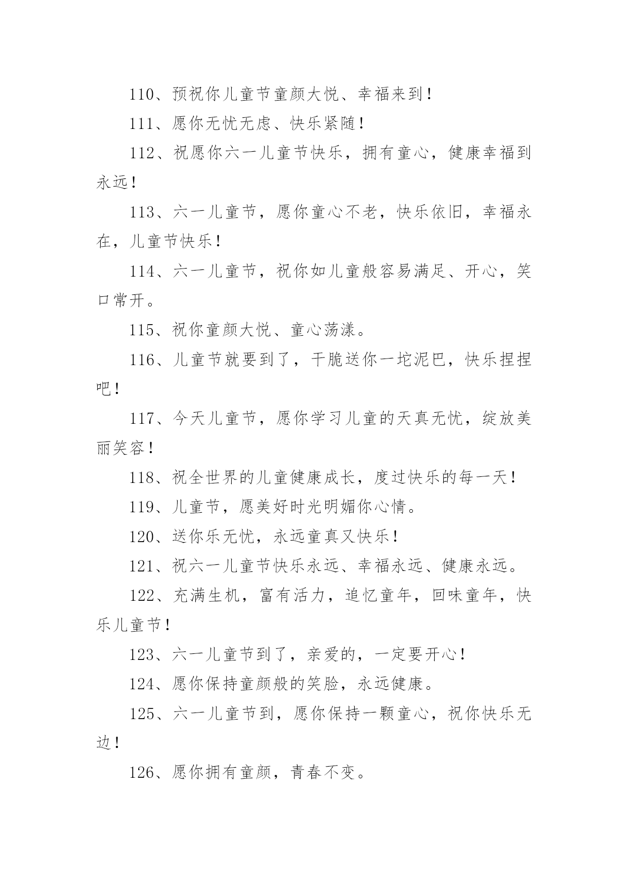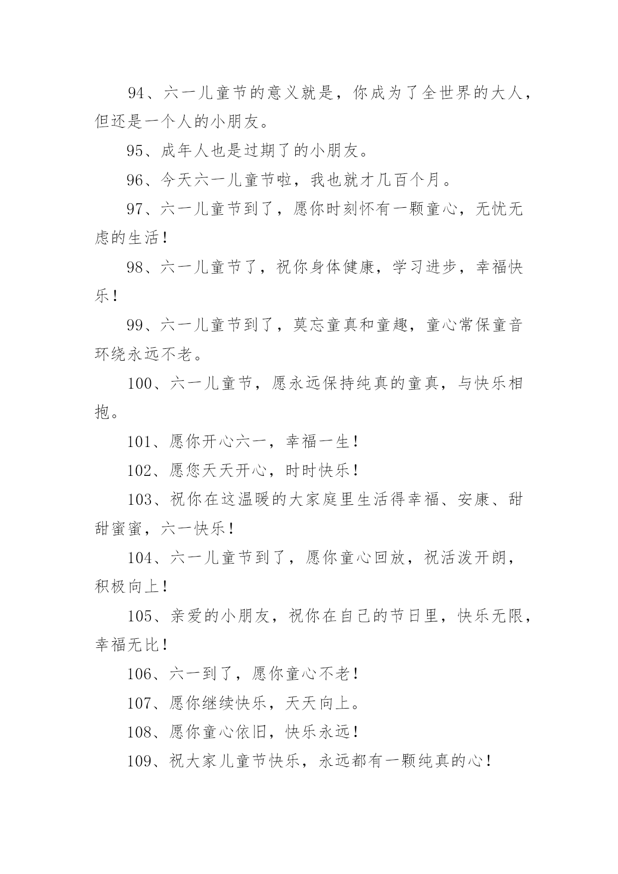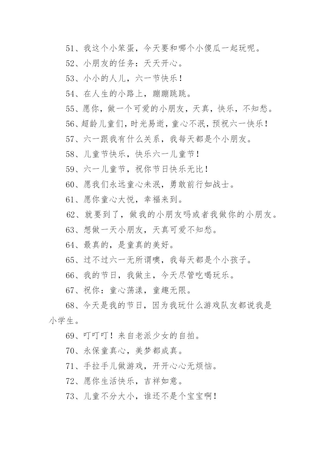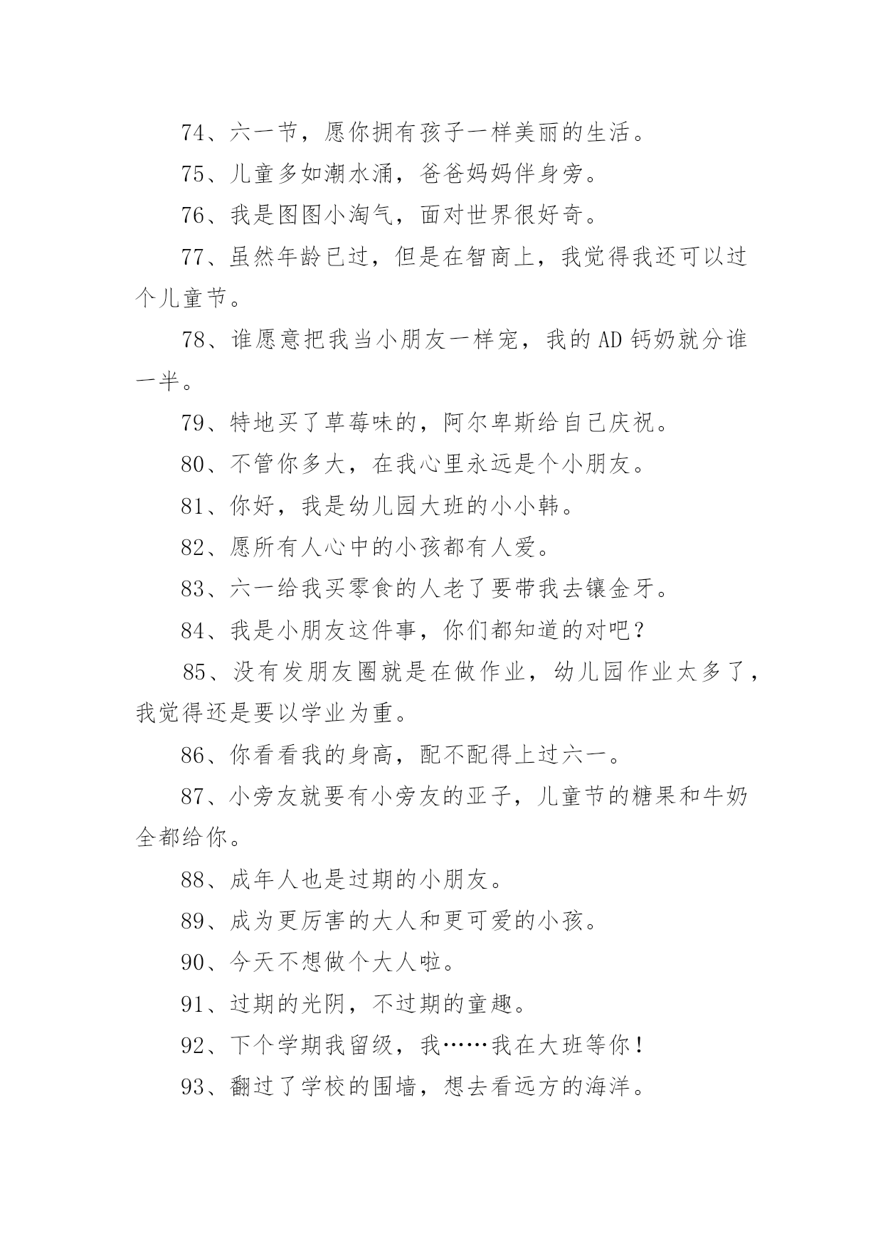 可爱的六一儿童节文案关于可爱的六一儿童节文案180句无论是身处学校还是步入社会,大家都对那些朗朗上口的文案很是熟悉吧,文案用以记录和分享生活日常。那么问题来了,到底什么样的文案才是低调奢华有内涵的呢?下面是小编收集整理的关于可爱的六一儿童节文案,仅供参考,欢迎大家阅读。1、你的年龄过不了儿童节,但你的心里可以阿。2、儿童不分大小,谁还不是个宝宝啊。3、可爱不是长久之计,可爱我是长久之计。4、你是世间最可爱的小星星,我爱了整个宇宙只为了跟你碰头。5、小朋友今日愿望:希望以后的日子多的是不需要理由的快乐。6、小时候想把头发梳成大人模样,长大后才发现大人其实没有什么头发。7、无论多大,都要热爱童话,英雄和魔法。8、我是小朋友这件事,你们都知道的对吧。9、六一限定,英雄小可爱已上线。10、想送你一台自动贩梦机,以及一罐大大的快乐。11、全世界都在忙着变回小孩,我要勇敢的成为大人。除非有糖吃。12、在干嘛,怎么还不睡!你们明天早上不用上幼儿园吗!13、六一到,快快放下手中的工作,牵着孩子游戏舞蹈。14、永保童真心,美梦都成真。15、拉拉勾,许许诺,想想童年真有趣。16、六一节,愿你拥有孩子一样美丽的生活。17、今天不想做大人。18、在原地转了一圈,竟然变成了甜甜圈。19、一朵小红花,愿你积攒幸福积分。20、祝你:童颜大悦,红光满面。21、容易的是活成大人,难的是变回小孩。22、动画片可以回放,但童年无法重来。23、愿每一位孩子都能够快乐、开心、自由地享受这个六一儿童节!24、童心,是比野心更难得的梦想。25、今天过节,特地买了草莓味的阿尔卑斯给自己庆祝。26、我还小,只要你和我表白我就对你好。27、成年人也是过期的小朋友。28、因喜欢你,借着你的光,瞧见了从未见过的世界。29、我攒了好多年的温柔和浪漫想要快点都给你。30、做我女朋友吧,行就行,不行我再想想办法。31、大家好,我是麻辣鸡,这是我的朋友辣鸡。32、这个世界乱糟糟的而你干干净净可以悬在我心上做太阳和月亮。33、由于你迟迟未来,我差点以为这人世间也不过如此。34、总有些惊喜的际遇,比方说当我遇到你。35、你要是愿意,我就永远爱你。你要是不愿意,我就永远相思。36、希望有一天,我能够不用对着手机和你说晚安,你就在我身边。37、你是最好,如果真的有比你好的人,我就装没看见。38、牵手红尘,岁月流走,愿长相厮守,愿白头永久。39、要把温柔和可爱藏起来,留给值得的人。40、虽然个人年龄过了,但是在个人财产上,我觉得我还可以过个儿童节。41、我这个人不算太好,不算太坏,你姑且试试。42、是谁给你开的vip,让你在我心里胡作非为。43、报告一下,我变心了,我比昨天更爱你了。44、我爱你,如鲸向海,鸟投林,不可避免,退无可退。45、你风尘仆仆走向我,胜过所有遥远的温柔。46、遇见你之前,世界是一片荒凉,遇到你之后,世界是一个乐园。47、这个星球偶尔脆弱,而我也偶尔,想与你沉没。48、一起去世界的每个角落,你没有听错,我陪你开心难过。49、好久没有见面啦!攒了好久的浪漫和温柔,想要一次性都给你。50、你的笑就是那彩虹云朵,你开心我都愿意给你我所有。51、我这个小笨蛋,今天要和哪个小傻瓜一起玩呢。52、小朋友的任务:天天开心。53、小小的人儿,六一节快乐!54、在人生的小路上,蹦蹦跳跳。55、愿你,做一个可爱的小朋友,天真,快乐,不知愁。56、超龄儿童们,时光易逝,童心不泯,预祝六一快乐!57、六一跟我有什么关系,我每天都是个小朋友。58、儿童节快乐,快乐六一儿童节!59、六一儿童节,祝你节日快乐无比!60、愿我们永远童心未泯,勇敢前行如战士。61、愿你童心大悦,幸福来到。62、就要到了,做我的小朋友吗或者我做你的小朋友。63、想做一天小朋友,天真可爱不知愁。64、最真的,是童真的美好。65、过不过六一无所谓噢,我每天都是个小孩子。66、我的节日,我做主,今天尽管吃喝玩乐。67、祝你:童心荡漾,童趣无限。68、今天是我的节日,因为我玩什么游戏队友都说我是小学生。69、叮叮叮!来自老派少女的自拍。70、永保童真心,美梦都成真。71、手拉手儿做游戏,开开心心无烦恼。72、愿你生活快乐,吉祥如意。73、儿童不分大小,谁还不是个宝宝啊!74、六一节,愿你拥有孩子一样美丽的生活。75、儿童多如潮水涌,爸爸妈妈伴身旁。76、我是图图小淘气,面对世界很好奇。77、虽然年龄已过,但是在智商上,我觉得我还可以过个儿童节。78、谁愿意把我当小朋友一样宠,我的AD钙奶就分谁一半。79、特地买了草莓味的,阿尔卑斯给自己庆祝。80、不管你多大,在我心里永远是个小朋友。81、你好,我是幼儿园大班的小小韩。82、愿所有人心中的小孩都有人爱。83、六一给我买零食的人老了要带我去镶金牙。84、我是小朋友这件事,你们都知道的对