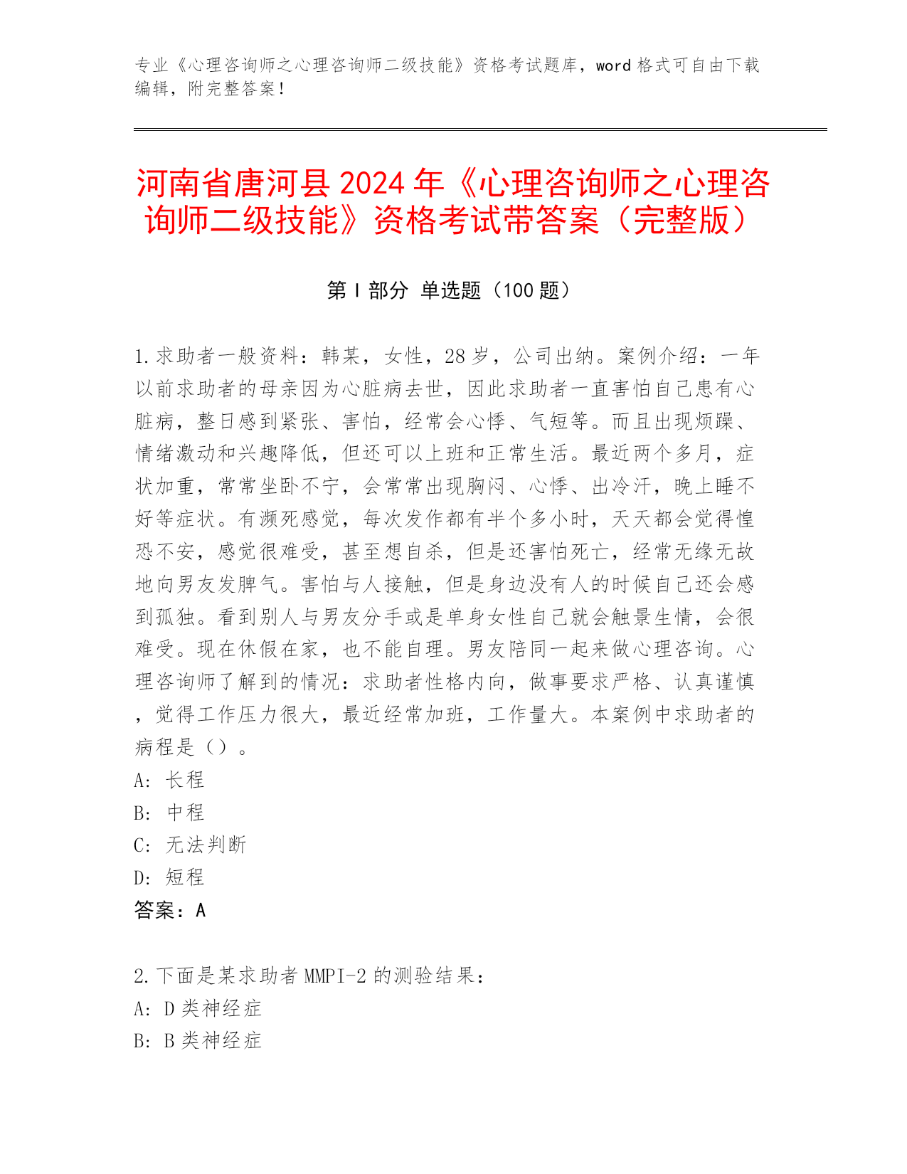 河南省唐河县2024年《心理咨询师之心理咨询师二级技能》资格考试带答案(完整版)