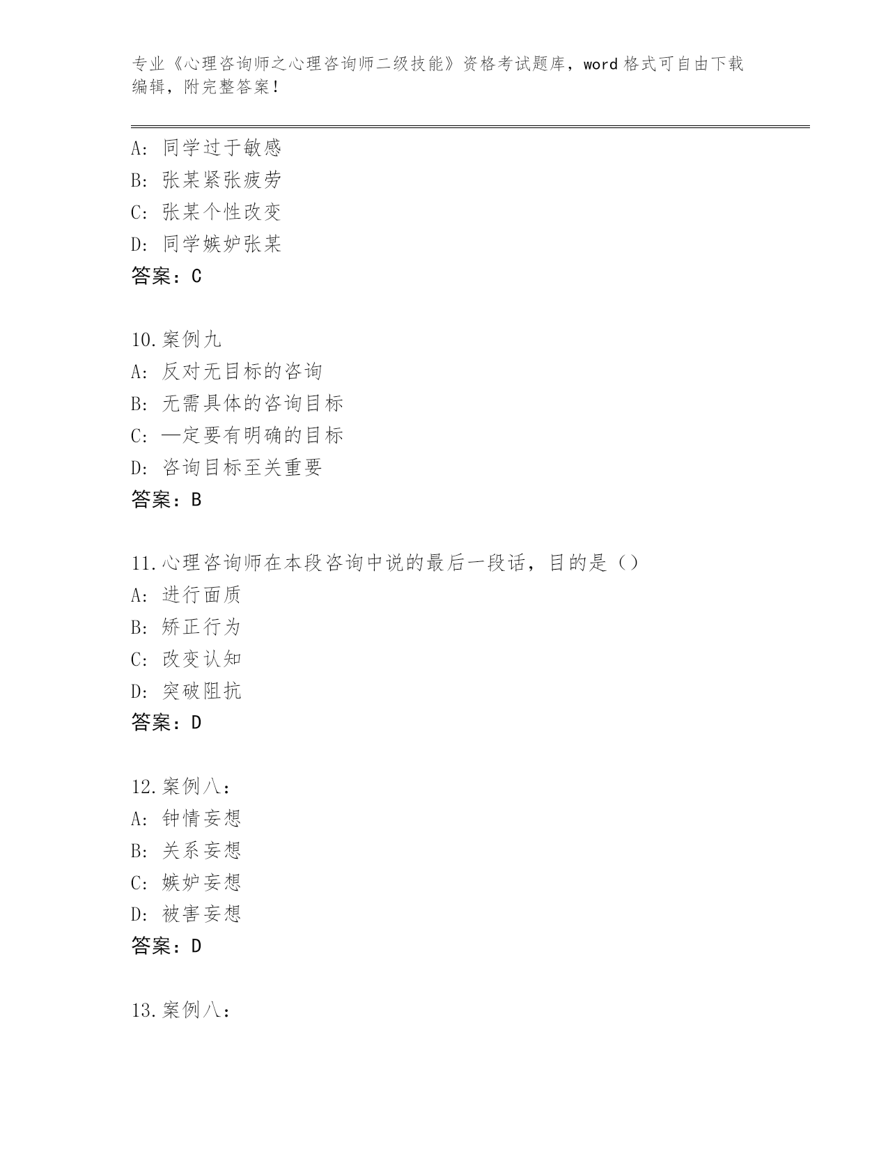 完整版河南省唐河县《心理咨询师之心理咨询师二级技能》资格考试必刷200题完整版带解析答案