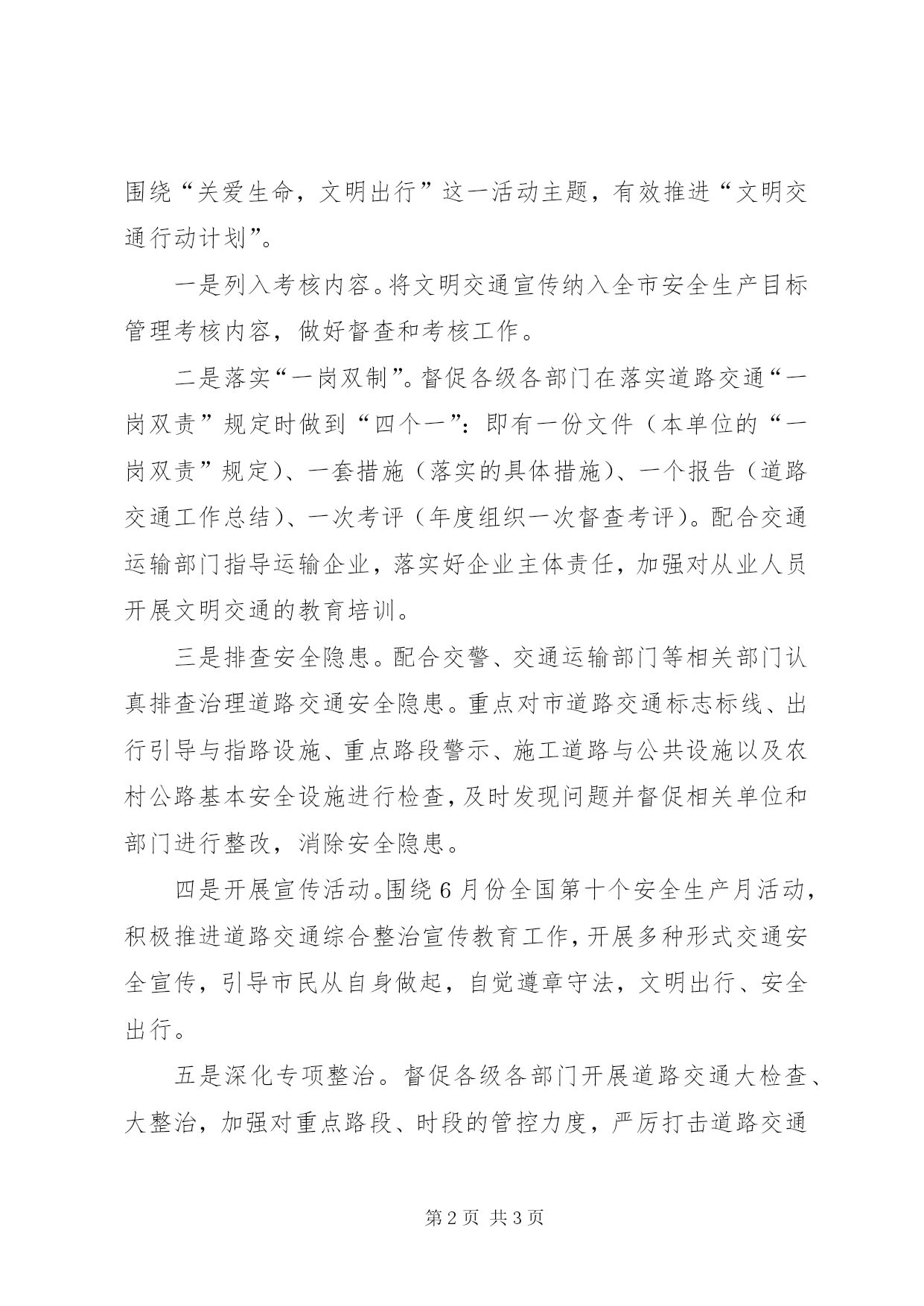 第PAGE\*Arabic\*MERGEFORMAT3页共NUMPAGES\*MERGEFORMAT3页安监部文明交通活动方案为深化“讲文明、树新风”活动,切实增强公民交通法治、安全和文明意识,着力纠正各类违反交通法规行为,创造良好道路通告环境,进一步提升全区公民文明素质和社会文明程序,根据《年区“文明交通行动计划”实施方案》要求,结合我局实际,特制订本方案。一、指导思想以邓小平理论和“三个代表”重要思想为指导,深入贯彻落实科学发展观,坚持以人为本,以努力提高公民文明交通素质为主线,以解决影响道路交通安全畅通的突出问题为切入点,以动员社会各界和人民群众共同参与为抓好,以“关爱生命、文明出行”为主题,大力开展文明交通活动,立足当前,着眼长远,科学精细管理,严格规范执法,为推进科学发展创造安全畅通、文明和谐的道路交通环境。二、工作目标力争通过生动有效、形式多样的宣传教育活动,使我市公民交通出行的法制意识、安全意识、文明意识明显增强,道路交通事故明显下降,道路交通执法更加规范,道路交通管理更加科学,道路交通秩序明显改善,文明交通长效机制进一步完善。三、工作内容发挥我局职能,从强化落实道路交通“一岗双责”规定入手,围绕“关爱生命,文明出行”这一活动主题,有效推进“文明交通行动计划”。一是列入考核内容。将文明交通宣传纳入全市安全生产目标管理考核内容,做好督查和考核工作。二是落实“一岗双制”。督促各级各部门在落实道路交通“一岗双责”规定时做到“四个一”:即有一份文件(本单位的“一岗双责”规定)、一套措施(落实的具体措施)、一个报告(道路交通工作总结)、一次考评(年度组织一次督查考评)。配合交通运输部门指导运输企业,落实好企业主体责任,加强对从业人员开展文明交通的教育培训。三是排查安全隐患。配合交警、交通运输部门等相关部门认真排查治理道路交通安全隐患。重点对市道路交通标志标线、出行引导与指路设施、重点路段警示、施工道路与公共设施以及农村公路基本安全设施进行检查,及时发现问题并督促相关单位和部门进行整改,消除安全隐患。四是开展宣传活动。围绕6月份全国第十个安全生产月活动,积极推进道路交通综合整治宣传教育工作,开展多种形式交通安全宣传,引导市民从自身做起,自觉遵章守法,文明出行、安全出行。五是深化专项整治。督促各级各部门开展道路交通大检查、大整治,加强对重点路段、时段的管控力度,严厉打击道路交通违法违规行为,努力减少各类道路交通事故的发生,确保道路交通安全形势稳定。六是加强内部管理。建立健全本系统内部安全管理制度,,加强对公务车辆和驾驶人员的管理,确保行车安全。七是实行问现制度。对文明交通宣传教育工作不落实的,发生较大道路交通事故的责任单位和个人实行例查制,进行责任追究。八是主动联系配合。主动与区文明办、公安局保持联系和沟通,及时上报“文明交通行动计划”进展情况及存在问题,加强督促,密切配合,确保行动计划有效落实。