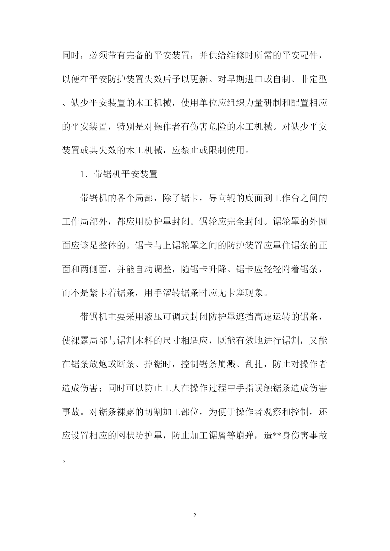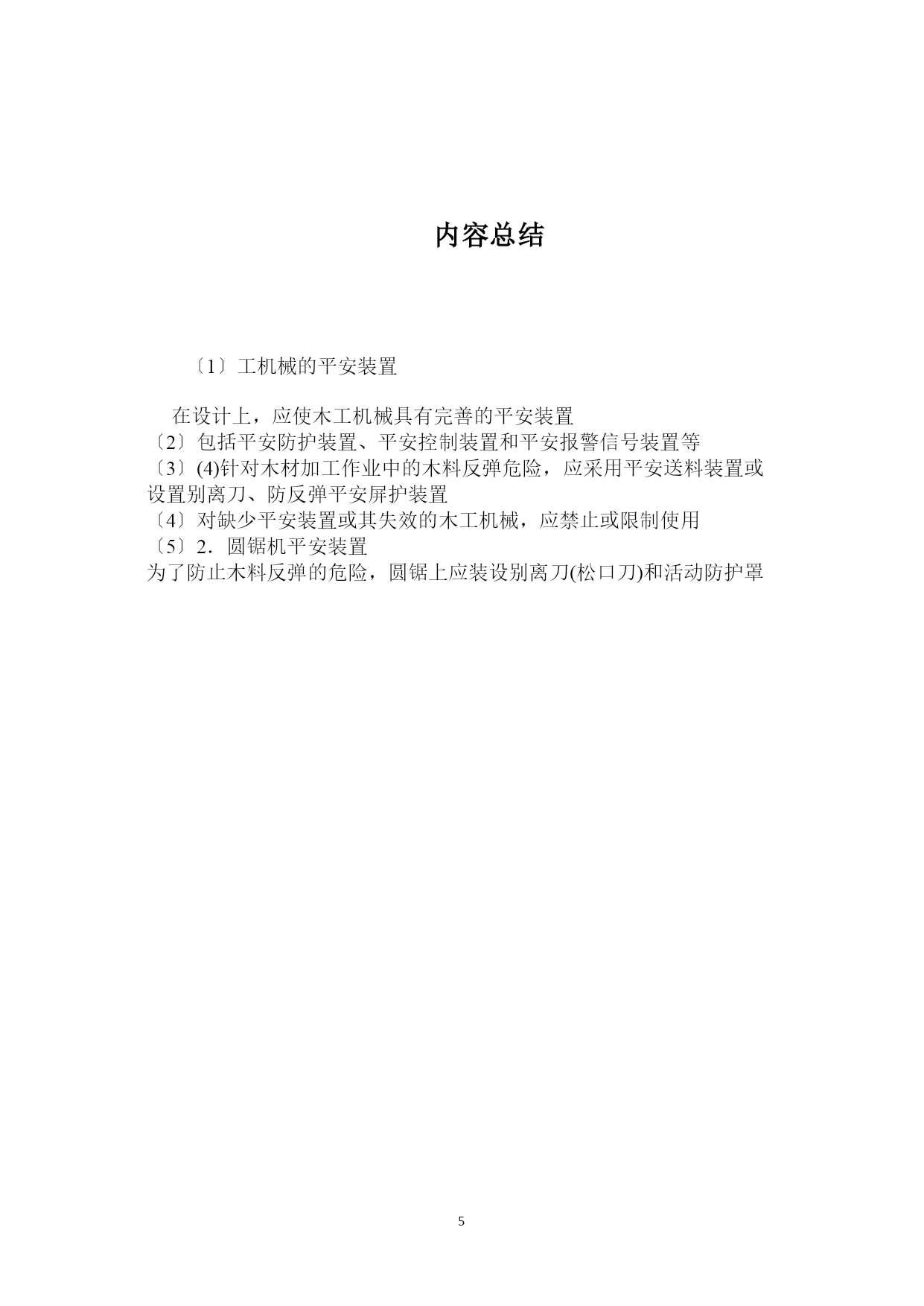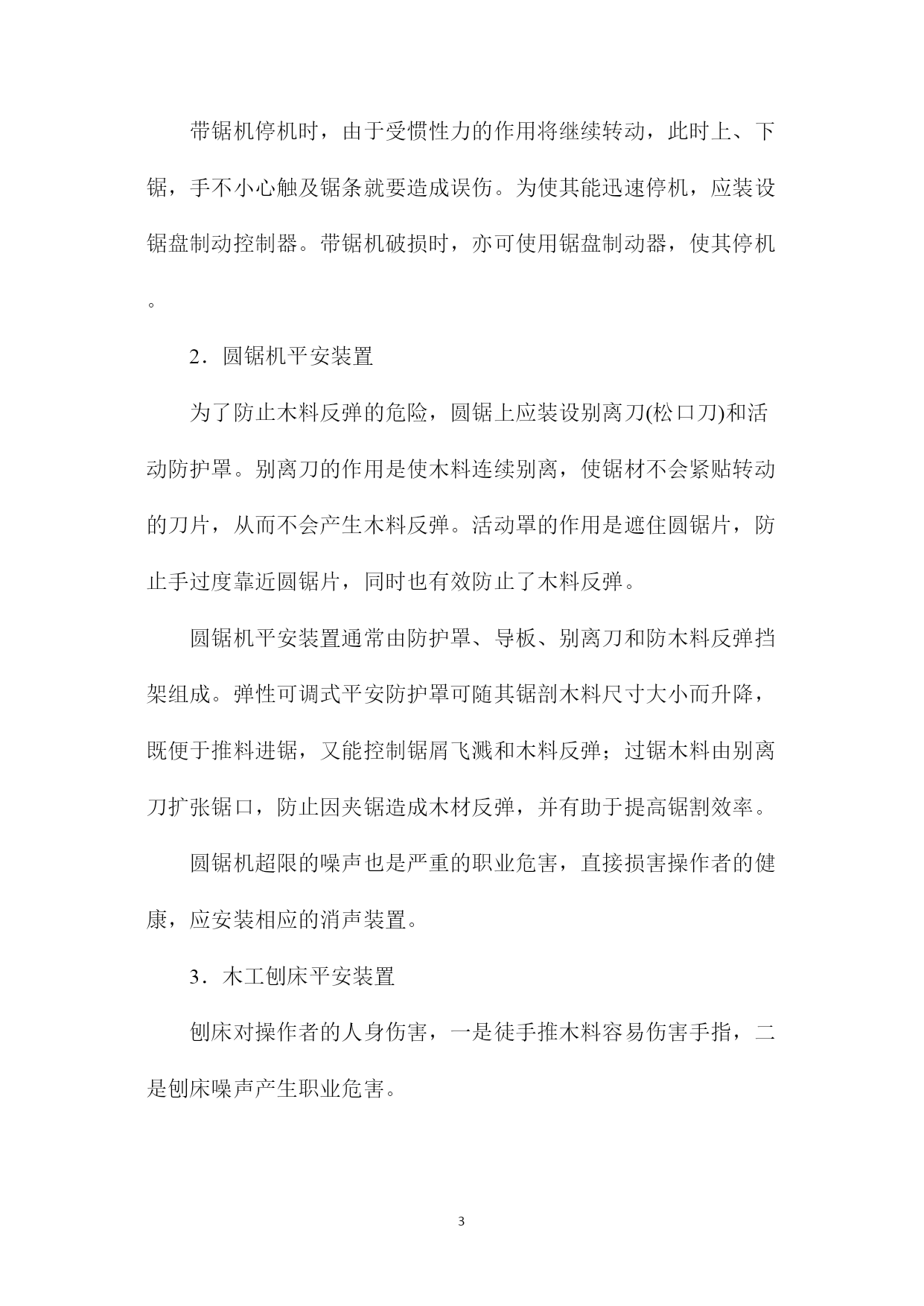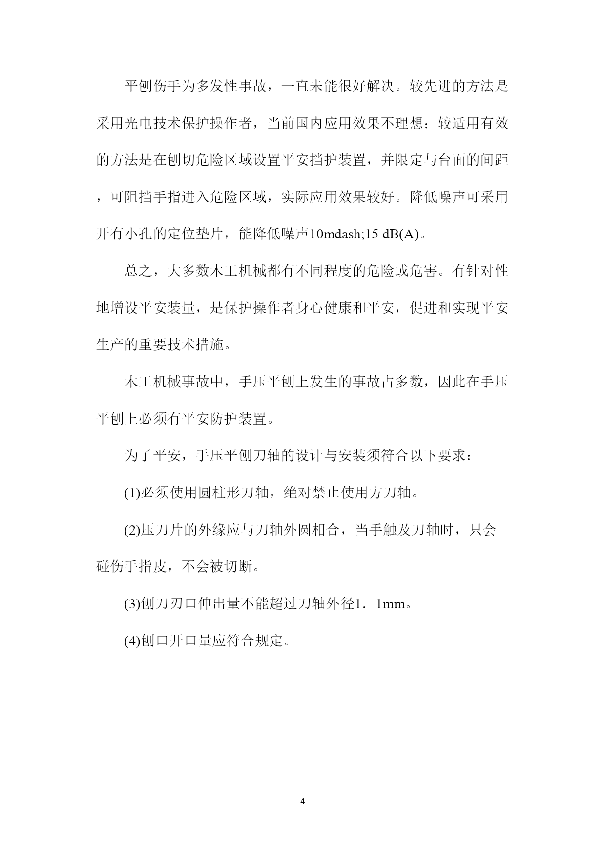 PAGEPAGE5工机械的平安装置在设计上,应使木工机械具有完善的平安装置。包括平安防护装置、平安控制装置和平安报警信号装置等。其平安技术要求:(1)按照有轮必有罩、有轴必有套和锯片有罩、锯条有套、刨(剪)切有挡的平安要求,以及平安器送料的平安要求,对各种木工机械配置相应的平安防护装置,徒手操作者必须有平安防护措施。(2)对生产噪声、木粉尘或挥发性有害气体的机械设备,应配置与其机械运转相连接的消声、吸尘或通风装置,以消除或减轻职业危害,维护职工的平安和健康。(3)木工机械的刀轴与电气应有平安联控装置,在装卸或更换刀具及维修时,能切断电源并保持断开位置,以防误触电源开关或突然供电启动机械而造**身伤害事故。(4)针对木材加工作业中的木料反弹危险,应采用平安送料装置或设置别离刀、防反弹平安屏护装置。以保障人身平安。(5)在装设正常启动和停机操纵装置的同时,还应专门设置遇事故需紧急停机的平安控制装置。按此要求,对各种木工机械应制定与其配套的平安装置技术标准。国产定型的木工机械,在供货的同时,必须带有完备的平安装置,并供给维修时所需的平安配件,以便在平安防护装置失效后予以更新。对早期进口或自制、非定型、缺少平安装置的木工机械,使用单位应组织力量研制和配置相应的平安装置,特别是对操作者有伤害危险的木工机械。对缺少平安装置或其失效的木工机械,应禁止或限制使用。1.带锯机平安装置带锯机的各个局部,除了锯卡,导向辊的底面到工作台之间的工作局部外,都应用防护罩封闭。锯轮应完全封闭。锯轮罩的外圆面应该是整体的。锯卡与上锯轮罩之间的防护装置应罩住锯条的正面和两侧面,并能自动调整,随锯卡升降。锯卡应轻轻附着锯条,而不是紧卡着锯条,用手溜转锯条时应无卡塞现象。带锯机主要采用液压可调式封闭防护罩遮挡高速运转的锯条,使裸露局部与锯割木料的尺寸相适应,既能有效地进行锯割,又能在锯条放炮或断条、掉锯时,控制锯条崩溅、乱扎,防止对操作者造成伤害;同时可以防止工人在操作过程中手指误触锯条造成伤害事故。对锯条裸露的切割加工部位,为便于操作者观察和控制,还应设置相应的网状防护罩,防止加工锯屑等崩弹,造**身伤害事故。带锯机停机时,由于受惯性力的作用将继续转动,此时上、下锯,手不小心触及锯条就要造成误伤。为使其能迅速停机,应装设锯盘制动控制器。带锯机破损时,亦可使用锯盘制动器,使其停机。2.圆锯机平安装置为了防止木料反弹的危险,圆锯上应装设别离刀(松口刀)和活动防护罩。别离刀的作用是使木料连续别离,使锯材不会紧贴转动的刀片,从而不会产生木料反弹。活动罩的作用是遮住圆锯片,防止手过度靠近圆锯片,同时也有效防止了木料反弹。圆锯机平安装置通常由防护罩、导板、别离刀和防木料反弹挡架组成。弹性可调式平安防护罩可随其锯剖木料尺寸大小而升降,既便于推料进锯,又能控制锯屑飞溅和木料反弹;过锯木料由别离刀扩张锯口,防止因夹锯造成木材反弹,并有助于提高锯割效率。圆锯机超限的噪声也是严重的职业危害,直接损害操作者的健康,应安装相应的消声装置。3.木工刨床平安装置刨床对操作者的人身伤害,一是徒手推木料容易伤害手指,二是刨床噪声产生职业危害。平刨伤手为多发性事故,一直未能很好解决。较先进的方法是采用光电技术保护操作者,当前国内应用效果不理想;较适用有效的方法是在刨切危险区域设置平安挡护装置,并限定与台面的间距,可阻挡手指进入危险区域,实际应用效果较好。降低噪声可采用开有小孔的定位垫片,能降低噪声10mdash;15dB(A)。总之,大多数木工机械都有不同程度的危险或危害。有针对性地增设平安装量,是保护操作者身心健康和平安,促进和实现平安生产的重要技术措施。木工机械事故中,手压平刨上发生的事故占多数,因此在手压平刨上必须有平安防护装置。为了平安,手压平刨刀轴的设计与安装须符合以下要求:(1)必须使用圆柱形刀轴,绝对禁止使用方刀轴。(2)压刀片的外缘应与刀轴外圆相合,当手触及刀轴时,只会碰伤手指皮,不会被切断。(3)刨刀刃口伸出量不能超过刀轴外径1.1mm。(4)刨口开口量应符合规定。内容总结〔1〕工机械的平安装置在设计上,应使木工机械具有完善的平安装置〔2〕包括平安防护装置、平安控制装置和平安报警信号装置等〔3〕(4)针对木材加工作业中的木料反弹危险,应采用平安送料装置或设置别离刀、防反弹平安屏护装置〔4〕对缺少平安装置或其失效的木工机械,应禁止或限制使用〔5〕2.圆锯机平安装置为了防止木料反弹的危险,圆锯上应装设别离刀(松口刀)和活动防护罩