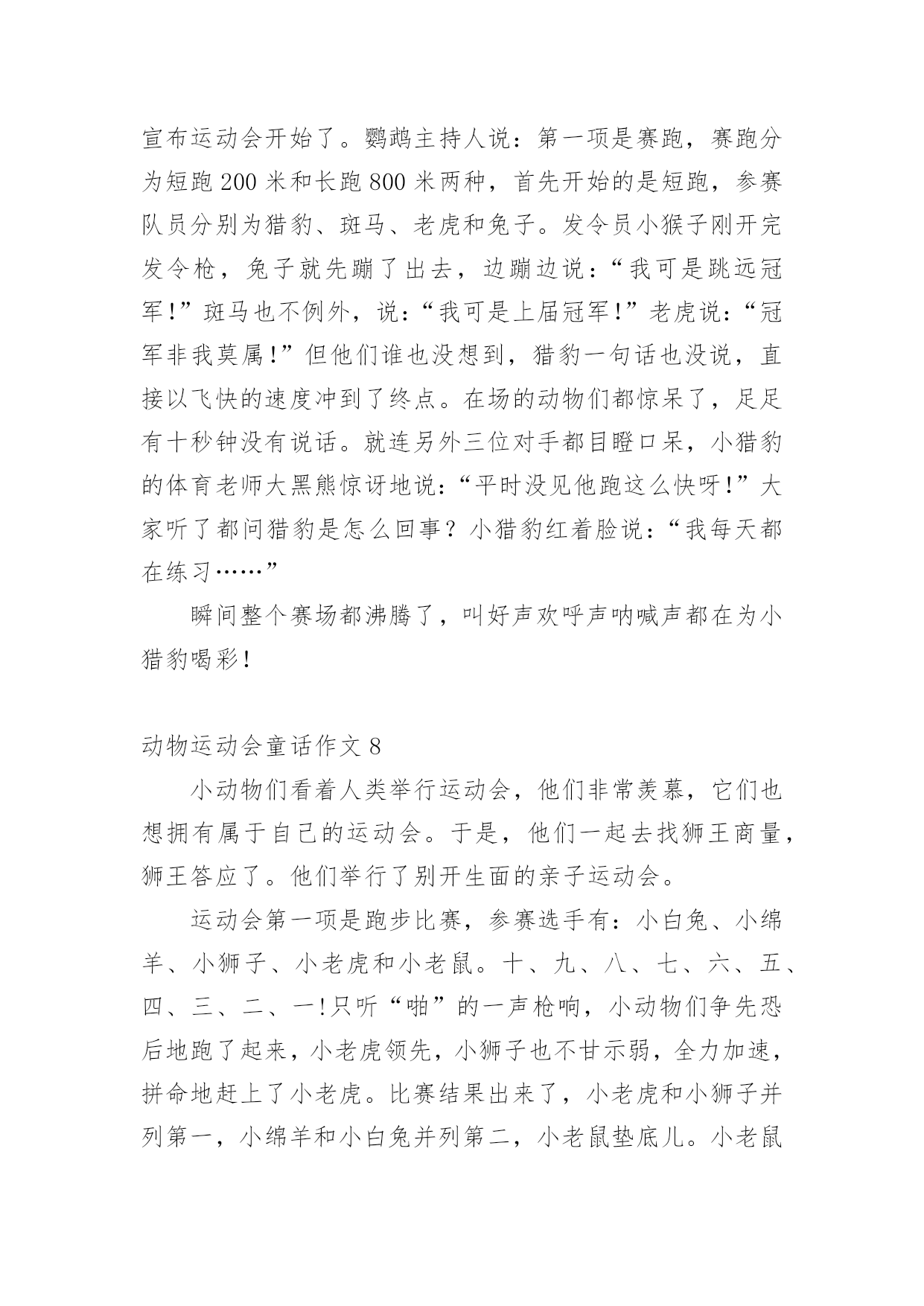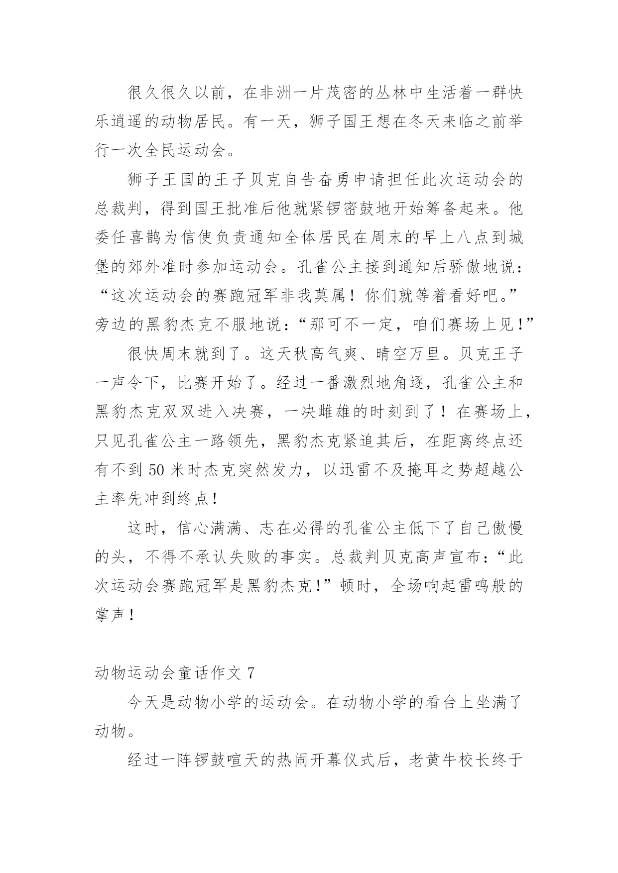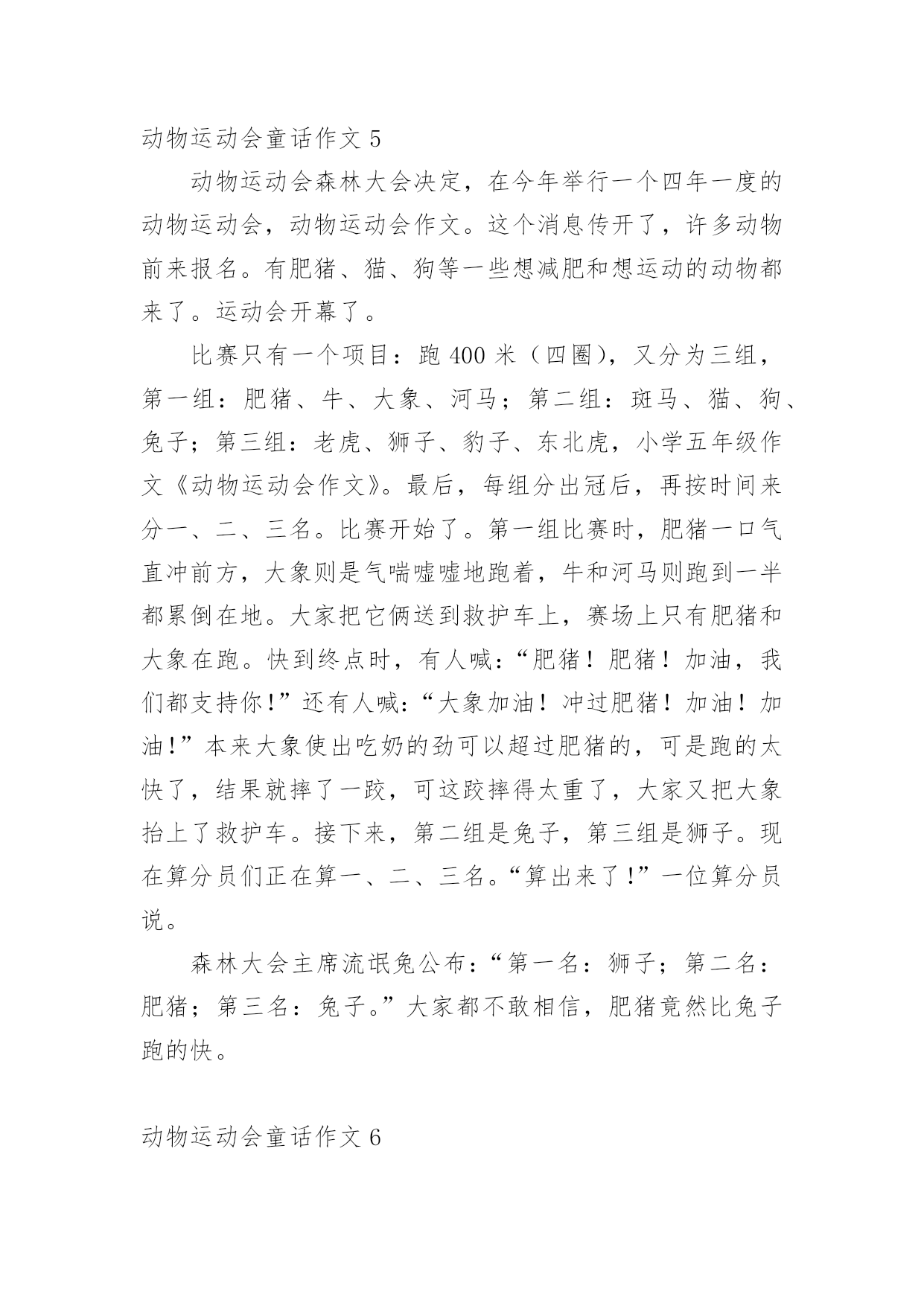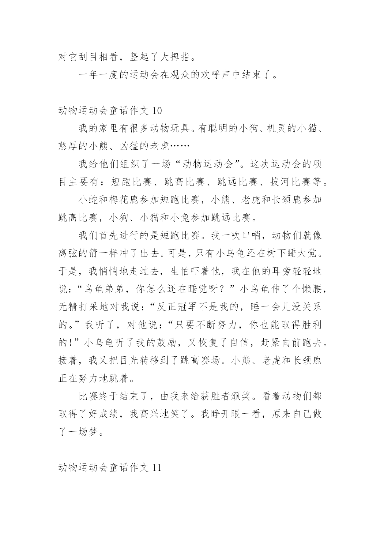 动物运动会童话作文动物运动会童话作文合集15篇在平时的学习、工作或生活中,大家总少不了接触作文吧,通过作文可以把我们那些零零散散的思想,聚集在一块。那么问题来了,到底应如何写一篇优秀的作文呢?下面是小编精心整理的动物运动会童话作文,希望能够帮助到大家。动物运动会童话作文1有一天,虎王组织了一次“动物运动会”,有很多动物都参加了。猎豹、小鹿、小兔参加了五千米长跑比赛;小青蛙、小松鼠参加了跳远比赛;小猴子、袋鼠参加了跳高比赛;鳄鱼、企鹅参加了五十米游泳比赛;大猩猩、大象参加了举重比赛……五千米长跑开始了。发令枪一响,运动员就如闪电般的速度冲过去,观众们在一旁高喊“加油”。小兔像一股白色的电流向前冲去,猎豹像被染黄的小鸟飞去,小鹿像一只美丽的孔雀般飞向终点。不一会儿,他们就跑到了终点。豹子用的时间是十分零七秒,小鹿用了十分一十四秒,小免用了十分一十九秒。豹子获胜了。跳远比赛也开始了。小青蛙后脚用力一蹬,就跳得老远了。小松鼠用大尾巴和两只脚使劲一跳,也跳出了老远,观众的眼都看花了。松鼠的成绩是一米三七,小青蛙是一米五四。小青蛙获胜了。跳高比赛的场地上,运动员们个个精神焕发。只见选手跑了几米以后,向上一跃,轻轻地跨过杆子,落在软绵绵的厚毯子上,他们的动作都很标准、很熟练。河马叔叔给猴子评了十分,给袋鼠评了个九分。运动会的场面真热闹啊!动物运动会童话作文2“各位请注意,一年一度的动物运动会即将开始,运动员们准备一下。”广播里传来百灵鸟清脆悦耳的声音,动物们听到广播,纷纷地从四面八方赶来,参赛场地一下子沸腾起来。参赛者们信心十足,大摇大摆的走了出来,拉拉队开始欢呼,呐喊。第一个项目是短跑,参赛者有:老虎先生,美洲豹先生,梅花鹿小姐,它们都是跑步的佼佼者。它们在起跑线上做热身,舒展筋骨。裁判员向天空开了一枪,动物们像离弦之箭一样,跑向终点,你追我赶,毫不相让,结果梅花鹿赢得了比赛。第二项举重比赛开始了。这时,传来一阵喧闹声,大家惊讶地发现,参赛者除了力大无穷的猩猩,强壮的大象,让人难以置信的是,还有一只渺小的蚂蚁。大家看见蚂蚁,都嘲笑它,这么不自量力。后来裁判员宣布规则:“要举起比自己重两倍的东西才算赢。”猩猩和大象变得面如土色。比赛开始了,大象和猩猩使出吃奶的劲,可是东西却纹丝不动。蚂蚁轻而易举的把,比自己重两倍的东西举起来了。观众们发出了惊叹声,对蚂蚁刮目相看。今年的运动会真精彩。动物运动会童话作文3一年一度的动物运动会就要开始了,动物们都在紧张地准备当中。“砰”的一声,动物运动会开始了。老虎宣布;“第一项,100米跑步,参赛者:小兔灰灰、小兔亮亮、狮子欢欢和熊猫晶晶。各就个位,三二一,开始。”小兔亮亮首先冲了出去,小兔灰灰紧跟其后,熊猫晶晶和狮子欢欢不分上下。大家你超我,我超你。观众们的心都很紧张,不知道谁会赢。就在这时,狮子欢欢被一块小石头给绊倒了,落在了后面,熊猫晶晶把握时机,超过了小兔灰灰,“砰”比赛结束了,小兔亮亮以一分三十二秒赢得了比赛。小松鼠为亮亮戴上奖牌,还送她一束鲜花,观众立刻发出欢呼声,亮亮热泪盈眶,不停地对大家说;“谢谢,谢谢。”跑步比赛刚刚结束,下一项游泳比赛就开始了。燕鱼、小虾强强、螃蟹历历和海龟幻幻都参加了比赛。“砰”比赛开始了,强强首先冲了出去,它居然把那四个老将都超了,没有给它们任何机会。以一分二十秒赢得了游泳二百米比赛。这让大家很吃惊,原来它可是年年都得最后一名,今年却得了第一名,大家都很佩服它,用热烈的掌声恭喜它,它兴奋得蹦了起来。动物运动会还有许多项目:跳远、跳高、接力赛跑等,动物运动会就在掌声中结束了。动物运动会童话作文4春季动物运动会开始了,动物们纷纷跑去参加。运动会开始了,首先是兔子和乌龟赛跑,由大象做裁判。兔子神气地走上赛场,它对乌龟说:“今天我不会在树下睡觉了,一定会赢了你。”乌龟说:“那咱们就走着瞧。”开始跑步了,兔子像一支离弦的箭一样跑了过去,乌龟还在慢吞吞地跑着,落在了后面,这次兔子赢得了奖杯。可是乌龟还在坚持不懈地跑着。大猩猩参加的是举重比赛,只见它昂首挺胸地走上台,双手用力捶打着自己的胸脯,自豪地看着台下的每一位观众。比赛正式开始了,大猩猩猛吸一口气,双手就把杠铃抬了起来,还坚持了一分钟才放下。最后一个项目是大象和小熊进行拔河比赛。开始比赛了,小熊用力地把绳子拉到了自己这边。大象尽管已经累得精疲力竭,脸色发红,但它还是坚持不懈地拉着,最后,大象获得了胜利,赢得了台下动物们的欢呼声。运动会结束了,森林终于恢复了平静。大家玩得非常高兴,都期待着下次运动会的到来。动物运动会童话作文5动物运动会森林大会决定,在今年举行一个四年一度的动物运动会,动物运动会作文。这个消息传开了,许多动物前来报名。有肥猪、猫、狗等一些想减肥和想运动的动物都来了。运动会开幕了。比赛只有一个项目:跑400米(四