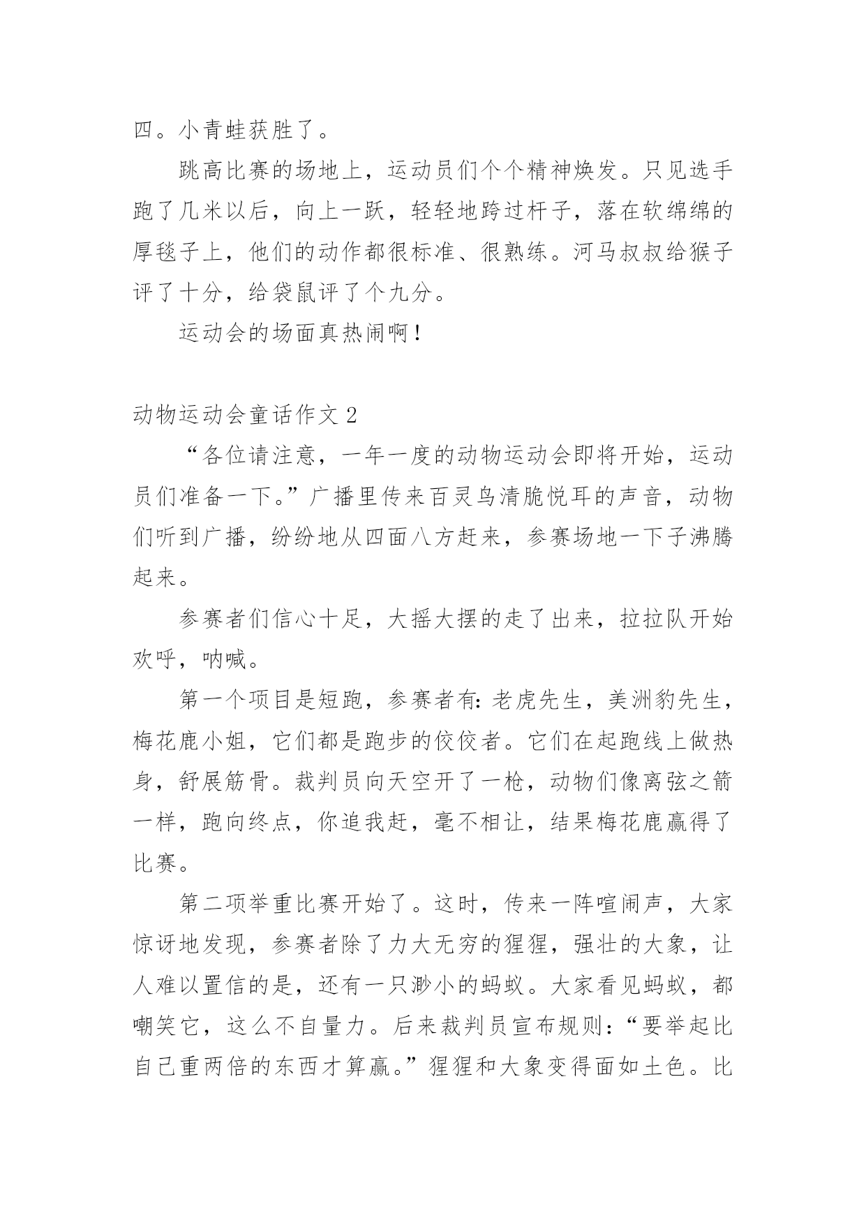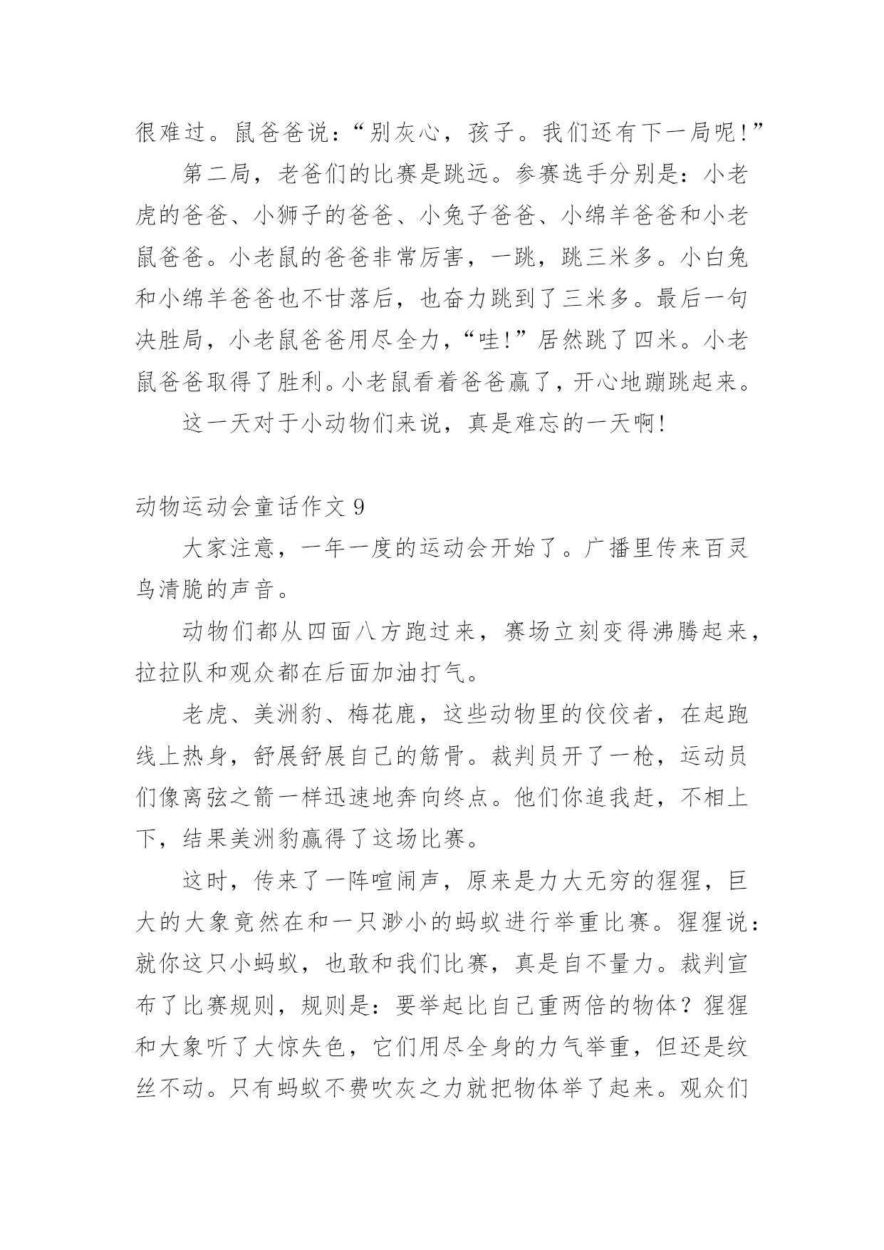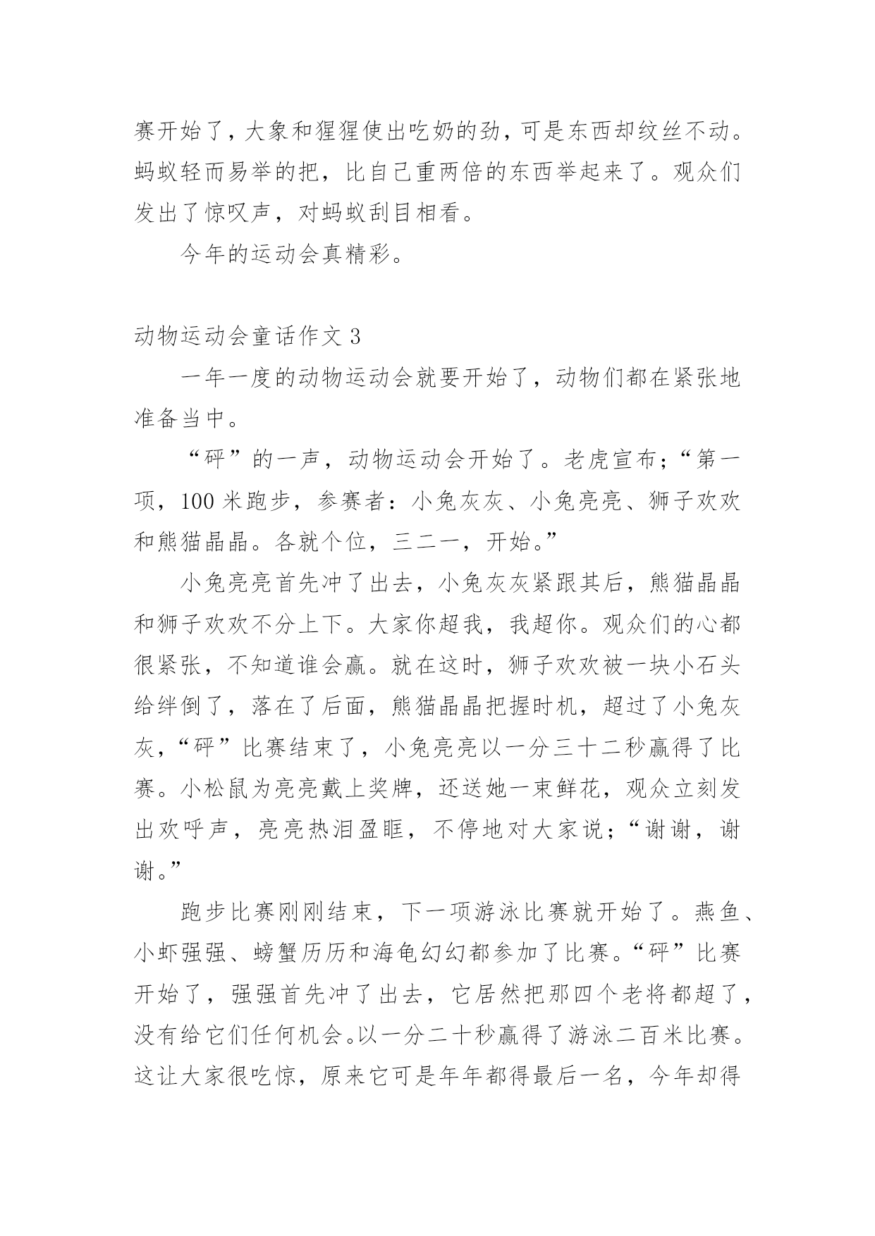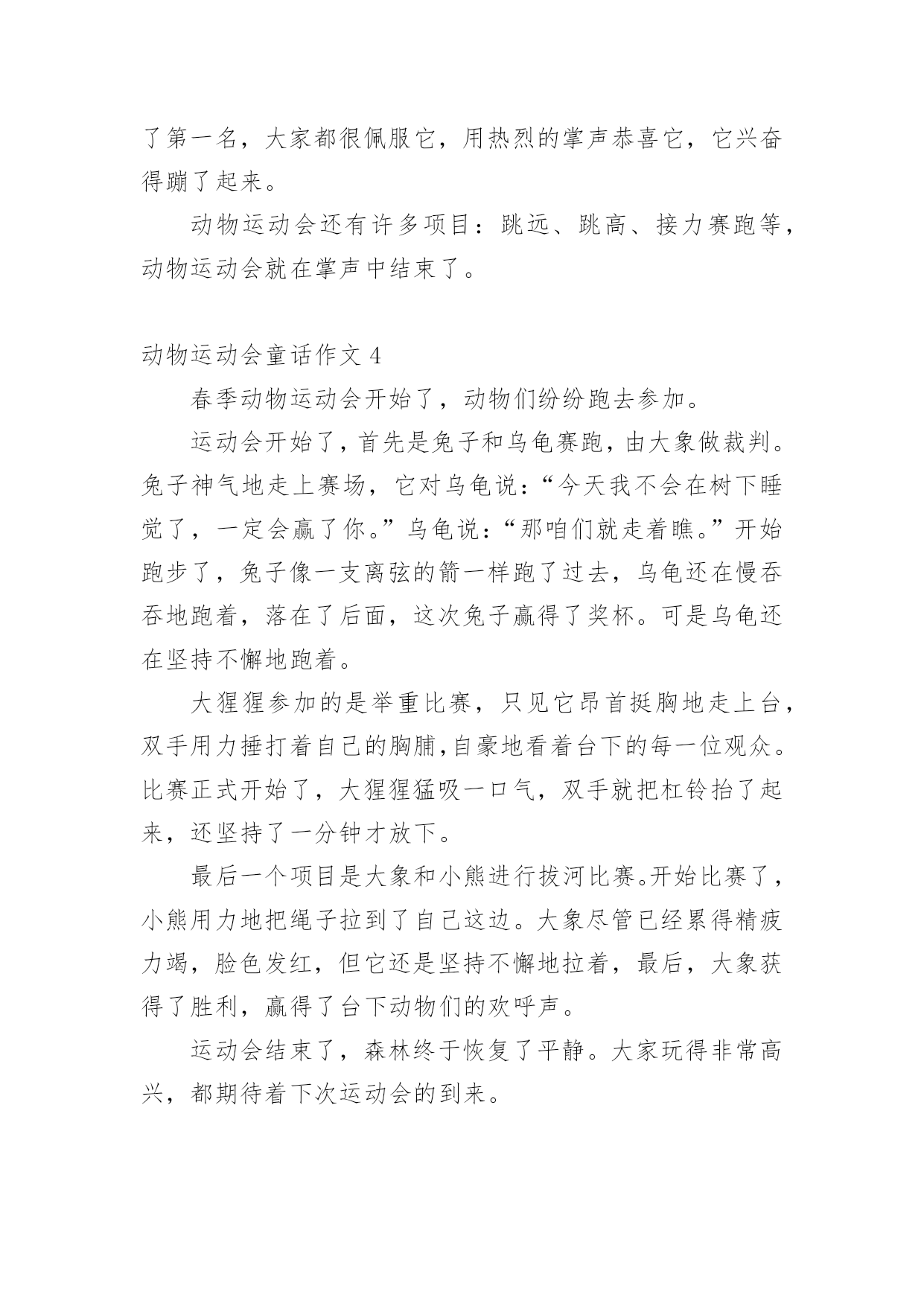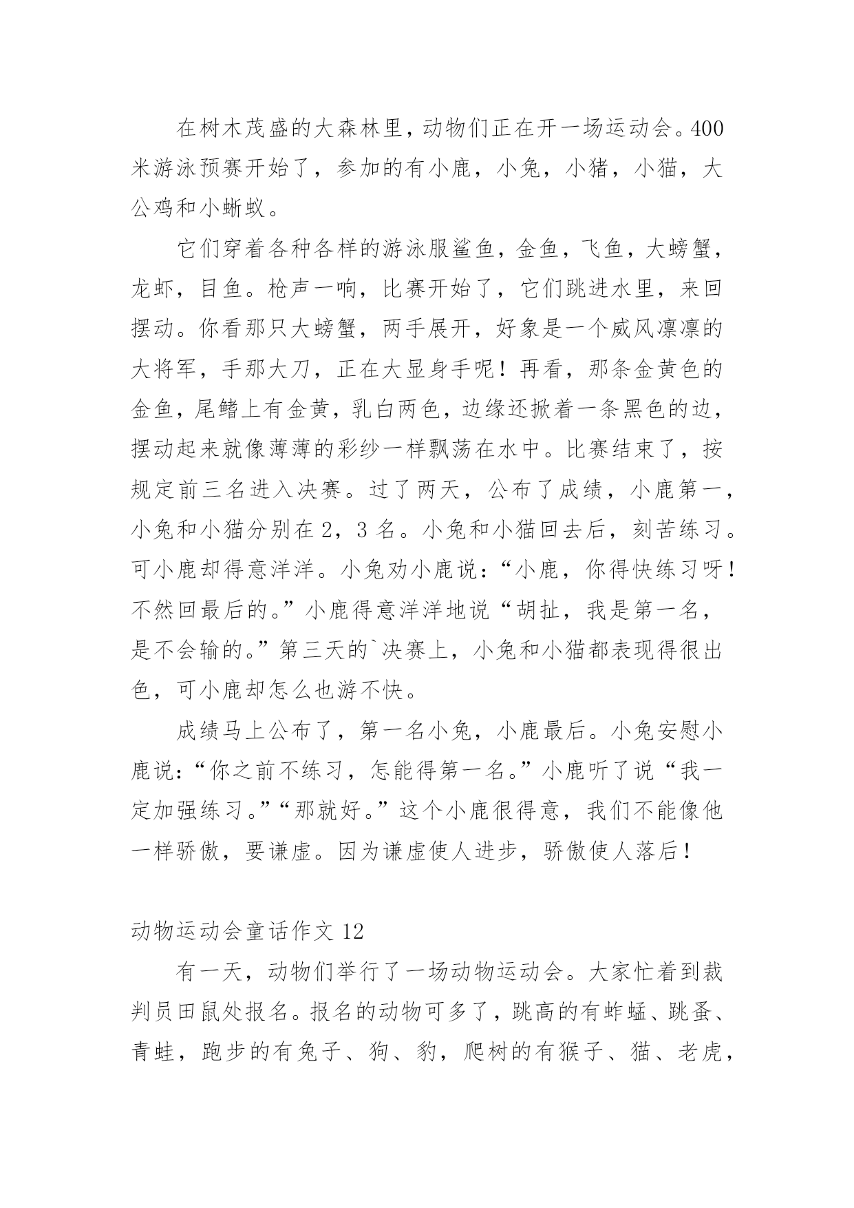 动物运动会童话作文动物运动会童话作文合集15篇在平时的学习、工作或生活中,大家总少不了接触作文吧,通过作文可以把我们那些零零散散的思想,聚集在一块。那么问题来了,到底应如何写一篇优秀的作文呢?下面是小编精心整理的动物运动会童话作文,希望能够帮助到大家。动物运动会童话作文1有一天,虎王组织了一次“动物运动会”,有很多动物都参加了。猎豹、小鹿、小兔参加了五千米长跑比赛;小青蛙、小松鼠参加了跳远比赛;小猴子、袋鼠参加了跳高比赛;鳄鱼、企鹅参加了五十米游泳比赛;大猩猩、大象参加了举重比赛……五千米长跑开始了。发令枪一响,运动员就如闪电般的速度冲过去,观众们在一旁高喊“加油”。小兔像一股白色的电流向前冲去,猎豹像被染黄的小鸟飞去,小鹿像一只美丽的孔雀般飞向终点。不一会儿,他们就跑到了终点。豹子用的时间是十分零七秒,小鹿用了十分一十四秒,小免用了十分一十九秒。豹子获胜了。跳远比赛也开始了。小青蛙后脚用力一蹬,就跳得老远了。小松鼠用大尾巴和两只脚使劲一跳,也跳出了老远,观众的眼都看花了。松鼠的成绩是一米三七,小青蛙是一米五四。小青蛙获胜了。跳高比赛的场地上,运动员们个个精神焕发。只见选手跑了几米以后,向上一跃,轻轻地跨过杆子,落在软绵绵的厚毯子上,他们的动作都很标准、很熟练。河马叔叔给猴子评了十分,给袋鼠评了个九分。运动会的场面真热闹啊!动物运动会童话作文2“各位请注意,一年一度的动物运动会即将开始,运动员们准备一下。”广播里传来百灵鸟清脆悦耳的声音,动物们听到广播,纷纷地从四面八方赶来,参赛场地一下子沸腾起来。参赛者们信心十足,大摇大摆的走了出来,拉拉队开始欢呼,呐喊。第一个项目是短跑,参赛者有:老虎先生,美洲豹先生,梅花鹿小姐,它们都是跑步的佼佼者。它们在起跑线上做热身,舒展筋骨。裁判员向天空开了一枪,动物们像离弦之箭一样,跑向终点,你追我赶,毫不相让,结果梅花鹿赢得了比赛。第二项举重比赛开始了。这时,传来一阵喧闹声,大家惊讶地发现,参赛者除了力大无穷的猩猩,强壮的大象,让人难以置信的是,还有一只渺小的蚂蚁。大家看见蚂蚁,都嘲笑它,这么不自量力。后来裁判员宣布规则:“要举起比自己重两倍的东西才算赢。”猩猩和大象变得面如土色。比赛开始了,大象和猩猩使出吃奶的劲,可是东西却纹丝不动。蚂蚁轻而易举的把,比自己重两倍的东西举起来了。观众们发出了惊叹声,对蚂蚁刮目相看。今年的运动会真精彩。动物运动会童话作文3一年一度的动物运动会就要开始了,动物们都在紧张地准备当中。“砰”的一声,动物运动会开始了。老虎宣布;“第一项,100米跑步,参赛者:小兔灰灰、小兔亮亮、狮子欢欢和熊猫晶晶。各就个位,三二一,开始。”小兔亮亮首先冲了出去,小兔灰灰紧跟其后,熊猫晶晶和狮子欢欢不分上下。大家你超我,我超你。观众们的心都很紧张,不知道谁会赢。就在这时,狮子欢欢被一块小石头给绊倒了,落在了后面,熊猫晶晶把握时机,超过了小兔灰灰,“砰”比赛结束了,小兔亮亮以一分三十二秒赢得了比赛。小松鼠为亮亮戴上奖牌,还送她一束鲜花,观众立刻发出欢呼声,亮亮热泪盈眶,不停地对大家说;“谢谢,谢谢。”跑步比赛刚刚结束,下一项游泳比赛就开始了。燕鱼、小虾强强、螃蟹历历和海龟幻幻都参加了比赛。“砰”比赛开始了,强强首先冲了出去,它居然把那四个老将都超了,没有给它们任何机会。以一分二十秒赢得了游泳二百米比赛。这让大家很吃惊,原来它可是年年都得最后一名,今年却得了第一名,大家都很佩服它,用热烈的掌声恭喜它,它兴奋得蹦了起来。动物运动会还有许多项目:跳远、跳高、接力赛跑等,动物运动会就在掌声中结束了。动物运动会童话作文4春季动物运动会开始了,动物们纷纷跑去参加。运动会开始了,首先是兔子和乌龟赛跑,由大象做裁判。兔子神气地走上赛场,它对乌龟说:“今天我不会在树下睡觉了,一定会赢了你。”乌龟说:“那咱们就走着瞧。”开始跑步了,兔子像一支离弦的箭一样跑了过去,乌龟还在慢吞吞地跑着,落在了后面,这次兔子赢得了奖杯。可是乌龟还在坚持不懈地跑着。大猩猩参加的是举重比赛,只见它昂首挺胸地走上台,双手用力捶打着自己的胸脯,自豪地看着台下的每一位观众。比赛正式开始了,大猩猩猛吸一口气,双手就把杠铃抬了起来,还坚持了一分钟才放下。最后一个项目是大象和小熊进行拔河比赛。开始比赛了,小熊用力地把绳子拉到了自己这边。大象尽管已经累得精疲力竭,脸色发红,但它还是坚持不懈地拉着,最后,大象获得了胜利,赢得了台下动物们的欢呼声。运动会结束了,森林终于恢复了平静。大家玩得非常高兴,都期待着下次运动会的到来。动物运动会童话作文5动物运动会森林大会决定,在今年举行一个四年一度的动物运动会,动物运动会作文。这个消息传开了,许多动物前来报名。有肥猪、猫、狗等一些想减肥和想运动的动物都来了。运动会开幕了。比赛只有一个项目:跑400米(四