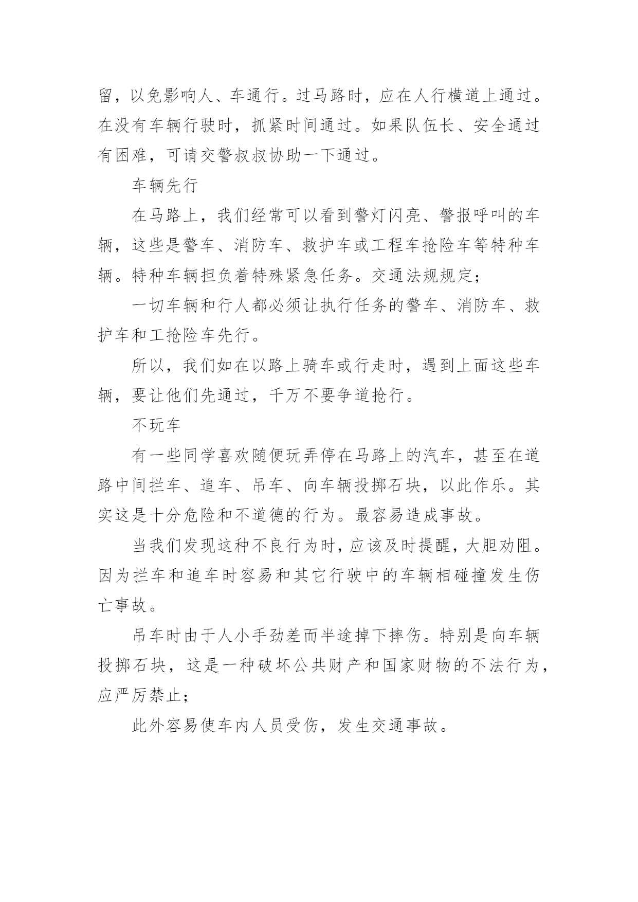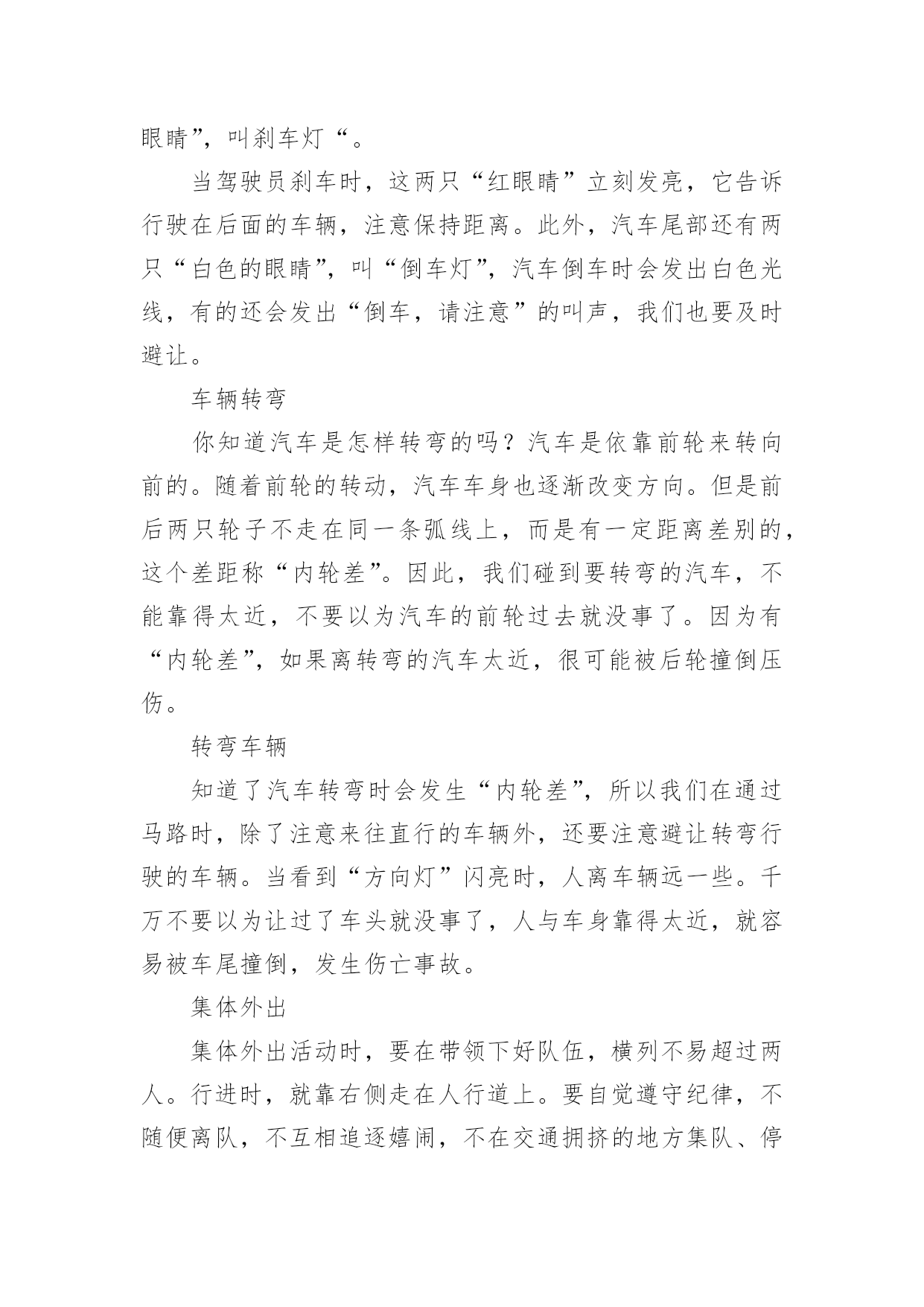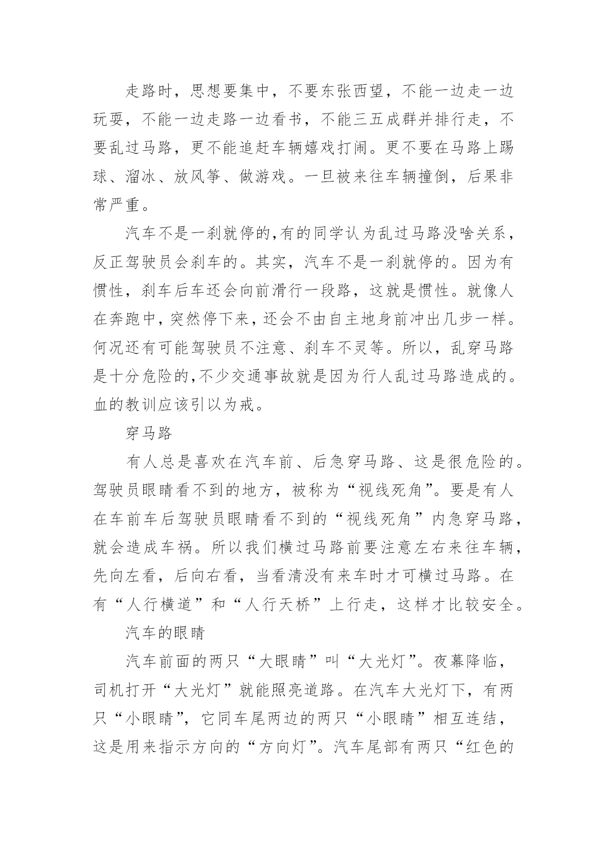 全国交通安全反思日的由来在办理事务和工作生活中,课堂教学是重要的任务之一,反思过往之事,活在当下之时。反思要怎么写呢?以下是小编整理的全国交通安全反思日的由来,欢迎阅读,希望大家能够喜欢。节日介绍:为唤起人们关注交通事故正在夺去大量生命这一事实,中国把每年的4月30日定为全国交通安全反思日。希望有更多的市民来关注交通安全,以往的行路驾车的陋习,认真审视并改正不文明的交通习惯,把宝贵生命从无情的车祸中解救出来,尊重人的生存价值和生存权利。对于那些漠视自己生命和漠视他人生命,对国家、对社会、对受害人家庭造成不可挽回损失的做法,无论赔偿多少钱也终究无法挽回最宝贵生命,同时也给以人为本的和谐社会投下了阴影,这样的事情是永远无法原谅的。交通安全知识安全走路走路,谁不会呢?其实不然。如果我们不注意交通安全,走路也闯祸。因此,上学读书、放学回家、节假日外出时,走在人来车往的交通繁忙的道路上,要遵守交通规则,增强自我保护意识。我们走路要走在人行道上。在没有人行道的地方,应靠道路右边行走。走路时,思想要集中,不要东张西望,不能一边走一边玩耍,不能一边走路一边看书,不能三五成群并排行走,不要乱过马路,更不能追赶车辆嬉戏打闹。更不要在马路上踢球、溜冰、放风筝、做游戏。一旦被来往车辆撞倒,后果非常严重。汽车不是一刹就停的,有的同学认为乱过马路没啥关系,反正驾驶员会刹车的。其实,汽车不是一刹就停的。因为有惯性,刹车后车还会向前滑行一段路,这就是惯性。就像人在奔跑中,突然停下来,还会不由自主地身前冲出几步一样。何况还有可能驾驶员不注意、刹车不灵等。所以,乱穿马路是十分危险的,不少交通事故就是因为行人乱过马路造成的。血的教训应该引以为戒。穿马路有人总是喜欢在汽车前、后急穿马路、这是很危险的。驾驶员眼睛看不到的地方,被称为“视线死角”。要是有人在车前车后驾驶员眼睛看不到的“视线死角”内急穿马路,就会造成车祸。所以我们横过马路前要注意左右来往车辆,先向左看,后向右看,当看清没有来车时才可横过马路。在有“人行横道”和“人行天桥”上行走,这样才比较安全。汽车的眼睛汽车前面的两只“大眼睛”叫“大光灯”。夜幕降临,司机打开“大光灯”就能照亮道路。在汽车大光灯下,有两只“小眼睛”,它同车尾两边的两只“小眼睛”相互连结,这是用来指示方向的“方向灯”。汽车尾部有两只“红色的眼睛”,叫刹车灯“。当驾驶员刹车时,这两只“红眼睛”立刻发亮,它告诉行驶在后面的车辆,注意保持距离。此外,汽车尾部还有两只“白色的眼睛”,叫“倒车灯”,汽车倒车时会发出白色光线,有的还会发出“倒车,请注意”的叫声,我们也要及时避让。车辆转弯你知道汽车是怎样转弯的吗?汽车是依靠前轮来转向前的。随着前轮的转动,汽车车身也逐渐改变方向。但是前后两只轮子不走在同一条弧线上,而是有一定距离差别的,这个差距称“内轮差”。因此,我们碰到要转弯的汽车,不能靠得太近,不要以为汽车的前轮过去就没事了。因为有“内轮差”,如果离转弯的汽车太近,很可能被后轮撞倒压伤。转弯车辆知道了汽车转弯时会发生“内轮差”,所以我们在通过马路时,除了注意来往直行的车辆外,还要注意避让转弯行驶的车辆。当看到“方向灯”闪亮时,人离车辆远一些。千万不要以为让过了车头就没事了,人与车身靠得太近,就容易被车尾撞倒,发生伤亡事故。集体外出集体外出活动时,要在带领下好队伍,横列不易超过两人。行进时,就靠右侧走在人行道上。要自觉遵守纪律,不随便离队,不互相追逐嬉闹,不在交通拥挤的地方集队、停留,以免影响人、车通行。过马路时,应在人行横道上通过。在没有车辆行驶时,抓紧时间通过。如果队伍长、安全通过有困难,可请交警叔叔协助一下通过。车辆先行在马路上,我们经常可以看到警灯闪亮、警报呼叫的车辆,这些是警车、消防车、救护车或工程车抢险车等特种车辆。特种车辆担负着特殊紧急任务。交通法规规定;一切车辆和行人都必须让执行任务的警车、消防车、救护车和工抢险车先行。所以,我们如在以路上骑车或行走时,遇到上面这些车辆,要让他们先通过,千万不要争道抢行。不玩车有一些同学喜欢随便玩弄停在马路上的汽车,甚至在道路中间拦车、追车、吊车、向车辆投掷石块,以此作乐。其实这是十分危险和不道德的行为。最容易造成事故。当我们发现这种不良行为时,应该及时提醒,大胆劝阻。因为拦车和追车时容易和其它行驶中的车辆相碰撞发生伤亡事故。吊车时由于人小手劲差而半途掉下摔伤。特别是向车辆投掷石块,这是一种破坏公共财产和国家财物的不法行为,应严厉禁止;此外容易使车内人员受伤,发生交通事故。