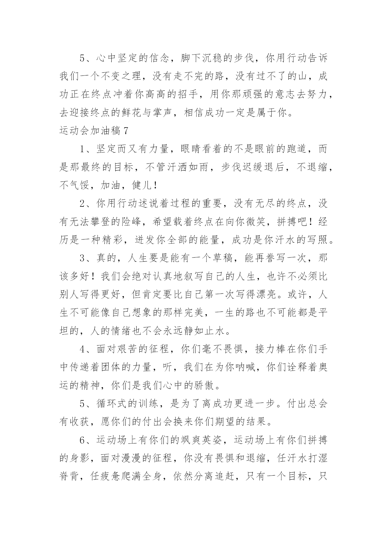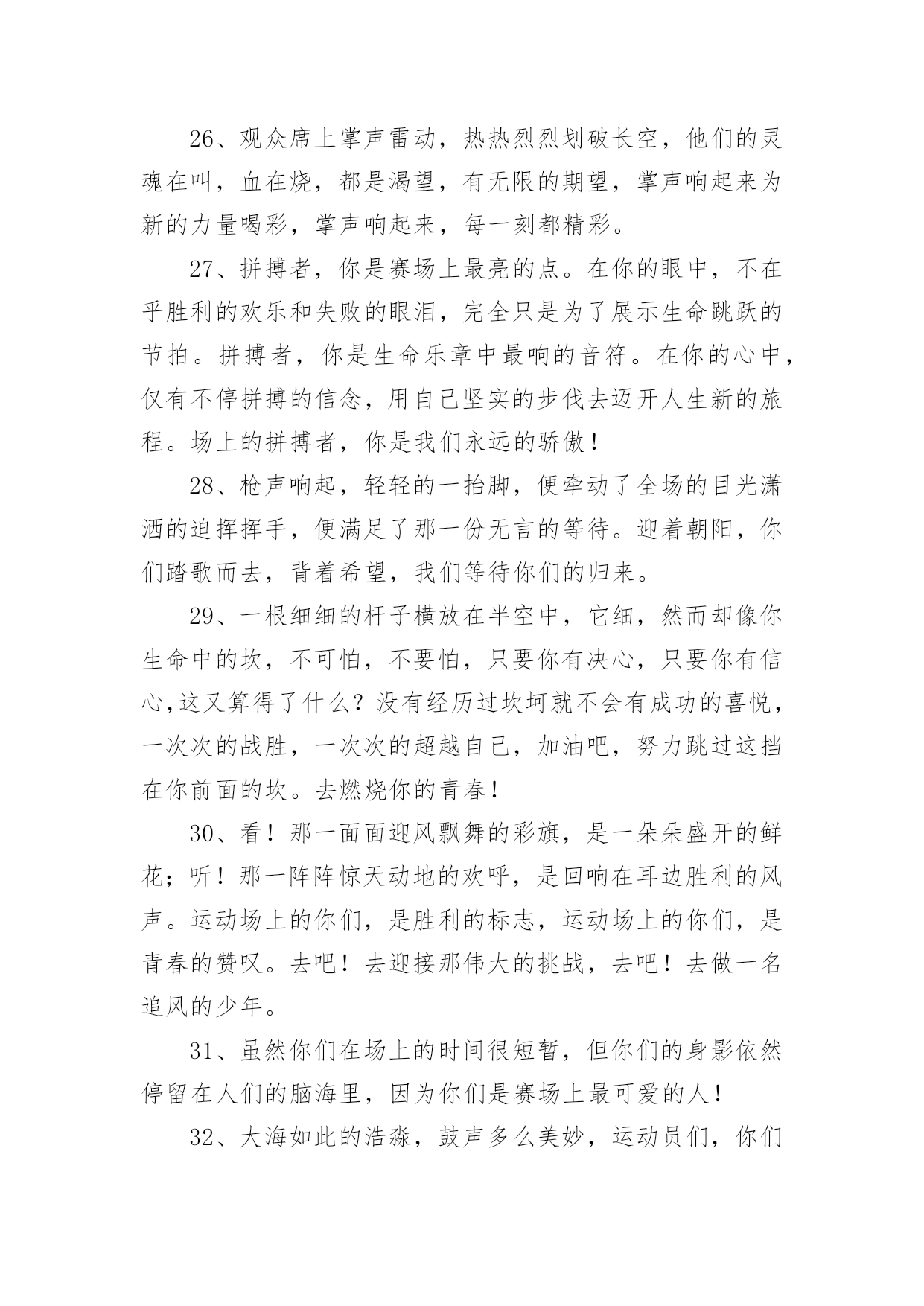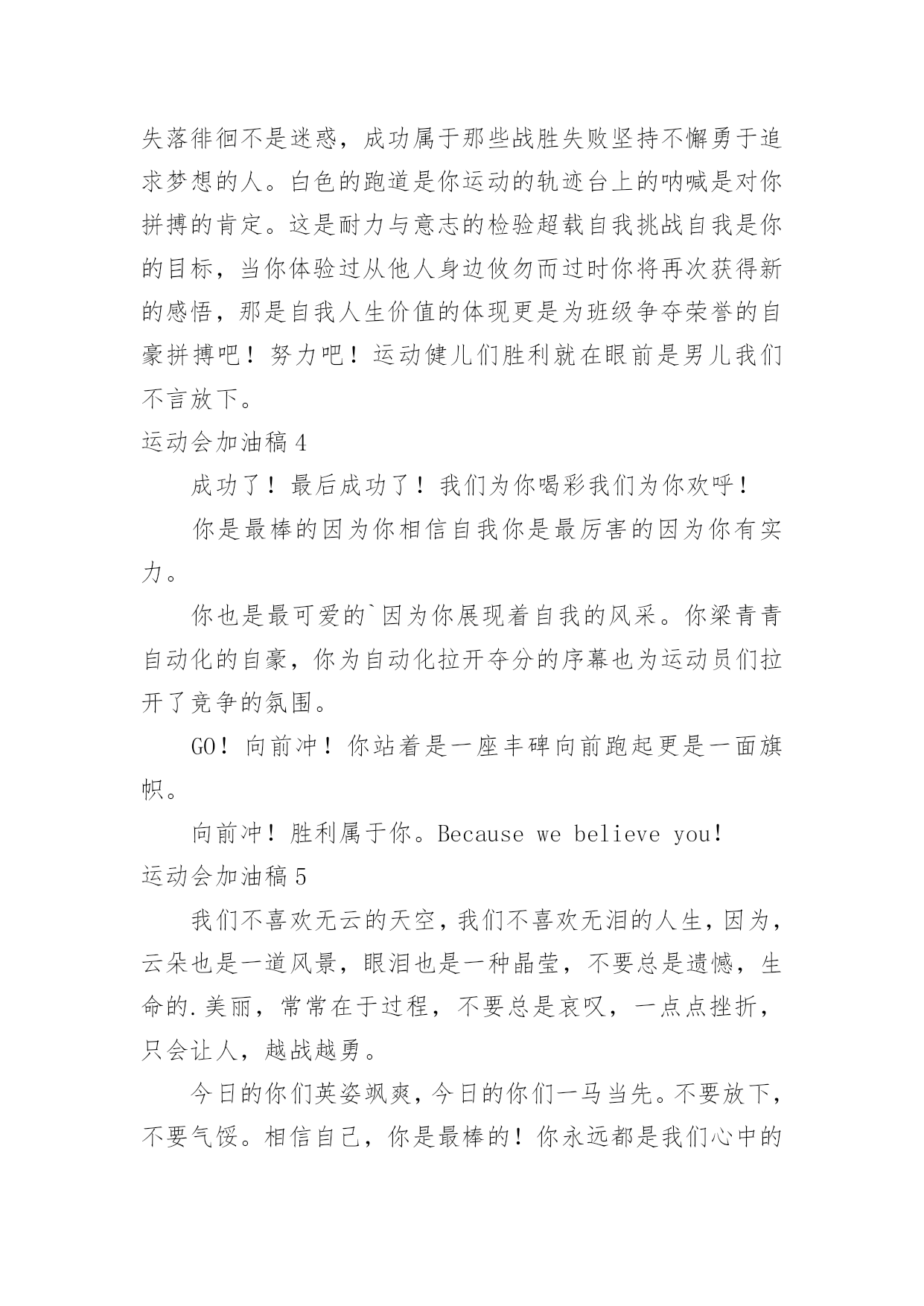运动会加油稿运动会加油稿在现在的社会生活中,能够利用到加油稿的场合越来越多,加油稿可以激励对方更好地参加活动。你写加油稿时总是无从下笔?以下是小编为大家整理的运动会加油稿,希望能够帮助到大家。运动会加油稿11..年轻的我们自信飞扬,青春的气息如同出生的朝阳,蓬勃的力量如同阳光的挥洒。此时此刻,跑道便是我们精彩的舞台,声声加油便是我们最高的奖项!论何成功,谈何荣辱,心中的信念只有一个拼搏!萧瑟的秋风,挡不住你们破竹的锐气,2..广阔的`绿茵场,是为你们搭建的舞台。张扬吧,年轻的心,我们将为你永远喝彩!3..朋友,在你走上跑道那一刻,告诉自己,无论成功与否,微笑着跑完全程,只要年轻的心还在不停地跳动,就要大声告诉自己——我无所畏惧。4.亲爱的运动健儿们,加油吧!洒一把艰辛的汗水,继续抬起疲倦的脚步,爆发的一吼气贯长虹,继续向前,不论成功与否,你已曾经拥有。曾记否,在终点欢呼,震惊四周。5.无论成功与否,我们永远铭记这充满奋斗印记的阳光灿烂的日子6.无论你成功与否,刹那属于你。而你,一定属于永恒!7.只要你没有遗憾地奋斗,你就不必失望,你的生命已放出闪光!8.成功永远属于每一个勇敢者!9.不为掌声的注释,不为刻意的征服,不为失败的痛苦,只有辛勤的汗水,化作成功的脚步!10.不为鲜花的围绕,不为刹那的荣耀,只有执着的信念,化作不停的奔跑,心中燃烧着梦想,脚下不停的步伐!运动会加油稿2心情是飞扬的,亦如今天湛蓝的天空。笑容是飞扬的,亦如今天取得的佳评。青春是飞扬的,亦如今天大家的期待。你们是飞扬的,亦如今天脸上的自信。加油吧!让你们的“梦想”飞得更快、更高、更远。纵使沙坑上不能永恒地留下你们的.脚印,但我们的回忆中将永远在你们的努力中。运动会加油稿3人生的路有坦途也有坎坷;走过的岁月有欢笑也有苦涩。泪水告诉我一个跌倒的故事。汗水使我多了一份沉重几多成熟。理想毕竟不一样于现实,失败是生活的一部分谁也无法选取无法拒绝。人生要自我去拼搏去奋斗,在风雨中百屈不挠、勇往直前,在自我的每个驿站都留下一段无悔的'回忆。流泪不是失落徘徊不是迷惑,成功属于那些战胜失败坚持不懈勇于追求梦想的人。白色的跑道是你运动的轨迹台上的呐喊是对你拼搏的肯定。这是耐力与意志的检验超载自我挑战自我是你的目标,当你体验过从他人身边攸勿而过时你将再次获得新的感悟,那是自我人生价值的体现更是为班级争夺荣誉的自豪拼搏吧!努力吧!运动健儿们胜利就在眼前是男儿我们不言放下。运动会加油稿4成功了!最后成功了!我们为你喝彩我们为你欢呼!你是最棒的因为你相信自我你是最厉害的因为你有实力。你也是最可爱的`因为你展现着自我的风采。你梁青青自动化的自豪,你为自动化拉开夺分的序幕也为运动员们拉开了竞争的氛围。GO!向前冲!你站着是一座丰碑向前跑起更是一面旗帜。向前冲!胜利属于你。Becausewebelieveyou!运动会加油稿5我们不喜欢无云的天空,我们不喜欢无泪的人生,因为,云朵也是一道风景,眼泪也是一种晶莹,不要总是遗憾,生命的.美丽,常常在于过程,不要总是哀叹,一点点挫折,只会让人,越战越勇。今日的你们英姿飒爽,今日的你们一马当先。不要放下,不要气馁。相信自己,你是最棒的!你永远都是我们心中的体育健儿!加油!时值秋暮冬初,虽然已过了金秋十月,然而初冬依然暖阳高照,校运动会在这样风和日丽的天气里如期举行了。运动会加油稿61、不为掌声的诠释,不为刻意的征服,只有辛勤的汗水化作追求的脚步,心中坚定的信念,脚下沉稳的步伐,你用行动诉说着一个不变的真理,没有比脚更长的路,没有比人更高的山,希望在终点向你招手,努力吧用你坚韧不拔的毅志,去迎接终点的鲜花与掌声,相信成功属于你。2、不长不短的.距离,需要的是全身心全程投入,自始至终你们都在拼全力此时此刻,你们处在最风光的一刻,无论第几坚持胜利的信心,只要跑下来,你们就是英雄。3、在今天的赛场上,我只是个场边的看客。我用眼睛见证了赛场上的是非成败,用心灵感受了运动员的喜怒哀乐。他坚持跑完全程,我学到了坚持的可贵,他摔倒了再站起来,我学会了不怕失败的勇气。场上每一个点滴,都如此的震撼我的心灵。在今天的赛场上,我只是个场边的看客,但我学到了很多。4、也许流星并不少见,但它燃烧的刹那,留给人间最美丽的回忆!也许笑脸并不少见,但胜利的喜悦,总会留给世界精彩的一瞬!是的,那些曾经美妙的东西只有短短的一瞬间,但那却把最辉煌的一刻留给了人间。胜利,是每个人所追求的,胜利的喜悦,是胜利与重新开始的转折,胜利是新的开始!5、心中坚定的信念,脚下沉稳的步伐,你用行动告诉我们一个不变之理,没有走不完的路,没有过不了的山,成功正在终点冲着你高高的招手,用你那顽强的意志去努力,去迎接终点的鲜花与掌声,相信成功一定是属于你。运动会加油稿71、坚定而又有力量,眼睛看着的不是眼前的