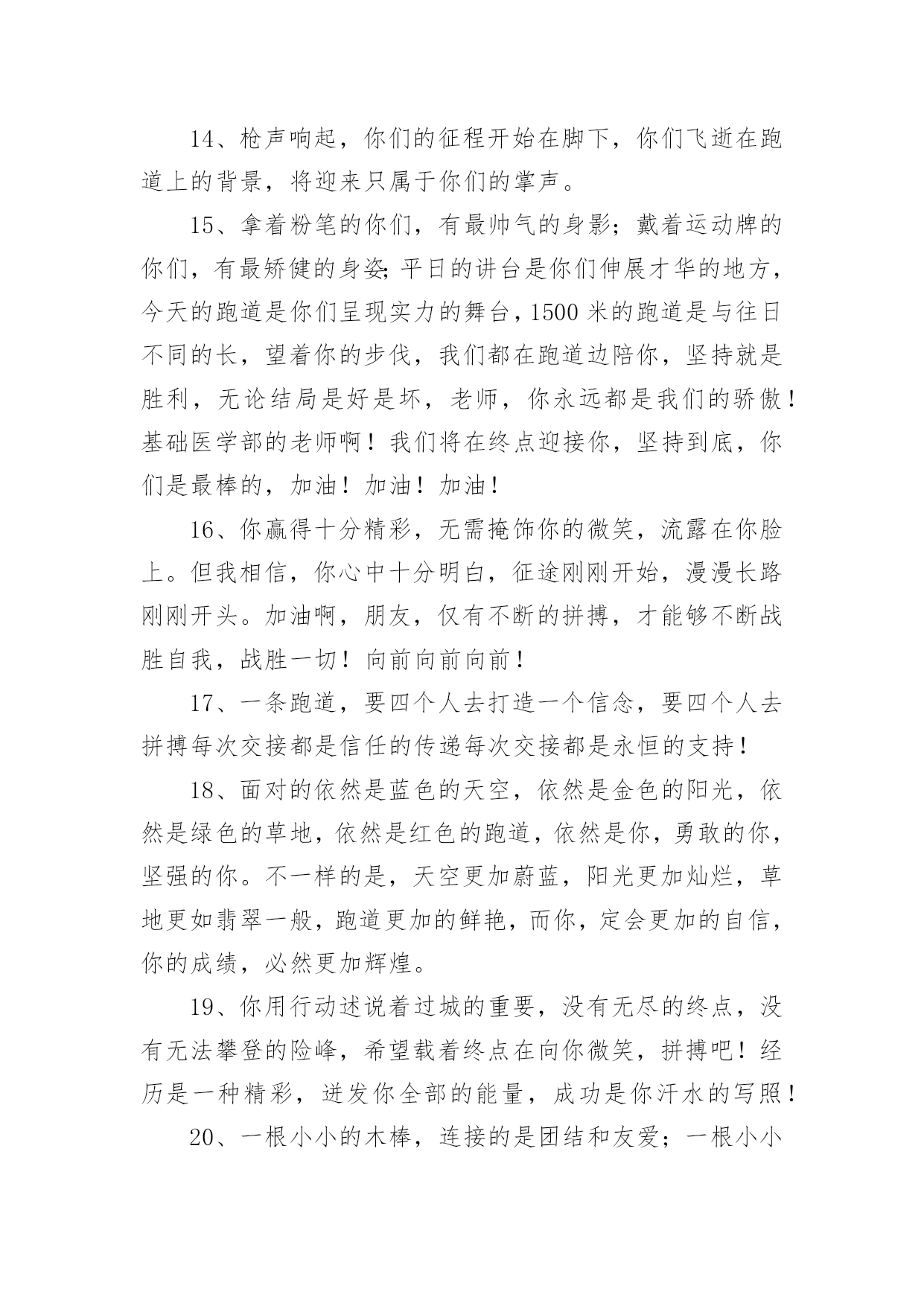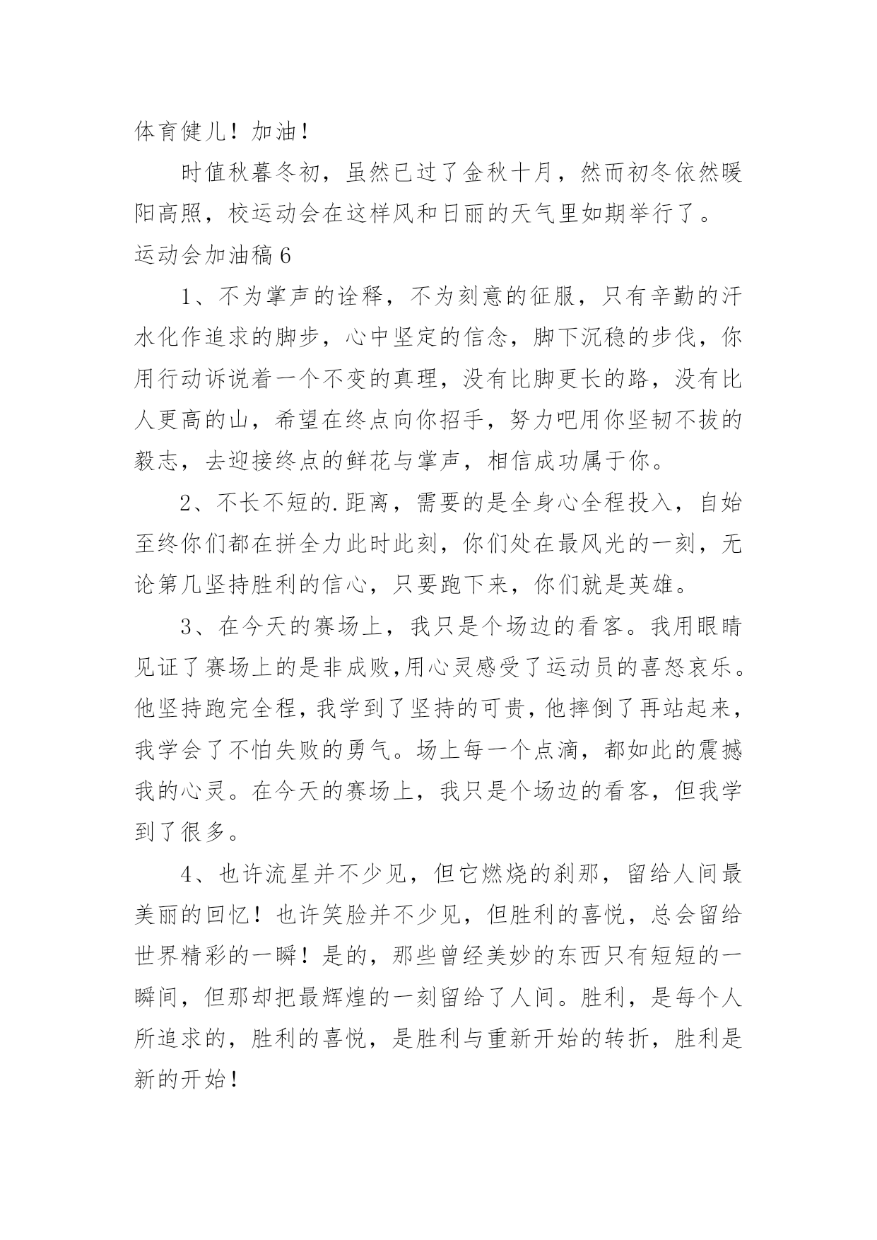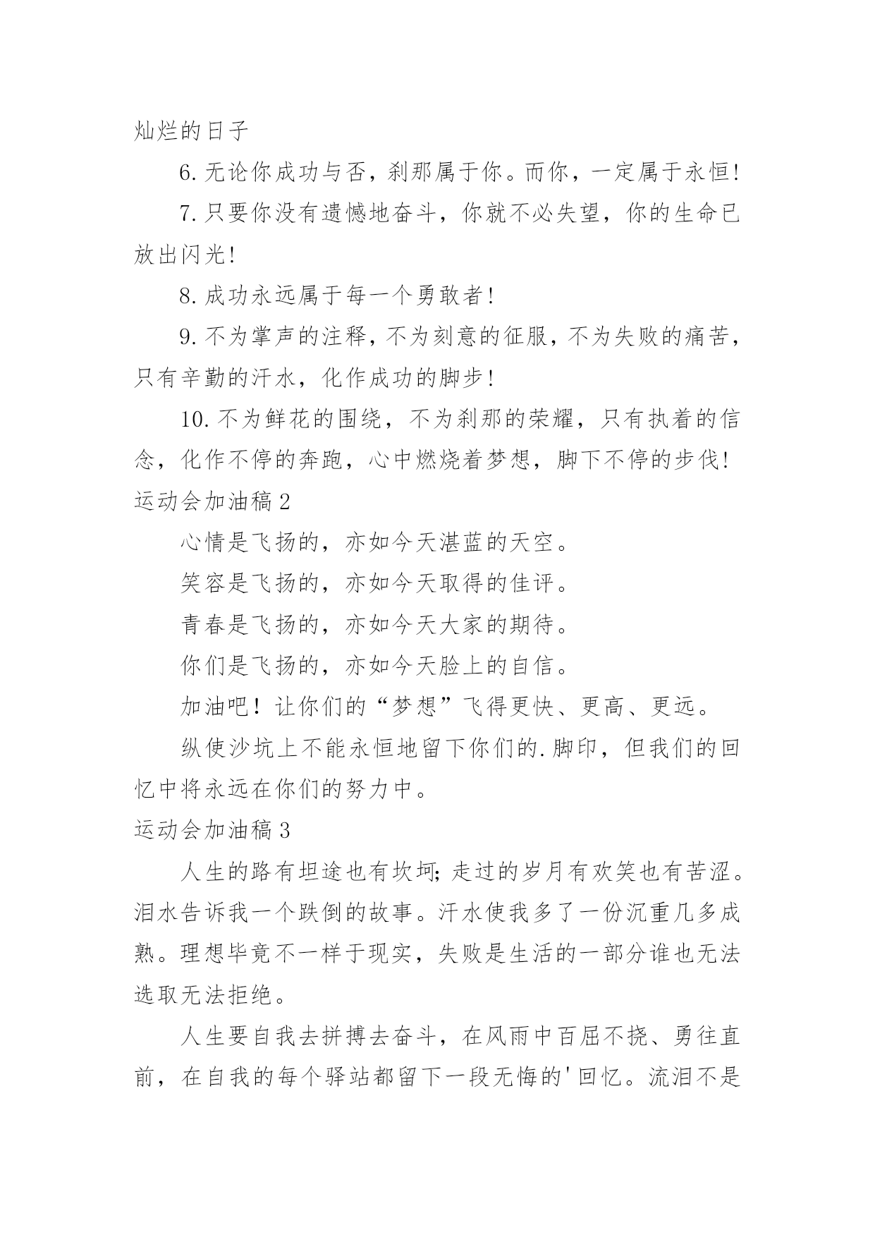 运动会加油稿运动会加油稿在现在的社会生活中,能够利用到加油稿的场合越来越多,加油稿可以激励对方更好地参加活动。你写加油稿时总是无从下笔?以下是小编为大家整理的运动会加油稿,希望能够帮助到大家。运动会加油稿11..年轻的我们自信飞扬,青春的气息如同出生的朝阳,蓬勃的力量如同阳光的挥洒。此时此刻,跑道便是我们精彩的舞台,声声加油便是我们最高的奖项!论何成功,谈何荣辱,心中的信念只有一个拼搏!萧瑟的秋风,挡不住你们破竹的锐气,2..广阔的`绿茵场,是为你们搭建的舞台。张扬吧,年轻的心,我们将为你永远喝彩!3..朋友,在你走上跑道那一刻,告诉自己,无论成功与否,微笑着跑完全程,只要年轻的心还在不停地跳动,就要大声告诉自己——我无所畏惧。4.亲爱的运动健儿们,加油吧!洒一把艰辛的汗水,继续抬起疲倦的脚步,爆发的一吼气贯长虹,继续向前,不论成功与否,你已曾经拥有。曾记否,在终点欢呼,震惊四周。5.无论成功与否,我们永远铭记这充满奋斗印记的阳光灿烂的日子6.无论你成功与否,刹那属于你。而你,一定属于永恒!7.只要你没有遗憾地奋斗,你就不必失望,你的生命已放出闪光!8.成功永远属于每一个勇敢者!9.不为掌声的注释,不为刻意的征服,不为失败的痛苦,只有辛勤的汗水,化作成功的脚步!10.不为鲜花的围绕,不为刹那的荣耀,只有执着的信念,化作不停的奔跑,心中燃烧着梦想,脚下不停的步伐!运动会加油稿2心情是飞扬的,亦如今天湛蓝的天空。笑容是飞扬的,亦如今天取得的佳评。青春是飞扬的,亦如今天大家的期待。你们是飞扬的,亦如今天脸上的自信。加油吧!让你们的“梦想”飞得更快、更高、更远。纵使沙坑上不能永恒地留下你们的.脚印,但我们的回忆中将永远在你们的努力中。运动会加油稿3人生的路有坦途也有坎坷;走过的岁月有欢笑也有苦涩。泪水告诉我一个跌倒的故事。汗水使我多了一份沉重几多成熟。理想毕竟不一样于现实,失败是生活的一部分谁也无法选取无法拒绝。人生要自我去拼搏去奋斗,在风雨中百屈不挠、勇往直前,在自我的每个驿站都留下一段无悔的'回忆。流泪不是失落徘徊不是迷惑,成功属于那些战胜失败坚持不懈勇于追求梦想的人。白色的跑道是你运动的轨迹台上的呐喊是对你拼搏的肯定。这是耐力与意志的检验超载自我挑战自我是你的目标,当你体验过从他人身边攸勿而过时你将再次获得新的感悟,那是自我人生价值的体现更是为班级争夺荣誉的自豪拼搏吧!努力吧!运动健儿们胜利就在眼前是男儿我们不言放下。运动会加油稿4成功了!最后成功了!我们为你喝彩我们为你欢呼!你是最棒的因为你相信自我你是最厉害的因为你有实力。你也是最可爱的`因为你展现着自我的风采。你梁青青自动化的自豪,你为自动化拉开夺分的序幕也为运动员们拉开了竞争的氛围。GO!向前冲!你站着是一座丰碑向前跑起更是一面旗帜。向前冲!胜利属于你。Becausewebelieveyou!运动会加油稿5我们不喜欢无云的天空,我们不喜欢无泪的人生,因为,云朵也是一道风景,眼泪也是一种晶莹,不要总是遗憾,生命的.美丽,常常在于过程,不要总是哀叹,一点点挫折,只会让人,越战越勇。今日的你们英姿飒爽,今日的你们一马当先。不要放下,不要气馁。相信自己,你是最棒的!你永远都是我们心中的体育健儿!加油!时值秋暮冬初,虽然已过了金秋十月,然而初冬依然暖阳高照,校运动会在这样风和日丽的天气里如期举行了。运动会加油稿61、不为掌声的诠释,不为刻意的征服,只有辛勤的汗水化作追求的脚步,心中坚定的信念,脚下沉稳的步伐,你用行动诉说着一个不变的真理,没有比脚更长的路,没有比人更高的山,希望在终点向你招手,努力吧用你坚韧不拔的毅志,去迎接终点的鲜花与掌声,相信成功属于你。2、不长不短的.距离,需要的是全身心全程投入,自始至终你们都在拼全力此时此刻,你们处在最风光的一刻,无论第几坚持胜利的信心,只要跑下来,你们就是英雄。3、在今天的赛场上,我只是个场边的看客。我用眼睛见证了赛场上的是非成败,用心灵感受了运动员的喜怒哀乐。他坚持跑完全程,我学到了坚持的可贵,他摔倒了再站起来,我学会了不怕失败的勇气。场上每一个点滴,都如此的震撼我的心灵。在今天的赛场上,我只是个场边的看客,但我学到了很多。4、也许流星并不少见,但它燃烧的刹那,留给人间最美丽的回忆!也许笑脸并不少见,但胜利的喜悦,总会留给世界精彩的一瞬!是的,那些曾经美妙的东西只有短短的一瞬间,但那却把最辉煌的一刻留给了人间。胜利,是每个人所追求的,胜利的喜悦,是胜利与重新开始的转折,胜利是新的开始!5、心中坚定的信念,脚下沉稳的步伐,你用行动告诉我们一个不变之理,没有走不完的路,没有过不了的山,成功正在终点冲着你高高的招手,用你那顽强的意志去努力,去迎接终点的鲜花与掌声,相信成功一定是属于你。运动会加油稿71、坚定而又有力量,眼睛看着的不是眼前的