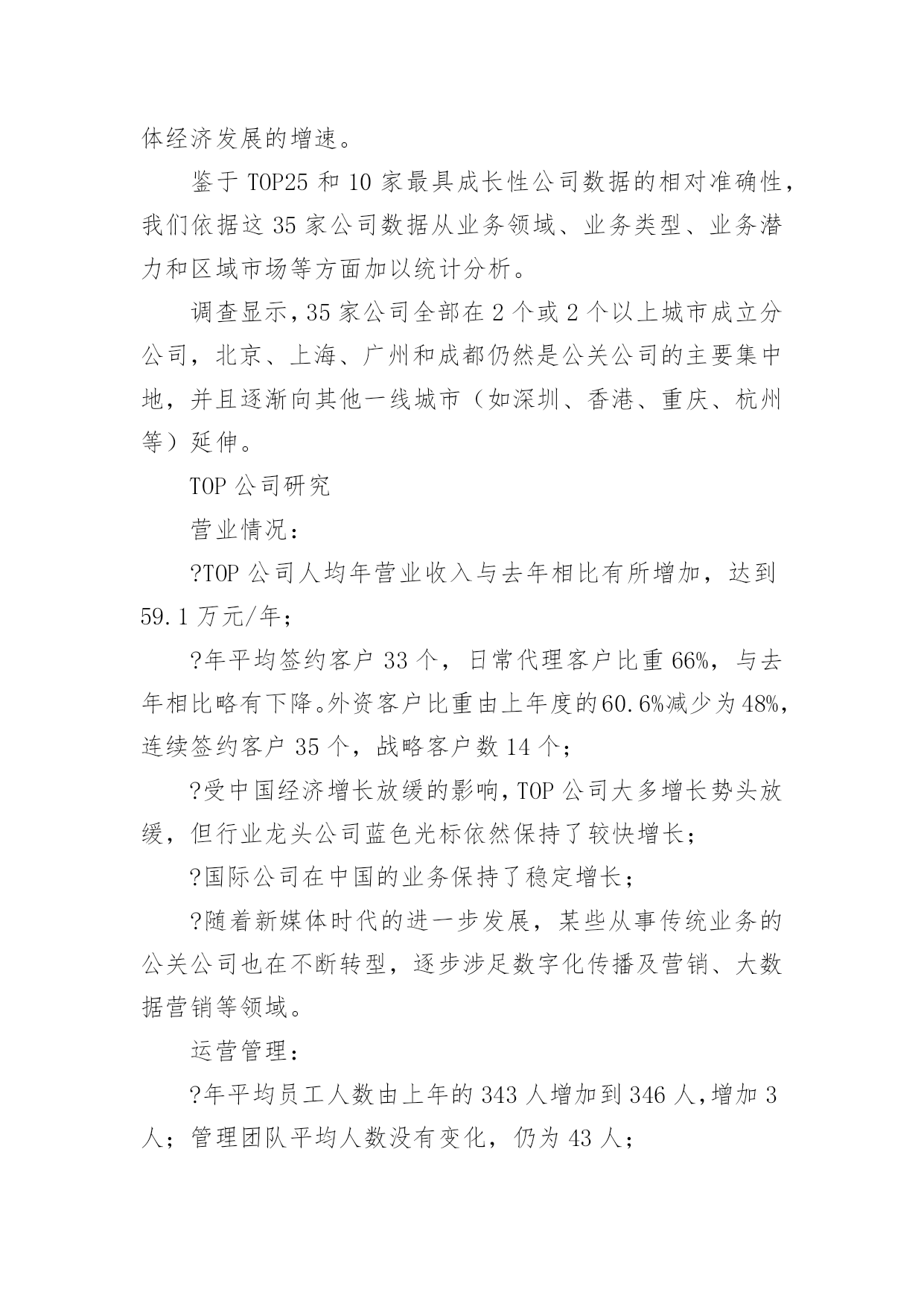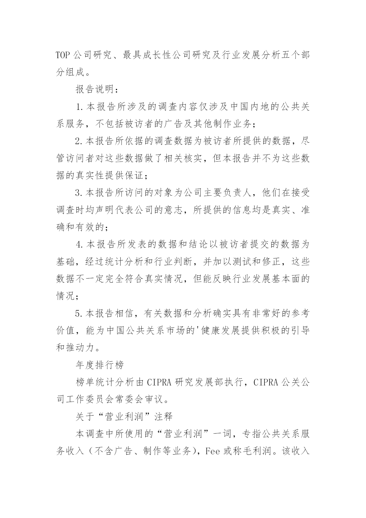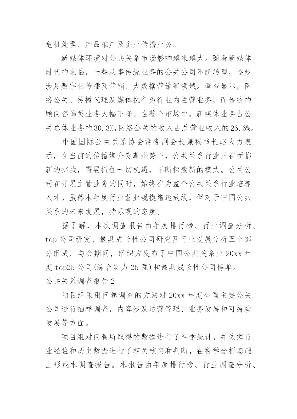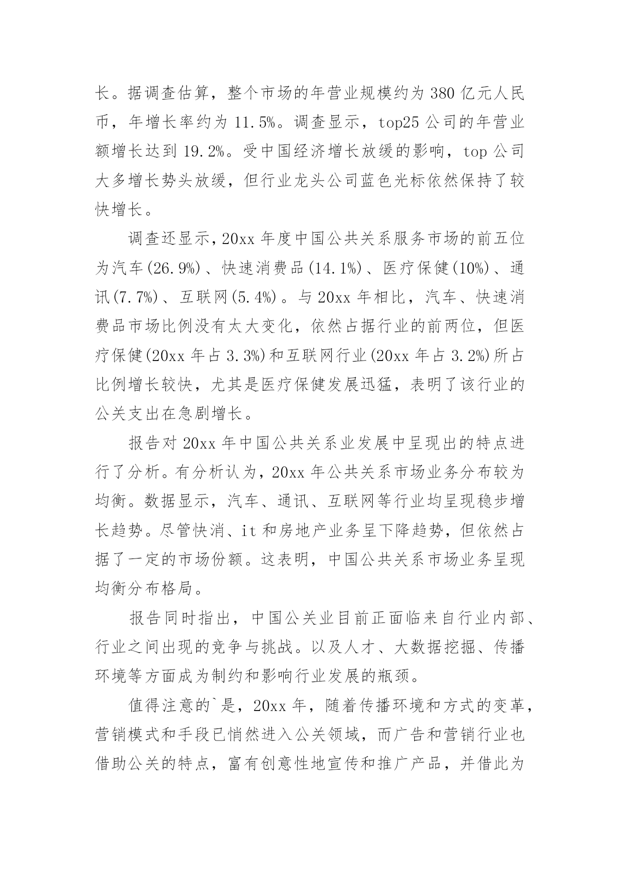 公共关系调查报告公共关系调查报告随着社会不断地进步,报告对我们来说并不陌生,报告包含标题、正文、结尾等。相信很多朋友都对写报告感到非常苦恼吧,以下是小编收集整理的公共关系调查报告,仅供参考,欢迎大家阅读。公共关系调查报告1为反映20xx年度公共关系服务市场的运行态势,正确评价中国公共关系业的发展状况,为专业机构提供积极的行业指引,20xx年2月2日至3月13日,中国国际公共关系协会(cipra)对中国大陆境内主要公共关系公司进行调查活动。项目组采用问卷调查的方法对20xx年度全国主要公关公司进行抽样调查,内容涉及运营管理、业务发展和可持续发展等方面。“报告”释放巨大市场信号4月15日,中国国际公共关系协会(cipra)在北京发布了《中国公共关系业20xx年度调查报告》。发布会上,公关公司工作委员会20xx年度主任委员、哲基传播执行董事王虎就《中国公共关系业20xx年度调查报告》(简称:报告)进行详细的发布和重点解读。报告指出,中国公共关系市场20xx年继续保持稳定增长。据调查估算,整个市场的年营业规模约为380亿元人民币,年增长率约为11.5%。调查显示,top25公司的年营业额增长达到19.2%。受中国经济增长放缓的影响,top公司大多增长势头放缓,但行业龙头公司蓝色光标依然保持了较快增长。调查还显示,20xx年度中国公共关系服务市场的前五位为汽车(26.9%)、快速消费品(14.1%)、医疗保健(10%)、通讯(7.7%)、互联网(5.4%)。与20xx年相比,汽车、快速消费品市场比例没有太大变化,依然占据行业的前两位,但医疗保健(20xx年占3.3%)和互联网行业(20xx年占3.2%)所占比例增长较快,尤其是医疗保健发展迅猛,表明了该行业的公关支出在急剧增长。报告对20xx年中国公共关系业发展中呈现出的特点进行了分析。有分析认为,20xx年公共关系市场业务分布较为均衡。数据显示,汽车、通讯、互联网等行业均呈现稳步增长趋势。尽管快消、it和房地产业务呈下降趋势,但依然占据了一定的市场份额。这表明,中国公共关系市场业务呈现均衡分布格局。报告同时指出,中国公关业目前正面临来自行业内部、行业之间出现的竞争与挑战。以及人才、大数据挖掘、传播环境等方面成为制约和影响行业发展的瓶颈。值得注意的`是,20xx年,随着传播环境和方式的变革,营销模式和手段已悄然进入公关领域,而广告和营销行业也借助公关的特点,富有创意性地宣传和推广产品,并借此为企业树形象、创品牌,这一变化导致行业之间的边界越来越模糊、竞争越来越激烈。转型创新需要持续坚持跨行业以及行业内部的并购将成为常态。20xx年6月,华谊嘉信以发行股份和支付现金相结合的方式购买迪思传媒100%股份,估值4.6亿元;同年9月,深圳市联建光电股份有限公司发布公告,以现金及发行股份方式收购上海友拓公关顾问有限公司交易作价为4.6亿元;未来公关行业的格局将是实力强大的公关传播集团开始形成,而中小型公关公司则将利用自身优势,走上更加专业化的道路。在互联网时代,大数据深刻影响行业变革,微博、微信、微视频等传播手段以及营销模式层出不穷。网上信息的精准抓取满足了客户个性化的需求,也让大数据开发和应用能够大展拳脚。公关行业与传播手段联系最为紧密,如何应对、如何转型、如何创新,关系着行业的生存和发展。显然,变革将伴随公关行业未来相当长一段时间,变革将给行业带来巨大挑战。另外,随着广告、营销等行业的介入,企业对公关公司服务质量的要求将会越来越高,因此,公关行业必须要在创新中求发展。报告对20xx年中国公共关系业发展中呈现出的特点进行了分析。通过梳理过去一年公共关系市场运行数据时会发现一个显著特点是,国际公关公司在中国的业务保持了稳定增长。与国内公司不同,国际公司的主营业务基本上是顾问咨询服务。国际性公司网络公关客户的主要需求为舆情监测、危机处理、产品推广及企业传播业务。新媒体环境对公共关系市场影响越来越大。随着新媒体时代的来临,一些从事传统业务的公关公司不断转型,逐步涉足数字化传播及营销、大数据营销等领域。调查显示,网络公关、传播代理及媒体执行为行业内主营业务,而传统的顾问咨询类业务大幅下降。在整个市场中,新媒体业务占公关总体业务的30.3%,网络公关的收入占总营业收入的26.6%。中国国际公共关系协会常务副会长兼秘书长赵大力表示,在当前的传播媒介变革形势下,公共关系行业正在面临新的挑战,需要抓住一切机遇,不断探索新的模式。公关公司在开展主营业务的同时,始终在为整个公共关系行业培养人才。虽然本年度行业营业规模增速放缓,但对于中国公共关系的未来发展,持乐观的态度。据了解,本次调查报告由年度排行榜、行业调查分析、top公司研究、最具成长性公司研究及行业发展分析五个部分组成。与会期间,组织方发布了中国公共关系
