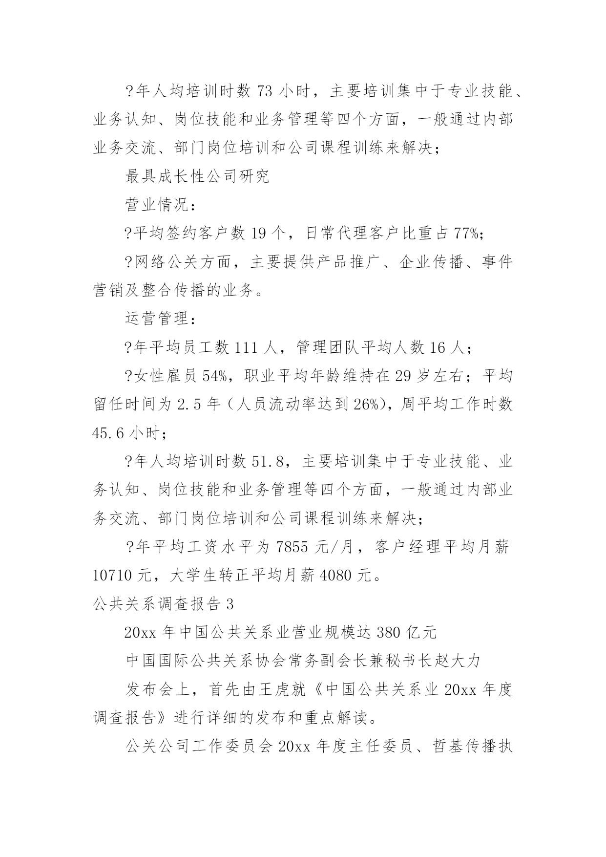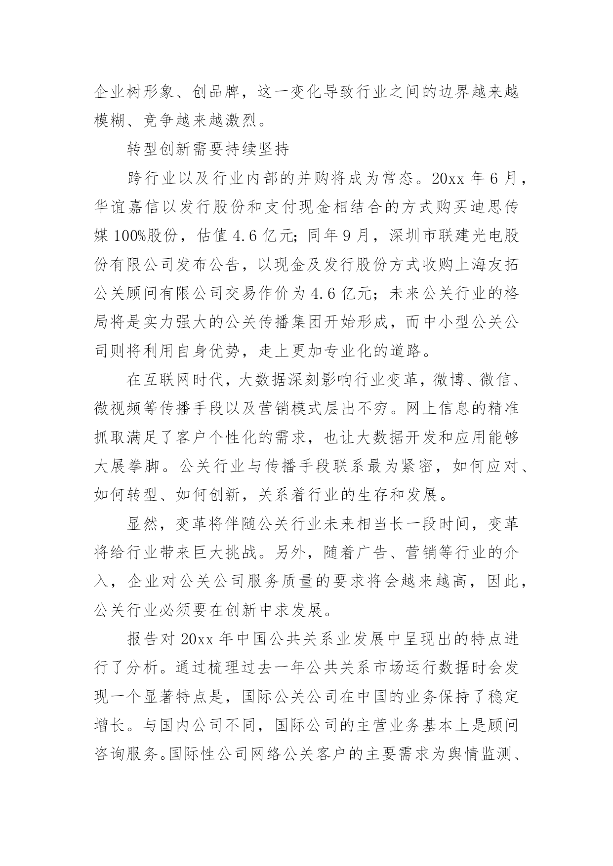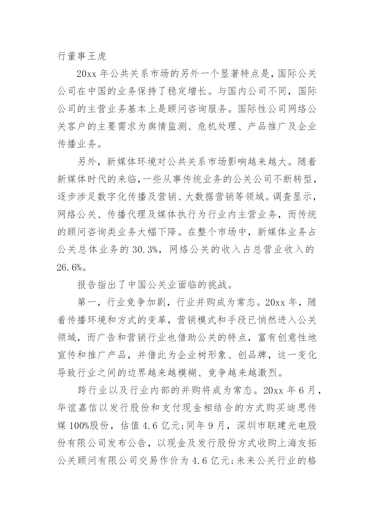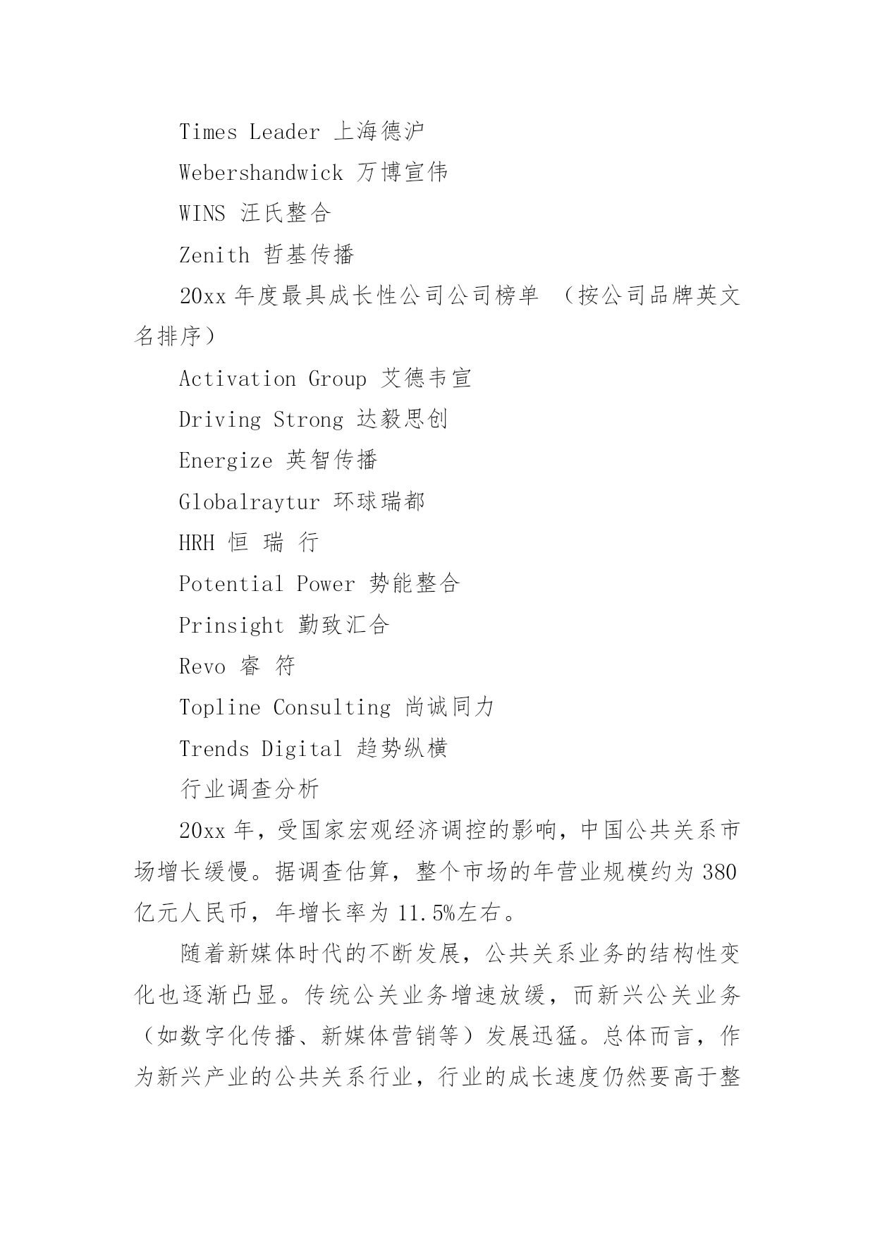 公共关系调查报告公共关系调查报告随着社会不断地进步,报告对我们来说并不陌生,报告包含标题、正文、结尾等。相信很多朋友都对写报告感到非常苦恼吧,以下是小编收集整理的公共关系调查报告,仅供参考,欢迎大家阅读。公共关系调查报告1为反映20xx年度公共关系服务市场的运行态势,正确评价中国公共关系业的发展状况,为专业机构提供积极的行业指引,20xx年2月2日至3月13日,中国国际公共关系协会(cipra)对中国大陆境内主要公共关系公司进行调查活动。项目组采用问卷调查的方法对20xx年度全国主要公关公司进行抽样调查,内容涉及运营管理、业务发展和可持续发展等方面。“报告”释放巨大市场信号4月15日,中国国际公共关系协会(cipra)在北京发布了《中国公共关系业20xx年度调查报告》。发布会上,公关公司工作委员会20xx年度主任委员、哲基传播执行董事王虎就《中国公共关系业20xx年度调查报告》(简称:报告)进行详细的发布和重点解读。报告指出,中国公共关系市场20xx年继续保持稳定增长。据调查估算,整个市场的年营业规模约为380亿元人民币,年增长率约为11.5%。调查显示,top25公司的年营业额增长达到19.2%。受中国经济增长放缓的影响,top公司大多增长势头放缓,但行业龙头公司蓝色光标依然保持了较快增长。调查还显示,20xx年度中国公共关系服务市场的前五位为汽车(26.9%)、快速消费品(14.1%)、医疗保健(10%)、通讯(7.7%)、互联网(5.4%)。与20xx年相比,汽车、快速消费品市场比例没有太大变化,依然占据行业的前两位,但医疗保健(20xx年占3.3%)和互联网行业(20xx年占3.2%)所占比例增长较快,尤其是医疗保健发展迅猛,表明了该行业的公关支出在急剧增长。报告对20xx年中国公共关系业发展中呈现出的特点进行了分析。有分析认为,20xx年公共关系市场业务分布较为均衡。数据显示,汽车、通讯、互联网等行业均呈现稳步增长趋势。尽管快消、it和房地产业务呈下降趋势,但依然占据了一定的市场份额。这表明,中国公共关系市场业务呈现均衡分布格局。报告同时指出,中国公关业目前正面临来自行业内部、行业之间出现的竞争与挑战。以及人才、大数据挖掘、传播环境等方面成为制约和影响行业发展的瓶颈。值得注意的`是,20xx年,随着传播环境和方式的变革,营销模式和手段已悄然进入公关领域,而广告和营销行业也借助公关的特点,富有创意性地宣传和推广产品,并借此为企业树形象、创品牌,这一变化导致行业之间的边界越来越模糊、竞争越来越激烈。转型创新需要持续坚持跨行业以及行业内部的并购将成为常态。20xx年6月,华谊嘉信以发行股份和支付现金相结合的方式购买迪思传媒100%股份,估值4.6亿元;同年9月,深圳市联建光电股份有限公司发布公告,以现金及发行股份方式收购上海友拓公关顾问有限公司交易作价为4.6亿元;未来公关行业的格局将是实力强大的公关传播集团开始形成,而中小型公关公司则将利用自身优势,走上更加专业化的道路。在互联网时代,大数据深刻影响行业变革,微博、微信、微视频等传播手段以及营销模式层出不穷。网上信息的精准抓取满足了客户个性化的需求,也让大数据开发和应用能够大展拳脚。公关行业与传播手段联系最为紧密,如何应对、如何转型、如何创新,关系着行业的生存和发展。显然,变革将伴随公关行业未来相当长一段时间,变革将给行业带来巨大挑战。另外,随着广告、营销等行业的介入,企业对公关公司服务质量的要求将会越来越高,因此,公关行业必须要在创新中求发展。报告对20xx年中国公共关系业发展中呈现出的特点进行了分析。通过梳理过去一年公共关系市场运行数据时会发现一个显著特点是,国际公关公司在中国的业务保持了稳定增长。与国内公司不同,国际公司的主营业务基本上是顾问咨询服务。国际性公司网络公关客户的主要需求为舆情监测、危机处理、产品推广及企业传播业务。新媒体环境对公共关系市场影响越来越大。随着新媒体时代的来临,一些从事传统业务的公关公司不断转型,逐步涉足数字化传播及营销、大数据营销等领域。调查显示,网络公关、传播代理及媒体执行为行业内主营业务,而传统的顾问咨询类业务大幅下降。在整个市场中,新媒体业务占公关总体业务的30.3%,网络公关的收入占总营业收入的26.6%。中国国际公共关系协会常务副会长兼秘书长赵大力表示,在当前的传播媒介变革形势下,公共关系行业正在面临新的挑战,需要抓住一切机遇,不断探索新的模式。公关公司在开展主营业务的同时,始终在为整个公共关系行业培养人才。虽然本年度行业营业规模增速放缓,但对于中国公共关系的未来发展,持乐观的态度。据了解,本次调查报告由年度排行榜、行业调查分析、top公司研究、最具成长性公司研究及行业发展分析五个部分组成。与会期间,组织方发布了中国公共关系