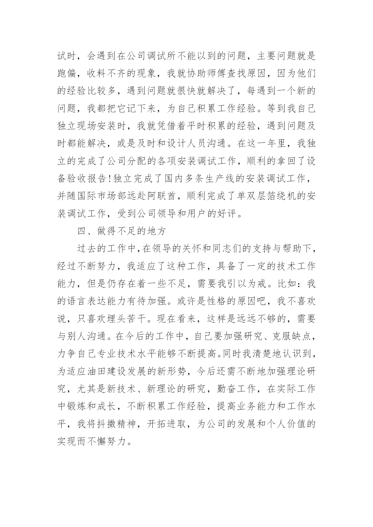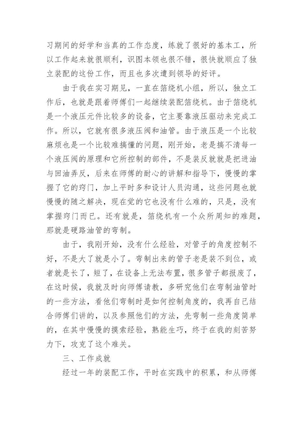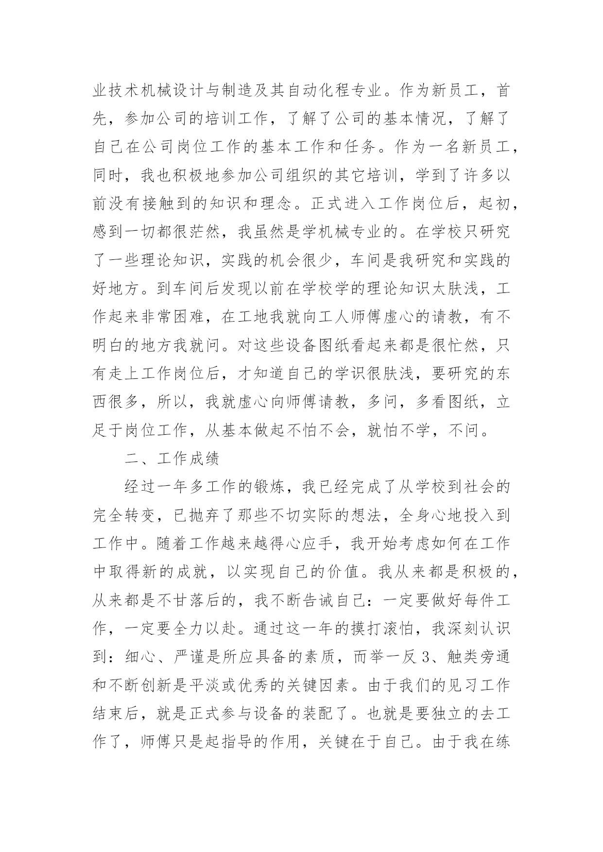 机电工程师工作总结总结就是把一个时间段取得的成绩、存在的问题及得到的经验和教训进行一次全面系统的总结的书面材料,它能使我们及时找出错误并改正,因此我们需要回头归纳,写一份总结了。那么我们该怎么去写总结呢?以下是小编为大家收集的机电工程师工作总结,欢迎阅读与收藏。时光荏苒,岁月如梭,转眼已经从学校毕业一年,来工作也已经一年了,在工作的一年里既有收获的踏实和欢欣,也有因不足带来的遗憾和愧疚。公司是一个以生产变压器装备为主的一个研发型企业,它是国内著名的变压器装备制造企业,是目前亚洲最大的电工装备制造企业。生产部的工作是繁重和艰巨的,因为它肩负着公司所有设备的装配和现场安装调试任务。我在车间领导和师傅的指导下,较好的融入了这种紧张和严谨的工作氛围中,较好地完成了领导安排各项工作,自身的业务素质和工作能力有了较大提高,对工作有了更多的自。过去的一年,我参与了较多的产品装备和设备现场安装调试工作,从中受益匪浅,不仅学到了很多专业知识,对动机装设备有了更全面的理解和把握,而且培养了我作为机械工程师所应该具备的基本素质。同时,我认真工作,坚持自学,提高了理论水平。具体总结如下:一、工作成绩我是一名刚踏入社会的大学毕业生,毕业于陕西工业职业技术机械设计与制造及其自动化程专业。作为新员工,首先,参加公司的培训工作,了解了公司的基本情况,了解了自己在公司岗位工作的基本工作和任务。作为一名新员工,同时,我也积极地参加公司组织的其它培训,学到了许多以前没有接触到的知识和理念。正式进入工作岗位后,起初,感到一切都很茫然,我虽然是学机械专业的。在学校只研究了一些理论知识,实践的机会很少,车间是我研究和实践的好地方。到车间后发现以前在学校学的理论知识太肤浅,工作起来非常困难,在工地我就向工人师傅虚心的请教,有不明白的地方我就问。对这些设备图纸看起来都是很忙然,只有走上工作岗位后,才知道自己的学识很肤浅,要研究的东西很多,所以,我就虚心向师傅请教,多问,多看图纸,立足于岗位工作,从基本做起不怕不会,就怕不学,不问。二、工作成绩经过一年多工作的锻炼,我已经完成了从学校到社会的完全转变,已抛弃了那些不切实际的想法,全身心地投入到工作中。随着工作越来越得心应手,我开始考虑如何在工作中取得新的成就,以实现自己的价值。我从来都是积极的,从来都是不甘落后的,我不断告诫自己:一定要做好每件工作,一定要全力以赴。通过这一年的摸打滚怕,我深刻认识到:细心、严谨是所应具备的素质,而举一反3、触类旁通和不断创新是平淡或优秀的关键因素。由于我们的见习工作结束后,就是正式参与设备的装配了。也就是要独立的去工作了,师傅只是起指导的作用,关键在于自己。由于我在练习期间的好学和当真的工作态度,练就了很好的基本工,所以工作起来就很顺利,识图本领也很不错,很快就顺应了独立装配的这份工作,而且也多次遭到领导的好评。由于我在实习期见,一直在箔绕机小组,所以,独立工作后,也就是跟着师傅们一起继续装配箔绕机。由于箔绕机是一个液压元件比较多的设备,它主要靠液压驱动来完成工作。所以,它就有很多液压阀和油管。由于液压是一个比较麻烦也是一个比较难搞懂的问题,刚开始,老是搞不清每一个液压阀的原理和它所控制的部件,不是装反就就是把进油与回油弄反,后来在师傅的耐心的讲解和指导下,慢慢的掌握了它的窍门,加上平时多和设计人员沟通,这些问题也就慢慢的随之解决,现在觉的它也没有什么难的,只是,没有掌握窍门而已。还有就是,箔绕机有一个众所周知的难题,那就是硬路油管的弯制。由于,我刚开始,没有什么经验,对管子的角度控制不好,不是大了就是小了。弯制出来的管子老是装不到位,或者就是长了,短了,在设备上无法布置,很多管子都报废了,在这时候,我就及时向师傅请教,多研究他们在弯制油管时的一些方法,看他们弯制时是如何控制角度的,我再自己结合师傅们讲的,以及参照他们的方法,先弯制一些角度简单的,在其中慢慢的摸索经验,熟能生巧,终于在我的刻苦努力下,攻克了这个难关。三、工作成就经过一年的装配工作,平时在实践中的积累,和从师傅身上学到的东西,多多少少也积累了一些工作经验。由于公司是生产设备,我们生产部的工作不光是装配,更重要的设备的调试工作。调试工作经验是最重要的。从开始,我就慢慢接触设备的调试工作,当然刚开始,还是跟着师傅一起调试。调试就是在设备装配工作完成后,通电,搜检设备的各部分传动是不是正常,并对设备举行空运转,搜检,排除一切异常情形,并完成设备的合格出场,给现场安装调试工作提供更好的便利条件。由于在平时的装配工作中注意积累工作经验,知道每部分的控制元件,每部分的运转情形。所以,学起来其实不是很难,由于很多零部件都是外协加工的所以难免会存在一些问题。调试时,稍不细心,就很难发现问题的所在,哪个部分不能正常运转,或是没有动作,或是着是