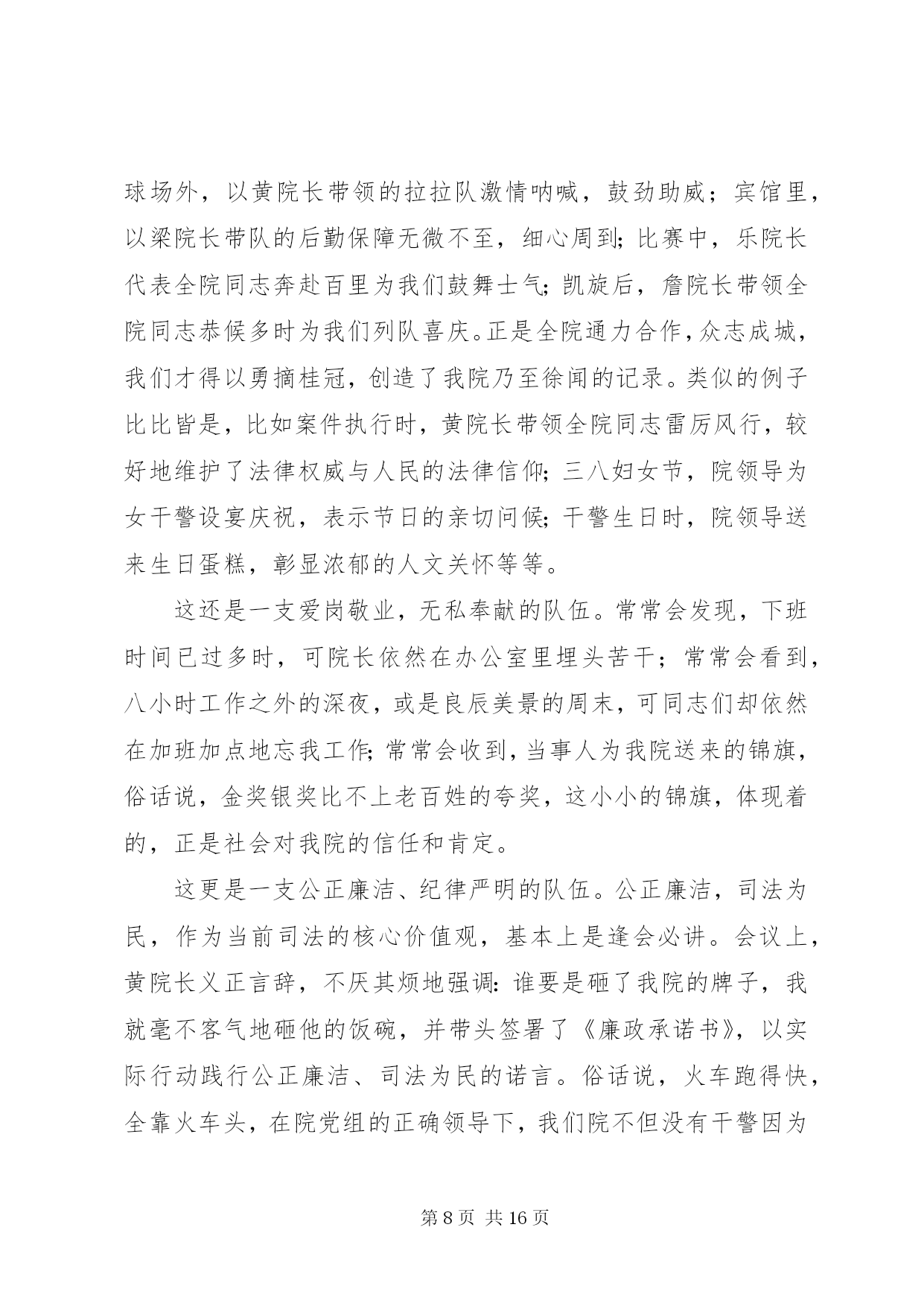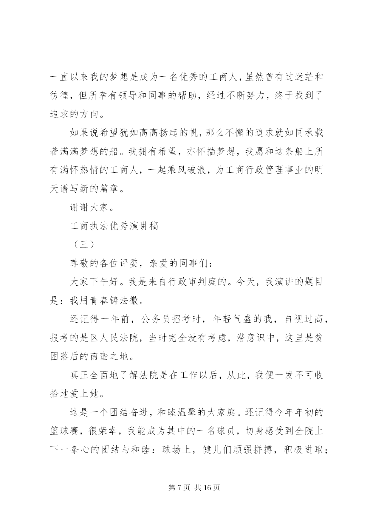 第PAGE\*Arabic\*MERGEFORMAT16页共NUMPAGES\*MERGEFORMAT16页工商执法优秀演讲稿5篇工商执法优秀演讲稿(一)尊敬的各位领导、同志们大家好:今天,我演讲的题目是,构建和谐工商要亮剑。提到亮剑,大家可能首先想到的是电视剧《亮剑》,还有那位侠肝义胆、亦正亦邪的李云龙。电视剧中李云龙曾这样说过:“面对强大的对手,明知不敌,也要毅然亮剑。即使倒下,也要成为一座山,一道岭。”这正是我要说的亮剑精神。战火纷飞的年代,我军依靠亮剑精神万众一心,浴血奋战,最终取得了革命的伟大胜利。现在,烽火早已远去,但“亮剑”精神永存。作为工商人——维护社会主义市场经济秩序的红盾卫士,我们不但要弘扬“亮剑精神”,更要与时俱进赋予“亮剑精神”新的内涵和灵魂。时代需要我们“亮剑”,社会需要我们“亮剑”,职责需要我们“亮剑”,构建和谐工商更需要我们“亮剑”。构建和谐工商要亮剑,亮剑就要有剑胆。和谐工商不是一团和气,作老好人,对尖锐的矛盾、激烈的冲突视而不见;和谐工商也不是一帆风顺、一马平川。记得有一次通过市场检查我们发现某个体工商户涉嫌销售假冒小家电,经调查发现其还有一个仓库,不知道具体位置,只知道在县工业园区附近。我们要求当事人带我们去其仓库检查,当事人说没有带钥匙要回去拿,我们等了1个小时他还没有来,我们打了几个电话给他,他都说马上就来,和我们拖延时间。当时都快6点了,天都黑了,我当时心想他肯定是拖时间不会来了,怎么办。是继续等下去还是放弃回去。陈局长当机立断地说我们去工业园区边找他的仓库,边和他继续联系。功夫不负有心人,经过半个小时的寻找,我们终于找到了他的仓库。仓库大门果然是锁着的。陈局长再次拨通他的手机对他说;“我们现在就在你仓库门口,你现在过来把门打开接收我们的检查。”当事人还在找借口拖延时间。陈局长又说“我们今天晚上不睡觉也会守在这里的,你和我们拖时间是没有用的,等会我们局里会调来几部车子把你仓库门口全部堵起来,所以你不要和我们耍花样。”对方听见陈局长这么坚定地话语,只好带钥匙过来把门打开了,仓库内果然有大量的假冒小家电,经过清点共查获136台假冒骆驼取暖器、68台假冒三角燃气灶、24台假冒三角燃气热水器。虽然已经晚上7点半了但是我们满载而归。通过这件事使我明白:和当事人进行交锋时一定要有胆量,要有压倒对方的气魄,才能够打开僵局取得胜利。构建和谐工商要亮剑,亮剑就要精剑道。亮剑既要有胆量,还要有过硬的本领。只有本领硬、底气足,才有必胜的信心。作为一个工商干部,仅靠热情和勇气是不够的,还必须具备广博的知识和多方面的才能。随着经济的发展,经济违法的手法越来越隐蔽,案情也越来越复杂,执法程序也日益规范化,这对我们工商人能力素质的要求越来越高。以前“一说二吓三罚款”粗糙的行政执法手段将一去不返。“剑出有名,依据是法律;剑出有路,要有程序和招术;剑出有效,要达到预期的社会效果”。亮剑精神是一种智慧的艺术,我们在经检办案过程中应当学会剑“亮”在何处,剑怎么“亮”,做到断然出手,一击必中。我们工商人要把亮剑精神贯穿于不断的学习中,提高自身的业务素质和执法艺术水平。只有精于剑道,才能使自己真正成为执法工作中的行家里手;只有精于剑道,才能在构建和谐工商的重任下游刃有余。构建和谐工商要亮剑,亮剑更要讲剑义。严格执法是我们的职能和职责所在,但法与义并非水火不容。在构建和谐工商的工作中严格执法与人性化执法有机结合,刚柔相济,入情入理,切实求得公正执法和执法效果的和谐。记得今年机构改革前,我们公平交易局还承担着食品安全监管的重任,有一次和陈局长一起出去办过期食品的案件,在当事人开设的商店内发现了几样过期食品,当事人说因为前几个月出去了不在家,最近才回家的,所以没有及时查看店内食品有没有过期。经询问才知道当事人家的车子前2个月出了车祸撞死了一个中学生,赔偿了几十万,现在生活很困难。听到这里陈局长喊停了正在做现场笔录的我说:“小胡,不写了。”然后对当事人说:“现在在经营就要查看有无过期食品和做好索证索票工作,奶粉还要索检测报告,本来我们是要对你销售过期食品进行处罚的,但听你的情况,出于人性化执法我们这次就不对你进行处罚了,但下不为例。”当事人激动地说“我以后一定会认真查看的,不会带你们麻烦的,谢谢。”在当前社会市场经济条件下,唯有发扬亮剑精神,做到有剑胆、精剑道、讲剑义,才有工商人的作为,才有工商人的地位,才能不辱工商人的使命。让我们亮起工商之剑,让红盾之魂在和谐工商的光辉照耀下闪光吧。工商执法优秀演讲稿(二)尊敬的各位领导、各位同事:大家好。我叫吴荻。今天我演讲的题目是《让追求承载梦想起航》。刚刚走上工作岗位的我,怀揣着梦想,希望把自己在学校所学的知识更好地服务于人民,服务于社会,服务于我所梦想的工商事业。八
