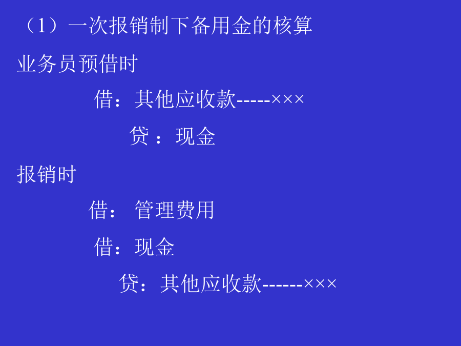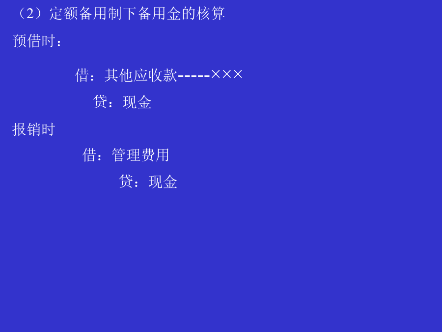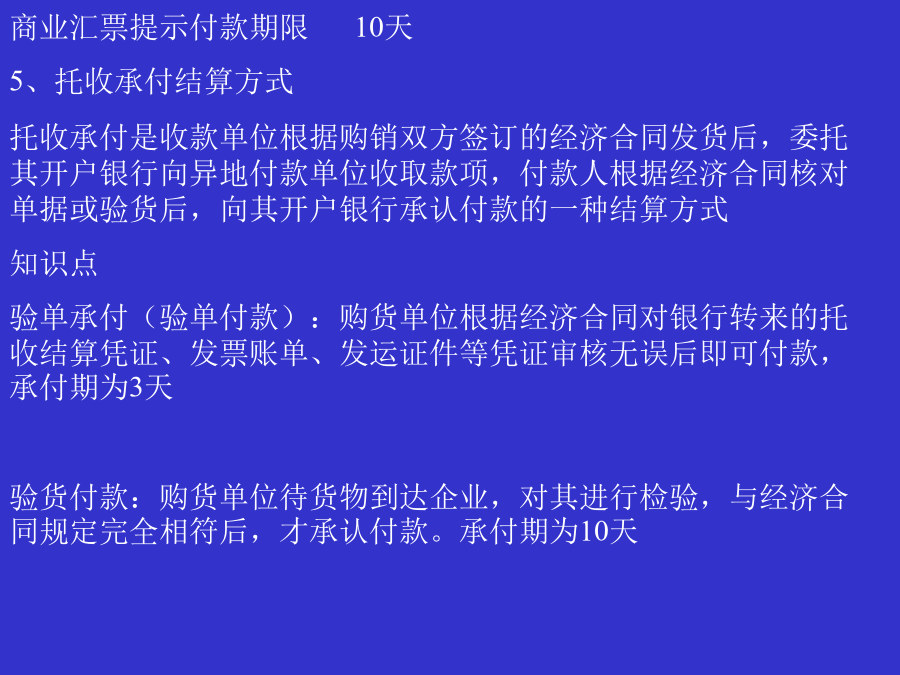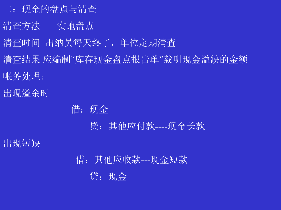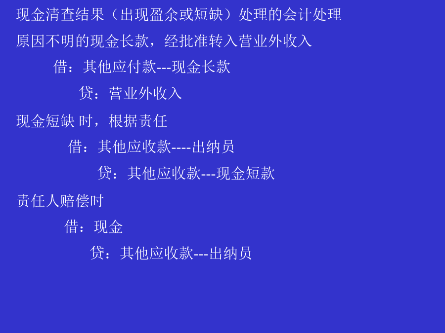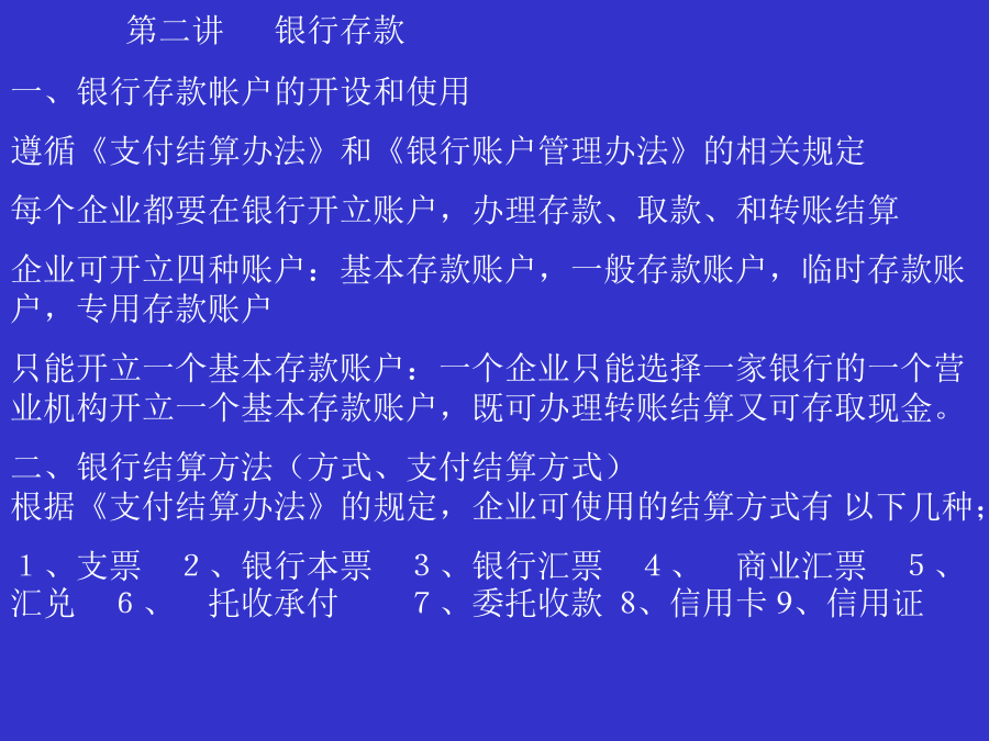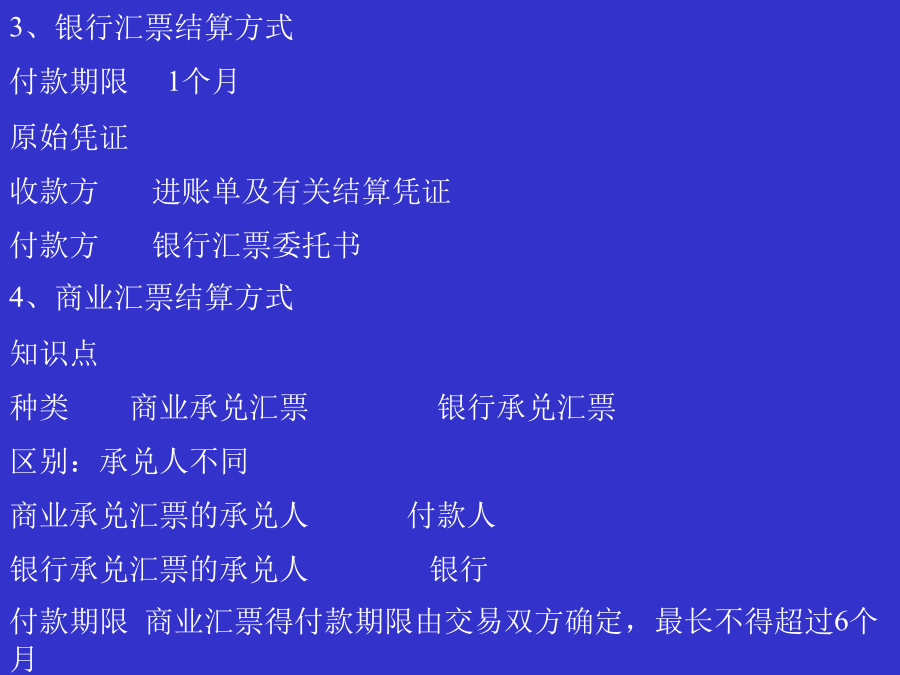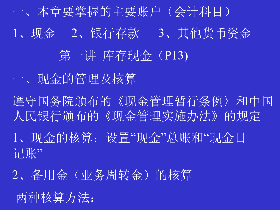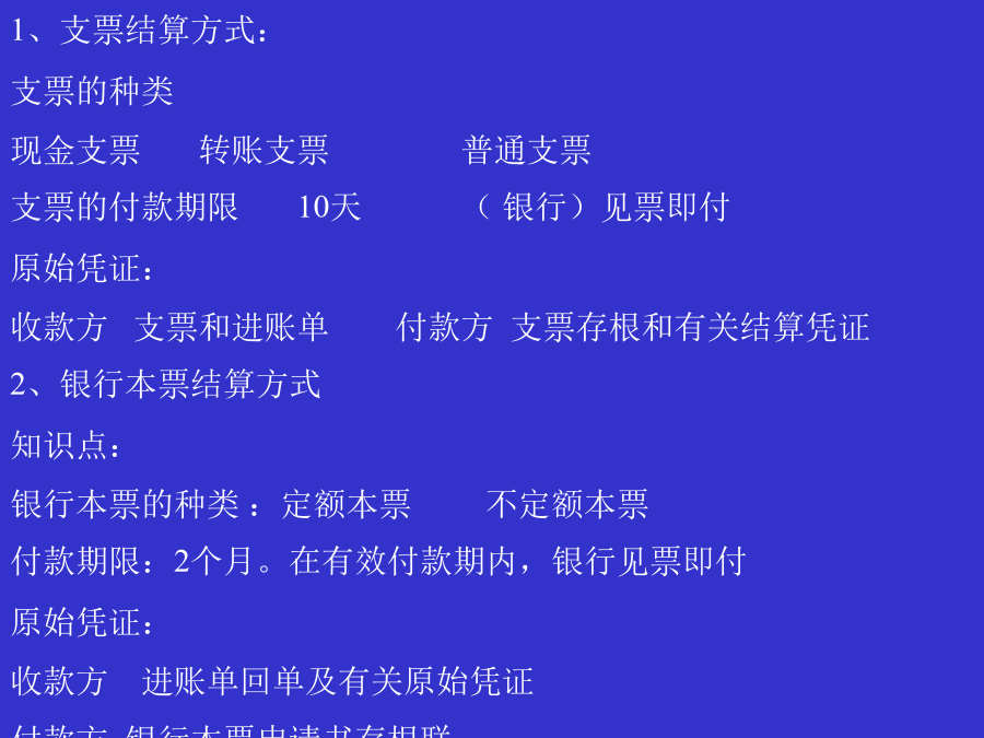 第一章货币资金一、本章要掌握的主要账户(会计科目)1、现金2、银行存款3、其他货币资金第一讲库存现金(P13)一、现金的管理及核算遵守国务院颁布的《现金管理暂行条例〉和中国人民银行颁布的《现金管理实施办法》的规定1、现金的核算:设置“现金”总账和“现金日记账”2、备用金(业务周转金)的核算两种核算方法:(1)一次报销制下备用金的核算业务员预借时借:其他应收款-----×××贷:现金报销时借:管理费用借:现金贷:其他应收款------×××(2)定额备用制下备用金的核算预借时:借:其他应收款-----×××贷:现金报销时借:管理费用贷:现金二:现金的盘点与清查清查方法实地盘点清查时间出纳员每天终了,单位定期清查清查结果应编制“库存现金盘点报告单”载明现金溢缺的金额帐务处理:出现溢余时借:现金贷:其他应付款----现金长款出现短缺借:其他应收款---现金短款贷:现金现金清查结果(出现盈余或短缺)处理的会计处理原因不明的现金长款,经批准转入营业外收入借:其他应付款---现金长款贷:营业外收入现金短缺时,根据责任借:其他应收款----出纳员贷:其他应收款---现金短款责任人赔偿时借:现金贷:其他应收款---出纳员第二讲银行存款一、银行存款帐户的开设和使用遵循《支付结算办法》和《银行账户管理办法》的相关规定每个企业都要在银行开立账户,办理存款、取款、和转账结算企业可开立四种账户:基本存款账户,一般存款账户,临时存款账户,专用存款账户只能开立一个基本存款账户:一个企业只能选择一家银行的一个营业机构开立一个基本存款账户,既可办理转账结算又可存取现金。二、银行结算方法(方式、支付结算方式)根据《支付结算办法》的规定,企业可使用的结算方式有以下几种;1、支票2、银行本票3、银行汇票4、商业汇票5、汇兑6、托收承付7、委托收款8、信用卡9、信用证1、支票结算方式:支票的种类现金支票转账支票普通支票支票的付款期限10天(银行)见票即付原始凭证:收款方支票和进账单付款方支票存根和有关结算凭证2、银行本票结算方式知识点:银行本票的种类:定额本票不定额本票付款期限:2个月。在有效付款期内,银行见票即付原始凭证:收款方进账单回单及有关原始凭证付款方银行本票申请书存根联3、银行汇票结算方式付款期限1个月原始凭证收款方进账单及有关结算凭证付款方银行汇票委托书4、商业汇票结算方式知识点种类商业承兑汇票银行承兑汇票区别:承兑人不同商业承兑汇票的承兑人付款人银行承兑汇票的承兑人银行付款期限商业汇票得付款期限由交易双方确定,最长不得超过6个月商业汇票提示付款期限10天5、托收承付结算方式托收承付是收款单位根据购销双方签订的经济合同发货后,委托其开户银行向异地付款单位收取款项,付款人根据经济合同核对单据或验货后,向其开户银行承认付款的一种结算方式知识点验单承付(验单付款):购货单位根据经济合同对银行转来的托收结算凭证、发票账单、发运证件等凭证审核无误后即可付款,承付期为3天验货付款:购货单位待货物到达企业,对其进行检验,与经济合同规定完全相符后,才承认付款。承付期为10天第三讲其他货币资金一、其他货币资金的内容1.外埠存款2.银行汇票存款3.银行本票存款4.信用卡存款5.信用证存款6.在途货币资金7.存出投资款二、其他货币资金的核算(会计处理)设置“其他货币资金”帐户,下设1.外埠存款2.银行汇票存款3.银行本票存款4.信用卡存款5.信用证存款6.在途货币资金7.存出投资款等明细账“其他货币资金”帐户(科目)性质:资产类用途:核算其他货币资金的使用和返回情况结构:其他货币资金核算举例(一)外埠存款1、企业派采购员到外地某市采购甲材料,委托当地开户银行汇款47970元到采购地开立采购专户。根据收到的银行汇票回单联,编制如下会计分录借:其他货币资金----外埠存款47970贷:银行存款479702、上述采购完成,收到采购员交来供货单位发票账单,共支付甲材料款项47970元,其中价款41000元,增值税6970元。根据收到的有关帐单,编制如下会计分录(二)银行汇票存款1、企业向银行提交“银行汇票申请书”并讲款项100000元交存开户银行,办理银行汇票并已取得汇票。根据银行盖章退回的申请书存根联借:其他货币资金----银行汇票100000贷:银行存款1000002、企业持汇票望异地采购一材料,实际使用汇票支付材料款70000元,增值税11900元根据发票账单等有关凭证借:原材料----一材料70000借:应交税金----应交增值税---进项税额1190
