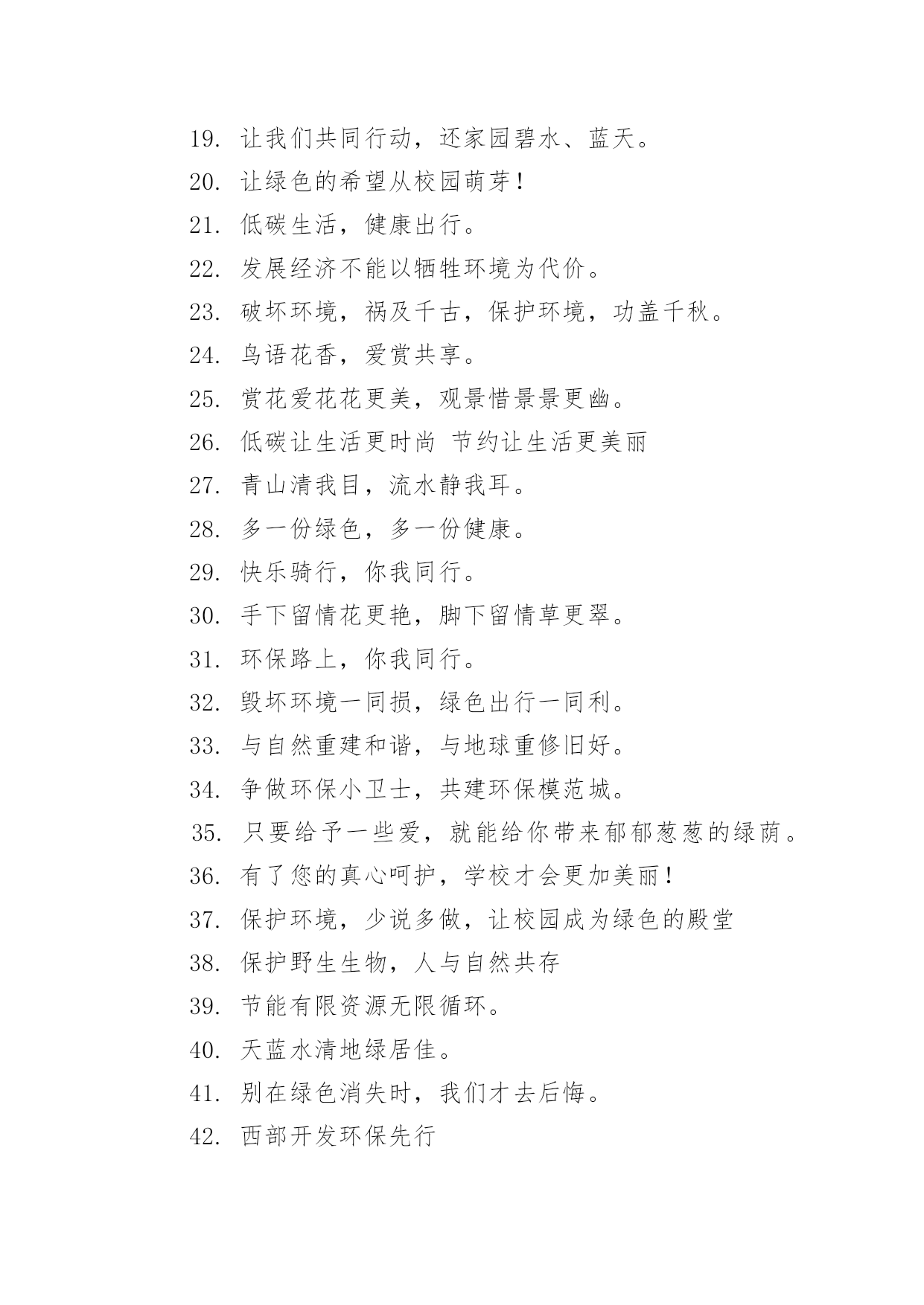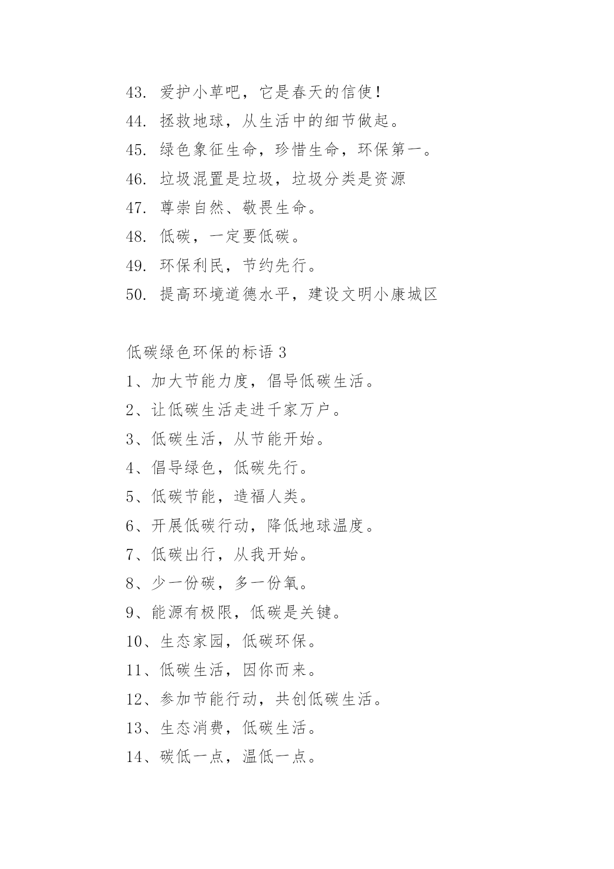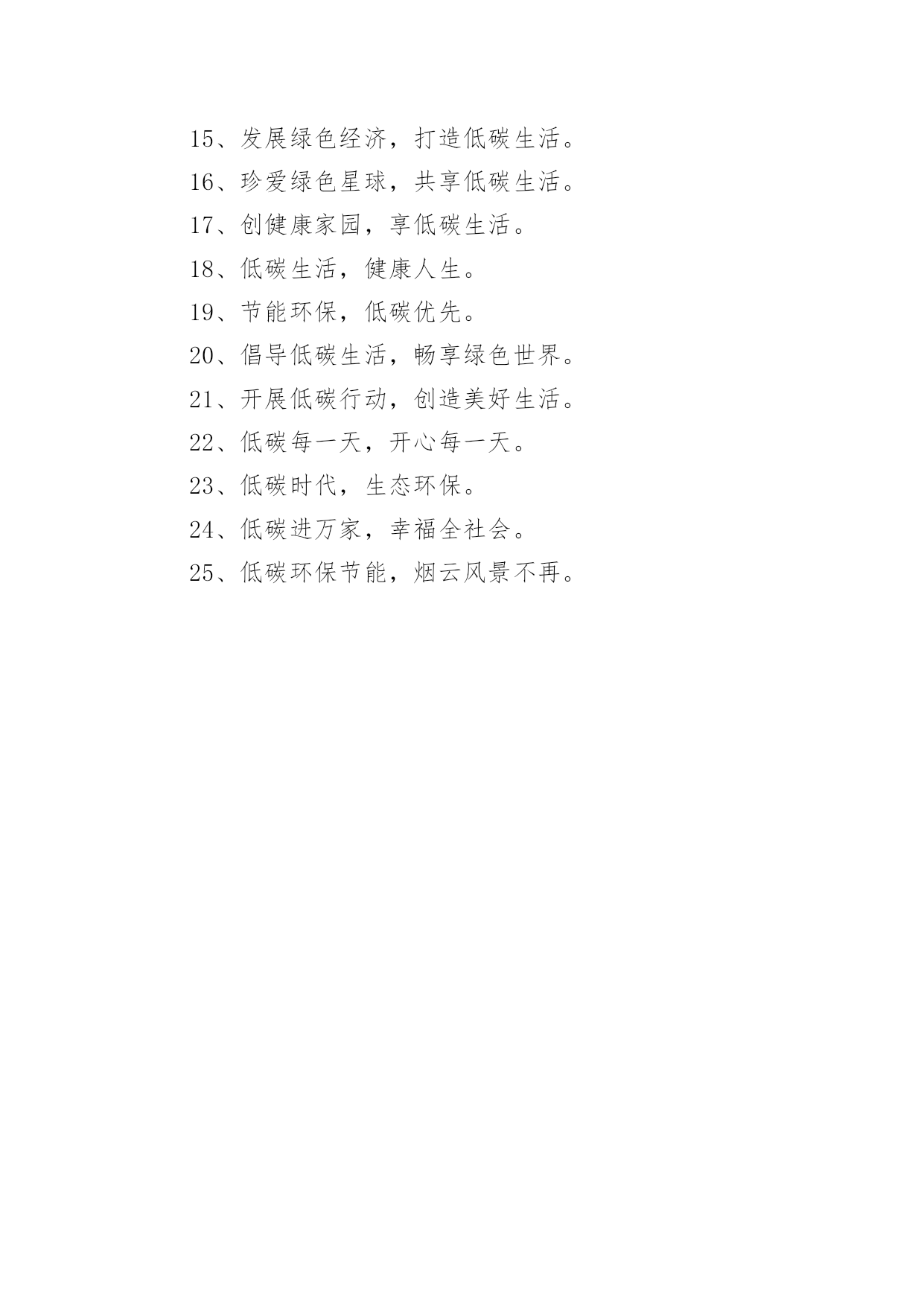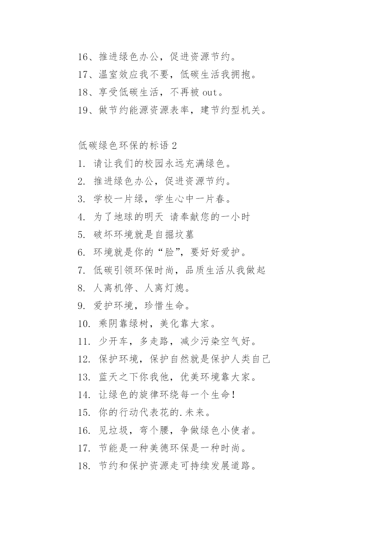 低碳绿色环保的标语在平凡的学习、工作、生活中,大家都接触过比较经典的标语吧,标语的作用是便于“造势”,形成一种氛围,也容易起到“安民告示”的作用。那么问题来了,到底什么样的标语才经典呢?以下是小编精心整理的低碳绿色环保的标语,仅供参考,希望能够帮助到大家。低碳绿色环保的标语11、加大节能低碳低碳力度,迎接绿色世博会。2、低碳,一定要低碳。3、低碳让地球解脱苦难。4、低碳生活,从我做起。5、低碳走进千万家,节能环保我参加。6、节能低碳,政府先行。7、节能低碳从现在做起,从我做起从点滴做起。8、节能低碳低碳,科学发展。9、节能低碳珍惜资源,减排爱护环境。10、节省水电讲环保,低碳生活我来造。11、绿色生活,从节约每一滴水,每一度电开始。12、清爽地球靠大家,低碳走进你我他。13、少坐汽车多行走,低碳健康我拥有。14、使用节能低碳产品,倡导绿色消费。15、推广节水型用水器具和设备,提高用水效益。16、推进绿色办公,促进资源节约。17、温室效应我不要,低碳生活我拥抱。18、享受低碳生活,不再被out。19、做节约能源资源表率,建节约型机关。低碳绿色环保的标语21.请让我们的校园永远充满绿色。2.推进绿色办公,促进资源节约。3.学校一片绿,学生心中一片春。4.为了地球的明天请奉献您的一小时5.破坏环境就是自掘坟墓6.环境就是你的“脸”,要好好爱护。7.低碳引领环保时尚,品质生活从我做起8.人离机停、人离灯熄。9.爱护环境,珍惜生命。10.乘阴靠绿树,美化靠大家。11.少开车,多走路,减少污染空气好。12.保护环境,保护自然就是保护人类自己13.蓝天之下你我他,优美环境靠大家。14.让绿色的旋律环绕每一个生命!15.你的行动代表花的.未来。16.见垃圾,弯个腰,争做绿色小使者。17.节能是一种美德环保是一种时尚。18.节约和保护资源走可持续发展道路。19.让我们共同行动,还家园碧水、蓝天。20.让绿色的希望从校园萌芽!21.低碳生活,健康出行。22.发展经济不能以牺牲环境为代价。23.破坏环境,祸及千古,保护环境,功盖千秋。24.鸟语花香,爱赏共享。25.赏花爱花花更美,观景惜景景更幽。26.低碳让生活更时尚节约让生活更美丽27.青山清我目,流水静我耳。28.多一份绿色,多一份健康。29.快乐骑行,你我同行。30.手下留情花更艳,脚下留情草更翠。31.环保路上,你我同行。32.毁坏环境一同损,绿色出行一同利。33.与自然重建和谐,与地球重修旧好。34.争做环保小卫士,共建环保模范城。35.只要给予一些爱,就能给你带来郁郁葱葱的绿荫。36.有了您的真心呵护,学校才会更加美丽!37.保护环境,少说多做,让校园成为绿色的殿堂38.保护野生生物,人与自然共存39.节能有限资源无限循环。40.天蓝水清地绿居佳。41.别在绿色消失时,我们才去后悔。42.西部开发环保先行43.爱护小草吧,它是春天的信使!44.拯救地球,从生活中的细节做起。45.绿色象征生命,珍惜生命,环保第一。46.垃圾混置是垃圾,垃圾分类是资源47.尊崇自然、敬畏生命。48.低碳,一定要低碳。49.环保利民,节约先行。50.提高环境道德水平,建设文明小康城区低碳绿色环保的标语31、加大节能力度,倡导低碳生活。2、让低碳生活走进千家万户。3、低碳生活,从节能开始。4、倡导绿色,低碳先行。5、低碳节能,造福人类。6、开展低碳行动,降低地球温度。7、低碳出行,从我开始。8、少一份碳,多一份氧。9、能源有极限,低碳是关键。10、生态家园,低碳环保。11、低碳生活,因你而来。12、参加节能行动,共创低碳生活。13、生态消费,低碳生活。14、碳低一点,温低一点。15、发展绿色经济,打造低碳生活。16、珍爱绿色星球,共享低碳生活。17、创健康家园,享低碳生活。18、低碳生活,健康人生。19、节能环保,低碳优先。20、倡导低碳生活,畅享绿色世界。21、开展低碳行动,创造美好生活。22、低碳每一天,开心每一天。23、低碳时代,生态环保。24、低碳进万家,幸福全社会。25、低碳环保节能,烟云风景不再。