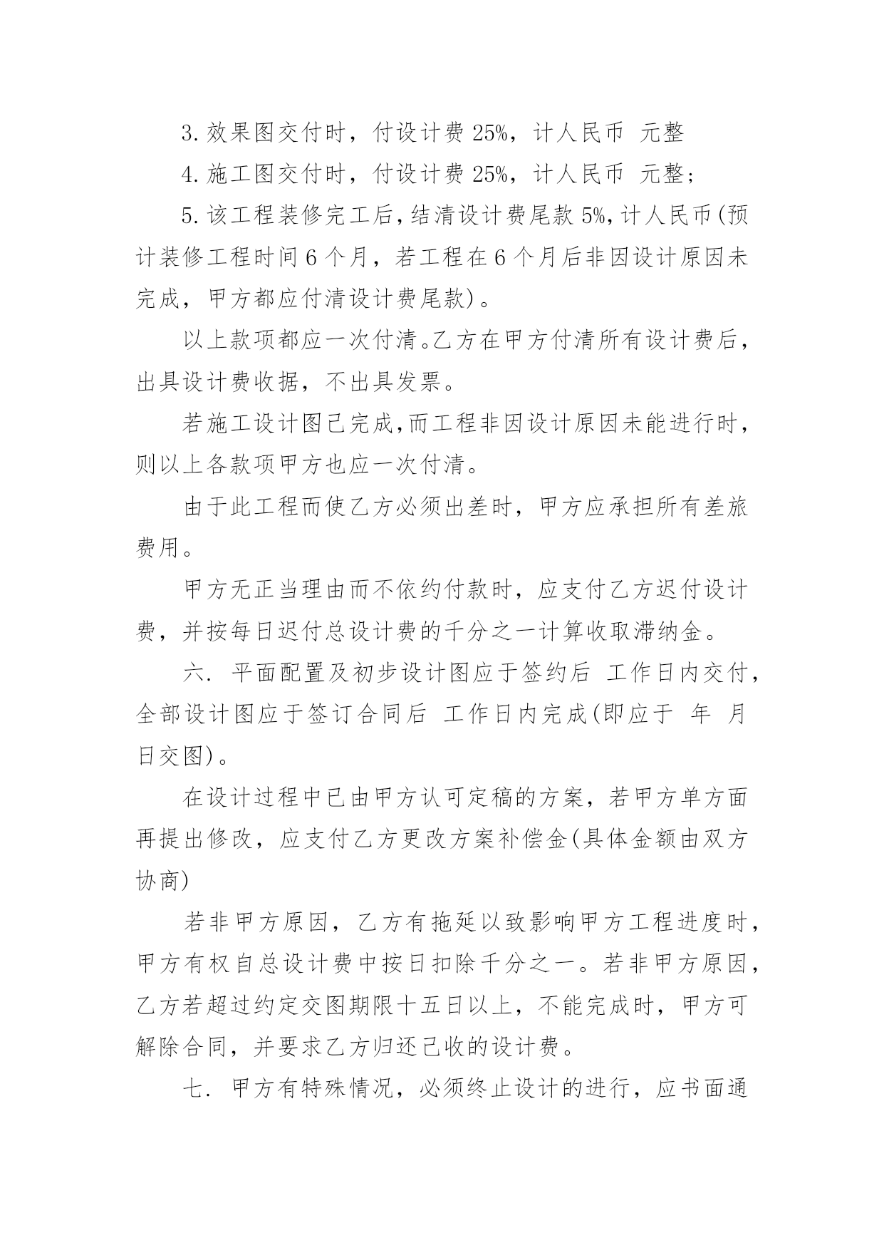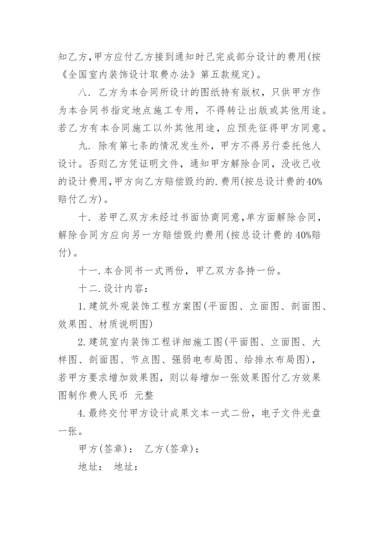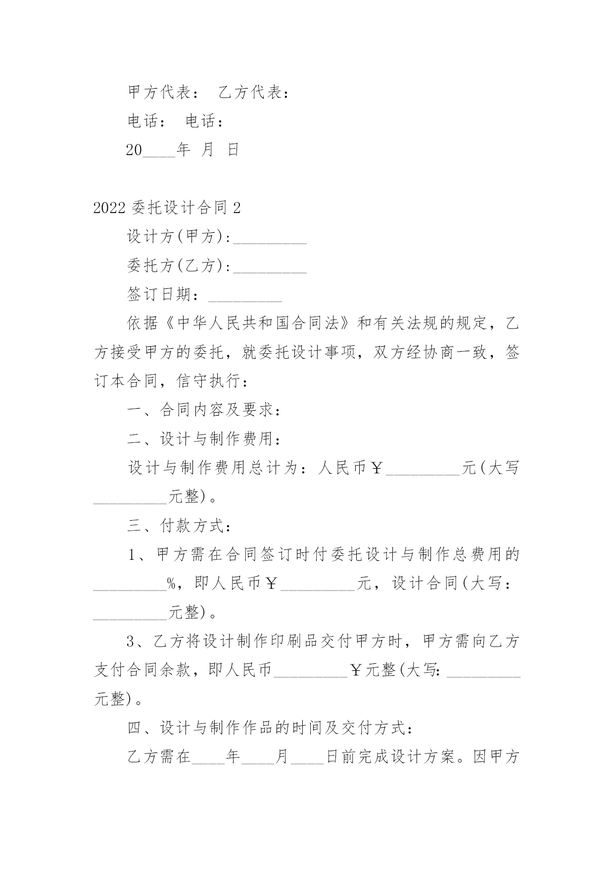 委托设计合同2022委托设计合同15篇随着人们法律观念的日益增强,合同的地位越来越不容忽视,正常情况下,签订合同必须经过规定的方式。那么合同书的格式,你掌握了吗?以下是小编为大家整理的2022委托设计合同,希望能够帮助到大家。2022委托设计合同1确立设计委托合同书单位:甲方:乙方:兹为甲方委托乙方担任建筑外观装饰、室内装饰方案设计及施工图纸设计工作,双方同意遵守下列条款:一.室内装饰工程地点:项目建筑平面面积合计约平方米二.装饰工程设计项目:三.乙方接受委托书后,应随即进行现场斟测,并根据甲方提供资料办理下列事宜。(参照双方协商设计内容十二项)乙方提出的设计方案必须经甲方审核,参照甲方意见进行修改,在协商基础上达到双方满意。四.总设计费计人民币元整。五.设计费付款方式:1.签约时,付设计费20%,计人民币元整2.平面图交付时,付设计费25%,计人民币元整3.效果图交付时,付设计费25%,计人民币元整4.施工图交付时,付设计费25%,计人民币元整;5.该工程装修完工后,结清设计费尾款5%,计人民币(预计装修工程时间6个月,若工程在6个月后非因设计原因未完成,甲方都应付清设计费尾款)。以上款项都应一次付清。乙方在甲方付清所有设计费后,出具设计费收据,不出具发票。若施工设计图己完成,而工程非因设计原因未能进行时,则以上各款项甲方也应一次付清。由于此工程而使乙方必须出差时,甲方应承担所有差旅费用。甲方无正当理由而不依约付款时,应支付乙方迟付设计费,并按每日迟付总设计费的千分之一计算收取滞纳金。六.平面配置及初步设计图应于签约后工作日内交付,全部设计图应于签订合同后工作日内完成(即应于年月日交图)。在设计过程中已由甲方认可定稿的方案,若甲方单方面再提出修改,应支付乙方更改方案补偿金(具体金额由双方协商)若非甲方原因,乙方有拖延以致影响甲方工程进度时,甲方有权自总设计费中按日扣除千分之一。若非甲方原因,乙方若超过约定交图期限十五日以上,不能完成时,甲方可解除合同,并要求乙方归还己收的设计费。七.甲方有特殊情况,必须终止设计的进行,应书面通知乙方,甲方应付乙方接到通知时己完成部分设计的费用(按《全国室内装饰设计取费办法》第五款规定)。八.乙方为本合同所设计的图纸持有版权,只供甲方作为本合同书指定地点施工专用,不得转让出版或其他用途。若乙方有本合同施工以外其他用途,应预先征得甲方同意。九.除有第七条的情况发生外,甲方不得另行委托他人设计。否则乙方凭证明文件,通知甲方解除合同,没收己收的设计费用,甲方向乙方赔偿毁约的.费用(按总设计费的40%赔付乙方)。十.若甲乙双方未经过书面协商同意,单方面解除合同,解除合同方应向另一方赔偿毁约费用(按总设计费的40%赔付)。十一.本合同书一式两份,甲乙双方各持一份。十二.设计内容:1.建筑外观装饰工程方案图(平面图、立面图、剖面图、效果图、材质说明图)2.建筑室内装饰工程详细施工图(平面图、立面图、大样图、剖面图、节点图、强弱电布局图、给排水布局图),若甲方要求增加效果图,则以每增加一张效果图付乙方效果图制作费人民币元整4.最终交付甲方设计成果文本一式二份,电子文件光盘一张。甲方(签章):乙方(签章):地址:地址:甲方代表:乙方代表:电话:电话:20____年月日2022委托设计合同2设计方(甲方):_________委托方(乙方):_________签订日期:_________依据《中华人民共和国合同法》和有关法规的规定,乙方接受甲方的委托,就委托设计事项,双方经协商一致,签订本合同,信守执行:一、合同内容及要求:二、设计与制作费用:设计与制作费用总计为:人民币¥_________元(大写_________元整)。三、付款方式:1、甲方需在合同签订时付委托设计与制作总费用的_________%,即人民币¥_________元,设计合同(大写:_________元整)。3、乙方将设计制作印刷品交付甲方时,甲方需向乙方支付合同余款,即人民币_________¥元整(大写:_________元整)。四、设计与制作作品的时间及交付方式:乙方需在____年____月____日前完成设计方案。因甲方反复提出修改意见导致乙方工作不能按时完成时,可延期执行,延期时间由双方协商确定。五、知识产权约定:1、甲方在未付清所有委托设计制作费用之前,乙方设计的作品著作权归乙方,甲方对该作品不享有任何权利。2、甲方将委托设计制作的所有费用结算完毕后,甲方拥有作品的所有权、使用权和修改权。六、甲方的权利义务:1、甲方有权对乙方的`设计提出建议和思路,以使乙方设计的作品更符合甲方企业文化内涵。2、甲方有权对乙方所设计的作品提出修改意见;3、甲方在付清所有设计费用后享有设计作品的所有权、使用权和修改权;4、甲方有义务按照合同约定支付