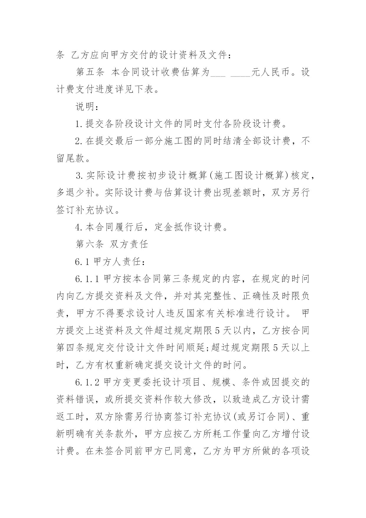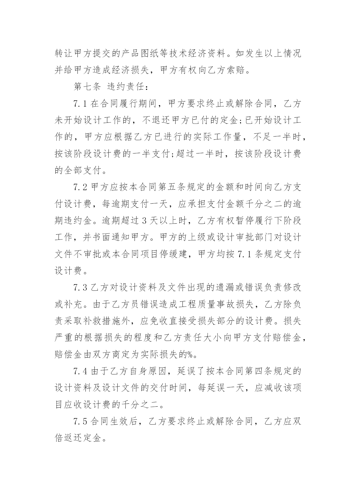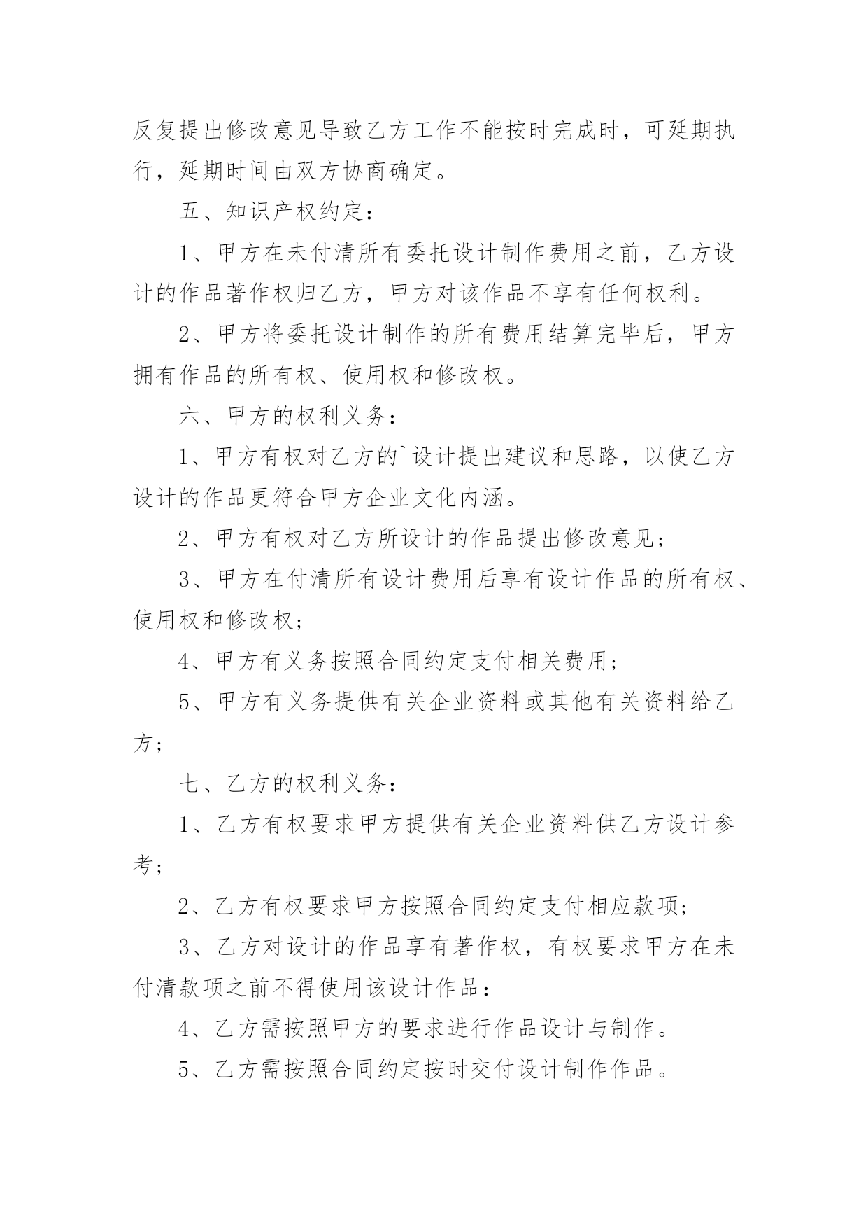 委托设计合同2022委托设计合同15篇随着人们法律观念的日益增强,合同的地位越来越不容忽视,正常情况下,签订合同必须经过规定的方式。那么合同书的格式,你掌握了吗?以下是小编为大家整理的2022委托设计合同,希望能够帮助到大家。2022委托设计合同1确立设计委托合同书单位:甲方:乙方:兹为甲方委托乙方担任建筑外观装饰、室内装饰方案设计及施工图纸设计工作,双方同意遵守下列条款:一.室内装饰工程地点:项目建筑平面面积合计约平方米二.装饰工程设计项目:三.乙方接受委托书后,应随即进行现场斟测,并根据甲方提供资料办理下列事宜。(参照双方协商设计内容十二项)乙方提出的设计方案必须经甲方审核,参照甲方意见进行修改,在协商基础上达到双方满意。四.总设计费计人民币元整。五.设计费付款方式:1.签约时,付设计费20%,计人民币元整2.平面图交付时,付设计费25%,计人民币元整3.效果图交付时,付设计费25%,计人民币元整4.施工图交付时,付设计费25%,计人民币元整;5.该工程装修完工后,结清设计费尾款5%,计人民币(预计装修工程时间6个月,若工程在6个月后非因设计原因未完成,甲方都应付清设计费尾款)。以上款项都应一次付清。乙方在甲方付清所有设计费后,出具设计费收据,不出具发票。若施工设计图己完成,而工程非因设计原因未能进行时,则以上各款项甲方也应一次付清。由于此工程而使乙方必须出差时,甲方应承担所有差旅费用。甲方无正当理由而不依约付款时,应支付乙方迟付设计费,并按每日迟付总设计费的千分之一计算收取滞纳金。六.平面配置及初步设计图应于签约后工作日内交付,全部设计图应于签订合同后工作日内完成(即应于年月日交图)。在设计过程中已由甲方认可定稿的方案,若甲方单方面再提出修改,应支付乙方更改方案补偿金(具体金额由双方协商)若非甲方原因,乙方有拖延以致影响甲方工程进度时,甲方有权自总设计费中按日扣除千分之一。若非甲方原因,乙方若超过约定交图期限十五日以上,不能完成时,甲方可解除合同,并要求乙方归还己收的设计费。七.甲方有特殊情况,必须终止设计的进行,应书面通知乙方,甲方应付乙方接到通知时己完成部分设计的费用(按《全国室内装饰设计取费办法》第五款规定)。八.乙方为本合同所设计的图纸持有版权,只供甲方作为本合同书指定地点施工专用,不得转让出版或其他用途。若乙方有本合同施工以外其他用途,应预先征得甲方同意。九.除有第七条的情况发生外,甲方不得另行委托他人设计。否则乙方凭证明文件,通知甲方解除合同,没收己收的设计费用,甲方向乙方赔偿毁约的.费用(按总设计费的40%赔付乙方)。十.若甲乙双方未经过书面协商同意,单方面解除合同,解除合同方应向另一方赔偿毁约费用(按总设计费的40%赔付)。十一.本合同书一式两份,甲乙双方各持一份。十二.设计内容:1.建筑外观装饰工程方案图(平面图、立面图、剖面图、效果图、材质说明图)2.建筑室内装饰工程详细施工图(平面图、立面图、大样图、剖面图、节点图、强弱电布局图、给排水布局图),若甲方要求增加效果图,则以每增加一张效果图付乙方效果图制作费人民币元整4.最终交付甲方设计成果文本一式二份,电子文件光盘一张。甲方(签章):乙方(签章):地址:地址:甲方代表:乙方代表:电话:电话:20____年月日2022委托设计合同2设计方(甲方):_________委托方(乙方):_________签订日期:_________依据《中华人民共和国合同法》和有关法规的规定,乙方接受甲方的委托,就委托设计事项,双方经协商一致,签订本合同,信守执行:一、合同内容及要求:二、设计与制作费用:设计与制作费用总计为:人民币¥_________元(大写_________元整)。三、付款方式:1、甲方需在合同签订时付委托设计与制作总费用的_________%,即人民币¥_________元,设计合同(大写:_________元整)。3、乙方将设计制作印刷品交付甲方时,甲方需向乙方支付合同余款,即人民币_________¥元整(大写:_________元整)。四、设计与制作作品的时间及交付方式:乙方需在____年____月____日前完成设计方案。因甲方反复提出修改意见导致乙方工作不能按时完成时,可延期执行,延期时间由双方协商确定。五、知识产权约定:1、甲方在未付清所有委托设计制作费用之前,乙方设计的作品著作权归乙方,甲方对该作品不享有任何权利。2、甲方将委托设计制作的所有费用结算完毕后,甲方拥有作品的所有权、使用权和修改权。六、甲方的权利义务:1、甲方有权对乙方的`设计提出建议和思路,以使乙方设计的作品更符合甲方企业文化内涵。2、甲方有权对乙方所设计的作品提出修改意见;3、甲方在付清所有设计费用后享有设计作品的所有权、使用权和修改权;4、甲方有义务按照合同约定支付