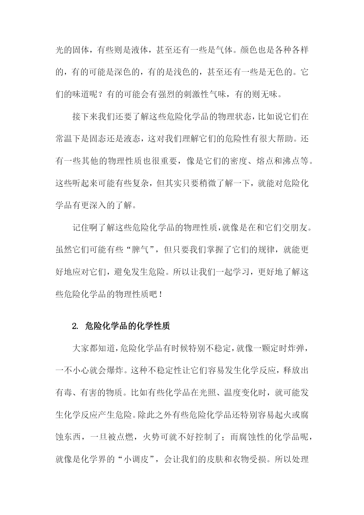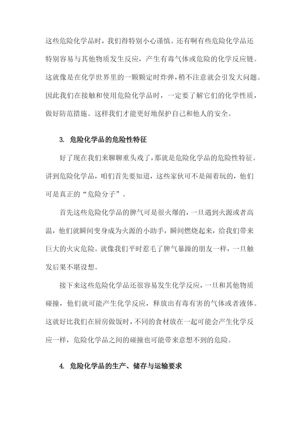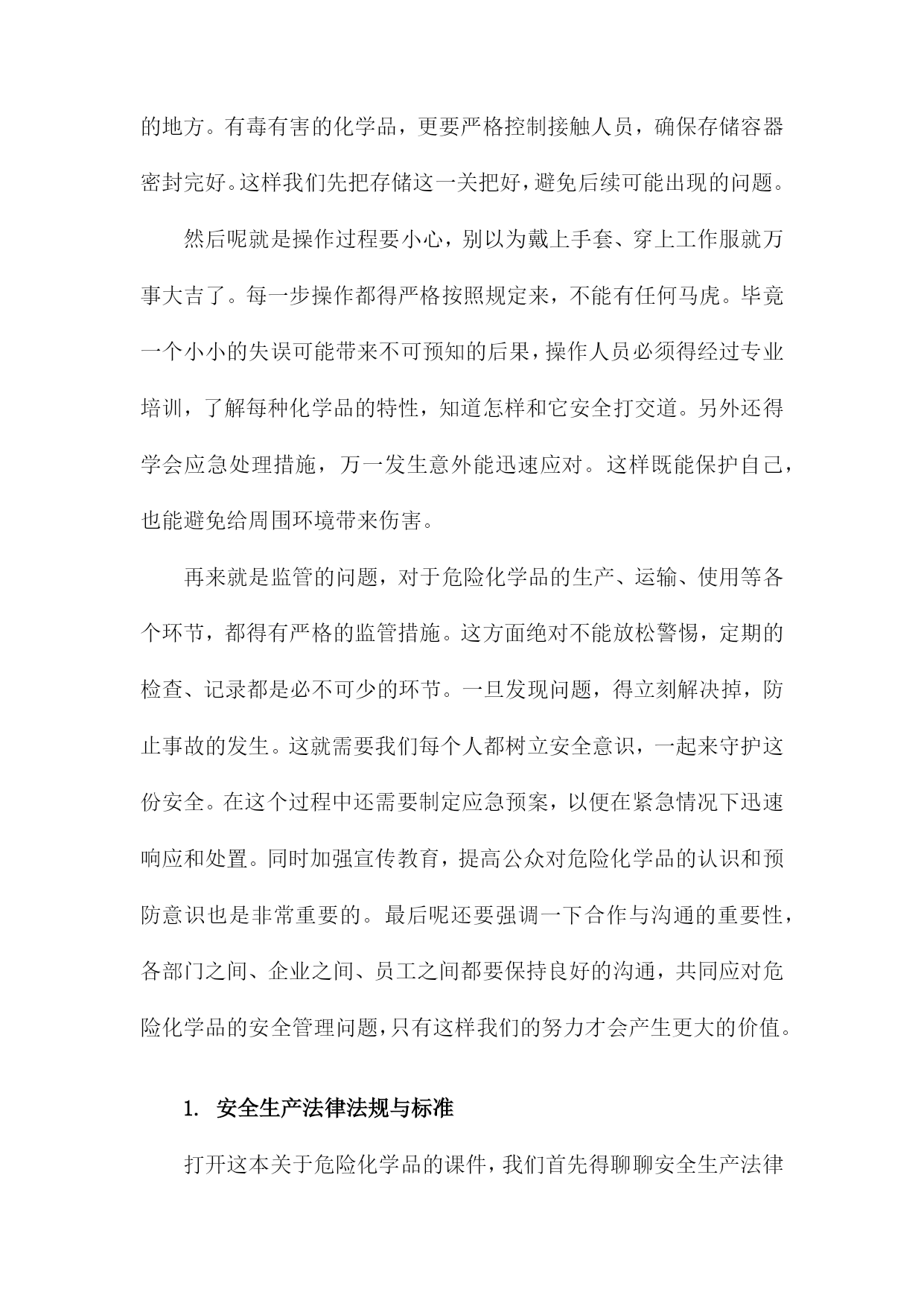 《危险化学品》课件一、课程介绍欢迎来到我们的《危险化学品》课程!这一课是为那些对危险化学品感兴趣或者在工作中需要接触危险化学品的朋友们精心设计的。危险化学品的特性和安全操作是我们日常生活中不可忽视的重要知识点,无论是工业生产还是实验室研究,都需要对它们有深入的了解。在这门课程中,我们将一起探讨危险化学品的种类、性质以及如何处理这些化学品的安全知识。我们将从基础概念出发,逐步深入到实际的应用和操作。通过学习你将能够了解到如何正确存储、运输和使用危险化学品,以及一旦遇到突发情况,应该如何迅速、有效地应对。1.课程背景与目的一提到课程背景呢,我们知道随着社会工业化的进程加速,越来越多的化学产品和原材料在生产生活中得到了广泛应用。而在这个过程中,如果不对这些危险化学品的特性和风险进行了解和管理,就可能引发安全事故。因此无论是为了保障工业生产的安全运行,还是为了保护我们每个人的生命财产安全,都需要普及和提高大家对危险化学品的认知和应对能力。这也正是我们开设这门课程的目的所在。说到具体目的呢,简单来说就是帮助大家认识危险化学品。了解它们是什么、性质如何、有哪些潜在风险以及如何安全地操作和管理它们。通过这门课程的学习呢,大家不仅可以掌握危险化学品的基础知识,还能学会如何预防和处理危险化学品带来的风险。这样不管是在工作还是在生活中,都能更好地保护自己和他人的安全。总的来说呢,《危险化学品》这门课程是非常实用的,它能帮助我们更好地应对生活中的各种风险和挑战。让我们一起学习这门课程吧!2.危险化学品定义及分类接下来让我们了解一下什么是危险化学品,其实危险化学品就是我们生活中常听到的一些容易引发危险或伤害的物质。它们可能存在于我们的日常生活用品中,也可能出现在工业生产环境中。这些物质因其特殊的性质,如果被不当使用或处理不当,就可能会对人造成危害或对周围环境造成污染。那么这些物质是怎么分类的呢?别担心我们一起来揭晓答案。首先我们要知道危险化学品可以根据其性质进行分类,常见的分类方式包括易燃易爆物质、有毒有害物质等。这些物质可能很容易燃烧甚至爆炸,也可能在接触后对人体造成伤害或导致中毒。因此了解这些物质的特性和分类是非常重要的,在实际生活中,我们应当格外注意这些物质的存放和使用方法,避免发生意外事故。只有这样我们才能更好地保护自己和他人的安全,让我们继续努力学习有关危险化学品的更多知识吧!为了我们的生活更加安全!好了我们接着往下学习,下一部分我们将探讨危险化学品的常见特性以及防范措施等内容。希望大家都能认真对待危险化学品的安全问题哦!为了我们的生活环境和我们的生命安全哦!放心地往前走,不走寻常路只适用于日常的小确幸场景,当涉及到安全时,每一步都要稳稳当当哦!大家准备好了吗?让我们一起进入下一个章节吧!3.危险化学品的重要性和管理要求我们的生活离不开各种各样的物品,有些虽然看似普通,但却隐藏着巨大的危险。今天我们要聊的就是这些特殊的物品——危险化学品。它们可能就在我们身边,虽然它们带来了不小的风险,但同时也发挥着不可或缺的重要作用。让我们一起揭开它们的神秘面纱。管理危险化学品可不是一件轻松的事情,首先我们需要了解每一种危险化学品的特性和危害。只有知道了它们的脾气和性格,我们才能对症下药,找到正确的使用方法和管理方法。其次使用危险化学品的时候,必须遵守严格的操作规程和安全标准。绝不能因为一时的疏忽大意,造成不可挽回的后果。此外储存和运输危险化学品也需要特别小心,要确保它们不被错误地处理或误用,也要防止它们因为不当的储存和运输条件而引发事故。同时我们还需要定期对危险化学品进行检查和维护,确保它们始终处于安全可控的状态。并且提高公众对危险化学品的认知也是至关重要的,只有当大家都了解这些危险化学品的特性和风险时,我们才能共同维护一个安全的生活环境。所以让我们一起行动起来,共同管理好身边的危险化学品吧!二、危险化学品基础知识首先咱们得知道这些危险化学品的来源,这些家伙一般是工业制造、科学实验或是日常生活中使用的原料、产品等。它们看似普通,但在不当操作或存储条件下,就可能暴露出它们的危险性。比如有些化学品在高温下容易燃烧甚至爆炸,有的则是遇到水就会发生反应变得危险。再比如一些化学品看起来很安全的气体或液体,但它们如果泄漏出来和空气混合在一起,可能会引发火灾或爆炸事故。再来聊聊它们常见的分类,大致上可以分为几大类:易燃易爆的化学品、有毒有害的化学品等。当然每种化学品都有自己的特性,比如有些酸性或碱性特别强,有的则是腐蚀性的。这些特性都是咱们需要注意的,因为它们都可能给我们带来伤害。1.危险化学品的物理性质首先我们要知道这些危险化学品有些什么形状,有些像是闪闪发光的固体,有些则是液体,甚至还有一些是气体。颜色也是各种各样的,有的可能是