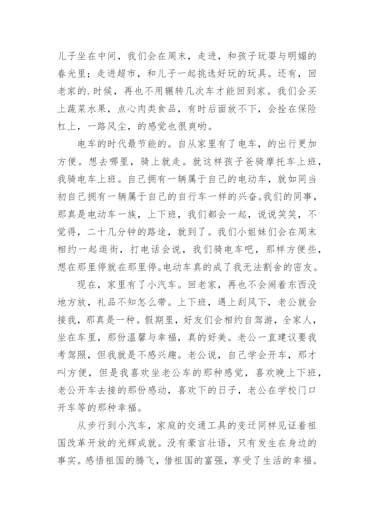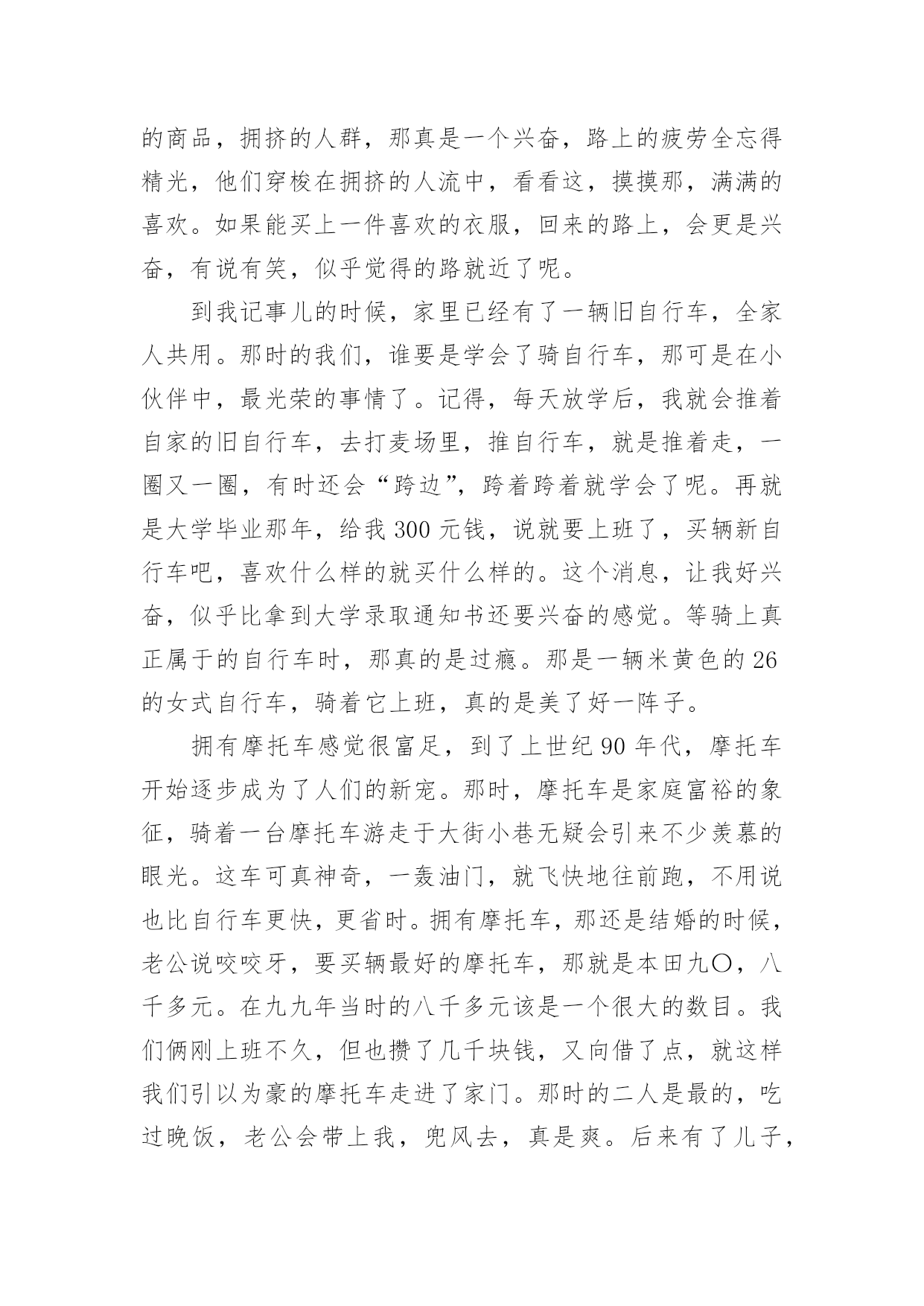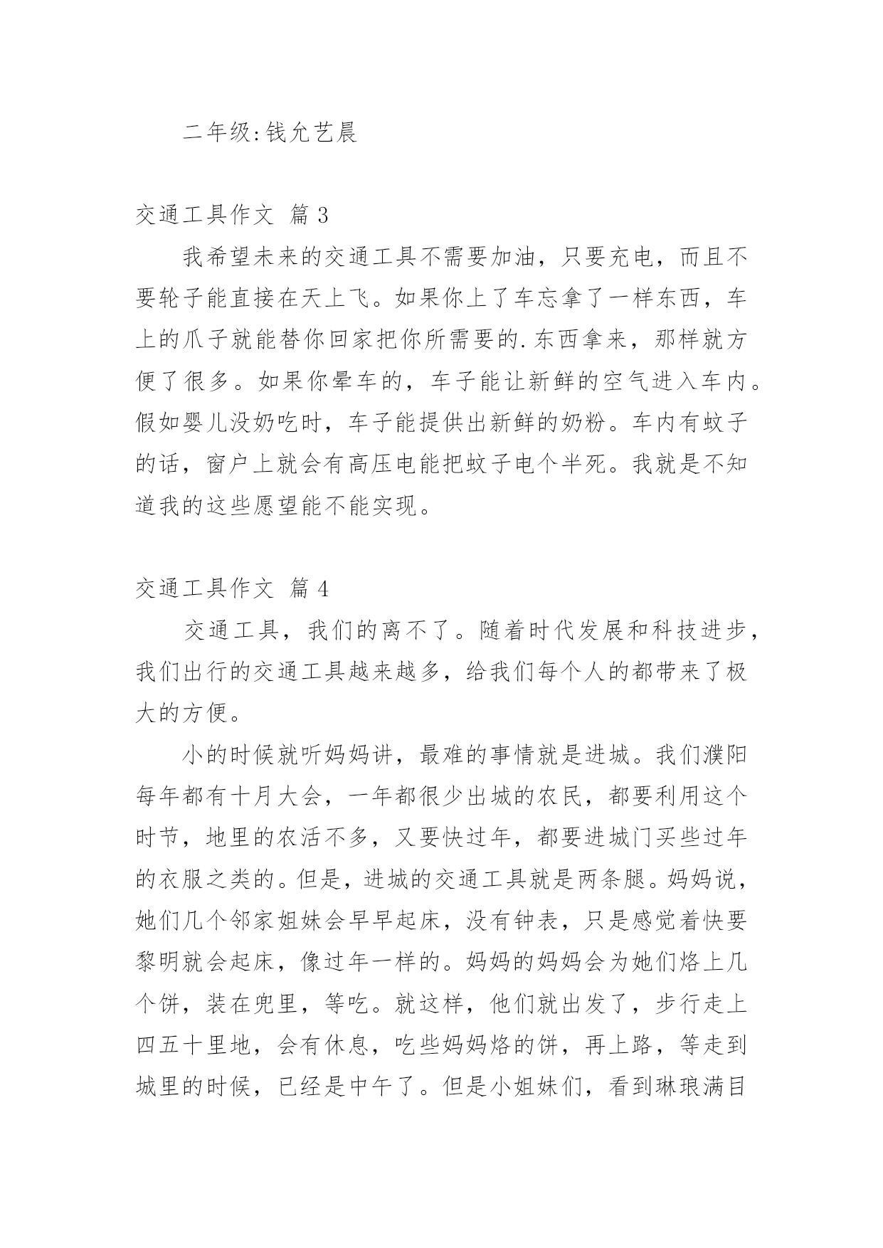交通工具作文【精选】交通工具作文在日常的学习、工作、生活中,大家都不可避免地会接触到作文吧,写作文是培养人们的观察力、联想力、想象力、思考力和记忆力的重要手段。那么你有了解过作文吗?以下是小编帮大家整理的交通工具作文4篇,希望对大家有所帮助。交通工具作文篇1二年级语文下册P138页说说写写:你希望未来的交通工具是什么样子的?展开想象画一画,再写一写。我发明的塔车在二十二世纪就会被人们普遍使用了。塔车是未来的月亮小学的班车。塔车高耸入云,塔顶上插着两只巨大的翅膀,离太阳就几亿公里呢。因为塔车离太阳近,所以使用的能源是太阳能。塔车底下是跟公共汽车差不多,不过车顶有一种特制胶,用它粘起东西来,坚固无比。我用这种胶来粘乘客坐的像塔一样的.客房,客房上有塔车车顶,这种车顶有三大特点:防雨,防晒,防冻。塔车的颜色如同彩虹一般,非常漂亮。塔车是由一种软塑料做成的,这可不是普通的软塑料。有了它,人们就可以穿墙而入了。月亮小学全体师生都住在月亮上,在火星上上学,如果他们想从月亮到火星上,那还不容易?塔车从火星到月亮之后,会停在半空中,这样伸手就能摸到月亮了。从月亮下来时,只要抓住塔顶上的绳子,脚碰到你在的那一层,就能进去了。塔车每分钟约跑一千公里,如果从月亮跑到火星的正下方,塔顶上的翅膀会自动飞起来,让车停在离火星不远的白云上,用力往上一跳,就可以到火星上上学了。怎么样,我发明的塔车不错吧?交通工具作文篇2未来的交通工具是中国制造的海陆空超光速飞碟。它的外表就像一个大大的盘子上面放了一块半圆形的蛋糕。飞碟的前面有三个大大的照明灯,碟身上有两个翅膀,翅膀上面有星星样子的花纹。飞碟的下面有四个轮子,后面有个喷气装置。碟身上面还印有一面鲜红的五星红旗,红旗旁边写着英文版的“中国制造”。海陆空超光速飞碟可以在陆地上奔跑,还可以潜入海底、飞上太空。它的速度比光还快,想去哪,瞬间就可以到。它不用加油,只用吸收太阳的能量就行了。它的里面有三层,最下面一层是厨房和储存东西的地方,第二层是卧室和浴室,第三层是飞行操作室、客厅和休闲娱乐的地方。最在特点的就是第三层了,它的外表是一个巨大的'透明玻璃罩。白天可以观看外面的风景,到了晚上,它就用白天吸收的太阳光的能量,把客厅变得和白天一样明亮。这就是未来的交通工具海陆空超光速飞碟,它可以让我们的交通变得更方便,生活变得更舒适、更美好!二年级:钱允艺晨交通工具作文篇3我希望未来的交通工具不需要加油,只要充电,而且不要轮子能直接在天上飞。如果你上了车忘拿了一样东西,车上的爪子就能替你回家把你所需要的.东西拿来,那样就方便了很多。如果你晕车的,车子能让新鲜的空气进入车内。假如婴儿没奶吃时,车子能提供出新鲜的奶粉。车内有蚊子的话,窗户上就会有高压电能把蚊子电个半死。我就是不知道我的这些愿望能不能实现。交通工具作文篇4交通工具,我们的离不了。随着时代发展和科技进步,我们出行的交通工具越来越多,给我们每个人的都带来了极大的方便。小的时候就听妈妈讲,最难的事情就是进城。我们濮阳每年都有十月大会,一年都很少出城的农民,都要利用这个时节,地里的农活不多,又要快过年,都要进城门买些过年的衣服之类的。但是,进城的交通工具就是两条腿。妈妈说,她们几个邻家姐妹会早早起床,没有钟表,只是感觉着快要黎明就会起床,像过年一样的。妈妈的妈妈会为她们烙上几个饼,装在兜里,等吃。就这样,他们就出发了,步行走上四五十里地,会有休息,吃些妈妈烙的饼,再上路,等走到城里的时候,已经是中午了。但是小姐妹们,看到琳琅满目的商品,拥挤的人群,那真是一个兴奋,路上的疲劳全忘得精光,他们穿梭在拥挤的人流中,看看这,摸摸那,满满的喜欢。如果能买上一件喜欢的衣服,回来的路上,会更是兴奋,有说有笑,似乎觉得的路就近了呢。到我记事儿的时候,家里已经有了一辆旧自行车,全家人共用。那时的我们,谁要是学会了骑自行车,那可是在小伙伴中,最光荣的事情了。记得,每天放学后,我就会推着自家的旧自行车,去打麦场里,推自行车,就是推着走,一圈又一圈,有时还会“跨边”,跨着跨着就学会了呢。再就是大学毕业那年,给我300元钱,说就要上班了,买辆新自行车吧,喜欢什么样的就买什么样的。这个消息,让我好兴奋,似乎比拿到大学录取通知书还要兴奋的感觉。等骑上真正属于的自行车时,那真的是过瘾。那是一辆米黄色的26的女式自行车,骑着它上班,真的是美了好一阵子。拥有摩托车感觉很富足,到了上世纪90年代,摩托车开始逐步成为了人们的新宠。那时,摩托车是家庭富裕的象征,骑着一台摩托车游走于大街小巷无疑会引来不少羡慕的眼光。这车可真神奇,一轰油门,就飞快地往前跑,不用说也比自行车更快,更省时。拥有摩托车,那还是结婚的时候,老公说咬咬牙,要买辆最好的摩托车,那就是本田九〇,八千多元。在九九年当时的八千多元该是一个很大的数目