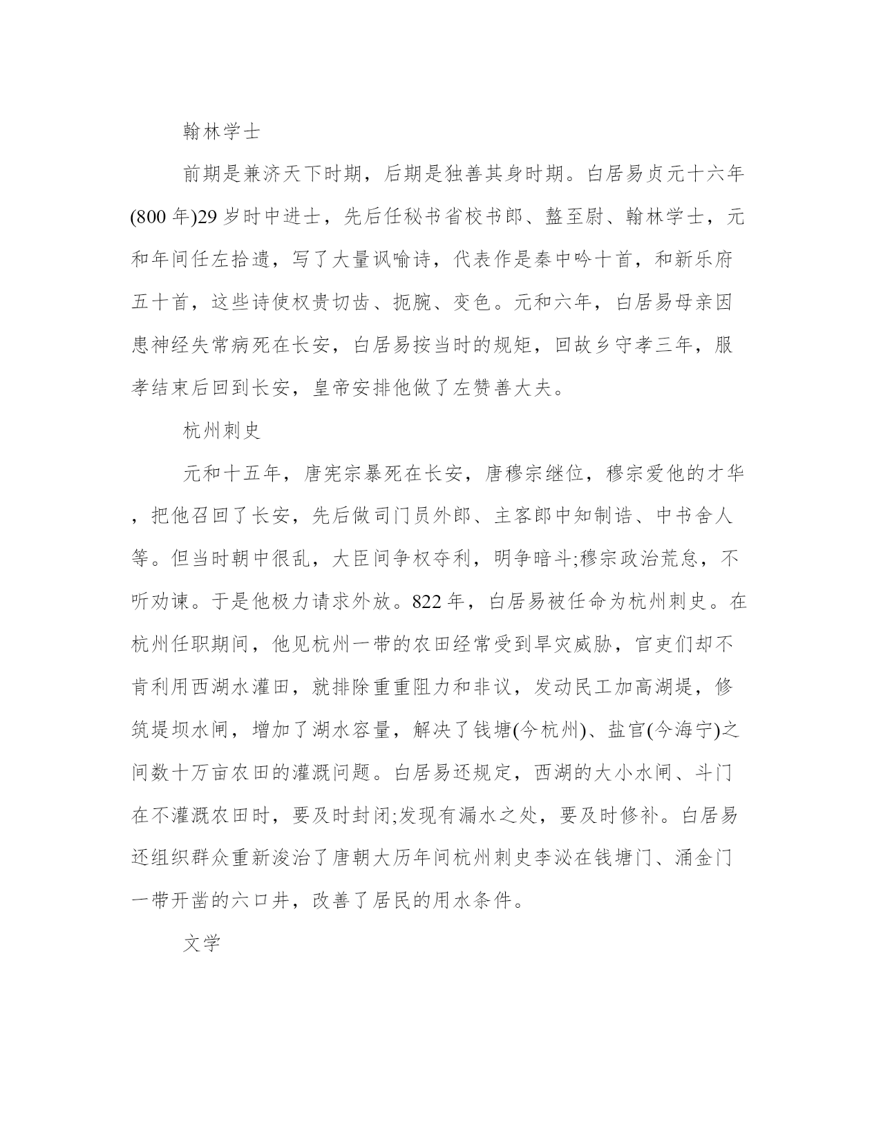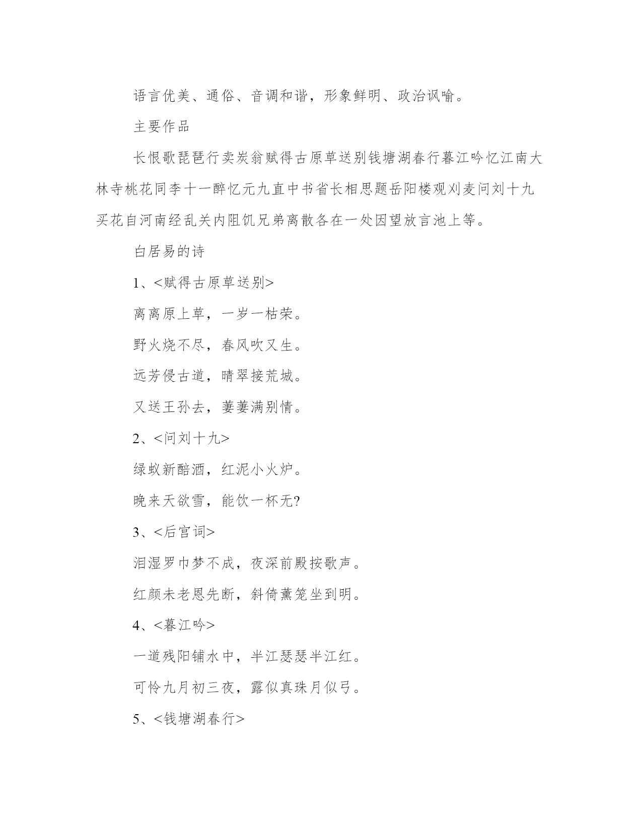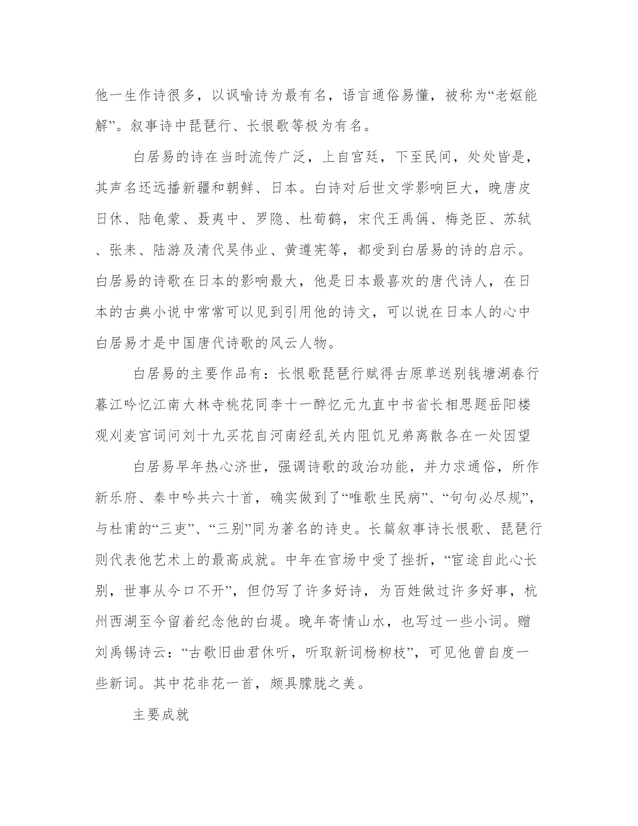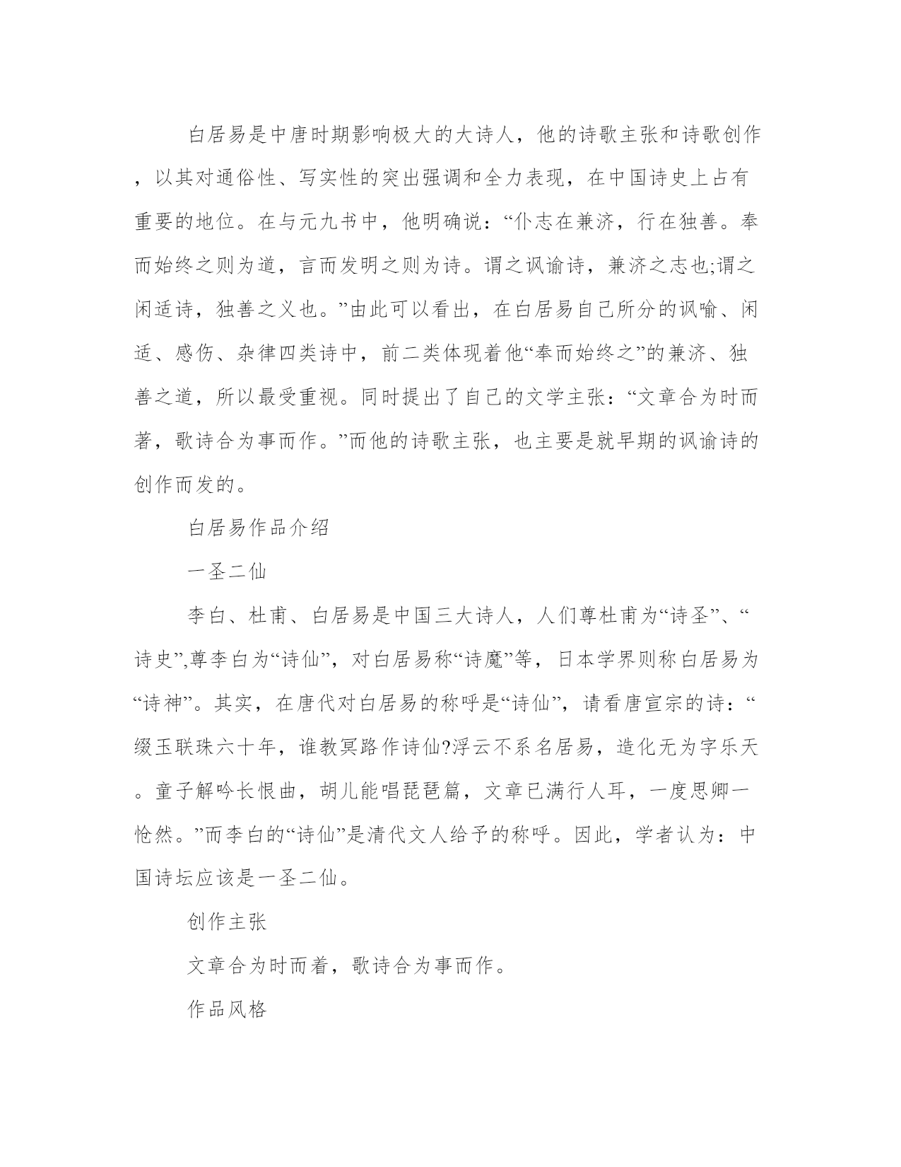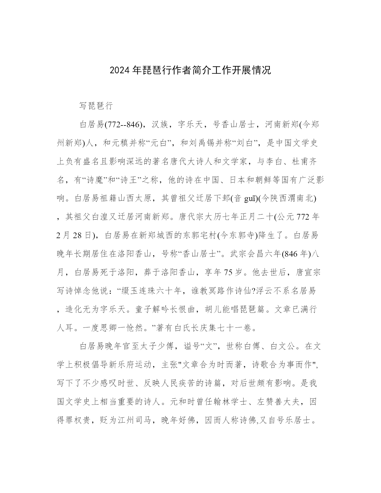 2024年琵琶行作者简介工作开展情况写琵琶行白居易(772--846),汉族,字乐天,号香山居士,河南新郑(今郑州新郑)人,和元稹并称“元白”,和刘禹锡并称“刘白”,是中国文学史上负有盛名且影响深远的著名唐代大诗人和文学家,与李白、杜甫齐名,有“诗魔”和“诗王”之称,他的诗在中国、日本和朝鲜等国有广泛影响。白居易祖籍山西太原,其曾祖父迁居下邽(音guī)(今陕西渭南北),其祖父白湟又迁居河南新郑。唐代宗大历七年正月二十(公元772年2月28日),白居易在新郑城西的东郭宅村(今东郭寺)降生了。白居易晚年长期居住在洛阳香山,号称“香山居士”。武宗会昌六年(846年)八月,白居易死于洛阳,葬于洛阳香山,享年75岁。他去世后,唐宣宗写诗悼念他说:“缀玉连珠六十年,谁教冥路作诗仙?浮云不系名居易,造化无为字乐天。童子解吟长恨曲,胡儿能唱琵琶篇。文章已满行人耳。一度思卿一怆然。”著有白氏长庆集七十一卷。白居易晚年官至太子少傅,谥号“文”,世称白傅、白文公。在文学上积极倡导新乐府运动,主张"文章合为时而著,诗歌合为事而作",写下了不少感叹时世、反映人民疾苦的诗篇,对后世颇有影响。是我国文学史上相当重要的诗人。元和时曾任翰林学士、左赞善大夫,因得罪权贵,贬为江州司马,晚年好佛,因而人称诗佛,又自号乐居士。他一生作诗很多,以讽喻诗为最有名,语言通俗易懂,被称为“老妪能解”。叙事诗中琵琶行、长恨歌等极为有名。白居易的诗在当时流传广泛,上自宫廷,下至民间,处处皆是,其声名还远播新疆和朝鲜、日本。白诗对后世文学影响巨大,晚唐皮日休、陆龟蒙、聂夷中、罗隐、杜荀鹤,宋代王禹偁、梅尧臣、苏轼、张耒、陆游及清代吴伟业、黄遵宪等,都受到白居易的诗的启示。白居易的诗歌在日本的影响最大,他是日本最喜欢的唐代诗人,在日本的古典小说中常常可以见到引用他的诗文,可以说在日本人的心中白居易才是中国唐代诗歌的风云人物。白居易的主要作品有:长恨歌琵琶行赋得古原草送别钱塘湖春行暮江吟忆江南大林寺桃花同李十一醉忆元九直中书省长相思题岳阳楼观刈麦宫词问刘十九买花自河南经乱关内阻饥兄弟离散各在一处因望白居易早年热心济世,强调诗歌的政治功能,并力求通俗,所作新乐府、秦中吟共六十首,确实做到了“唯歌生民病”、“句句必尽规”,与杜甫的“三吏”、“三别”同为著名的诗史。长篇叙事诗长恨歌、琵琶行则代表他艺术上的最高成就。中年在官场中受了挫折,“宦途自此心长别,世事从今口不开”,但仍写了许多好诗,为百姓做过许多好事,杭州西湖至今留着纪念他的白堤。晚年寄情山水,也写过一些小词。赠刘禹锡诗云:“古歌旧曲君休听,听取新词杨柳枝”,可见他曾自度一些新词。其中花非花一首,颇具朦胧之美。主要成就翰林学士前期是兼济天下时期,后期是独善其身时期。白居易贞元十六年(800年)29岁时中进士,先后任秘书省校书郎、盩至尉、翰林学士,元和年间任左拾遗,写了大量讽喻诗,代表作是秦中吟十首,和新乐府五十首,这些诗使权贵切齿、扼腕、变色。元和六年,白居易母亲因患神经失常病死在长安,白居易按当时的规矩,回故乡守孝三年,服孝结束后回到长安,皇帝安排他做了左赞善大夫。杭州刺史元和十五年,唐宪宗暴死在长安,唐穆宗继位,穆宗爱他的才华,把他召回了长安,先后做司门员外郎、主客郎中知制诰、中书舍人等。但当时朝中很乱,大臣间争权夺利,明争暗斗;穆宗政治荒怠,不听劝谏。于是他极力请求外放。822年,白居易被任命为杭州刺史。在杭州任职期间,他见杭州一带的农田经常受到旱灾威胁,官吏们却不肯利用西湖水灌田,就排除重重阻力和非议,发动民工加高湖堤,修筑堤坝水闸,增加了湖水容量,解决了钱塘(今杭州)、盐官(今海宁)之间数十万亩农田的灌溉问题。白居易还规定,西湖的大小水闸、斗门在不灌溉农田时,要及时封闭;发现有漏水之处,要及时修补。白居易还组织群众重新浚治了唐朝大历年间杭州刺史李泌在钱塘门、涌金门一带开凿的六口井,改善了居民的用水条件。文学白居易是中唐时期影响极大的大诗人,他的诗歌主张和诗歌创作,以其对通俗性、写实性的突出强调和全力表现,在中国诗史上占有重要的地位。在与元九书中,他明确说:“仆志在兼济,行在独善。奉而始终之则为道,言而发明之则为诗。谓之讽谕诗,兼济之志也;谓之闲适诗,独善之义也。”由此可以看出,在白居易自己所分的讽喻、闲适、感伤、杂律四类诗中,前二类体现着他“奉而始终之”的兼济、独善之道,所以最受重视。同时提出了自己的文学主张:“文章合为时而著,歌诗合为事而作。”而他的诗歌主张,也主要是就早期的讽谕诗的创作而发的。白居易作品介绍一圣二仙李白、杜甫、白居易是中国三大诗人,人们尊杜甫为“诗圣”、“诗史”,尊李白为“诗仙”,对白居易称“诗魔”等,日本学界则称白居易为“诗神”。其实,在唐代对白居易的称呼是“诗仙”