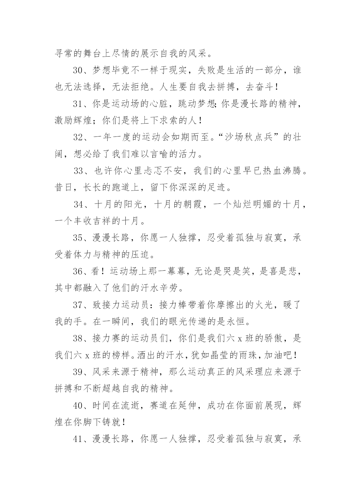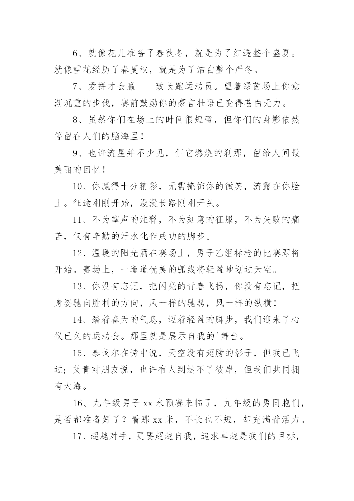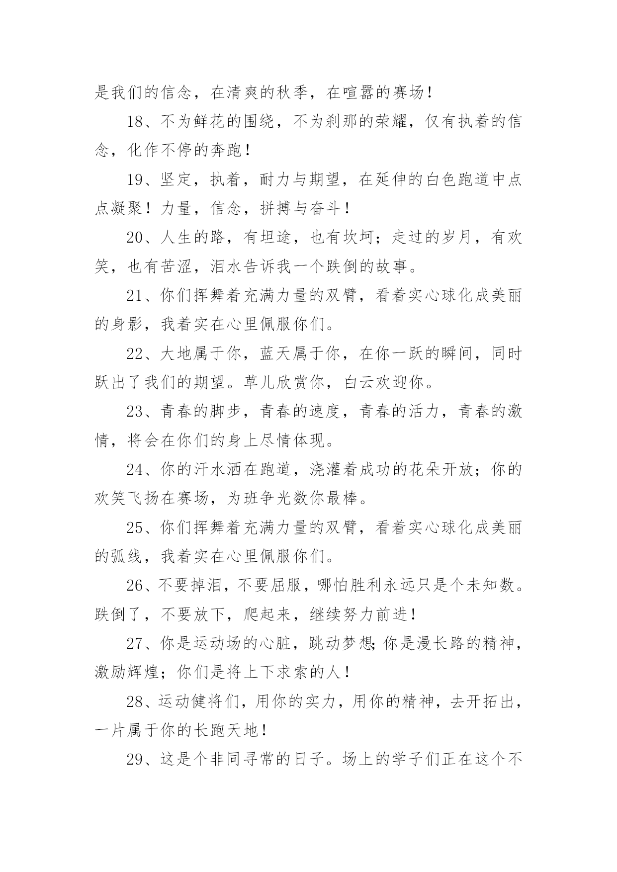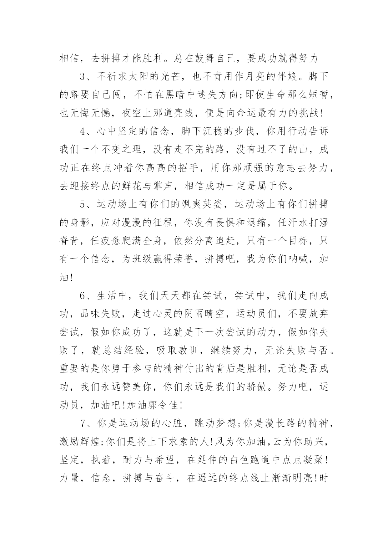 运动会加油稿运动会加油稿(精)在学习、工作生活中,越来越多地方需要用到加油稿,加油稿可以起到鼓励场上的人、增添其信心的作用。你写加油稿时总是无从下笔?以下是小编收集整理的运动会加油稿,欢迎阅读,希望大家能够喜欢。运动会加油稿1那雪白的起跑线,凝聚了你数的辛苦与汗水。那xx米的跑道对你来说是那么漫长,努力地奔跑吧!加油吧,我们将是你的坚强后盾!广阔的绿茵场,是为你们搭建的舞台。所有的.努力都是为了迎接这一刹那,所有的拼搏都是为了这一声令下。运动会加油稿21、你是我心中的英雄——有人说,运动场上狂奔的男儿,是一匹匹黑色的骏马。3、磨炼的是非凡的毅力,较量的是超常的体力,拼搏的是出类拔萃的耐力。4、深深的呼吸,等待你的是艰难的xx米。相信胜利会属于你们。5、生活中,我们每一天都在尝试;我们走向成功,品味失败,走过心灵的阴雨晴空。6、就像花儿准备了春秋冬,就是为了红透整个盛夏。就像雪花经历了春夏秋,就是为了洁白整个严冬。7、爱拼才会赢——致长跑运动员。望着绿茵场上你愈渐沉重的步伐,赛前鼓励你的豪言壮语已变得苍白无力。8、虽然你们在场上的时间很短暂,但你们的身影依然停留在人们的脑海里!9、也许流星并不少见,但它燃烧的刹那,留给人间最美丽的回忆!10、你赢得十分精彩,无需掩饰你的微笑,流露在你脸上。征途刚刚开始,漫漫长路刚刚开头。11、不为掌声的注释,不为刻意的征服,不为失败的痛苦,仅有辛勤的汗水化作成功的脚步。12、温暖的阳光洒在赛场上,男子乙组标枪的比赛即将开始。赛场上,一道道优美的弧线将轻盈地划过天空。13、你没有忘记,把闪亮的青春飞扬,你没有忘记,把身姿驰向胜利的方向,风一样的驰骋,风一样的纵横!14、踏着春天的气息,迈着轻盈的脚步,我们迎来了心仪已久的运动会。那里就是展示自我的'舞台。15、泰戈尔在诗中说,天空没有翅膀的影子,但我已飞过;艾青对朋友说,也许有人到达不了彼岸,但我们共同拥有大海。16、九年级男子xx米预赛来临了,九年级的男同胞们,是否都准备好了?看那xx米,不长也不短,却充满着活力。17、超越对手,更要超越自我,追求卓越是我们的目标,是我们的信念,在清爽的秋季,在喧嚣的赛场!18、不为鲜花的围绕,不为刹那的荣耀,仅有执着的信念,化作不停的奔跑!19、坚定,执着,耐力与期望,在延伸的白色跑道中点点凝聚!力量,信念,拼搏与奋斗!20、人生的路,有坦途,也有坎坷;走过的岁月,有欢笑,也有苦涩,泪水告诉我一个跌倒的故事。21、你们挥舞着充满力量的双臂,看着实心球化成美丽的身影,我着实在心里佩服你们。22、大地属于你,蓝天属于你,在你一跃的瞬间,同时跃出了我们的期望。草儿欣赏你,白云欢迎你。23、青春的脚步,青春的速度,青春的活力,青春的激情,将会在你们的身上尽情体现。24、你的汗水洒在跑道,浇灌着成功的花朵开放;你的欢笑飞扬在赛场,为班争光数你最棒。25、你们挥舞着充满力量的双臂,看着实心球化成美丽的弧线,我着实在心里佩服你们。26、不要掉泪,不要屈服,哪怕胜利永远只是个未知数。跌倒了,不要放下,爬起来,继续努力前进!27、你是运动场的心脏,跳动梦想;你是漫长路的精神,激励辉煌;你们是将上下求索的人!28、运动健将们,用你的实力,用你的精神,去开拓出,一片属于你的长跑天地!29、这是个非同寻常的日子。场上的学子们正在这个不寻常的舞台上尽情的展示自我的风采。30、梦想毕竟不一样于现实,失败是生活的一部分,谁也无法选择,无法拒绝。人生要自我去拼搏,去奋斗!31、你是运动场的心脏,跳动梦想;你是漫长路的精神,激励辉煌;你们是将上下求索的人!32、一年一度的运动会如期而至。“沙场秋点兵”的壮阔,想必给了我们难以言喻的活力。33、也许你心里忐忑不安,我们的心里早已热血沸腾。昔日,长长的跑道上,留下你深深的足迹。34、十月的阳光,十月的朝霞,一个灿烂明媚的十月,一个丰收吉祥的十月。35、漫漫长路,你愿一人独撑,忍受着孤独与寂寞,承受着体力与精神的压迫。36、看!运动场上那一幕幕,无论是哭是笑,是喜是悲,其中都融入了他们的汗水辛劳。37、致接力运动员:接力棒带着你摩擦出的火光,暖了我的手。在一瞬间,我们的眼光传递的是永恒。38、接力赛的运动员们,你们是我们六x班的骄傲,是我们六x班的榜样。洒出的汗水,犹如晶莹的雨珠,加油吧!39、风采来源于精神,那么运动真正的风采理应来源于拼搏和不断超越自我的精神。40、时间在流逝,赛道在延伸,成功在你面前展现,辉煌在你脚下铸就!41、漫漫长路,你愿一人独撑,忍受着孤独与寂寞,承受着体力与精神的压迫,只任汗水溶于泪水。42、生活中,我们每一天都在尝试;我们走向成功,品味失败,走过心灵的阴雨晴空。43、泥泞的路走过无数,累了,告诉自我:快了,再坚持一会儿。44、萧瑟的秋风,挡不住你们破竹的锐气,广阔的