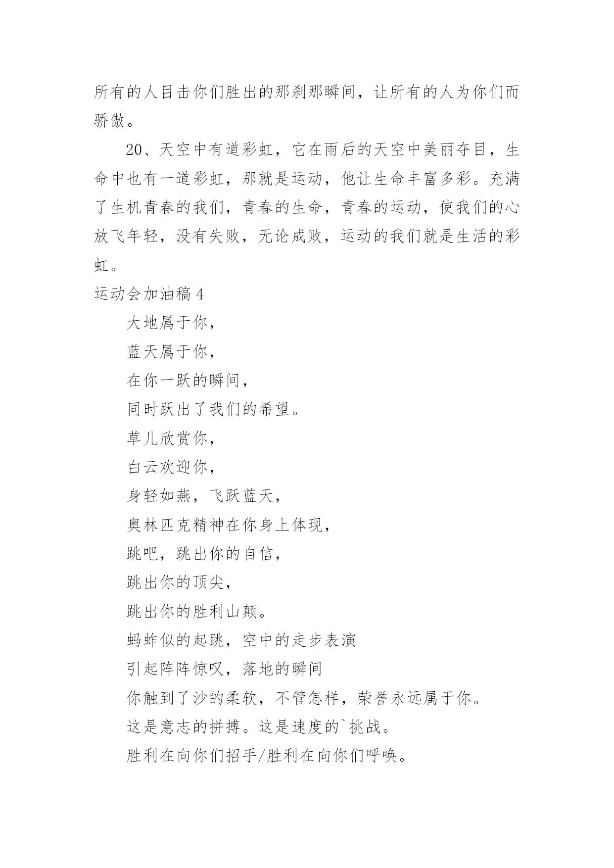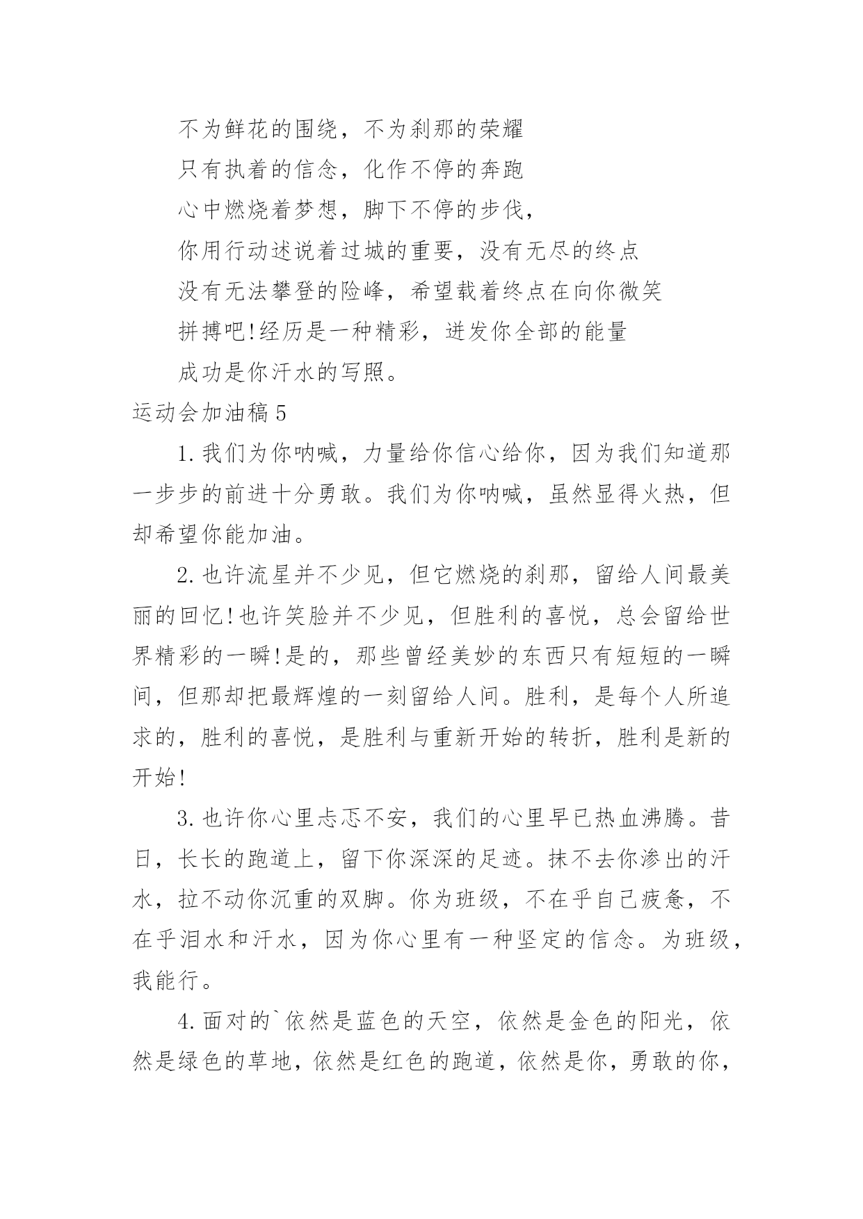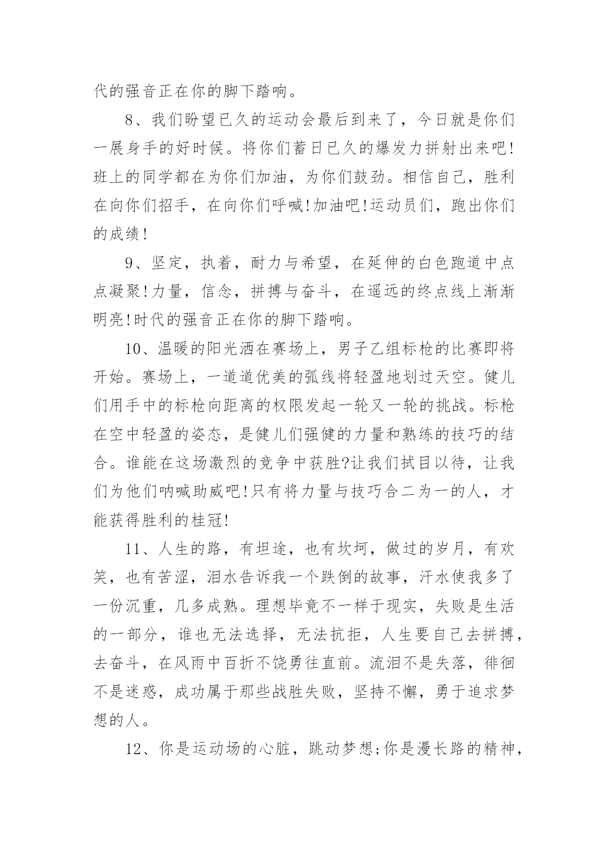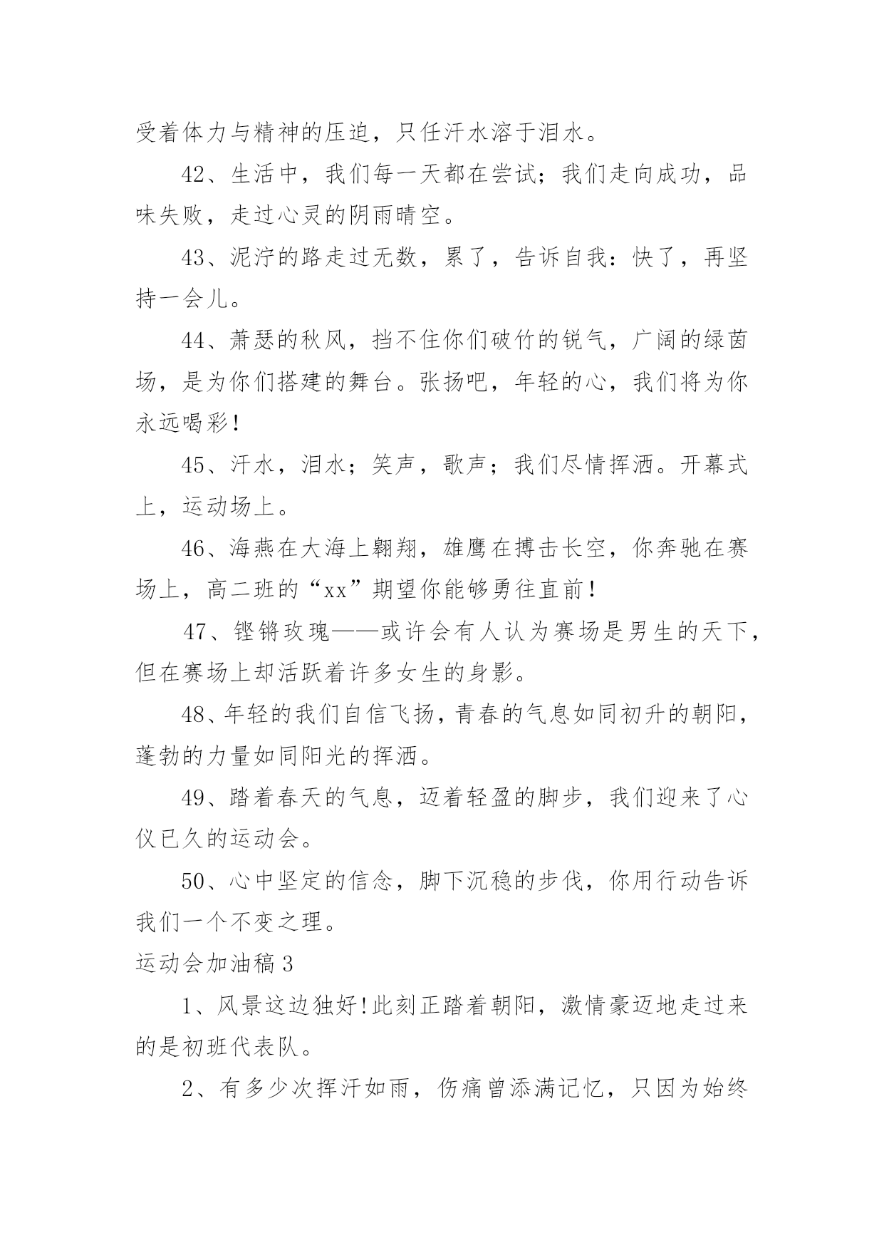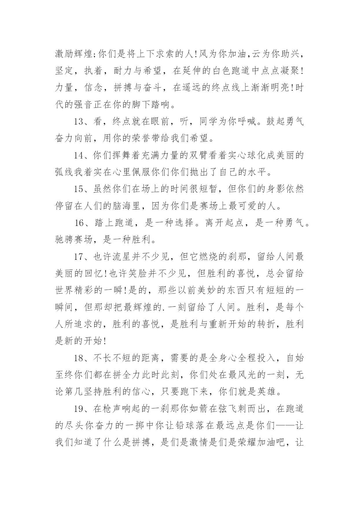 运动会加油稿运动会加油稿(精)在学习、工作生活中,越来越多地方需要用到加油稿,加油稿可以起到鼓励场上的人、增添其信心的作用。你写加油稿时总是无从下笔?以下是小编收集整理的运动会加油稿,欢迎阅读,希望大家能够喜欢。运动会加油稿1那雪白的起跑线,凝聚了你数的辛苦与汗水。那xx米的跑道对你来说是那么漫长,努力地奔跑吧!加油吧,我们将是你的坚强后盾!广阔的绿茵场,是为你们搭建的舞台。所有的.努力都是为了迎接这一刹那,所有的拼搏都是为了这一声令下。运动会加油稿21、你是我心中的英雄——有人说,运动场上狂奔的男儿,是一匹匹黑色的骏马。3、磨炼的是非凡的毅力,较量的是超常的体力,拼搏的是出类拔萃的耐力。4、深深的呼吸,等待你的是艰难的xx米。相信胜利会属于你们。5、生活中,我们每一天都在尝试;我们走向成功,品味失败,走过心灵的阴雨晴空。6、就像花儿准备了春秋冬,就是为了红透整个盛夏。就像雪花经历了春夏秋,就是为了洁白整个严冬。7、爱拼才会赢——致长跑运动员。望着绿茵场上你愈渐沉重的步伐,赛前鼓励你的豪言壮语已变得苍白无力。8、虽然你们在场上的时间很短暂,但你们的身影依然停留在人们的脑海里!9、也许流星并不少见,但它燃烧的刹那,留给人间最美丽的回忆!10、你赢得十分精彩,无需掩饰你的微笑,流露在你脸上。征途刚刚开始,漫漫长路刚刚开头。11、不为掌声的注释,不为刻意的征服,不为失败的痛苦,仅有辛勤的汗水化作成功的脚步。12、温暖的阳光洒在赛场上,男子乙组标枪的比赛即将开始。赛场上,一道道优美的弧线将轻盈地划过天空。13、你没有忘记,把闪亮的青春飞扬,你没有忘记,把身姿驰向胜利的方向,风一样的驰骋,风一样的纵横!14、踏着春天的气息,迈着轻盈的脚步,我们迎来了心仪已久的运动会。那里就是展示自我的'舞台。15、泰戈尔在诗中说,天空没有翅膀的影子,但我已飞过;艾青对朋友说,也许有人到达不了彼岸,但我们共同拥有大海。16、九年级男子xx米预赛来临了,九年级的男同胞们,是否都准备好了?看那xx米,不长也不短,却充满着活力。17、超越对手,更要超越自我,追求卓越是我们的目标,是我们的信念,在清爽的秋季,在喧嚣的赛场!18、不为鲜花的围绕,不为刹那的荣耀,仅有执着的信念,化作不停的奔跑!19、坚定,执着,耐力与期望,在延伸的白色跑道中点点凝聚!力量,信念,拼搏与奋斗!20、人生的路,有坦途,也有坎坷;走过的岁月,有欢笑,也有苦涩,泪水告诉我一个跌倒的故事。21、你们挥舞着充满力量的双臂,看着实心球化成美丽的身影,我着实在心里佩服你们。22、大地属于你,蓝天属于你,在你一跃的瞬间,同时跃出了我们的期望。草儿欣赏你,白云欢迎你。23、青春的脚步,青春的速度,青春的活力,青春的激情,将会在你们的身上尽情体现。24、你的汗水洒在跑道,浇灌着成功的花朵开放;你的欢笑飞扬在赛场,为班争光数你最棒。25、你们挥舞着充满力量的双臂,看着实心球化成美丽的弧线,我着实在心里佩服你们。26、不要掉泪,不要屈服,哪怕胜利永远只是个未知数。跌倒了,不要放下,爬起来,继续努力前进!27、你是运动场的心脏,跳动梦想;你是漫长路的精神,激励辉煌;你们是将上下求索的人!28、运动健将们,用你的实力,用你的精神,去开拓出,一片属于你的长跑天地!29、这是个非同寻常的日子。场上的学子们正在这个不寻常的舞台上尽情的展示自我的风采。30、梦想毕竟不一样于现实,失败是生活的一部分,谁也无法选择,无法拒绝。人生要自我去拼搏,去奋斗!31、你是运动场的心脏,跳动梦想;你是漫长路的精神,激励辉煌;你们是将上下求索的人!32、一年一度的运动会如期而至。“沙场秋点兵”的壮阔,想必给了我们难以言喻的活力。33、也许你心里忐忑不安,我们的心里早已热血沸腾。昔日,长长的跑道上,留下你深深的足迹。34、十月的阳光,十月的朝霞,一个灿烂明媚的十月,一个丰收吉祥的十月。35、漫漫长路,你愿一人独撑,忍受着孤独与寂寞,承受着体力与精神的压迫。36、看!运动场上那一幕幕,无论是哭是笑,是喜是悲,其中都融入了他们的汗水辛劳。37、致接力运动员:接力棒带着你摩擦出的火光,暖了我的手。在一瞬间,我们的眼光传递的是永恒。38、接力赛的运动员们,你们是我们六x班的骄傲,是我们六x班的榜样。洒出的汗水,犹如晶莹的雨珠,加油吧!39、风采来源于精神,那么运动真正的风采理应来源于拼搏和不断超越自我的精神。40、时间在流逝,赛道在延伸,成功在你面前展现,辉煌在你脚下铸就!41、漫漫长路,你愿一人独撑,忍受着孤独与寂寞,承受着体力与精神的压迫,只任汗水溶于泪水。42、生活中,我们每一天都在尝试;我们走向成功,品味失败,走过心灵的阴雨晴空。43、泥泞的路走过无数,累了,告诉自我:快了,再坚持一会儿。44、萧瑟的秋风,挡不住你们破竹的锐气,广阔的