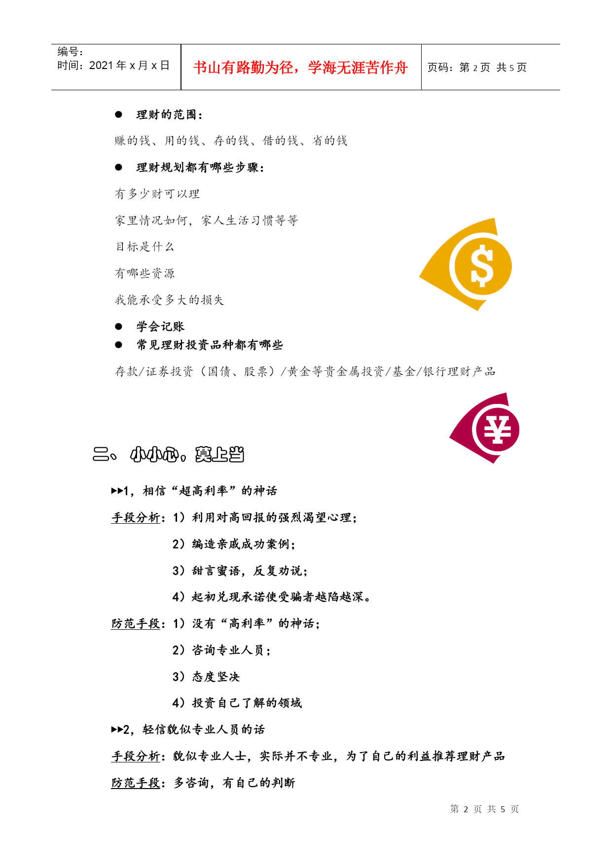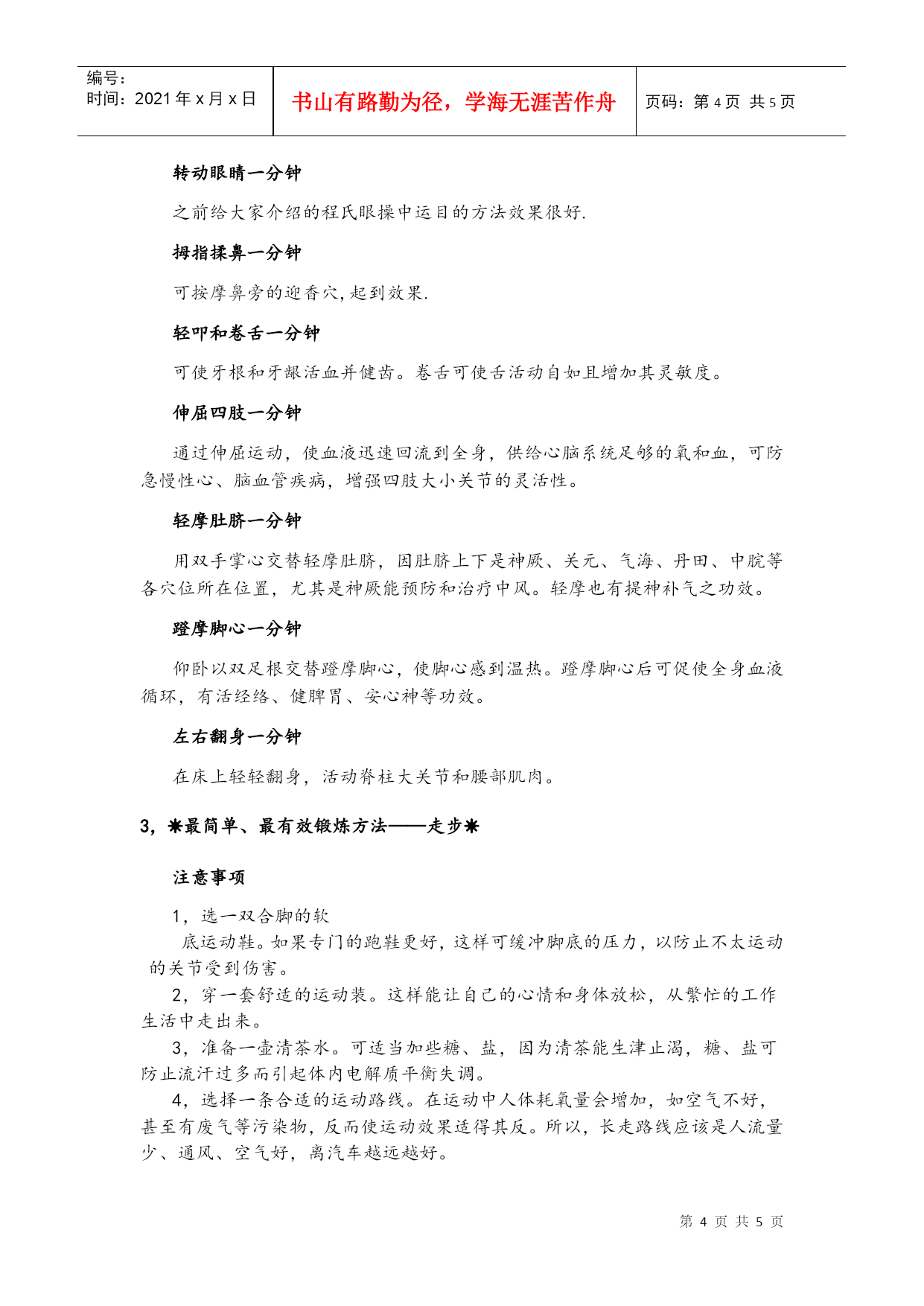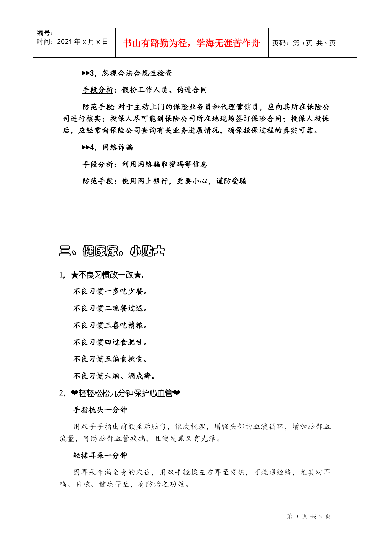 编号:时间:2021年x月x日书山有路勤为径,学海无涯苦作舟页码:第PAGE5页共NUMPAGES5页第PAGE\*MERGEFORMAT5页共NUMPAGES\*MERGEFORMAT5页一、理理财,不神秘现实是物价越来越高,因此我们要学会理财统计数据,8月CPI总水平同比上涨6.2%。其中,城市上涨5.9%,农村上涨6.7%。那么CPI是什么?什么是理财?一谈到理财,想到的不是投资,就是赚钱。实际上理财的范围很广,理财是理一生的财,也就是个人一生的与风险管理。包含以下涵义:①理财是理一生的财,不是解决燃眉之急的金钱问题而已。②理财是,每一个人一出生就需要用钱(现金流出),也需要赚钱来产生现金流入。因此不管现在是否有钱,每一个人都需要理财。③理财也涵盖了管理。因为的更多流量具有不确定性,包括、财产风险与,都会影响到现金流入(收入中断风险)或现金流出(费用递增风险)。理财的范围:赚的钱、用的钱、存的钱、借的钱、省的钱理财规划都有哪些步骤:有多少财可以理家里情况如何,家人生活习惯等等目标是什么有哪些资源我能承受多大的损失学会记账常见理财投资品种都有哪些存款/证券投资(国债、股票)/黄金等贵金属投资/基金/银行理财产品小小心,莫上当▶▶1,相信“超高利率”的神话手段分析:1)利用对高回报的强烈渴望心理;2)编造亲戚成功案例;3)甜言蜜语,反复劝说;4)起初兑现承诺使受骗者越陷越深。防范手段:1)没有“高利率”的神话;2)咨询专业人员;3)态度坚决4)投资自己了解的领域▶▶2,轻信貌似专业人员的话手段分析:貌似专业人士,实际并不专业,为了自己的利益推荐理财产品防范手段:多咨询,有自己的判断▶▶3,忽视合法合规性检查手段分析:假扮工作人员、伪造合同防范手段:对于主动上门的保险业务员和代理营销员,应向其所在保险公司进行核实;投保人尽可能到保险公司所在地现场签订保险合同;投保人投保后,应经常向保险公司查询有关业务进展情况,确保投保过程的真实可靠。▶▶4,网络诈骗手段分析:利用网络骗取密码等信息防范手段:使用网上银行,更要小心,谨防受骗三、健康康,小贴士1,★不良习惯改一改★,不良习惯一多吃少餐。不良习惯二晚餐过迟。不良习惯三喜吃精粮。不良习惯四过食肥甘。不良习惯五偏食挑食。不良习惯六烟、酒成癖。2,❤轻轻松松九分钟保护心血管❤手指梳头一分钟用双手手指由前额至后脑勺,依次梳理,增强头部的血液循环,增加脑部血流量,可防脑部血管疾病,且使发黑又有光泽。轻揉耳朵一分钟因耳朵布满全身的穴位,用双手轻揉左右耳至发热,可疏通经络,尤其对耳鸣、目眩、健忘等症,有防治之功效。转动眼睛一分钟之前给大家介绍的程氏眼操中运目的方法效果很好.拇指揉鼻一分钟可按摩鼻旁的迎香穴,起到效果.轻叩和卷舌一分钟可使牙根和牙龈活血并健齿。卷舌可使舌活动自如且增加其灵敏度。伸屈四肢一分钟通过伸屈运动,使血液迅速回流到全身,供给心脑系统足够的氧和血,可防急慢性心、脑血管疾病,增强四肢大小关节的灵活性。轻摩肚脐一分钟用双手掌心交替轻摩肚脐,因肚脐上下是神厥、关元、气海、丹田、中脘等各穴位所在位置,尤其是神厥能预防和治疗中风。轻摩也有提神补气之功效。蹬摩脚心一分钟仰卧以双足根交替蹬摩脚心,使脚心感到温热。蹬摩脚心后可促使全身血液循环,有活经络、健脾胃、安心神等功效。左右翻身一分钟在床上轻轻翻身,活动脊柱大关节和腰部肌肉。3,☀最简单、最有效锻炼方法——走步☀注意事项1,选一双合脚的软底运动鞋。如果专门的跑鞋更好,这样可缓冲脚底的压力,以防止不太运动的关节受到伤害。2,穿一套舒适的运动装。这样能让自己的心情和身体放松,从繁忙的工作生活中走出来。3,准备一壶清茶水。可适当加些糖、盐,因为清茶能生津止渴,糖、盐可防止流汗过多而引起体内电解质平衡失调。4,选择一条合适的运动路线。在运动中人体耗氧量会增加,如空气不好,甚至有废气等污染物,反而使运动效果适得其反。所以,长走路线应该是人流量少、通风、空气好,离汽车越远越好。5,长走时间要恰当。长走锻炼时间最好选择在每天太阳升起以后,下午3点也是最佳的锻炼时间。长走运动不等同于平常的走路、散步或逛街,每周锻炼至少3次,并且每次不少于30分钟。此外,长走前一定要做一些准备活动,如轻轻压一些肌肉和韧带,做一些下蹲运动等,让自己的心脏和肌肉进入到运动状态。长走健身运动要循序渐进,运动强度应由小到大,运动时间由短而长。运动后别忘了做一些放松运动。!特别注意——走步正确姿势走步的方法很简单,要点:①背肌应始终保持挺直,在自由轻松的状态下进行。②抬起下巴,眼睛