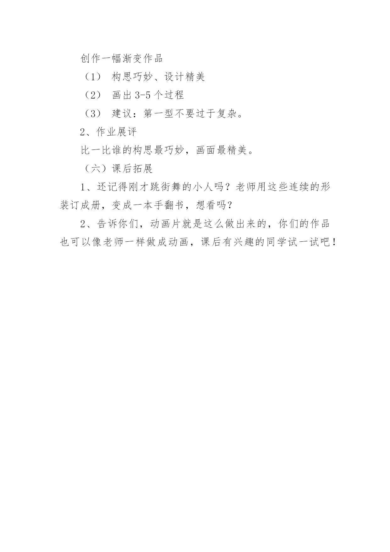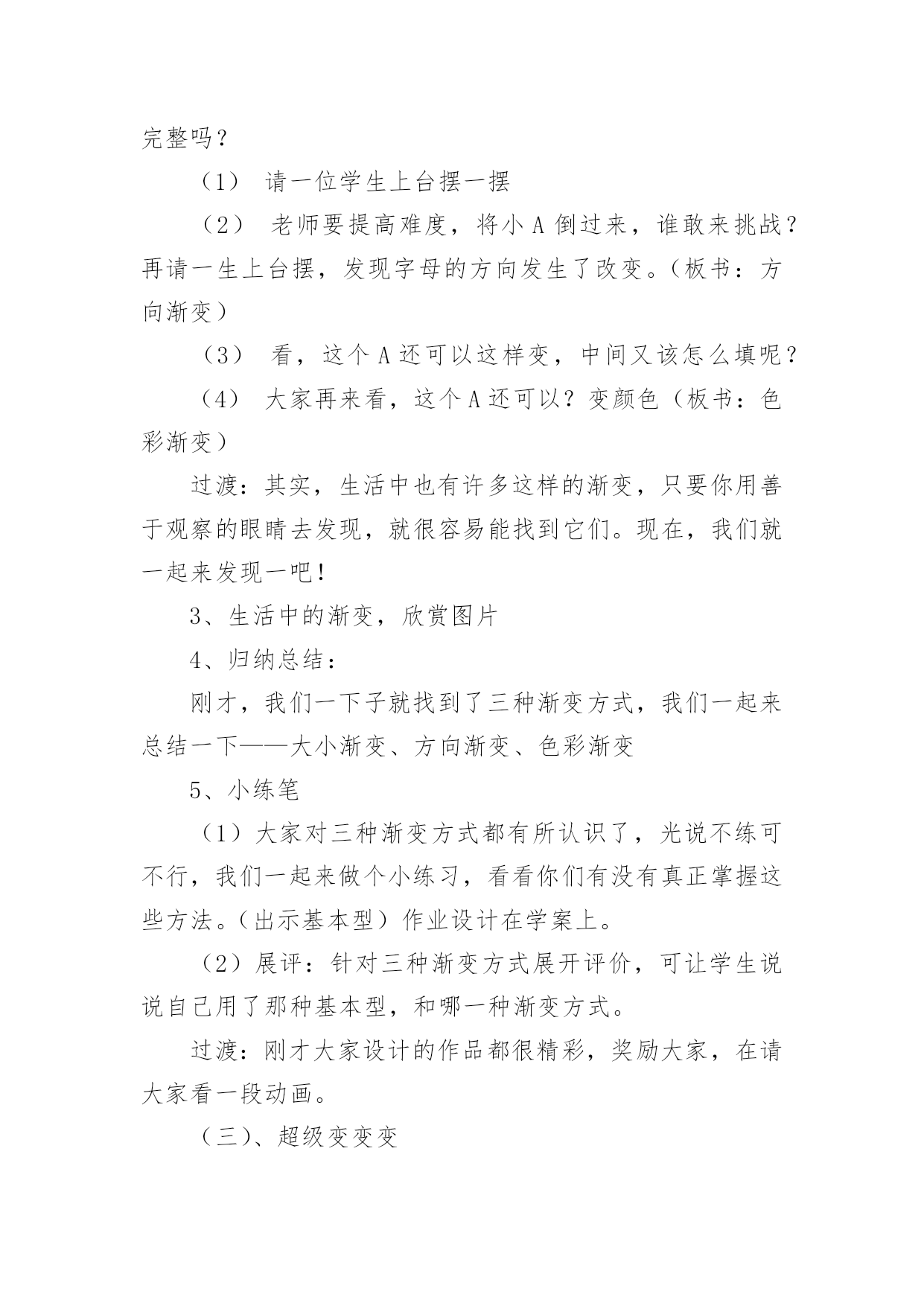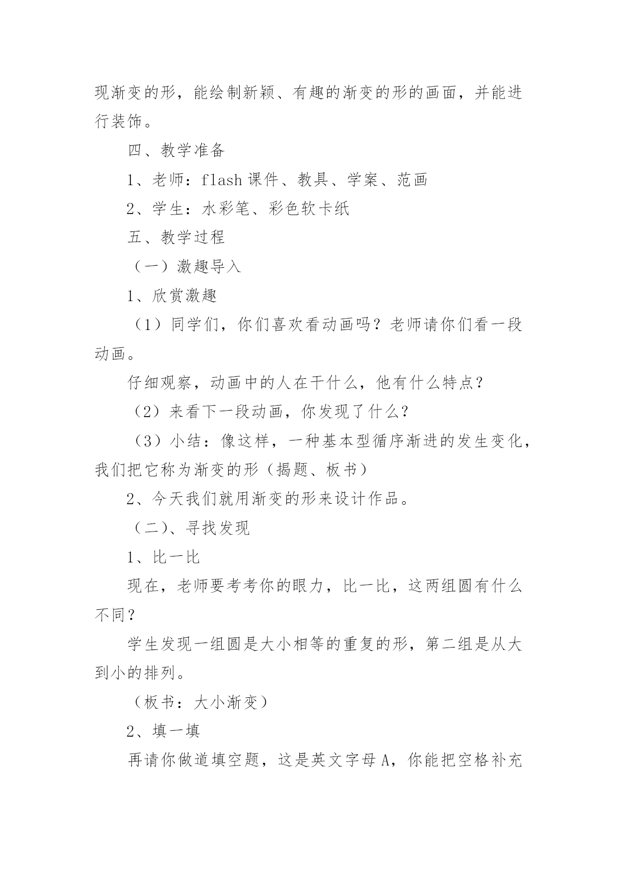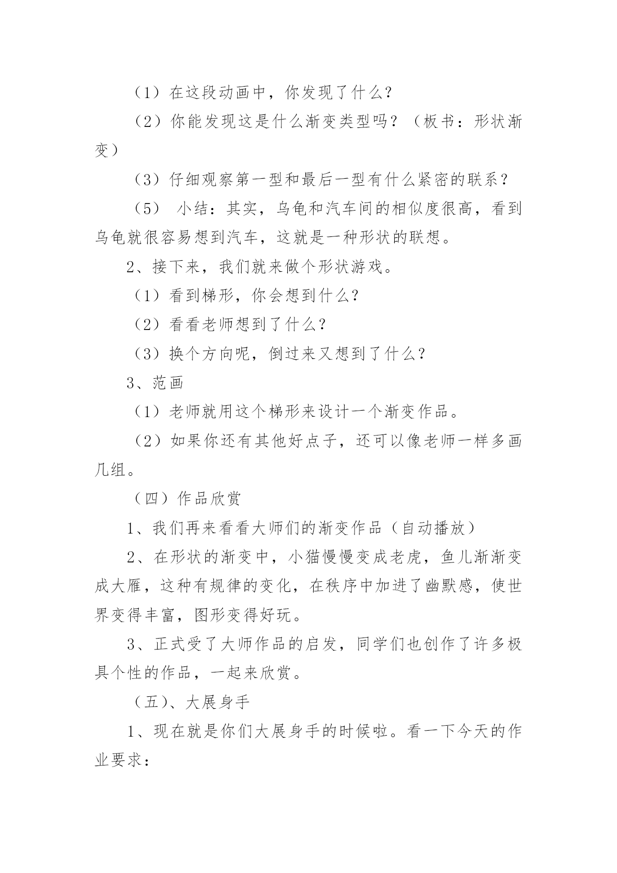 《渐变的形》教学设计一、教材分析本课是平面构成“重复的形”之后的第二课,属于“造型表现”的学习领域。“渐变的形”是构成艺术内容之一,它是“造型表现”学习的基础。在本课的教学中,主要是引导学生发现、欣赏生活中渐变的形的现象,感受大师作品中的这种现象产生的美感,初步了解平面构成知识,学习简单的平面构成设计方法,并学习创造多种方式表现有趣的渐变的形。应避免学科知识专业化,注重调动学生的学习积极性和主动性,培养学生的造型、表现意识,激发他们表现美和创造美的情趣和能力。二、教学目标(1)认知目标:学生了解渐变的基础知识,掌握渐变的表现方法,引导学生利用第一“形”,发挥想像,来创作表现“渐变”后的第二“形”,提高渐变构成艺术的表现力。(2)操作目标:学生用多种形式去表现渐变,并能设计、绘制有趣的渐变画面。(3)情感目标:欣赏艺术家的作品,感受并体验渐变的形所具有的独特艺术魅力,提高发现美、欣赏美、变现美的能力。三、教学重难点重点:了解渐变的形的特征与规律。难点:学生学会观察渐变的`形,用不同的表现方法表现渐变的形,能绘制新颖、有趣的渐变的形的画面,并能进行装饰。四、教学准备1、老师:flash课件、教具、学案、范画2、学生:水彩笔、彩色软卡纸五、教学过程(一)激趣导入1、欣赏激趣(1)同学们,你们喜欢看动画吗?老师请你们看一段动画。仔细观察,动画中的人在干什么,他有什么特点?(2)来看下一段动画,你发现了什么?(3)小结:像这样,一种基本型循序渐进的发生变化,我们把它称为渐变的形(揭题、板书)2、今天我们就用渐变的形来设计作品。(二)、寻找发现1、比一比现在,老师要考考你的眼力,比一比,这两组圆有什么不同?学生发现一组圆是大小相等的重复的形,第二组是从大到小的排列。(板书:大小渐变)2、填一填再请你做道填空题,这是英文字母A,你能把空格补充完整吗?(1)请一位学生上台摆一摆(2)老师要提高难度,将小A倒过来,谁敢来挑战?再请一生上台摆,发现字母的方向发生了改变。(板书:方向渐变)(3)看,这个A还可以这样变,中间又该怎么填呢?(4)大家再来看,这个A还可以?变颜色(板书:色彩渐变)过渡:其实,生活中也有许多这样的渐变,只要你用善于观察的眼睛去发现,就很容易能找到它们。现在,我们就一起来发现一吧!3、生活中的渐变,欣赏图片4、归纳总结:刚才,我们一下子就找到了三种渐变方式,我们一起来总结一下——大小渐变、方向渐变、色彩渐变5、小练笔(1)大家对三种渐变方式都有所认识了,光说不练可不行,我们一起来做个小练习,看看你们有没有真正掌握这些方法。(出示基本型)作业设计在学案上。(2)展评:针对三种渐变方式展开评价,可让学生说说自己用了那种基本型,和哪一种渐变方式。过渡:刚才大家设计的作品都很精彩,奖励大家,在请大家看一段动画。(三)、超级变变变(1)在这段动画中,你发现了什么?(2)你能发现这是什么渐变类型吗?(板书:形状渐变)(3)仔细观察第一型和最后一型有什么紧密的联系?(5)小结:其实,乌龟和汽车间的相似度很高,看到乌龟就很容易想到汽车,这就是一种形状的联想。2、接下来,我们就来做个形状游戏。(1)看到梯形,你会想到什么?(2)看看老师想到了什么?(3)换个方向呢,倒过来又想到了什么?3、范画(1)老师就用这个梯形来设计一个渐变作品。(2)如果你还有其他好点子,还可以像老师一样多画几组。(四)作品欣赏1、我们再来看看大师们的渐变作品(自动播放)2、在形状的渐变中,小猫慢慢变成老虎,鱼儿渐渐变成大雁,这种有规律的变化,在秩序中加进了幽默感,使世界变得丰富,图形变得好玩。3、正式受了大师作品的启发,同学们也创作了许多极具个性的作品,一起来欣赏。(五)、大展身手1、现在就是你们大展身手的时候啦。看一下今天的作业要求:创作一幅渐变作品(1)构思巧妙、设计精美(2)画出3-5个过程(3)建议:第一型不要过于复杂。2、作业展评比一比谁的构思最巧妙,画面最精美。(六)课后拓展1、还记得刚才跳街舞的小人吗?老师用这些连续的形装订成册,变成一本手翻书,想看吗?2、告诉你们,动画片就是这么做出来的,你们的作品也可以像老师一样做成动画,课后有兴趣的同学试一试吧!